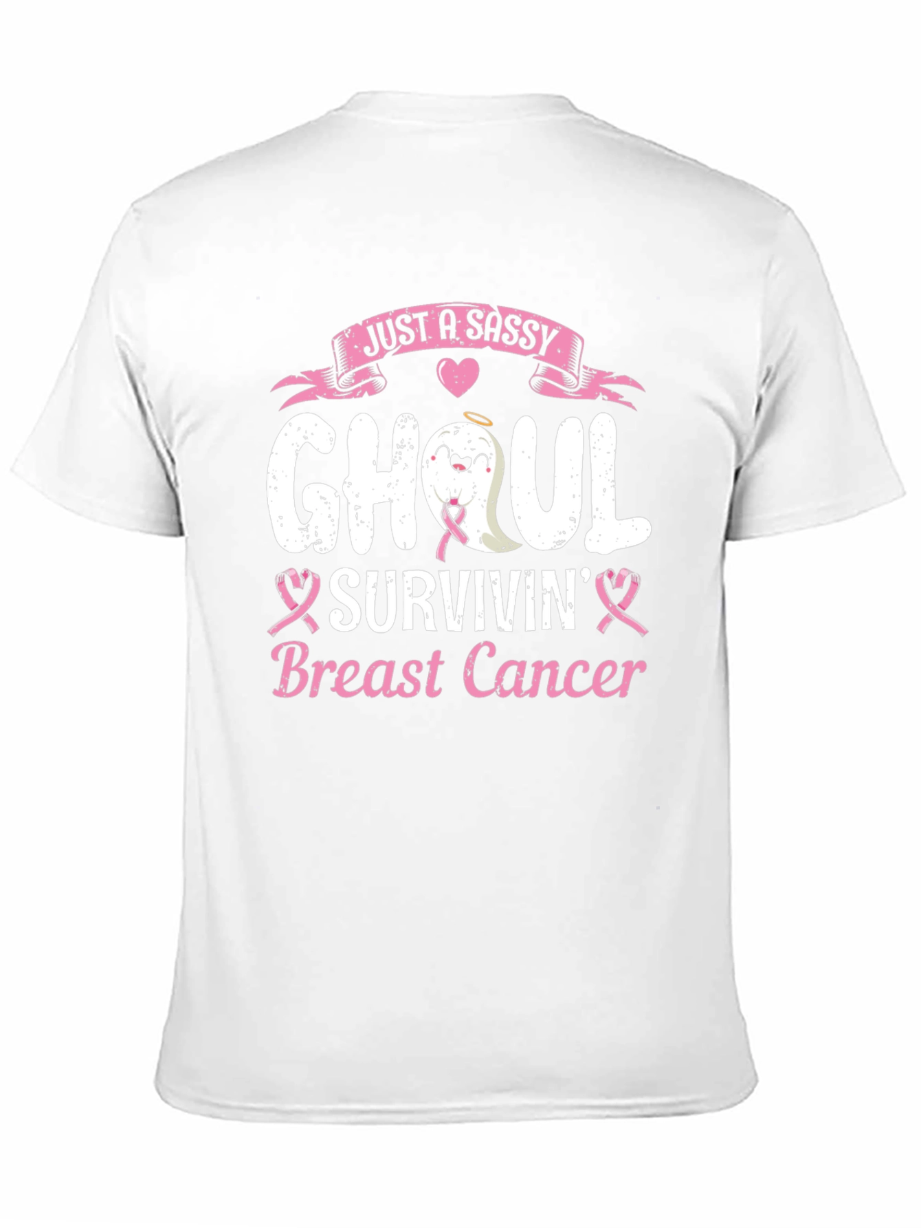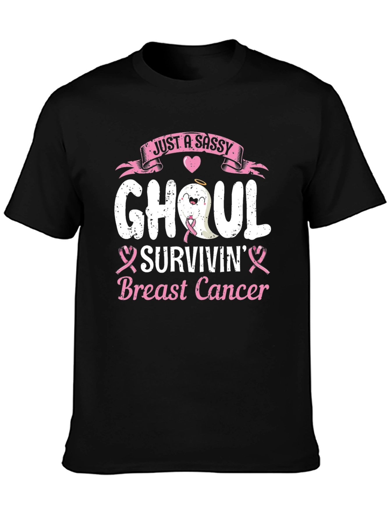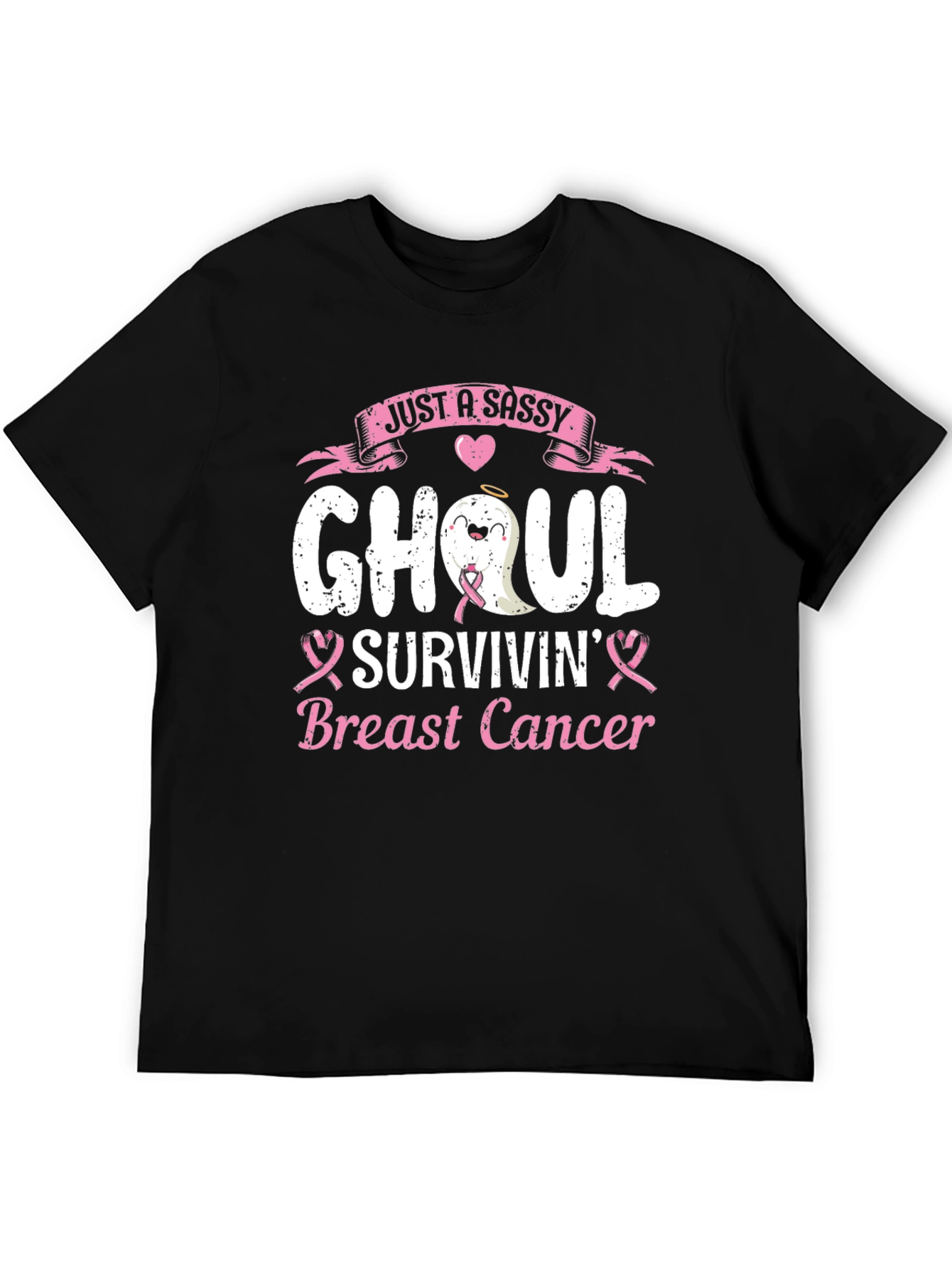 Luce esta llamativa camiseta negra con un diseño único y un mensaje poderoso. Presenta un adorable fantasma ("ghoul") con un halo y un lazo rosa, enmarcado por un estandarte que dice "Just a Sassy Ghoul". El texto "Survivin' Breast Cancer" destaca la conciencia sobre el cáncer de mama. Perfecta para mostrar tu apoyo, crear conciencia o simplemente añadir un toque divertido y significativo a tu guardarropa. Su diseño atractivo la convierte en una prenda ideal para eventos benéficos, caminatas de concienciación o para el uso diario. ¡Combínala con tus jeans favoritos para un look casual con un mensaje importante!