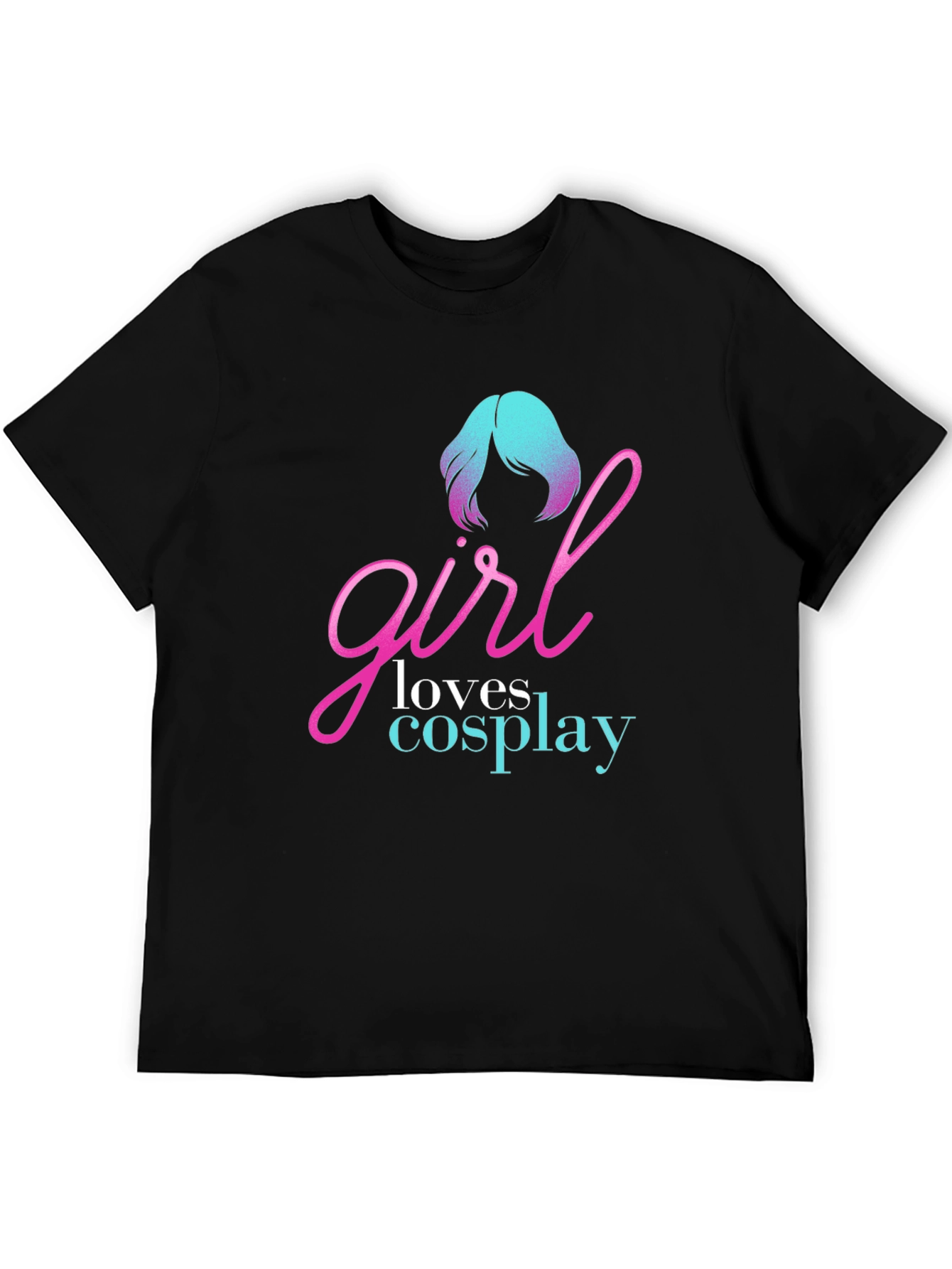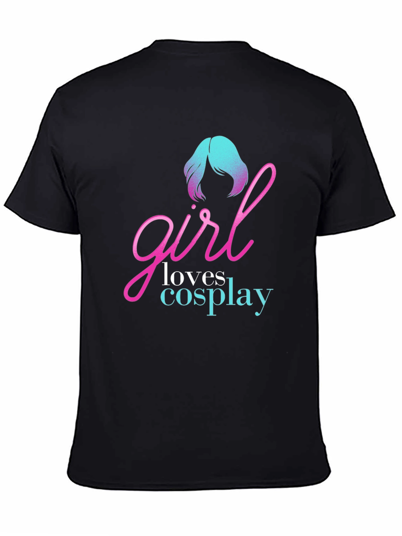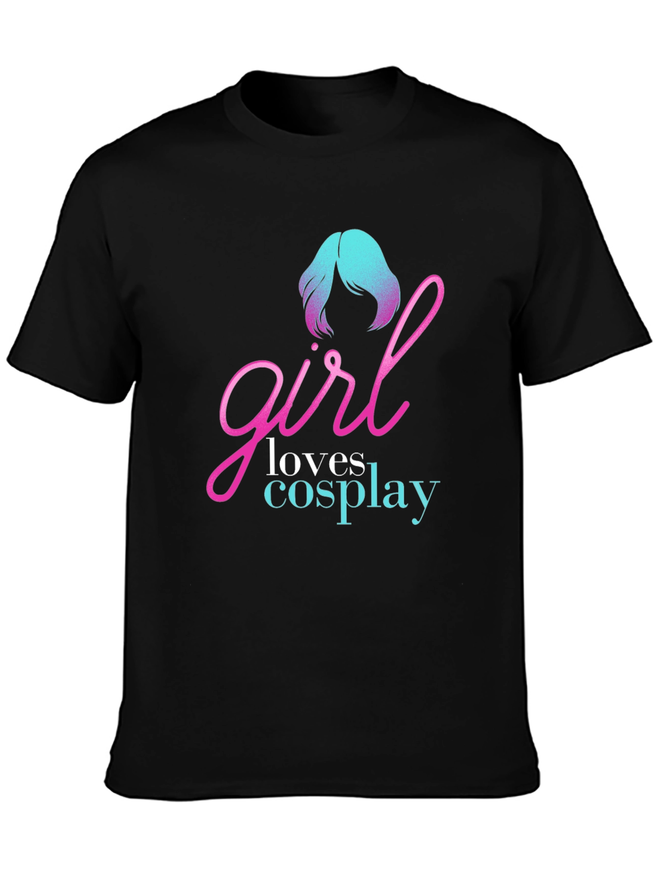 Muestra tu amor por el cosplay con esta moderna camiseta negra para hombre. Presenta un diseño llamativo con la frase 'girl loves cosplay' en una fuente estilizada con degradados de color rosa y azul, coronada por una silueta de cabello también en tonos vibrantes. Perfecta para llevar a convenciones de anime, eventos de cosplay, o simplemente para expresar tu pasión por esta afición en tu día a día. Fabricada con un tejido suave y cómodo, esta camiseta es ideal para cualquier fan del cosplay. ¡Añade un toque divertido y original a tu guardarropa!