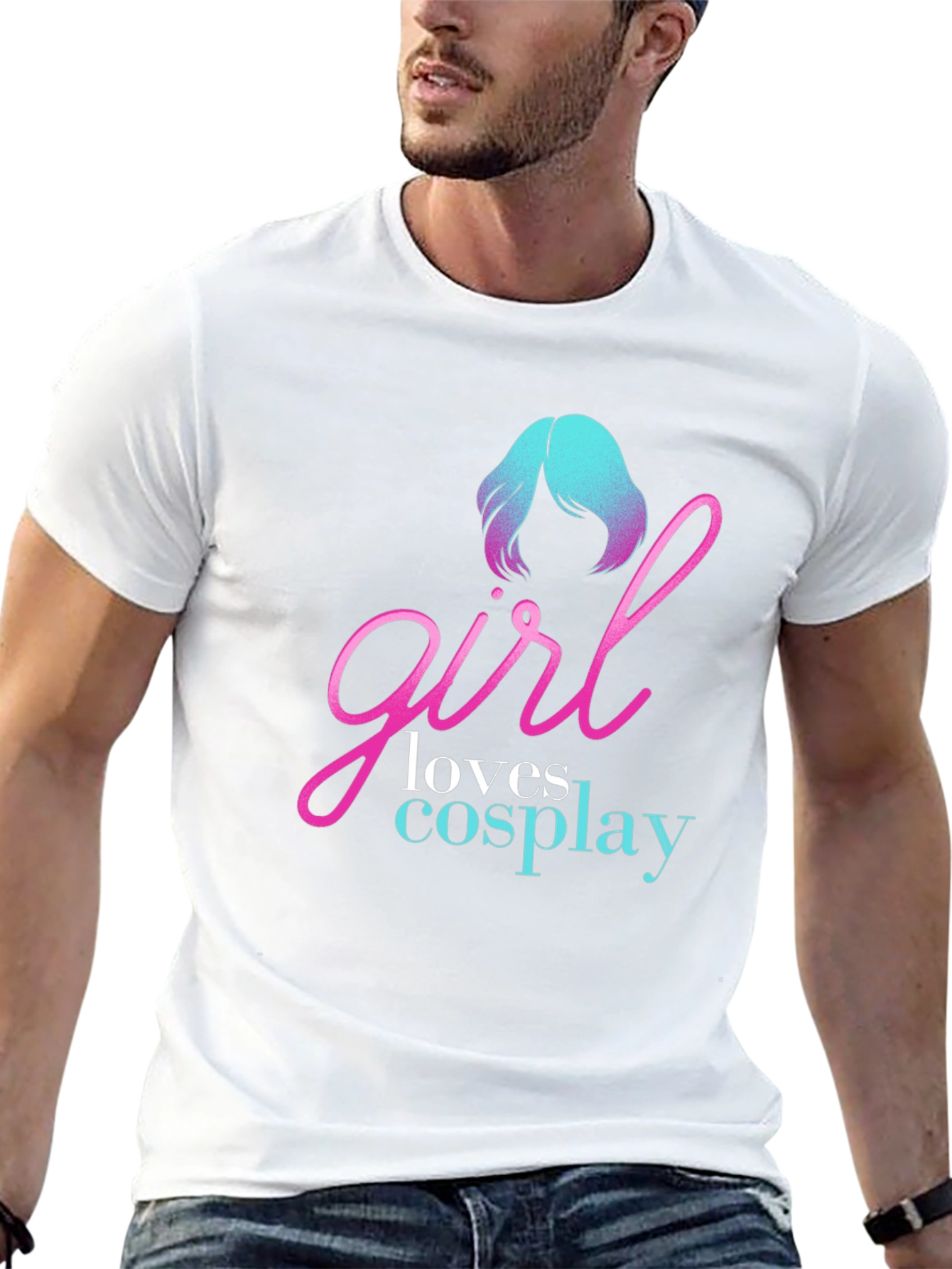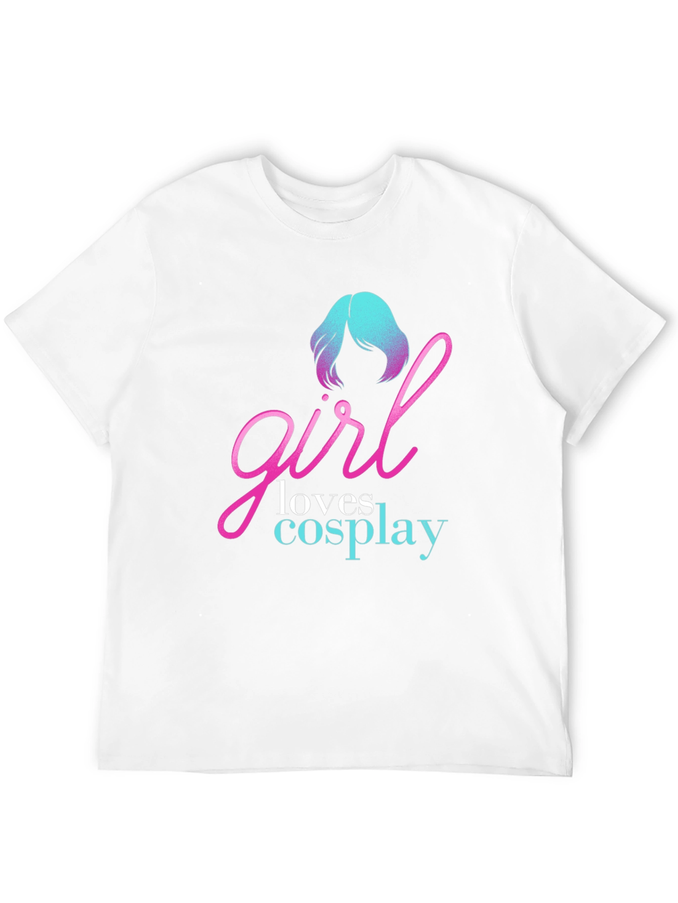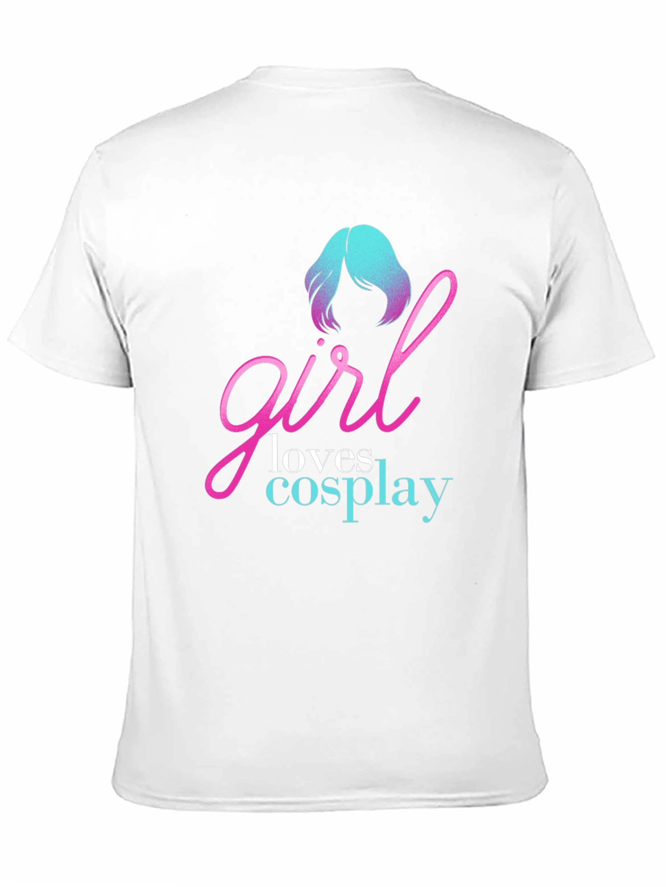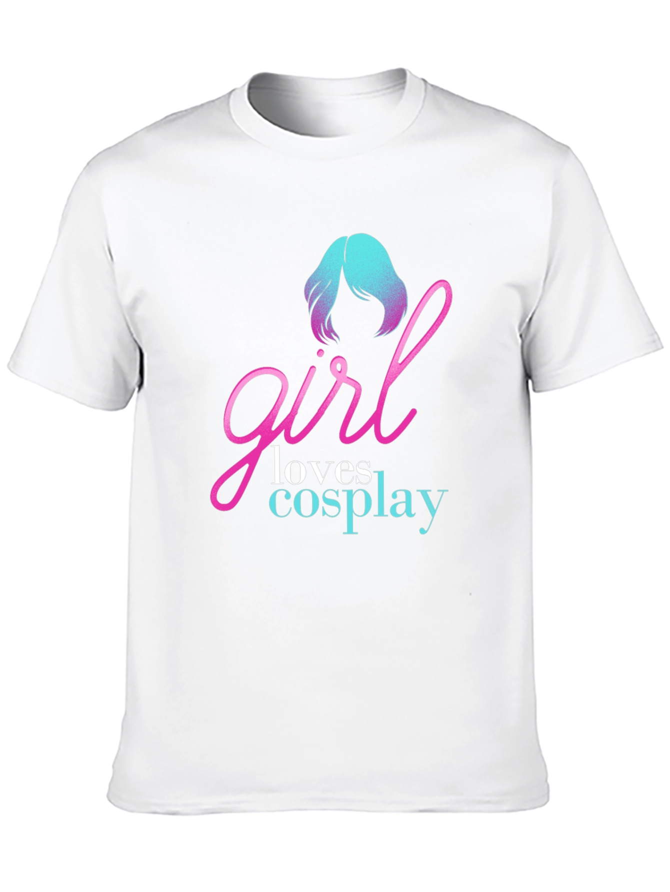 Muestra tu amor por el cosplay con esta moderna camiseta negra para hombre. Presenta un diseño llamativo con la frase 'girl loves cosplay' en una fuente estilizada con degradados de color rosa y azul, coronada por una silueta de cabello también en tonos vibrantes. Perfecta para llevar a convenciones de anime, eventos de cosplay, o simplemente para expresar tu pasión por esta afición en tu día a día. Fabricada con un tejido suave y cómodo, esta camiseta es ideal para cualquier fan del cosplay. ¡Añade un toque divertido y original a tu guardarropa!