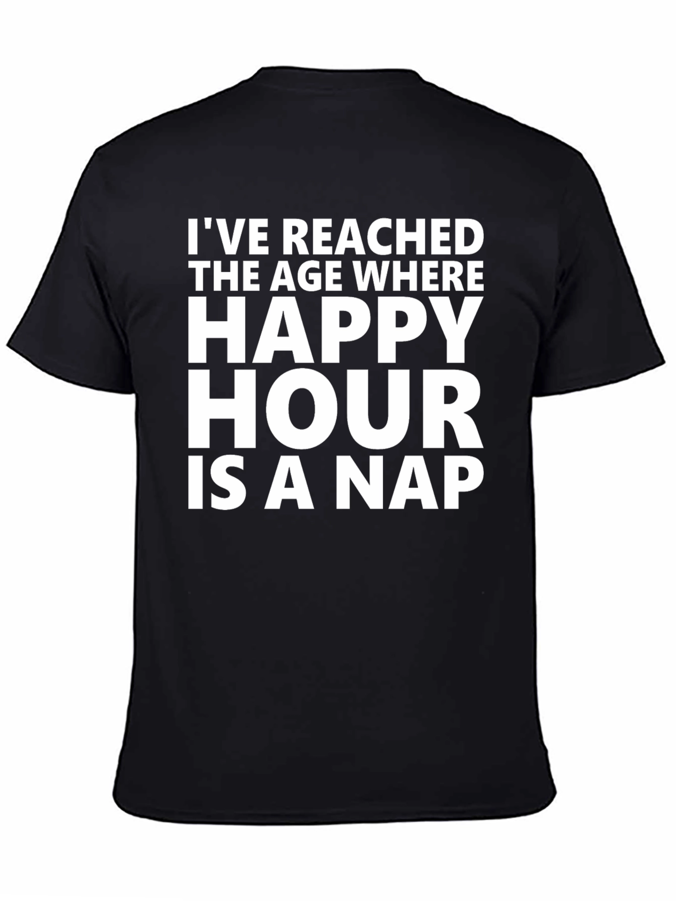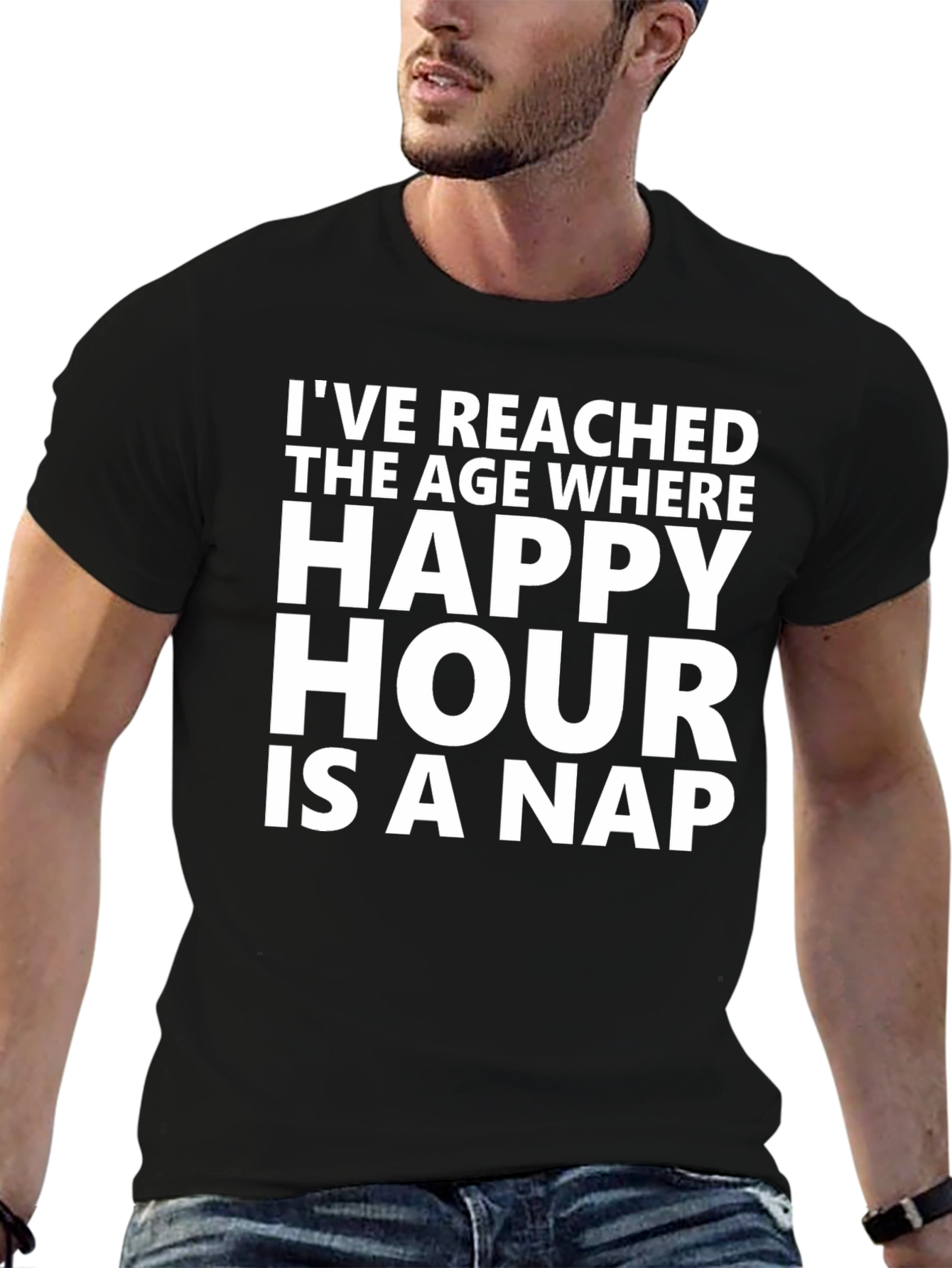 Esta camiseta negra presenta un diseño divertido y relajado. La frase "I've reached the age where HAPPY HOUR IS A NAP" está impresa en letras mayúsculas blancas en la parte frontal, ofreciendo un toque de humor para quienes prefieren una siesta a una salida nocturna. Ideal para uso casual, esta camiseta es perfecta para expresar tu amor por el descanso con estilo. El tejido parece ser de algodón suave y transpirable, asegurando comodidad durante todo el día. Combínala con tus jeans favoritos o pantalones cortos para un look relajado y divertido. Muestra tu lado divertido y celebra esos momentos de tranquilidad con esta original camiseta.
