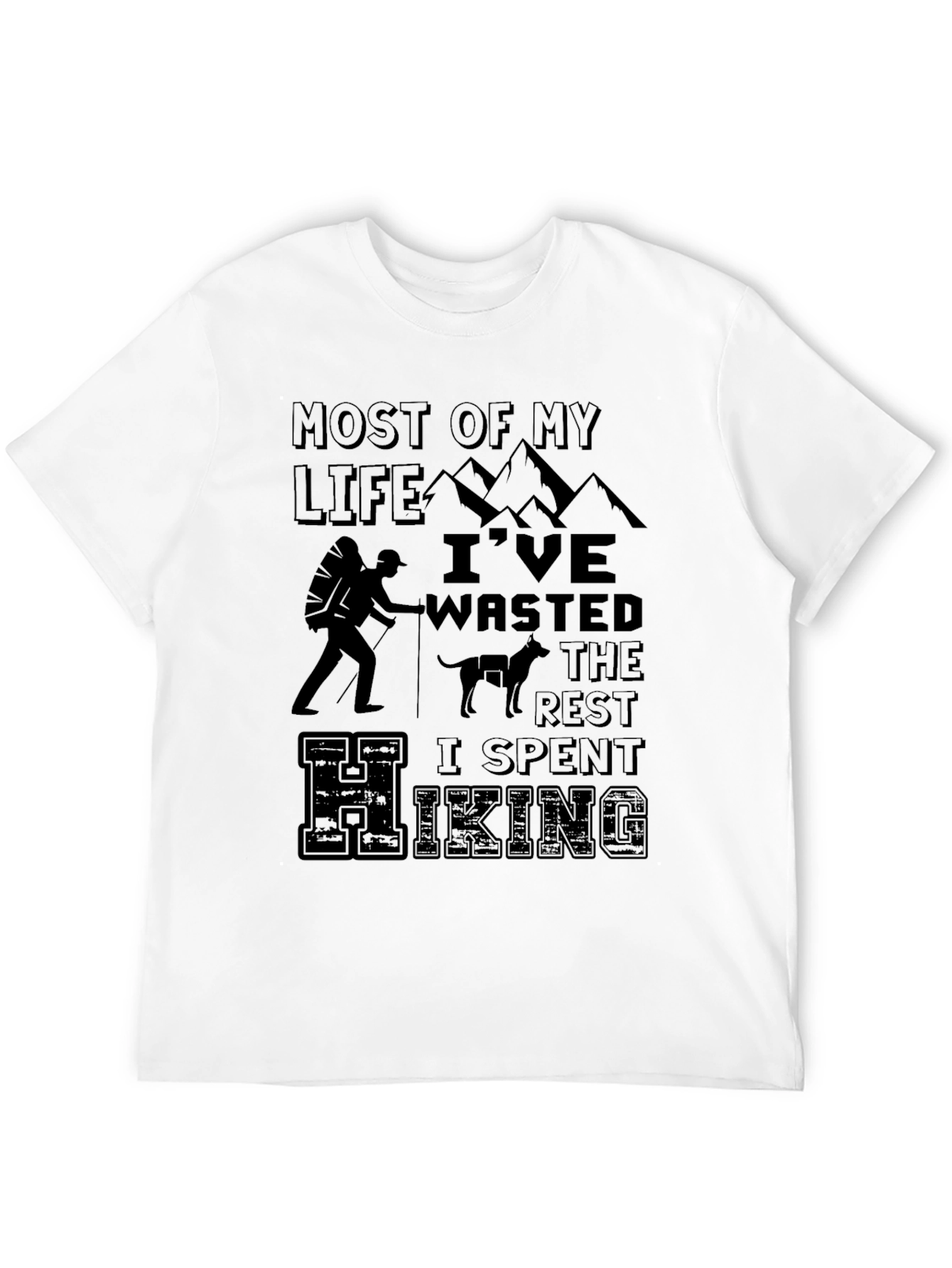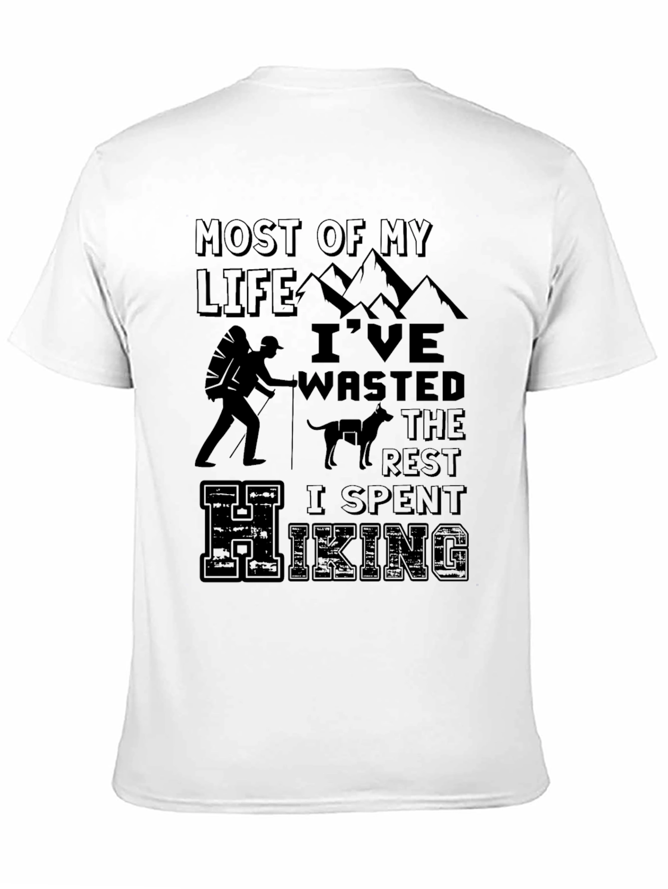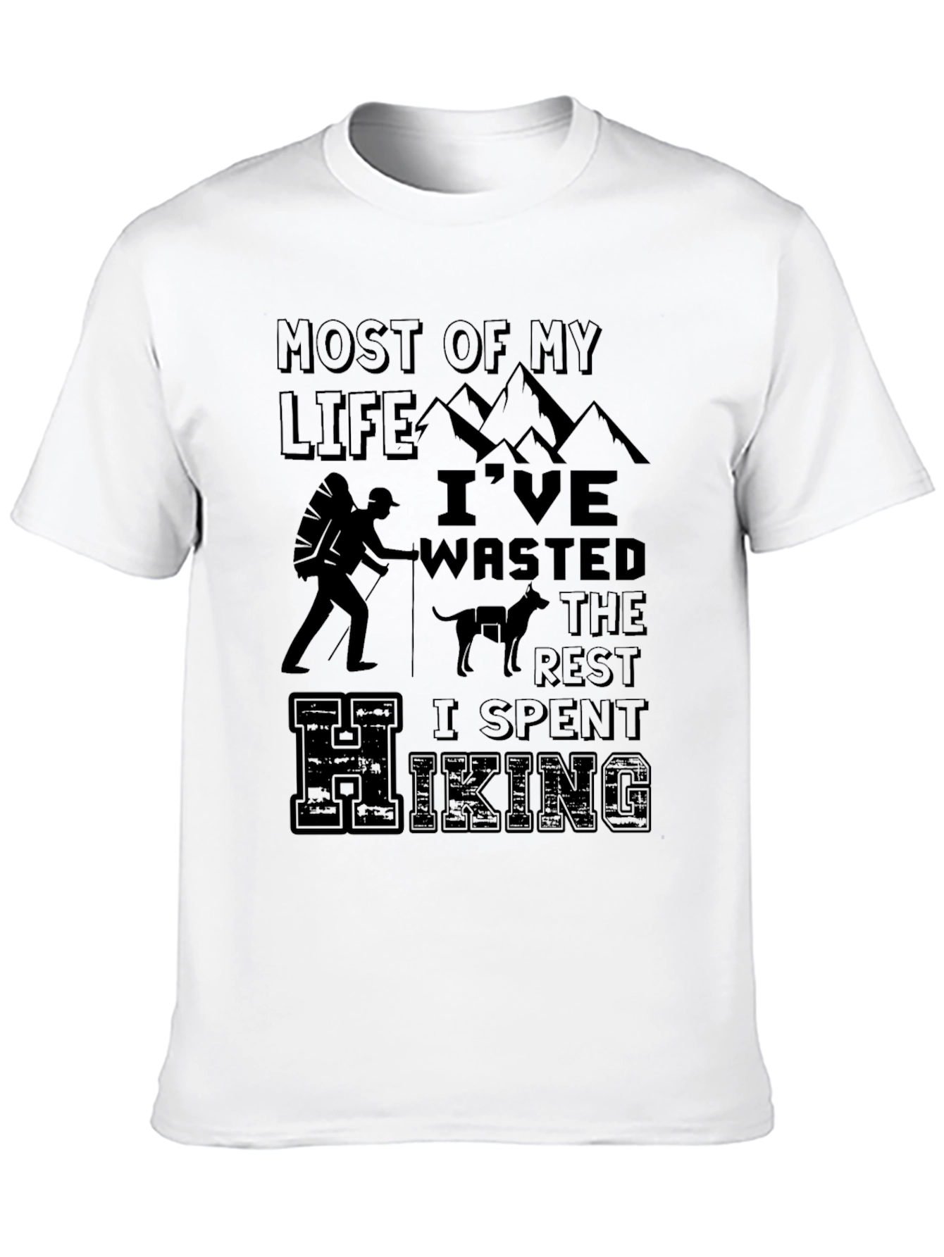 Esta camiseta negra presenta un diseño temático de senderismo que captura el espíritu aventurero. Hecha de un material suave y cómodo, parece ser de algodón o una mezcla similar, ideal para uso diario o actividades al aire libre. El diseño incluye la frase "Most of my life I've wasted the rest I spent hiking", junto con gráficos de montañas, un excursionista con mochila, y un perro, perfecto para los amantes de la naturaleza y el senderismo. Su corte clásico de cuello redondo la hace versátil para combinar con cualquier estilo casual. Ya sea para llevar en tu próxima excursión o para mostrar tu pasión por la montaña, esta camiseta es una excelente elección. Combina comodidad y estilo, haciendo de ella una prenda imprescindible en tu armario.