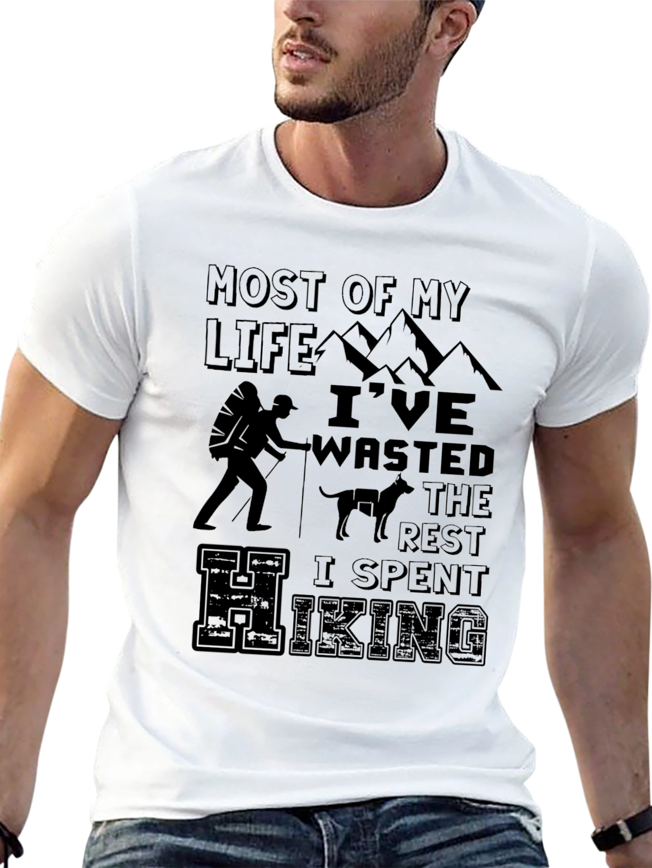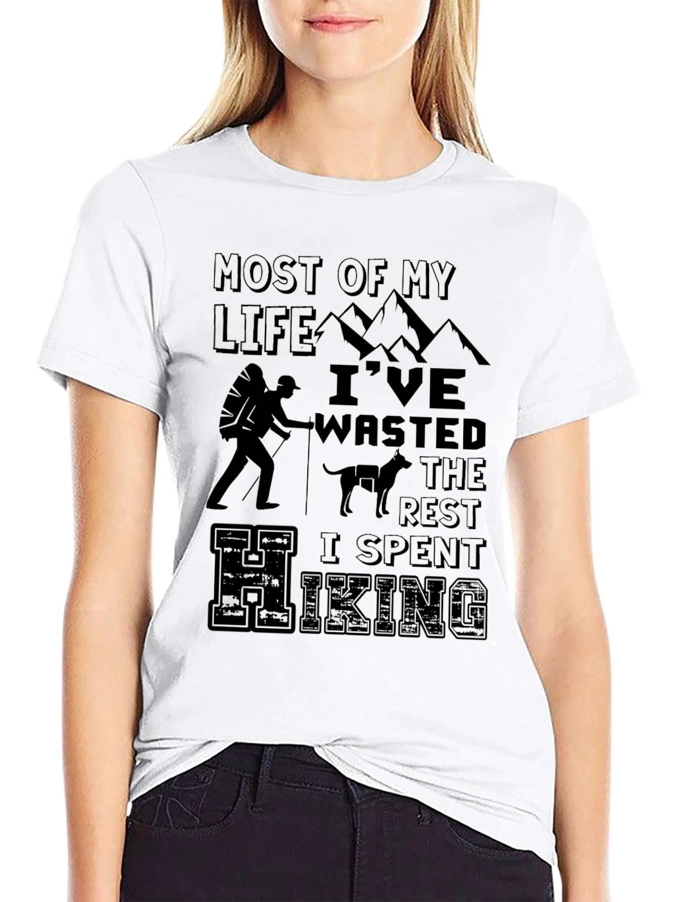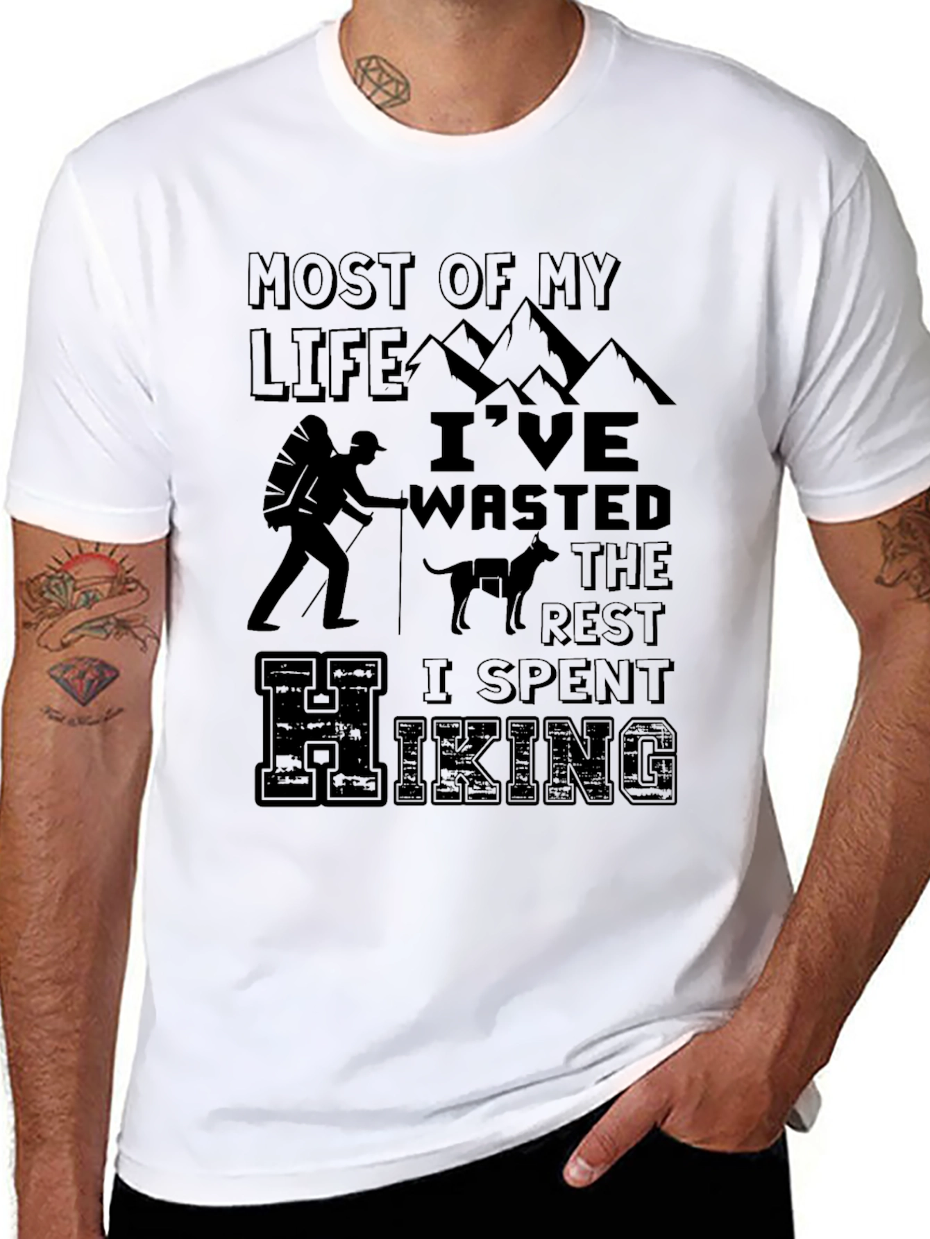 Esta camiseta negra presenta un diseño temático de senderismo que captura el espíritu aventurero. Hecha de un material suave y cómodo, parece ser de algodón o una mezcla similar, ideal para uso diario o actividades al aire libre. El diseño incluye la frase "Most of my life I've wasted the rest I spent hiking", junto con gráficos de montañas, un excursionista con mochila, y un perro, perfecto para los amantes de la naturaleza y el senderismo. Su corte clásico de cuello redondo la hace versátil para combinar con cualquier estilo casual. Ya sea para llevar en tu próxima excursión o para mostrar tu pasión por la montaña, esta camiseta es una excelente elección. Combina comodidad y estilo, haciendo de ella una prenda imprescindible en tu armario.