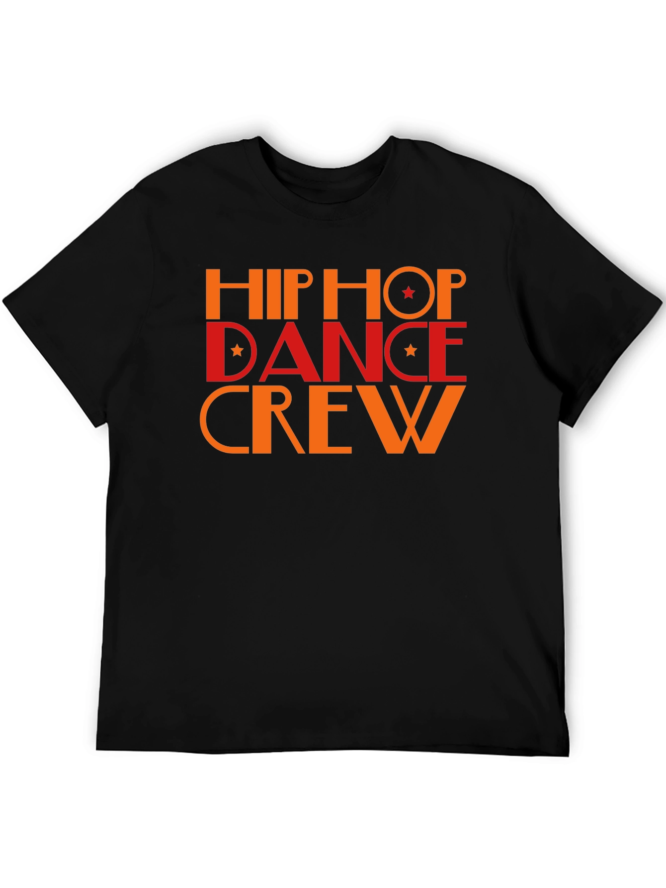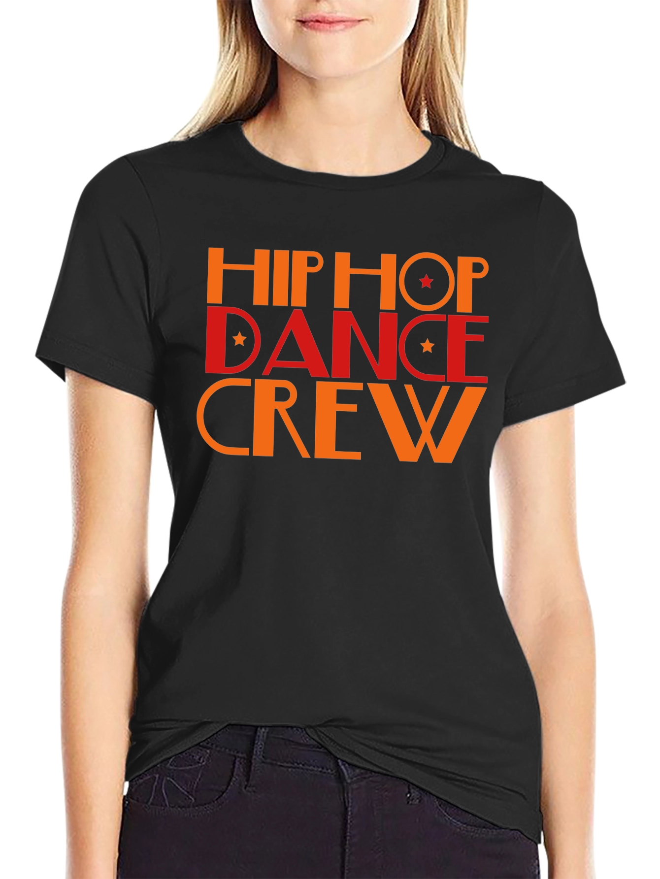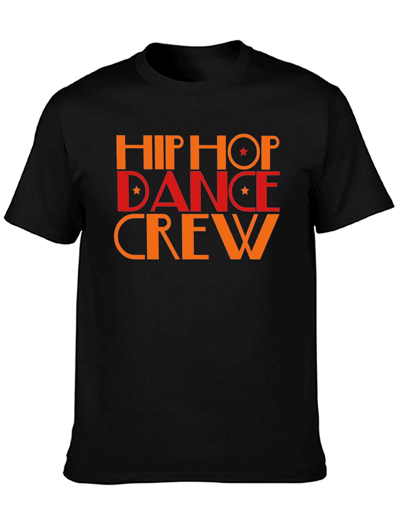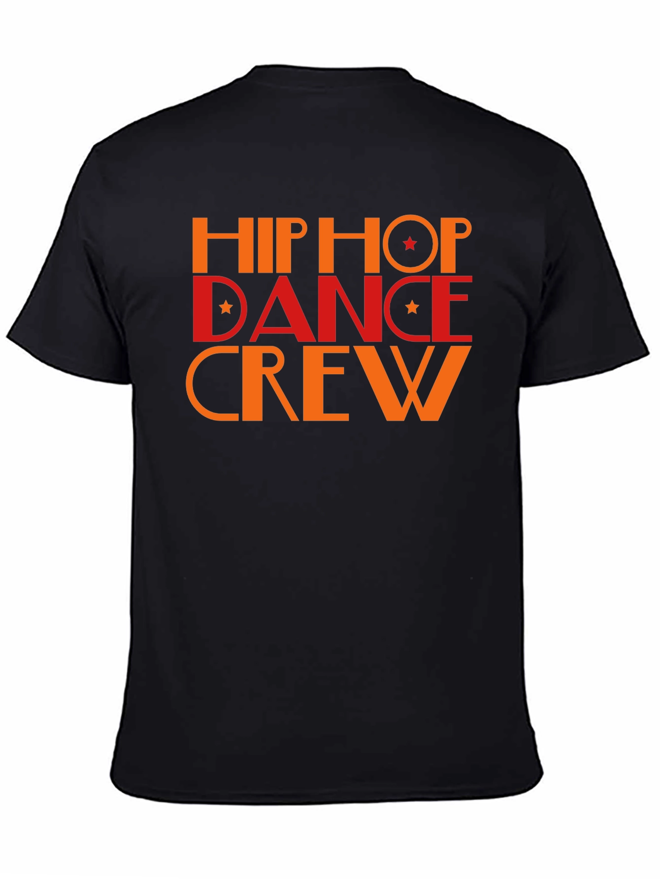 Esta camiseta negra de manga corta presenta un diseño llamativo y moderno. El texto "HIP HOP DANCE CREW" está impreso en letras grandes, con "HIP HOP" y "CREW" en color naranja, y "DANCE" en un rojo vibrante, adornado con estrellas. Ideal para amantes del baile y la cultura hip hop, esta camiseta es perfecta para expresar tu estilo urbano. El tejido parece ser de algodón, lo que garantiza comodidad y frescura. Lúcela en tus clases de baile, eventos de hip hop o simplemente para un look casual con un toque original y divertido. ¡Destaca con esta prenda única!