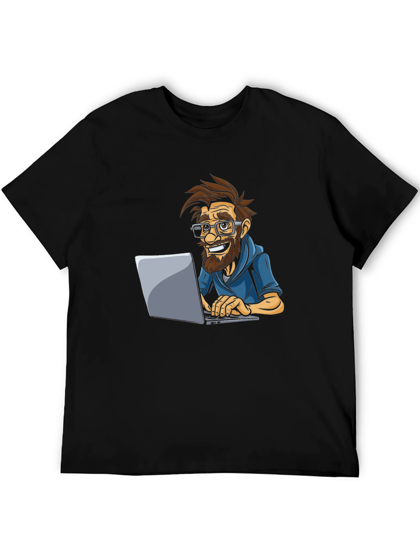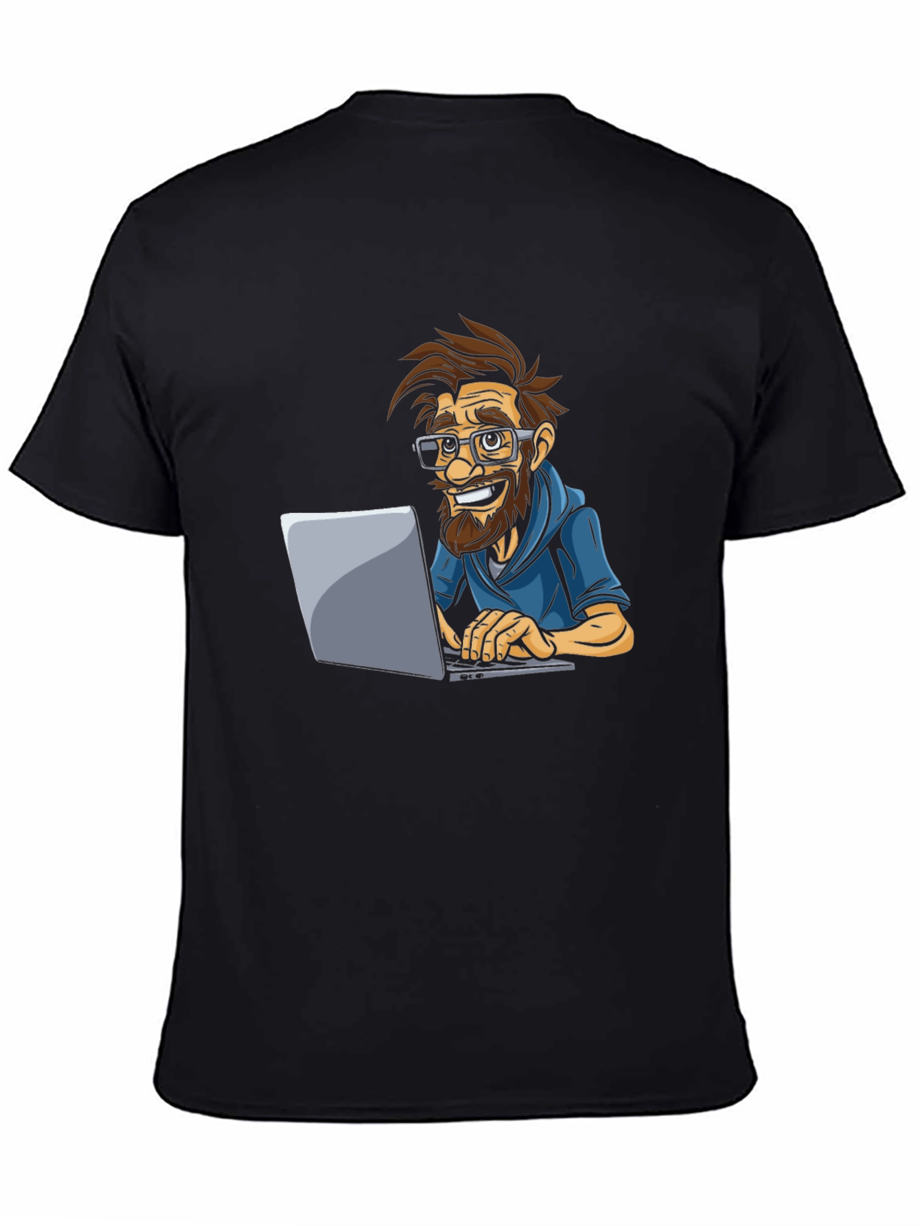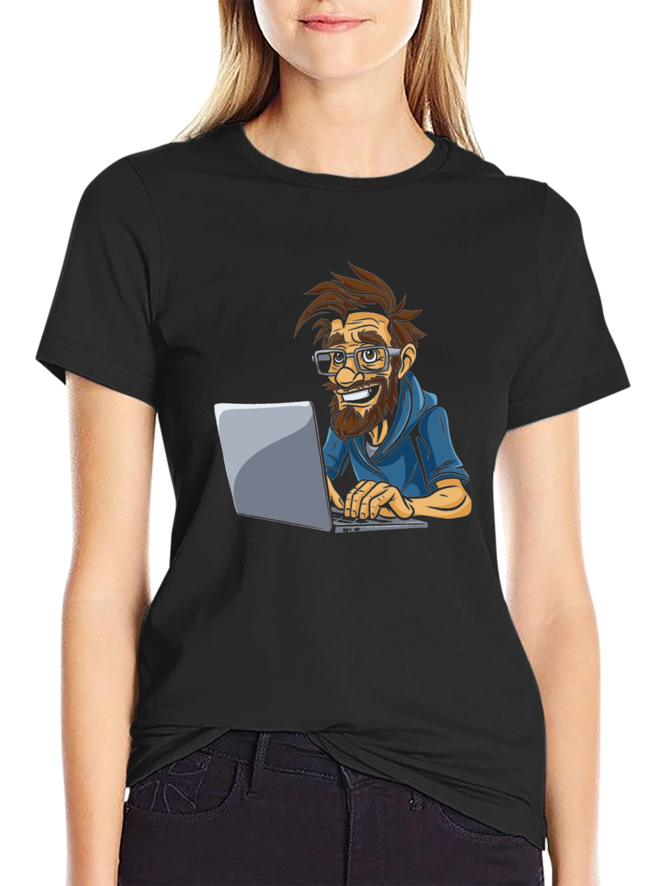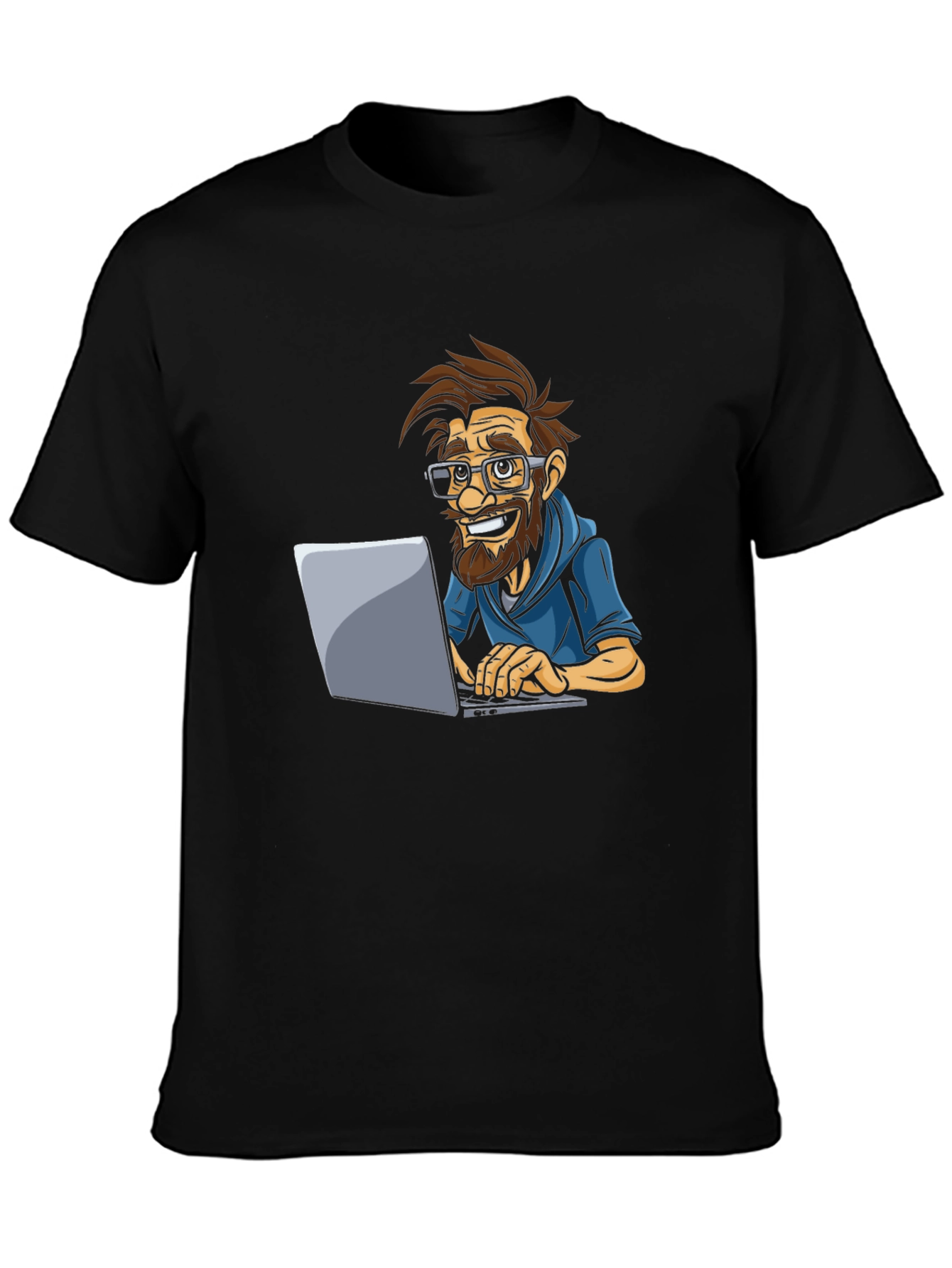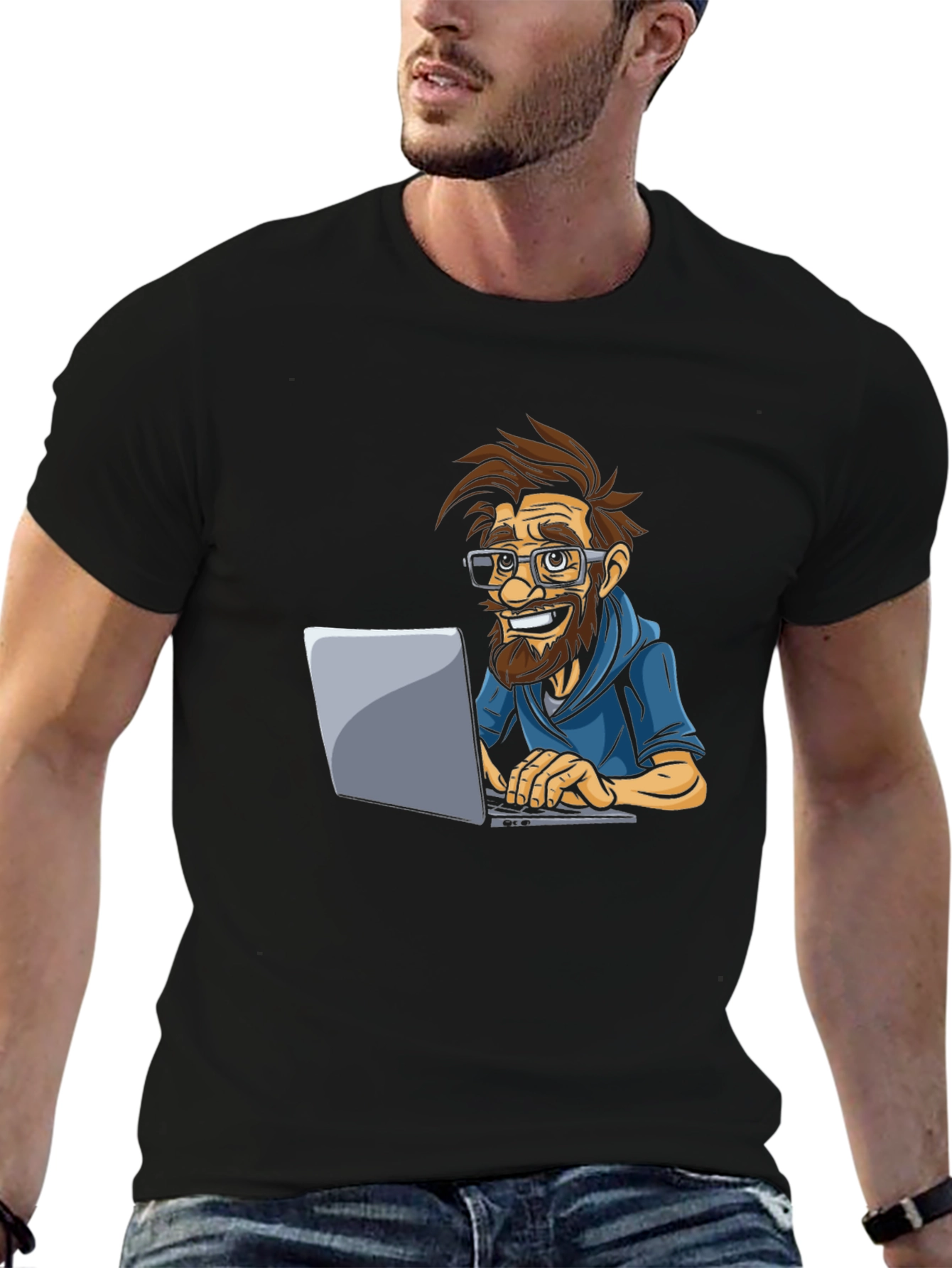Luce esta camiseta negra con un diseño único y divertido. Presenta un personaje animado, un programador con barba y gafas, trabajando en su laptop. Ideal para los amantes de la tecnología y la programación. Perfecta para un look casual y original, esta camiseta destaca por su estilo llamativo y moderno. Su color negro facilita la combinación con cualquier outfit. Fabricada con materiales cómodos y duraderos, es una prenda esencial para tu guardarropa. ¡Muestra tu pasión por la informática con esta camiseta de diseño exclusivo!