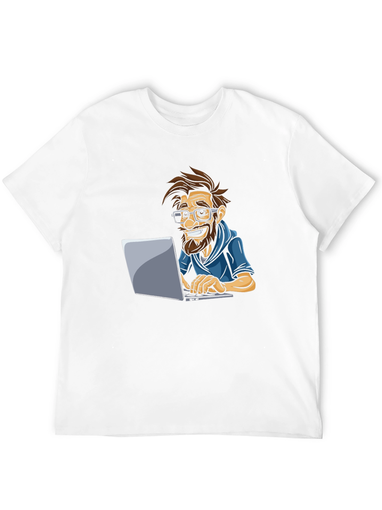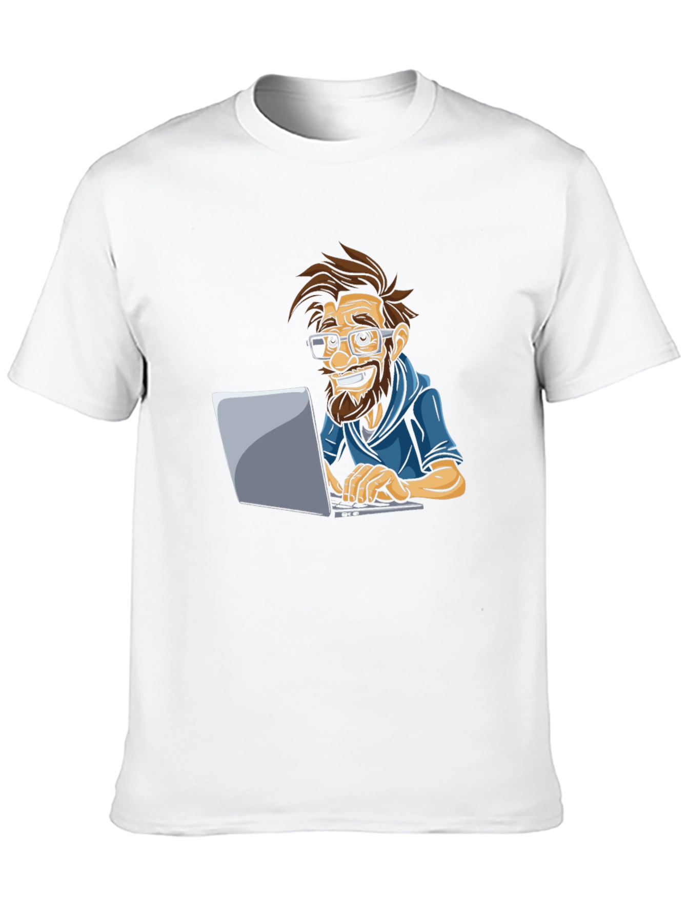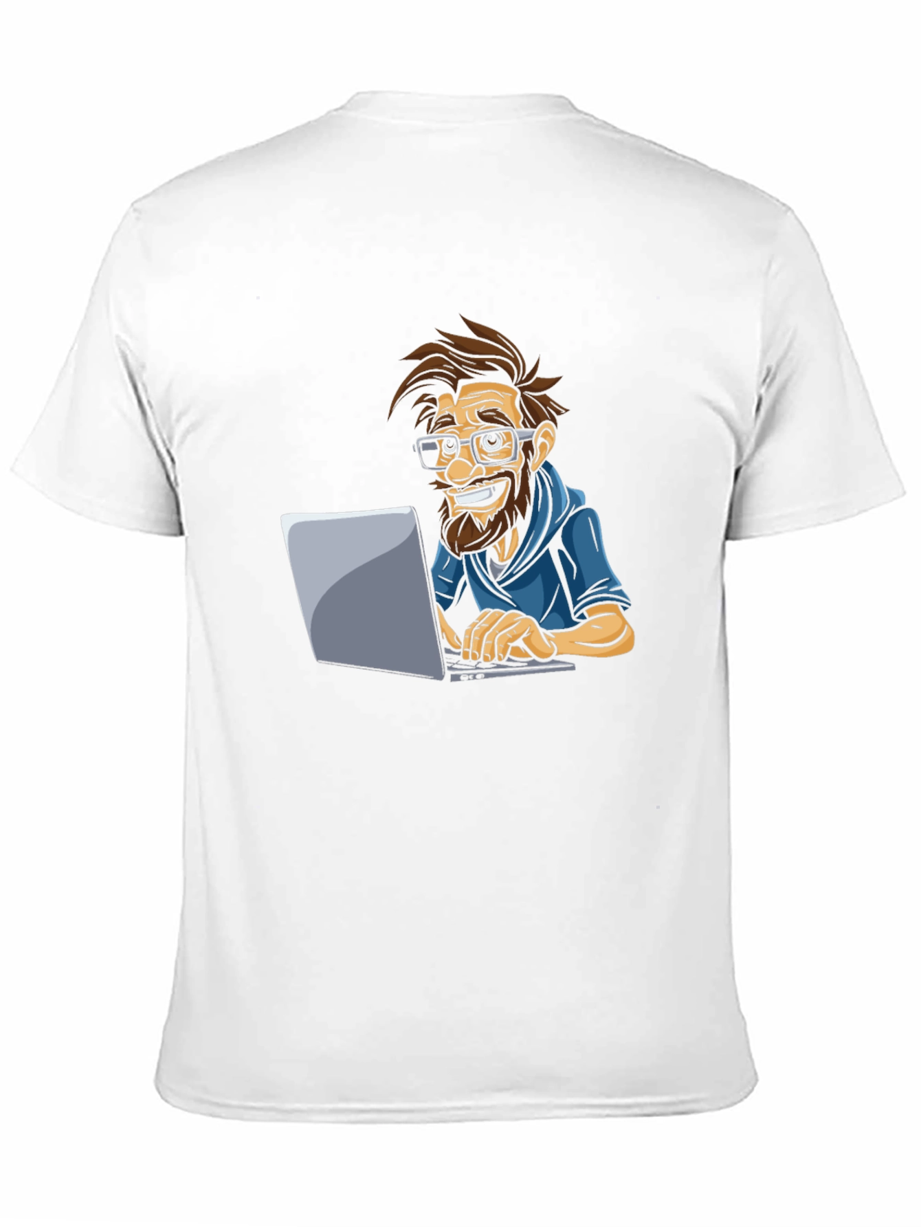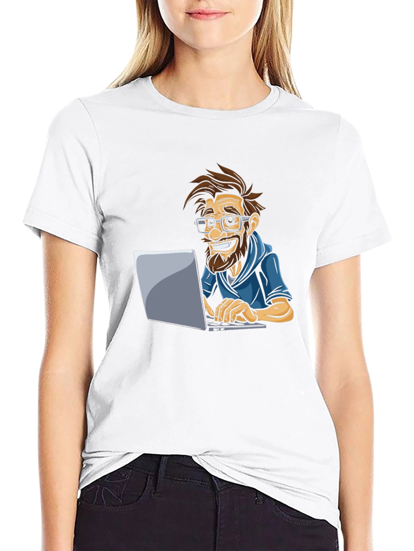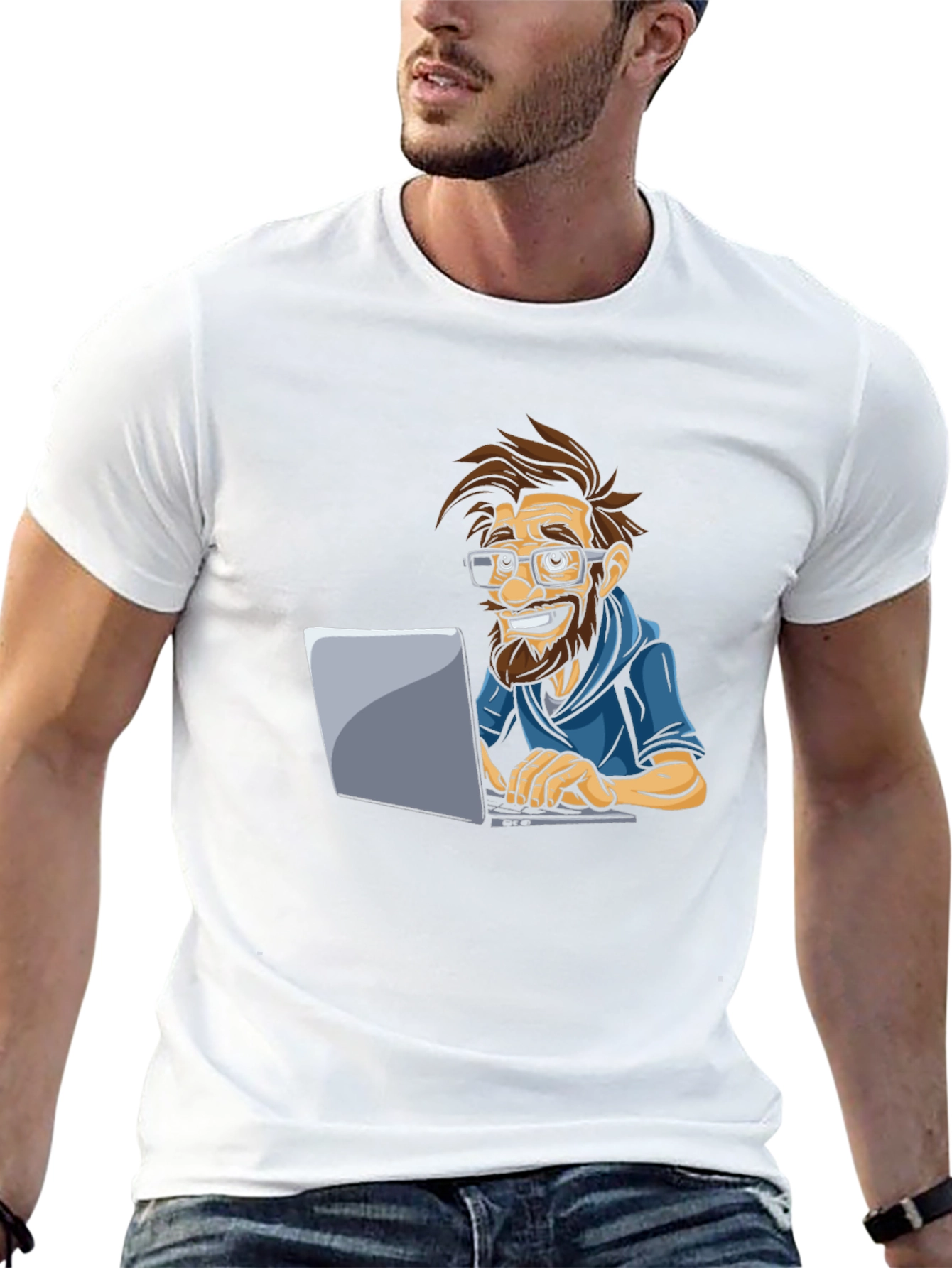 Luce esta camiseta negra con un diseño único y divertido. Presenta un personaje animado, un programador con barba y gafas, trabajando en su laptop. Ideal para los amantes de la tecnología y la programación. Perfecta para un look casual y original, esta camiseta destaca por su estilo llamativo y moderno. Su color negro facilita la combinación con cualquier outfit. Fabricada con materiales cómodos y duraderos, es una prenda esencial para tu guardarropa. ¡Muestra tu pasión por la informática con esta camiseta de diseño exclusivo!