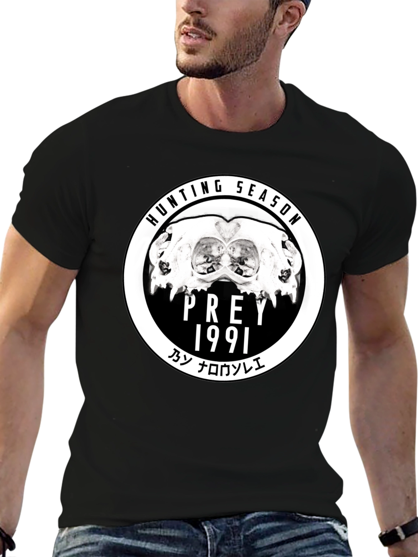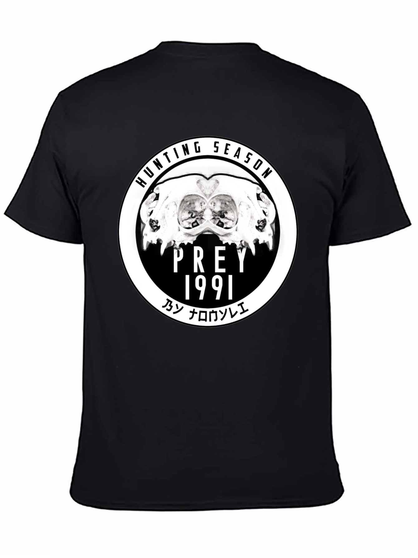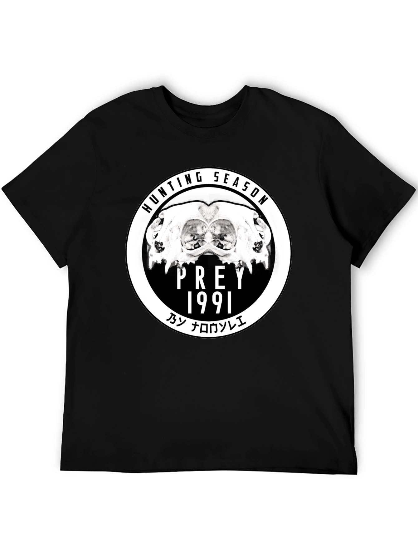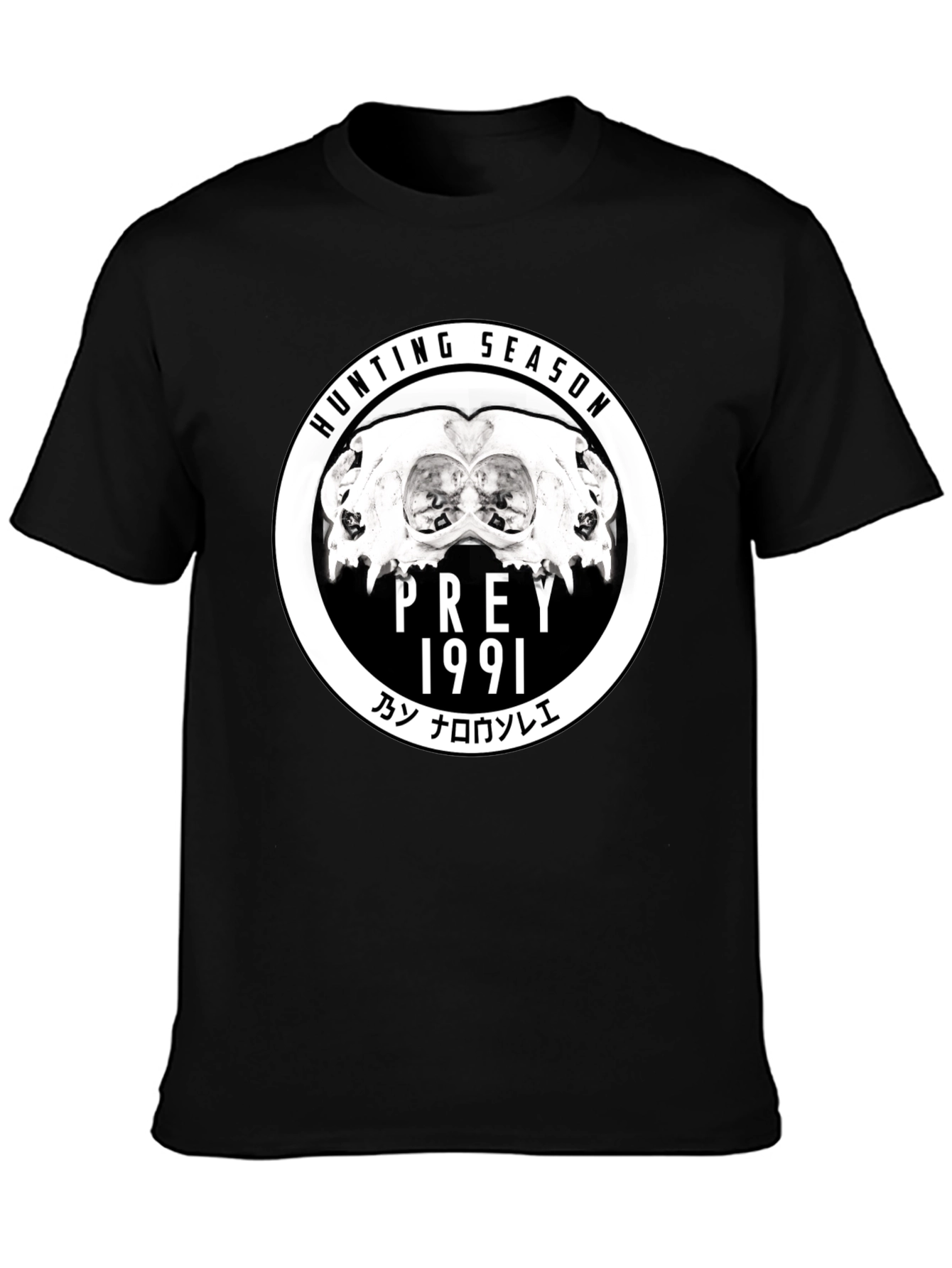 Luce esta llamativa camiseta negra con un diseño audaz y misterioso. Presenta un gráfico circular impactante con la frase "Hunting Season" en la parte superior, una calavera blanca estilizada de un animal en el centro y la palabra "PREY" con el año "1991" debajo. Un texto adicional en un idioma asiático añade un toque enigmático. Confeccionada en un tejido suave y cómodo, esta camiseta de manga corta es ideal para expresar tu individualidad. Perfecta para un look casual, conciertos, o cualquier ocasión donde quieras destacar. Muestra tu estilo único con esta prenda distintiva.