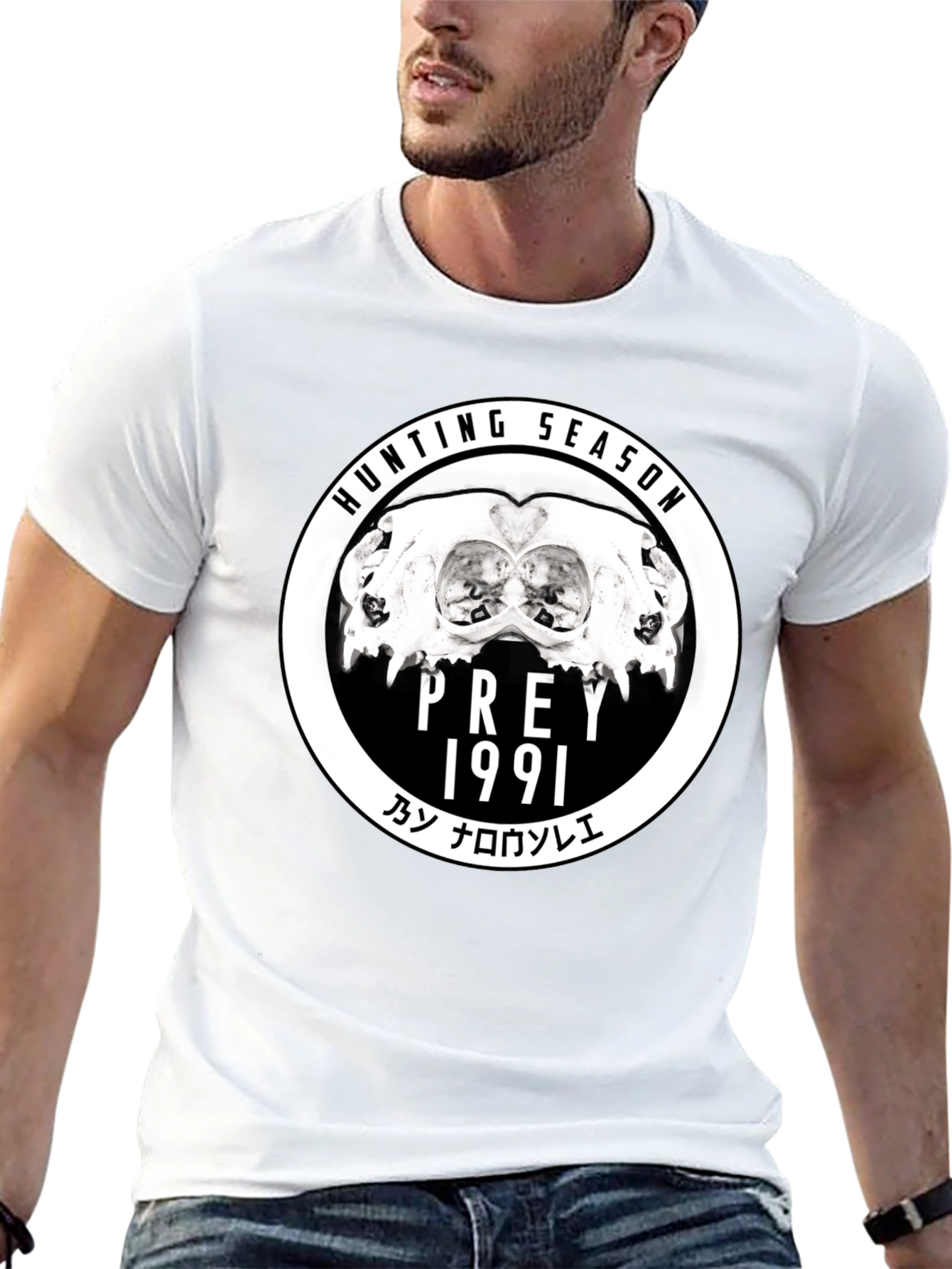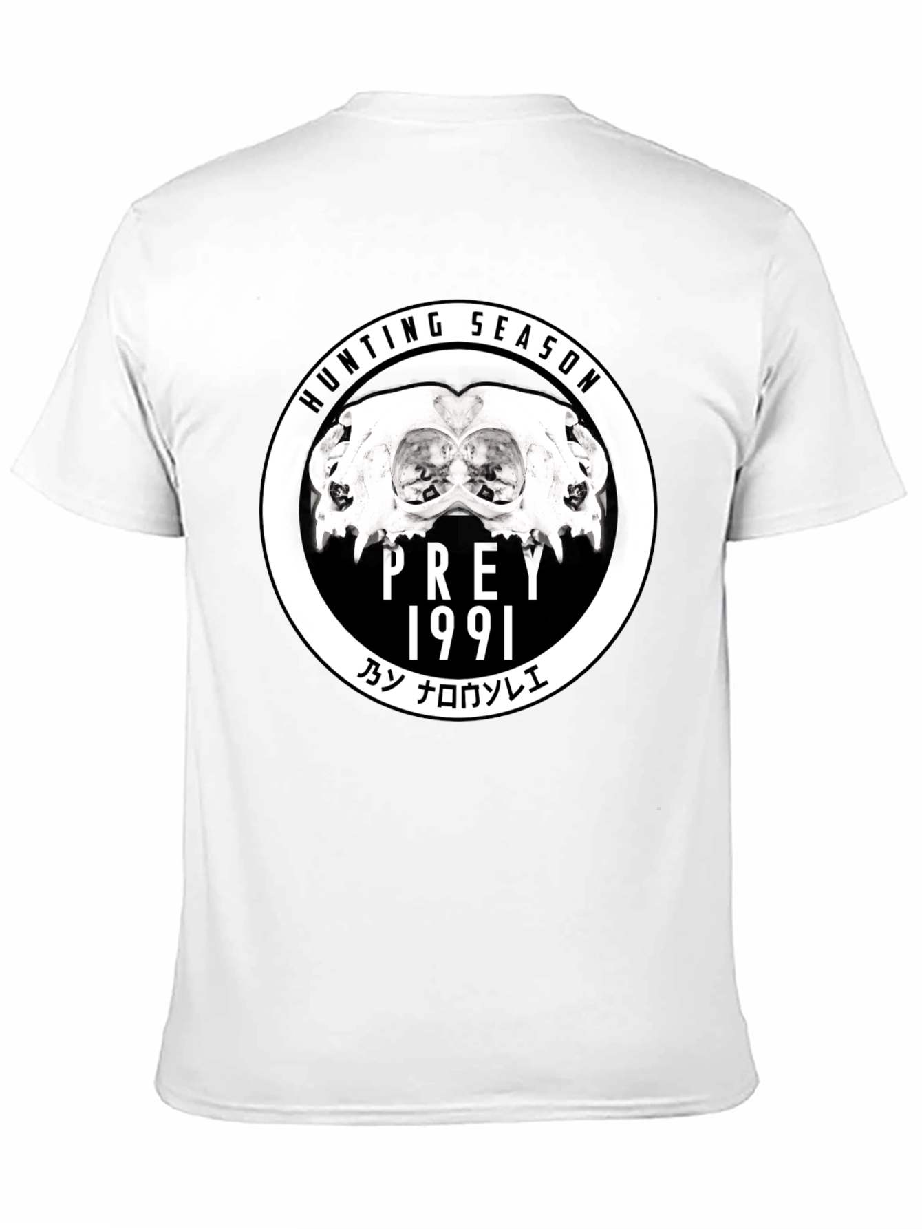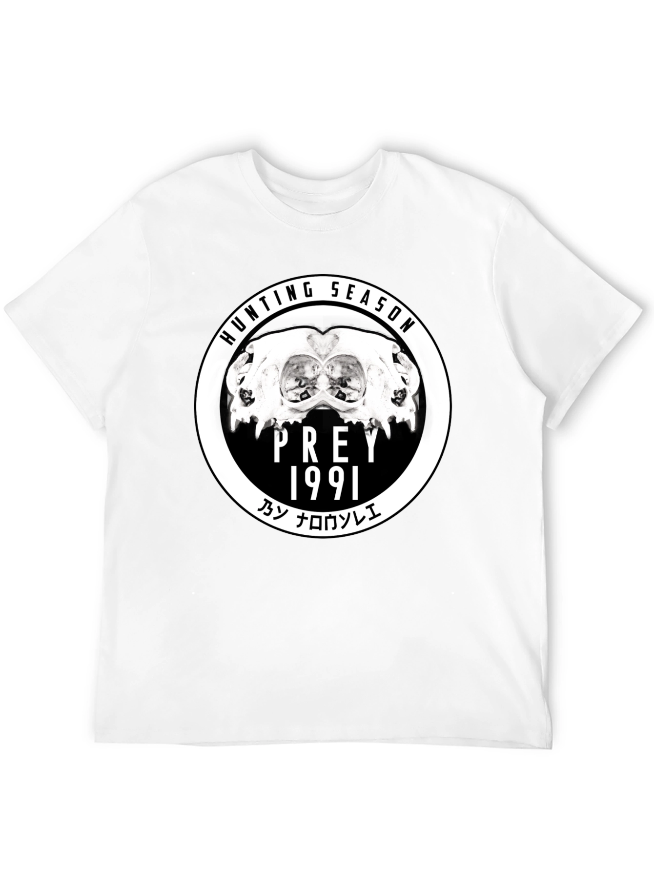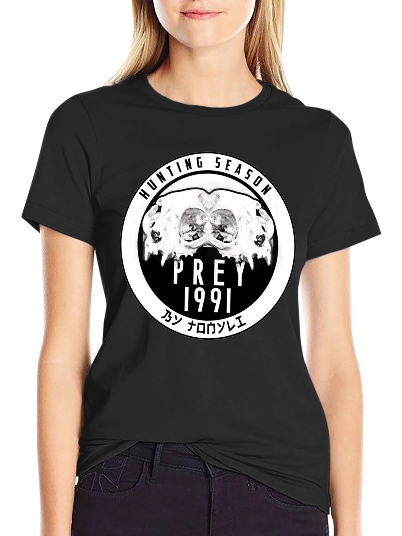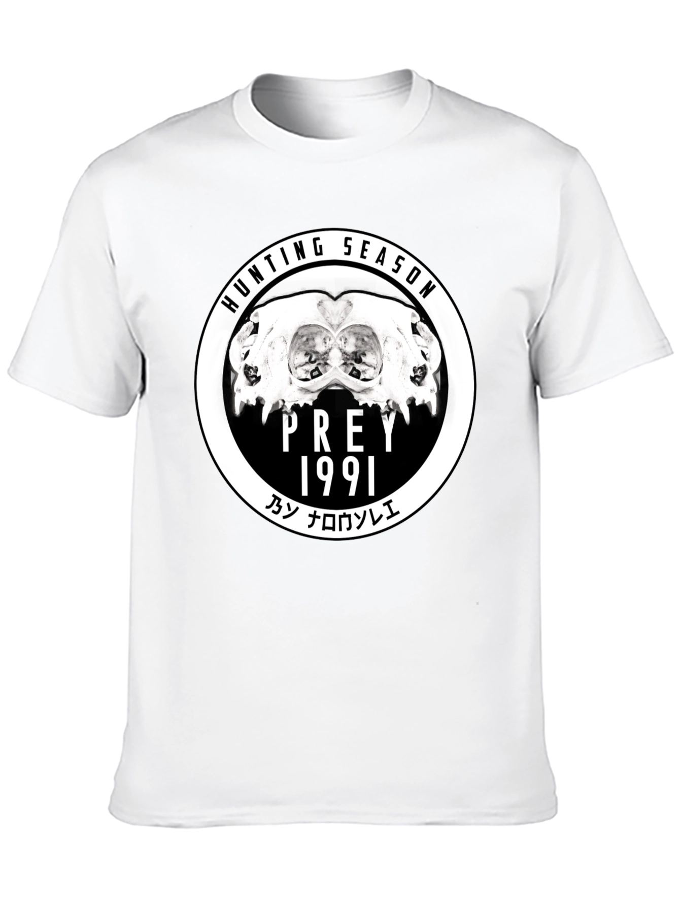 Luce esta llamativa camiseta negra con un diseño audaz y misterioso. Presenta un gráfico circular impactante con la frase "Hunting Season" en la parte superior, una calavera blanca estilizada de un animal en el centro y la palabra "PREY" con el año "1991" debajo. Un texto adicional en un idioma asiático añade un toque enigmático. Confeccionada en un tejido suave y cómodo, esta camiseta de manga corta es ideal para expresar tu individualidad. Perfecta para un look casual, conciertos, o cualquier ocasión donde quieras destacar. Muestra tu estilo único con esta prenda distintiva.