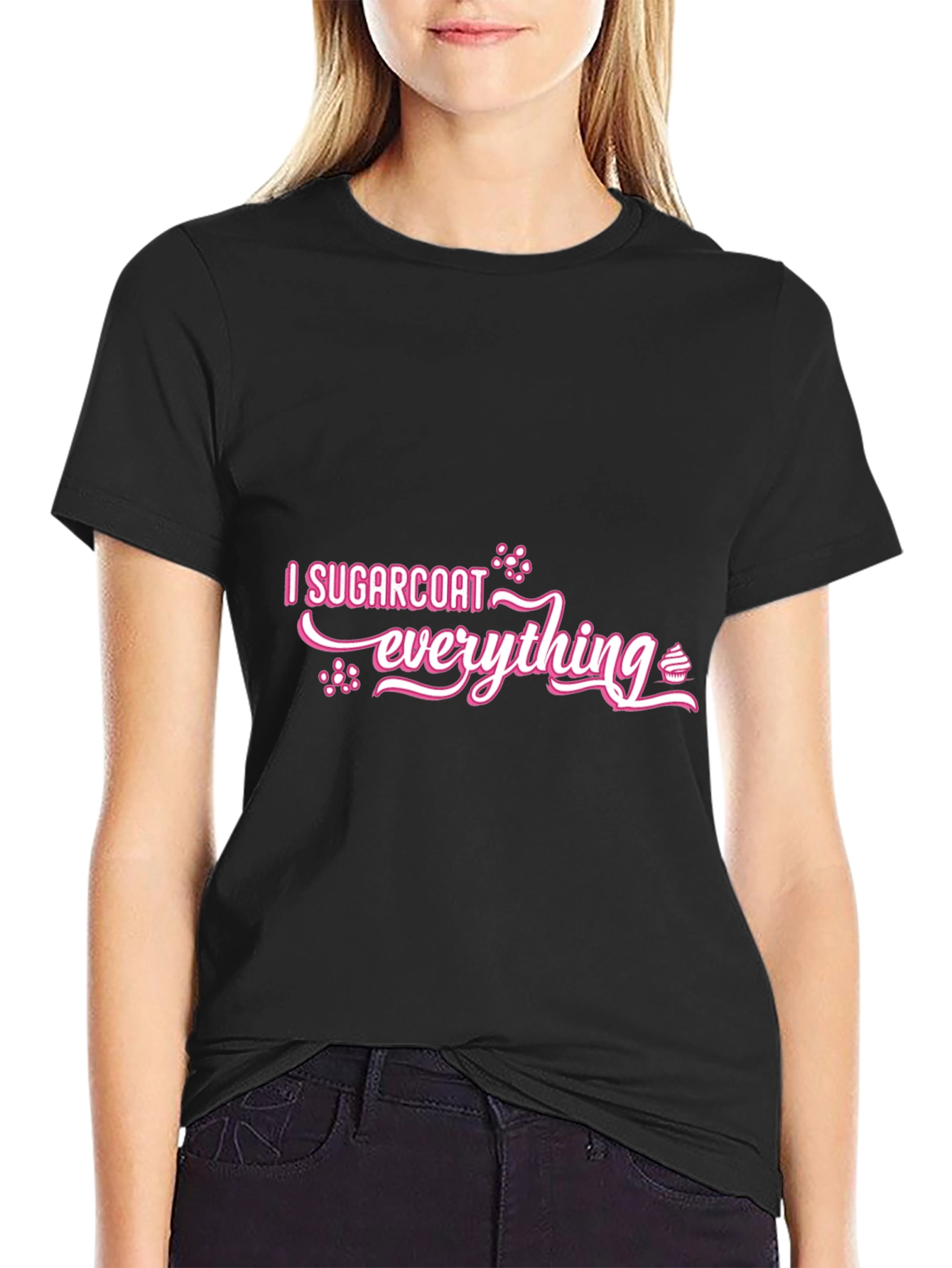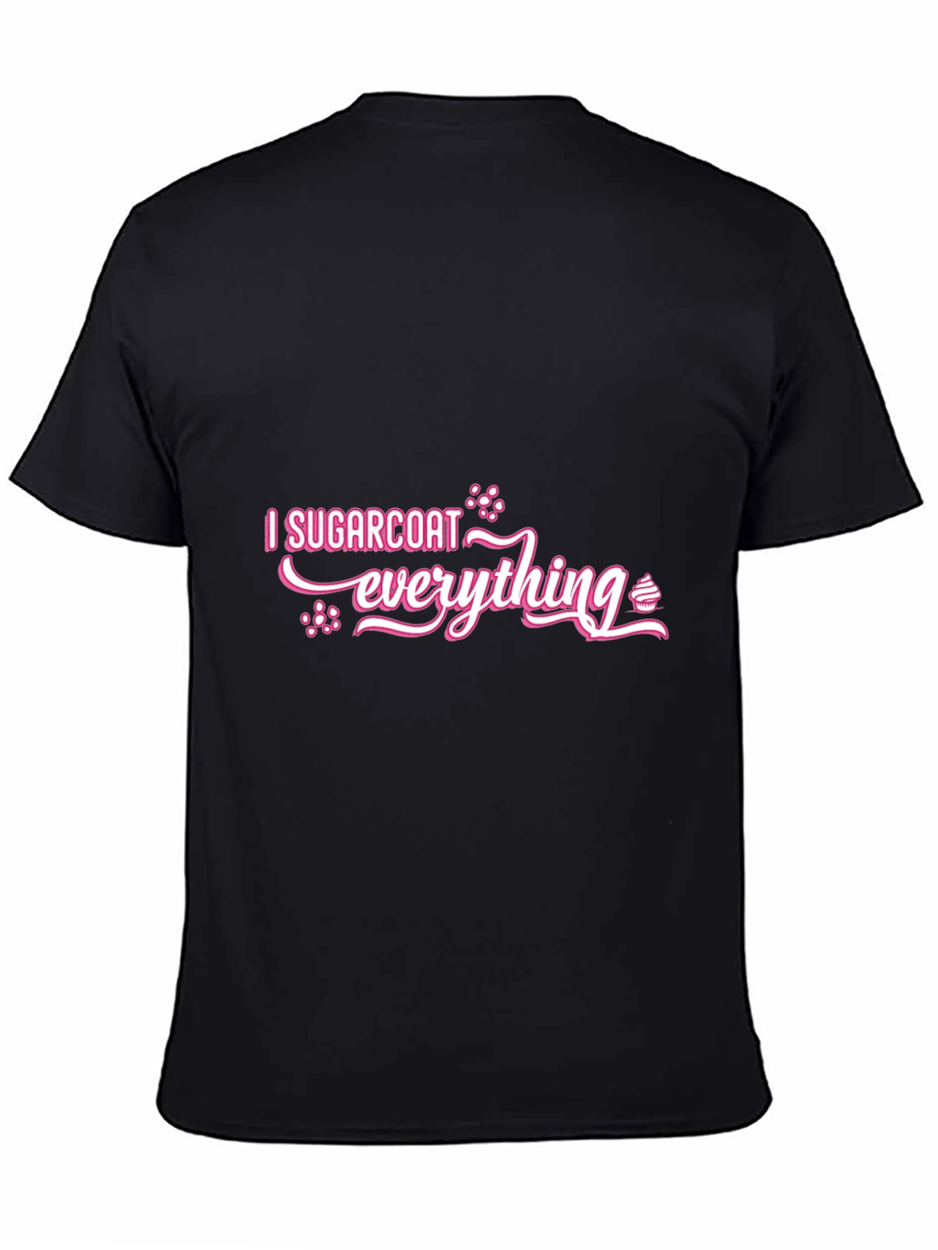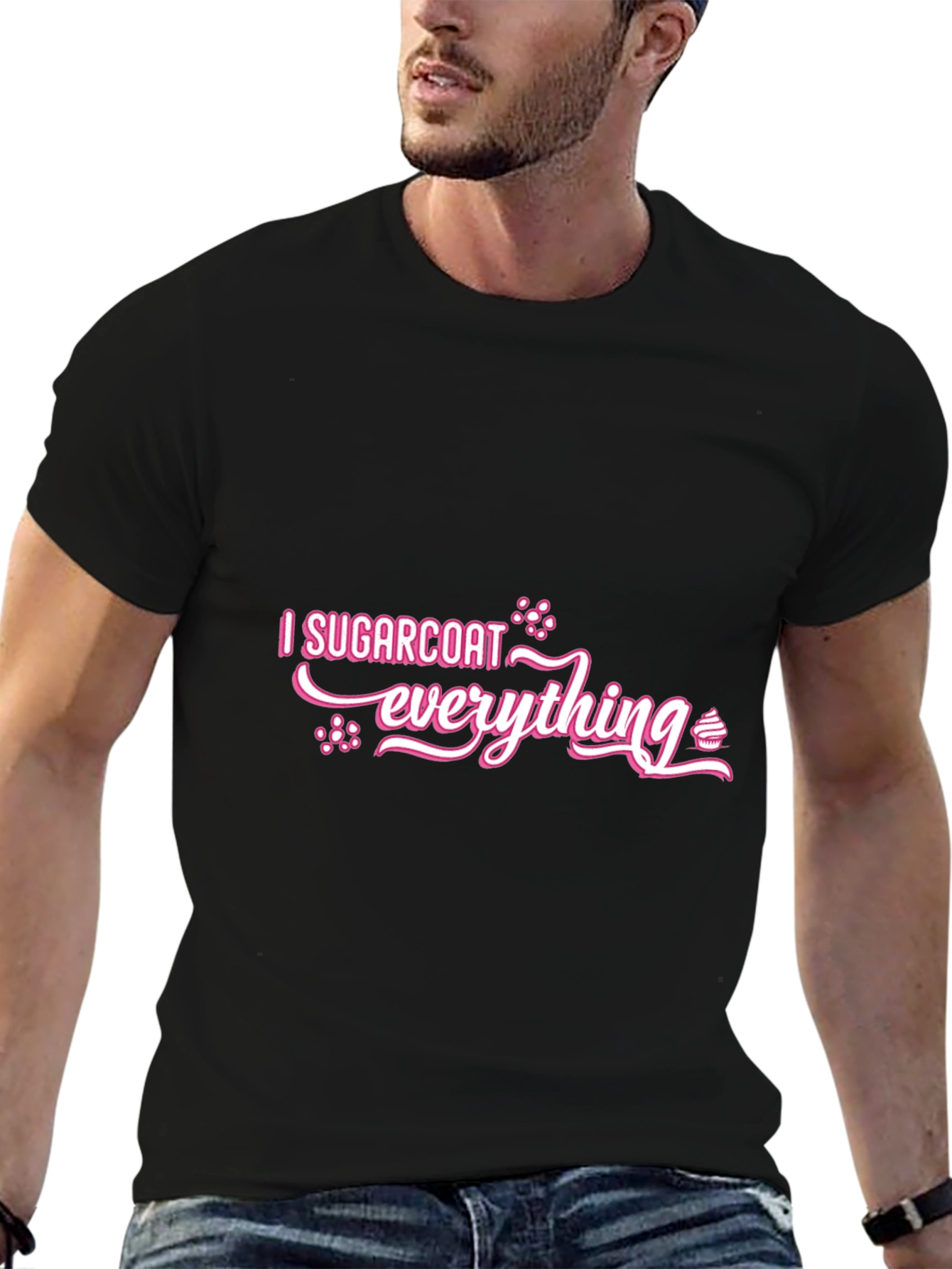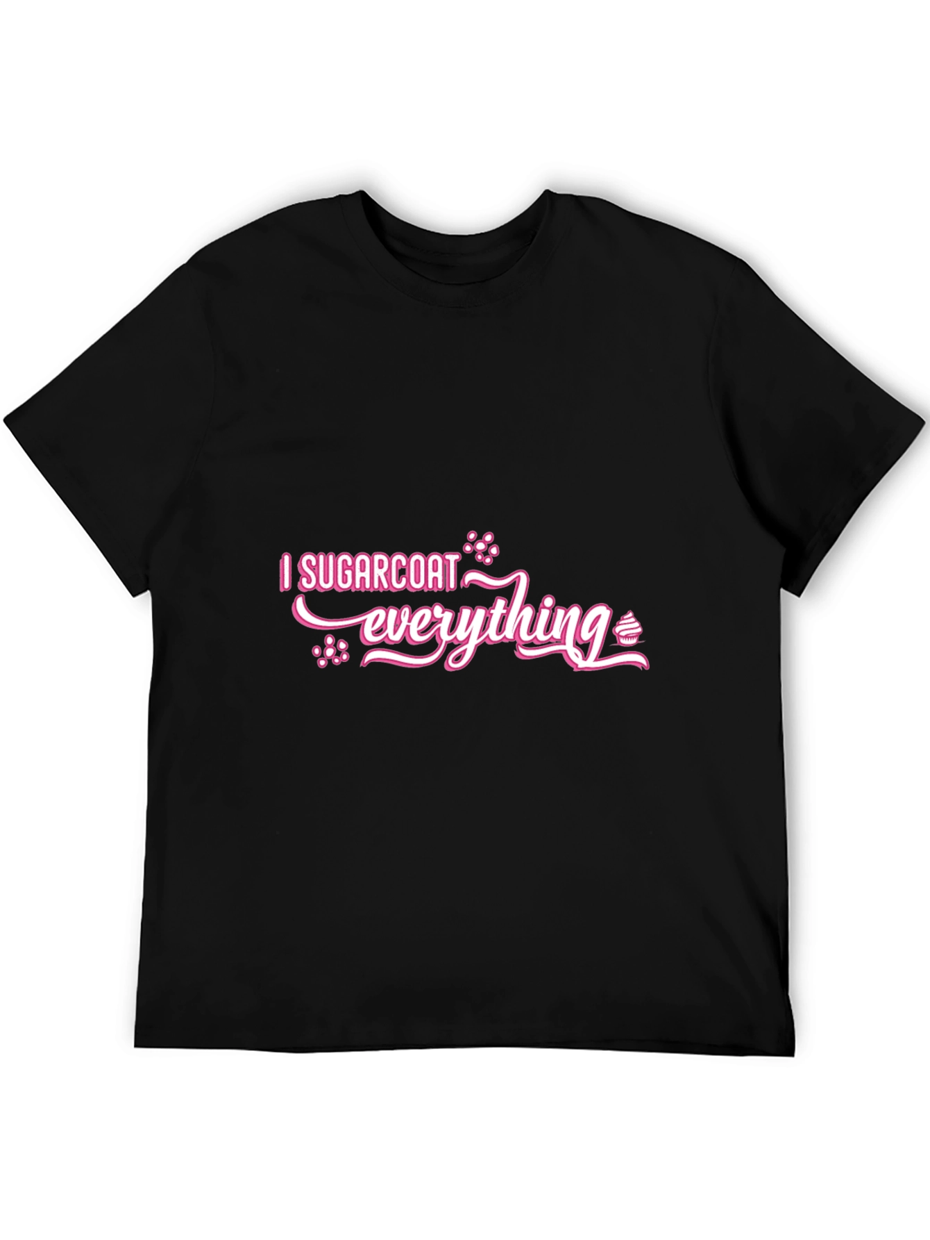 Esta camiseta negra de corte clásico presenta un diseño llamativo y divertido. En el centro, se destaca la frase 'I Sugarcoat Everything' en una tipografía estilizada de color rosa, adornada con pequeños detalles que simulan confeti y un cupcake. Ideal para los amantes de la repostería o aquellos con un sentido del humor dulce. La prenda parece estar confeccionada en un material suave y cómodo, perfecto para usar en el día a día. Su diseño único la convierte en una excelente opción para expresar tu personalidad y agregar un toque de diversión a tu outfit. Llévala para una salida casual, una tarde de compras o simplemente para relajarte en casa con estilo.