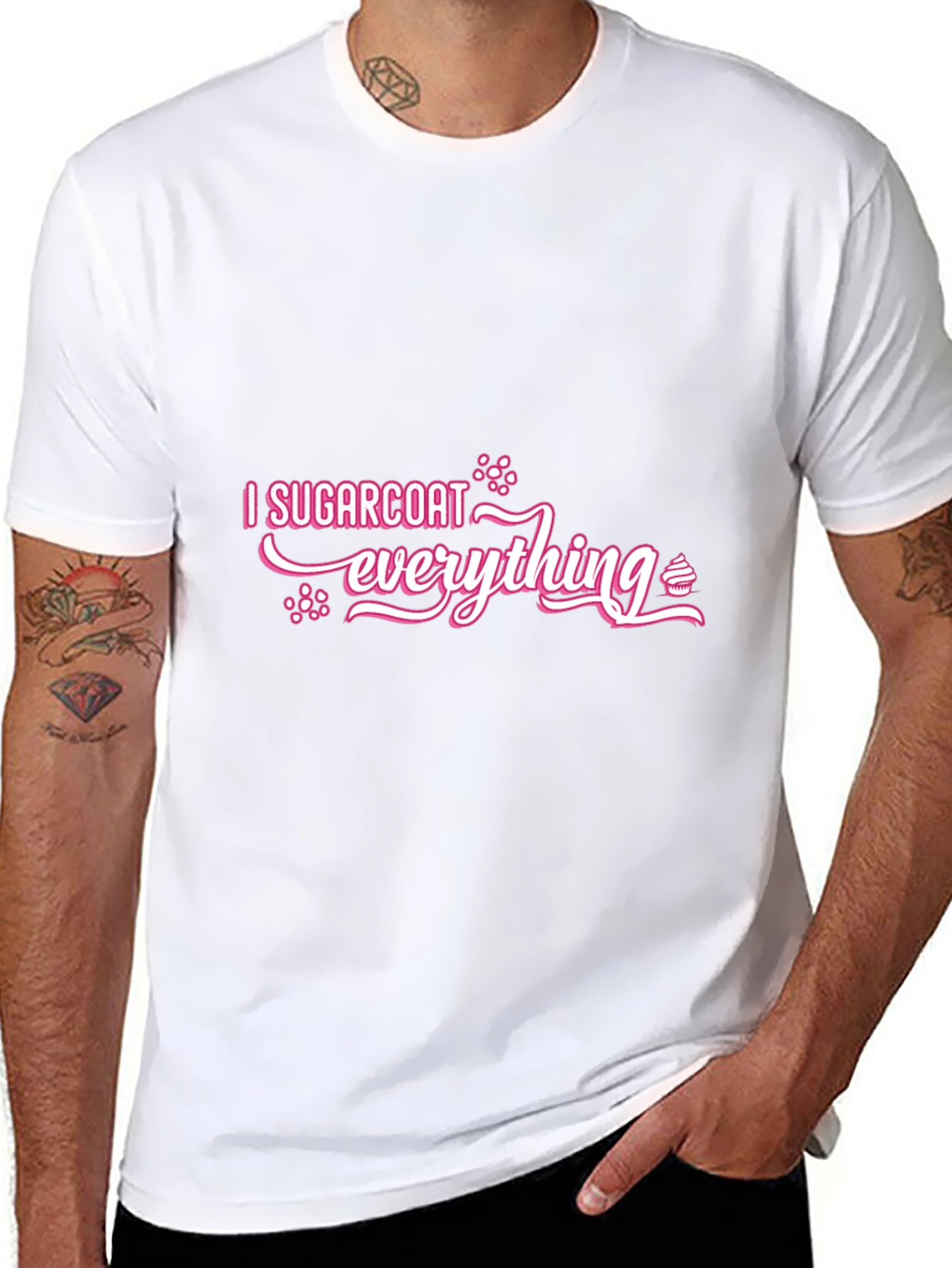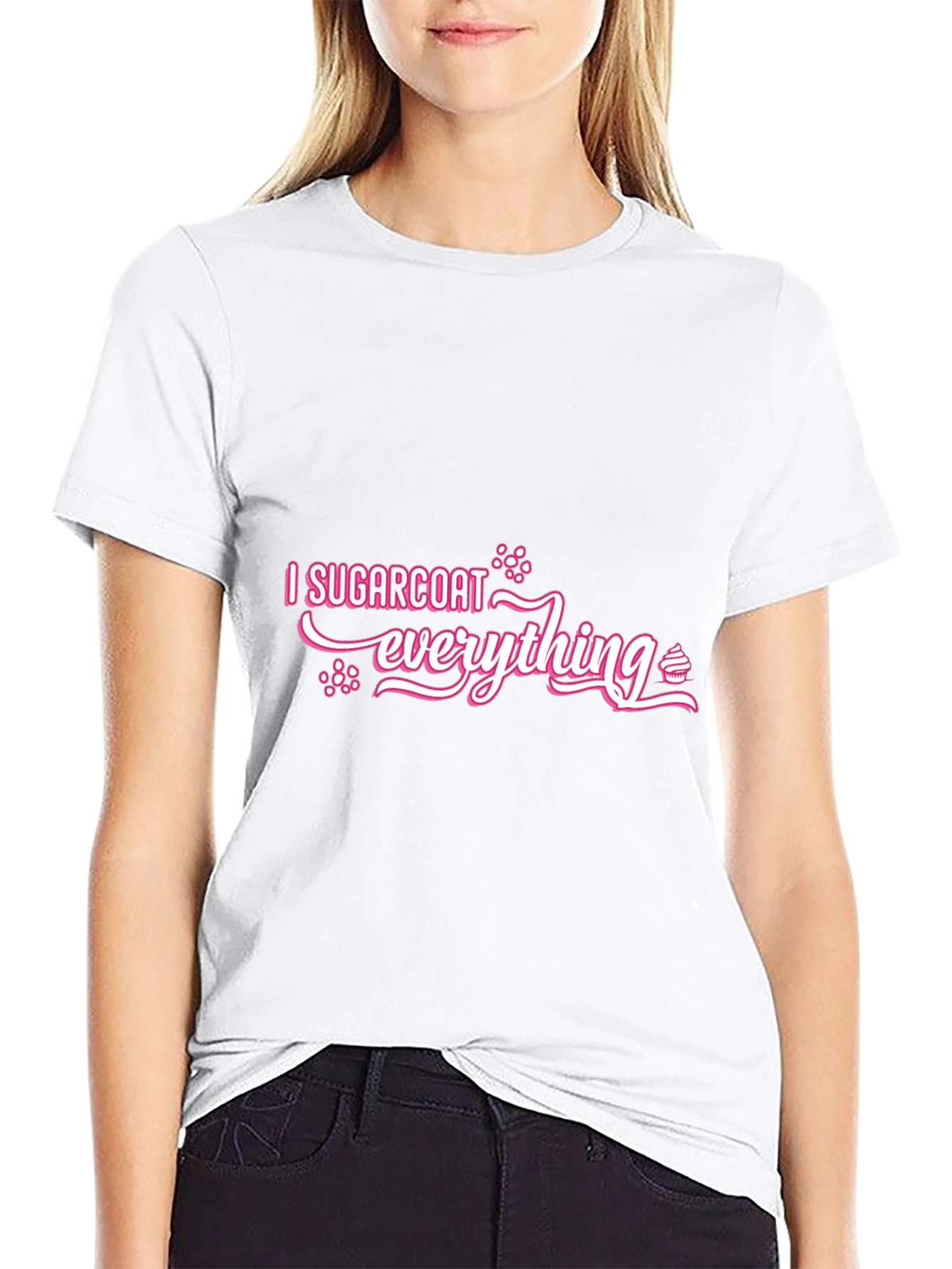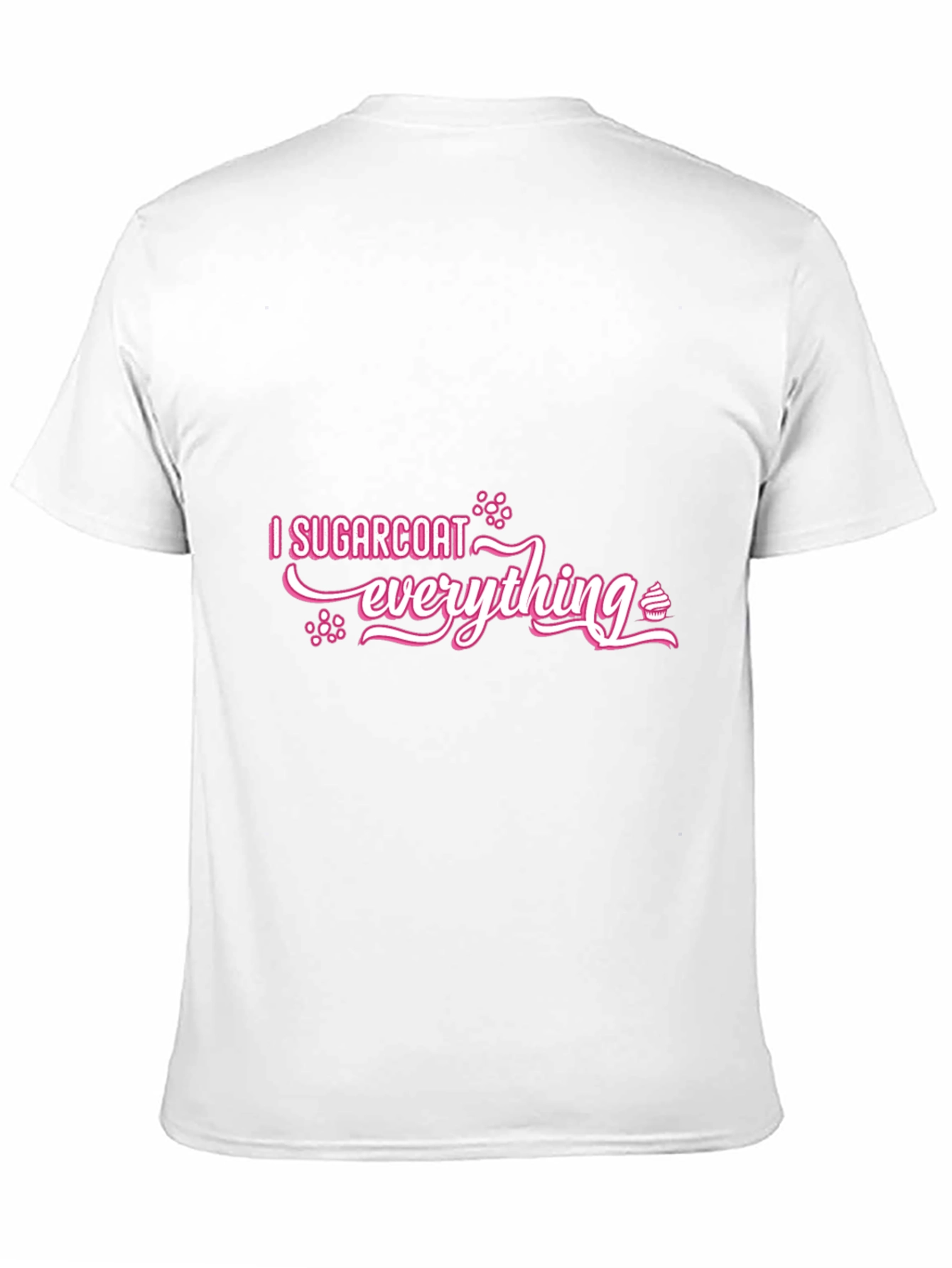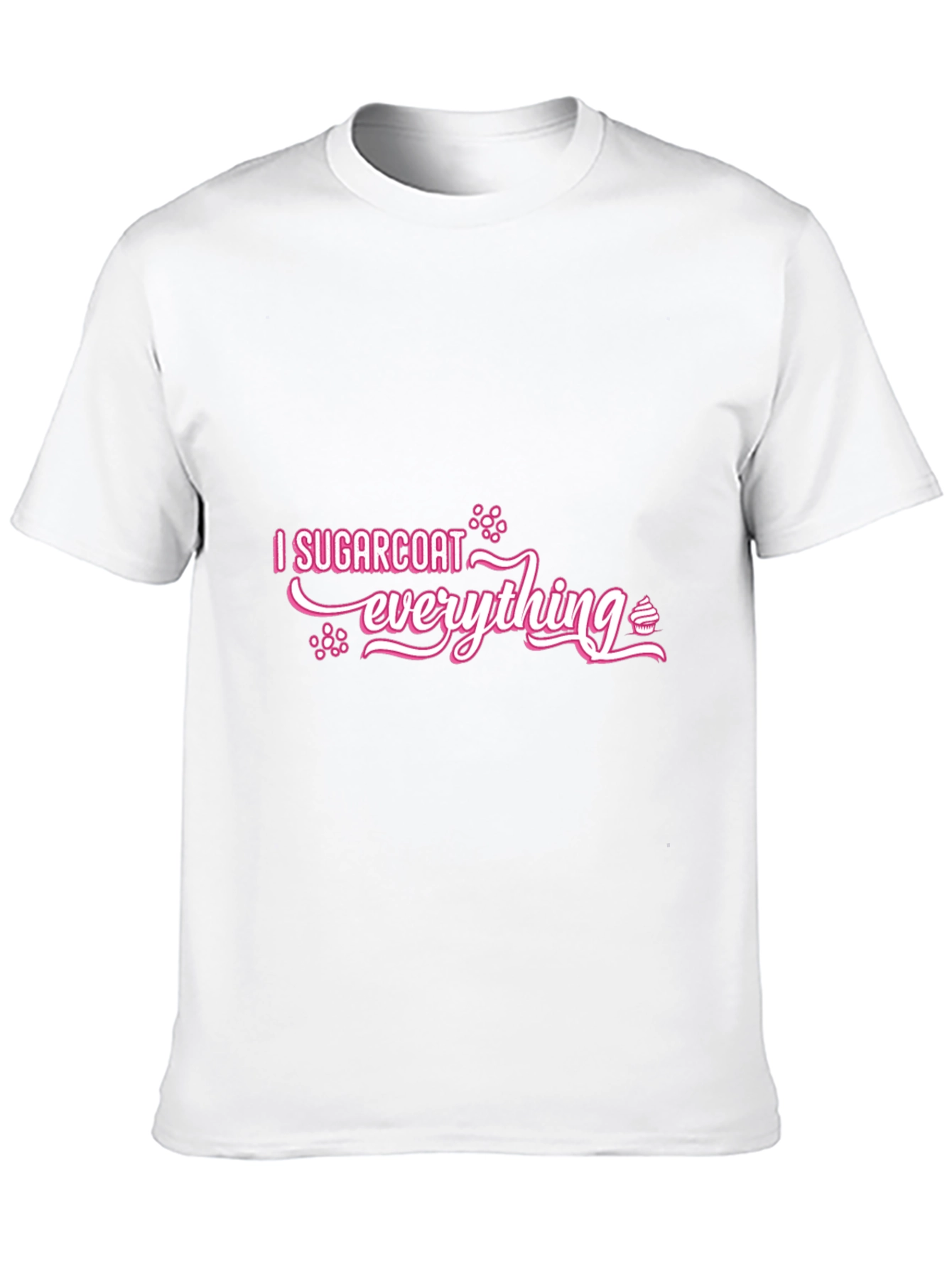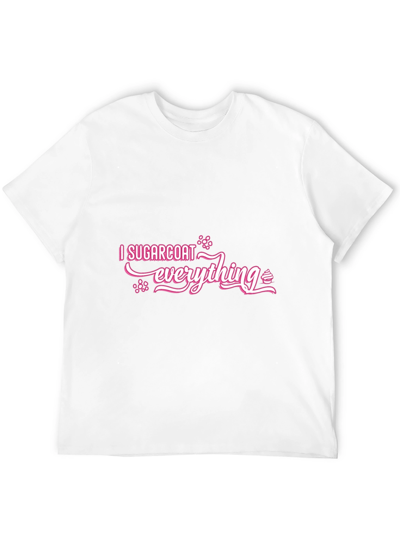 Esta camiseta negra de corte clásico presenta un diseño llamativo y divertido. En el centro, se destaca la frase 'I Sugarcoat Everything' en una tipografía estilizada de color rosa, adornada con pequeños detalles que simulan confeti y un cupcake. Ideal para los amantes de la repostería o aquellos con un sentido del humor dulce. La prenda parece estar confeccionada en un material suave y cómodo, perfecto para usar en el día a día. Su diseño único la convierte en una excelente opción para expresar tu personalidad y agregar un toque de diversión a tu outfit. Llévala para una salida casual, una tarde de compras o simplemente para relajarte en casa con estilo.