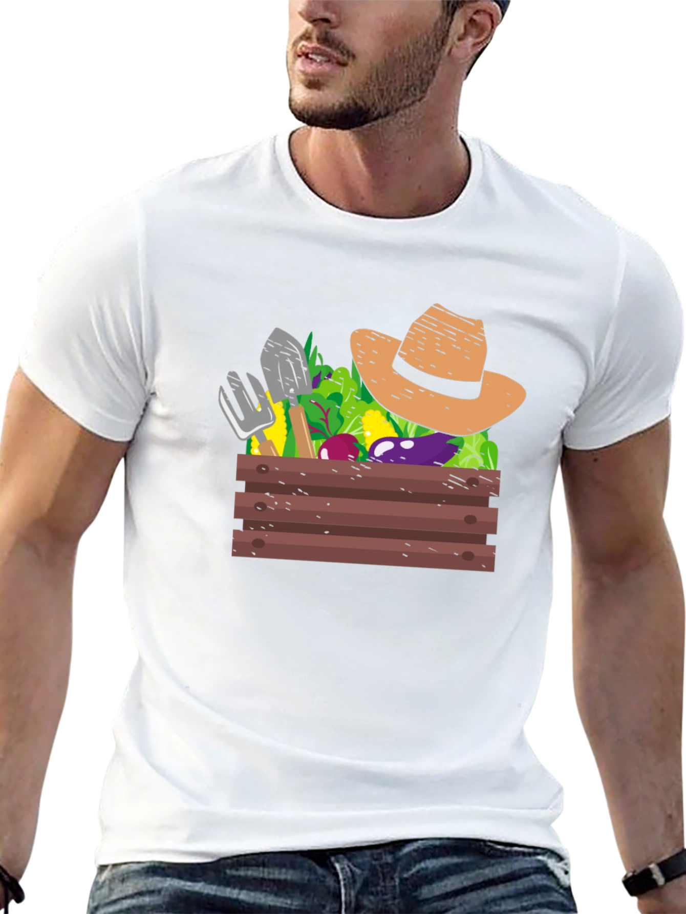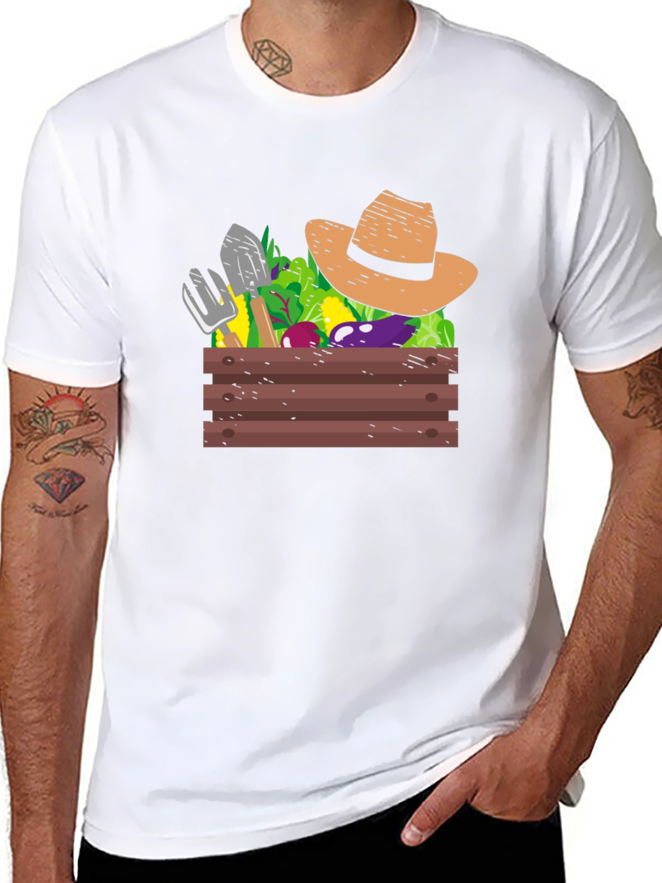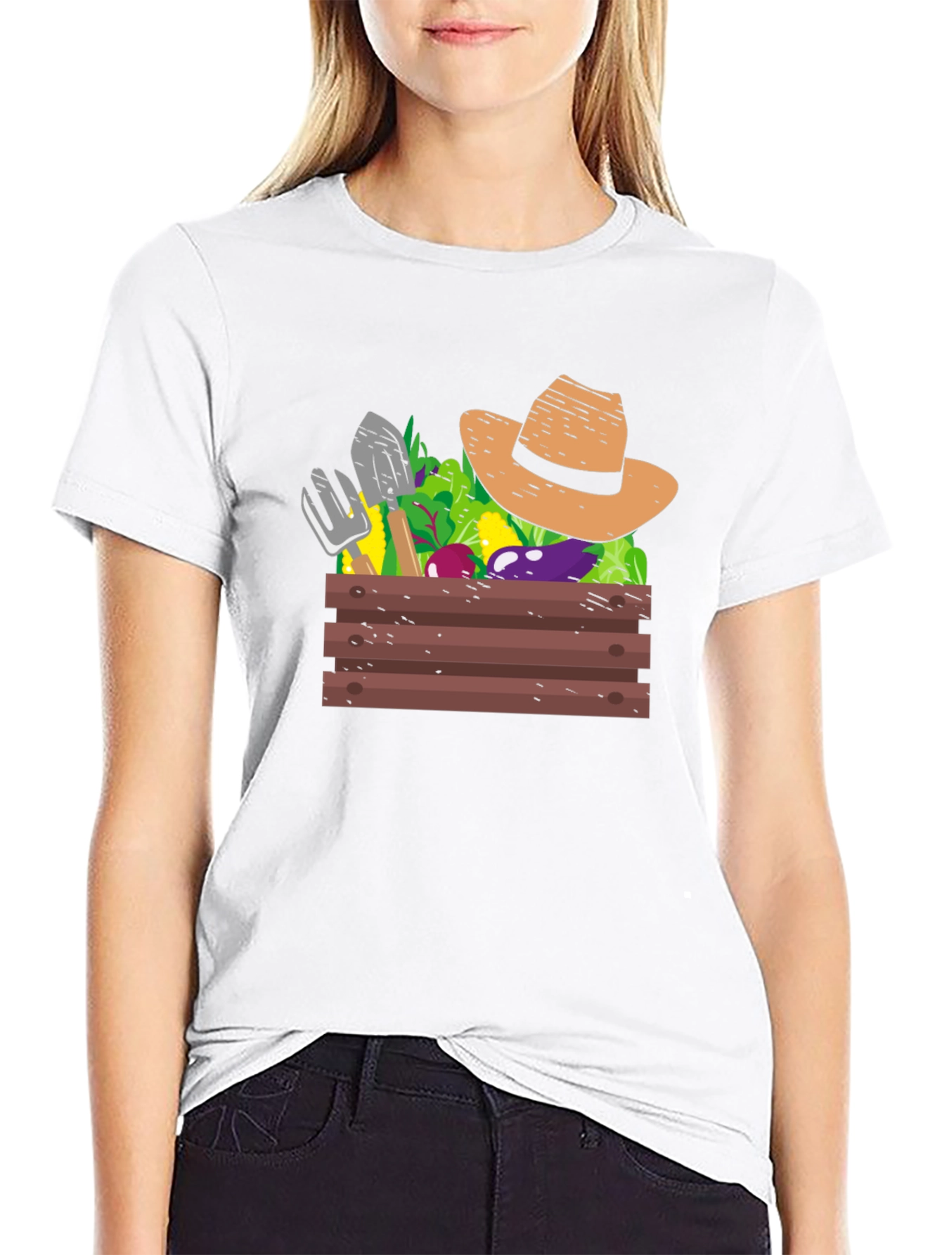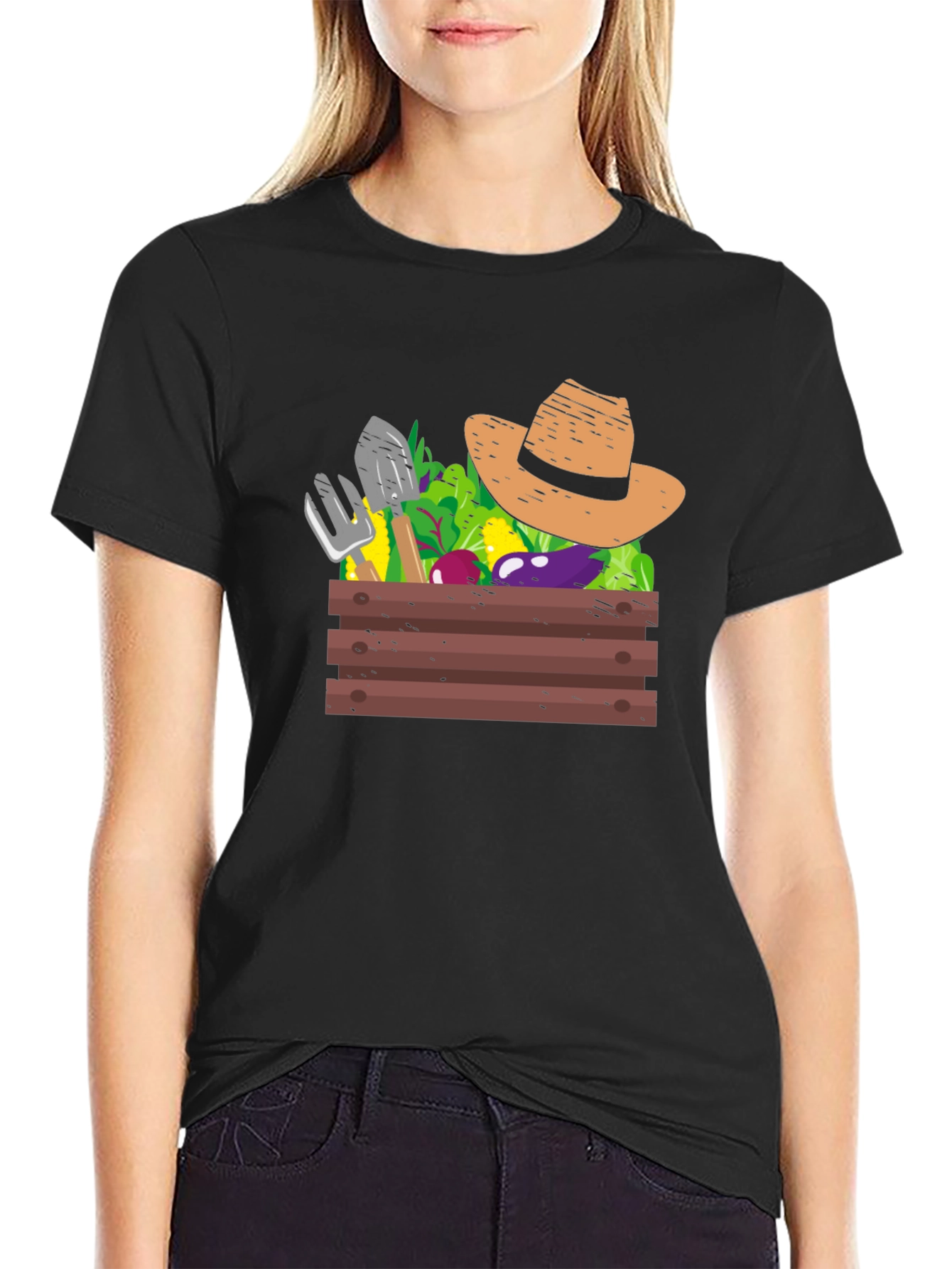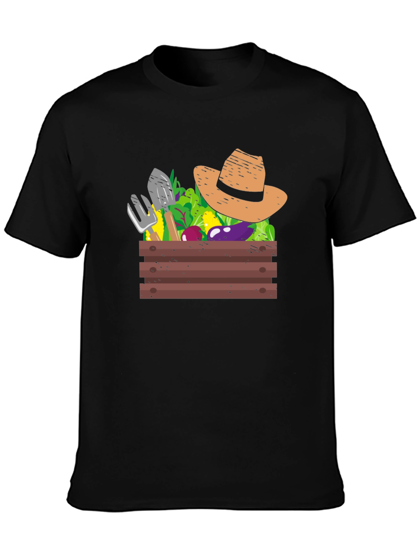 Luce tu pasión por la jardinería con esta original camiseta negra. Presenta un diseño llamativo de una caja de madera rebosante de vegetales frescos, herramientas de jardín y un sombrero de paja. Perfecta para los amantes de la huerta y la vida al aire libre, esta camiseta es ideal para usarla en el jardín, en salidas casuales o como un regalo especial. El color negro de la camiseta resalta el colorido diseño, atrayendo las miradas y desatando conversaciones sobre tu pasatiempo favorito. Muestra tu estilo único y tu conexión con la naturaleza con esta prenda cómoda y con personalidad. Una prenda imprescindible para cualquier jardinero de corazón.