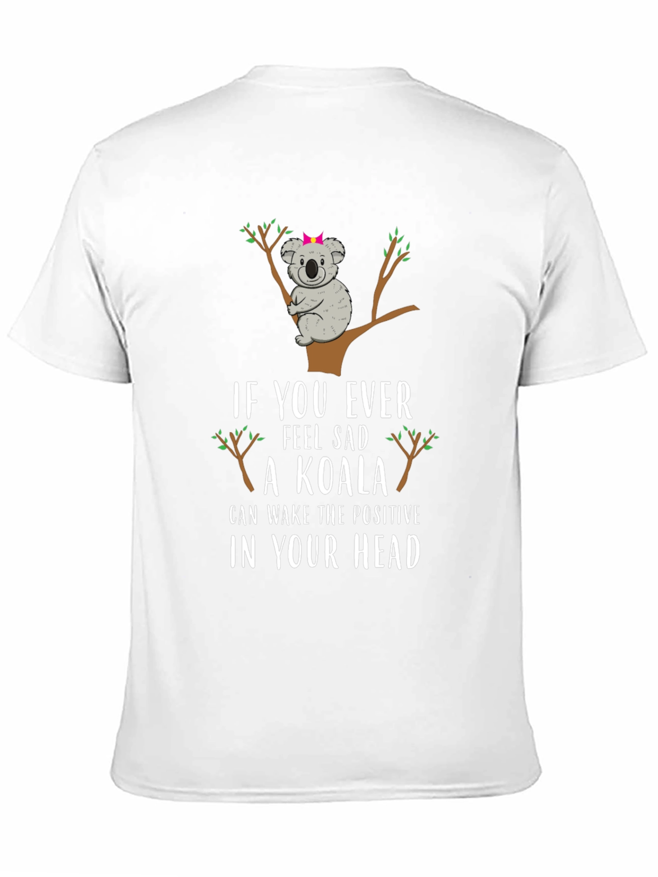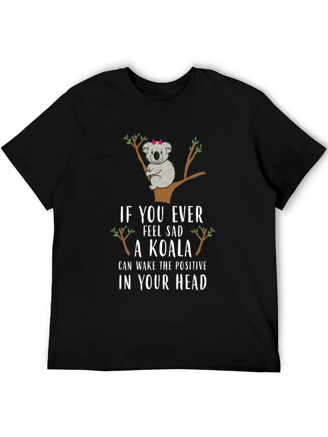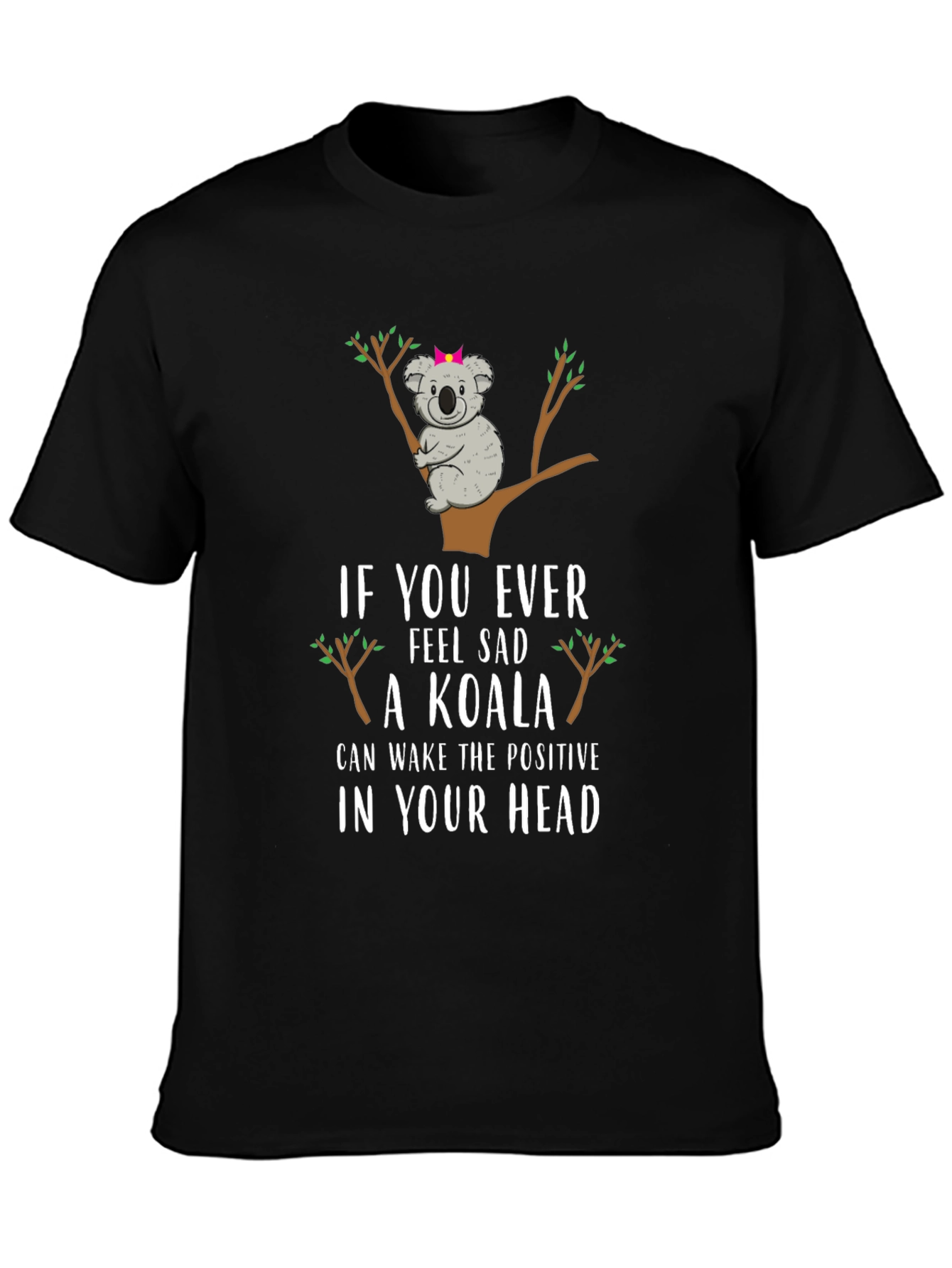 Luce esta divertida camiseta negra con un adorable koala en una rama. El diseño presenta la frase "IF YOU EVER FEEL SAD A KOALA CAN WAKE THE POSITIVE IN YOUR HEAD" (Si alguna vez te sientes triste, un koala puede despertar lo positivo en tu cabeza). Ideal para amantes de los animales y personas con un gran sentido del humor. Perfecta para uso diario, salidas casuales o como un regalo original y motivador. Con un corte cómodo y un estampado de alta calidad, esta camiseta te hará sonreír y contagiar alegría a tu alrededor. Añade un toque de positividad a tu guardarropa con esta prenda única.