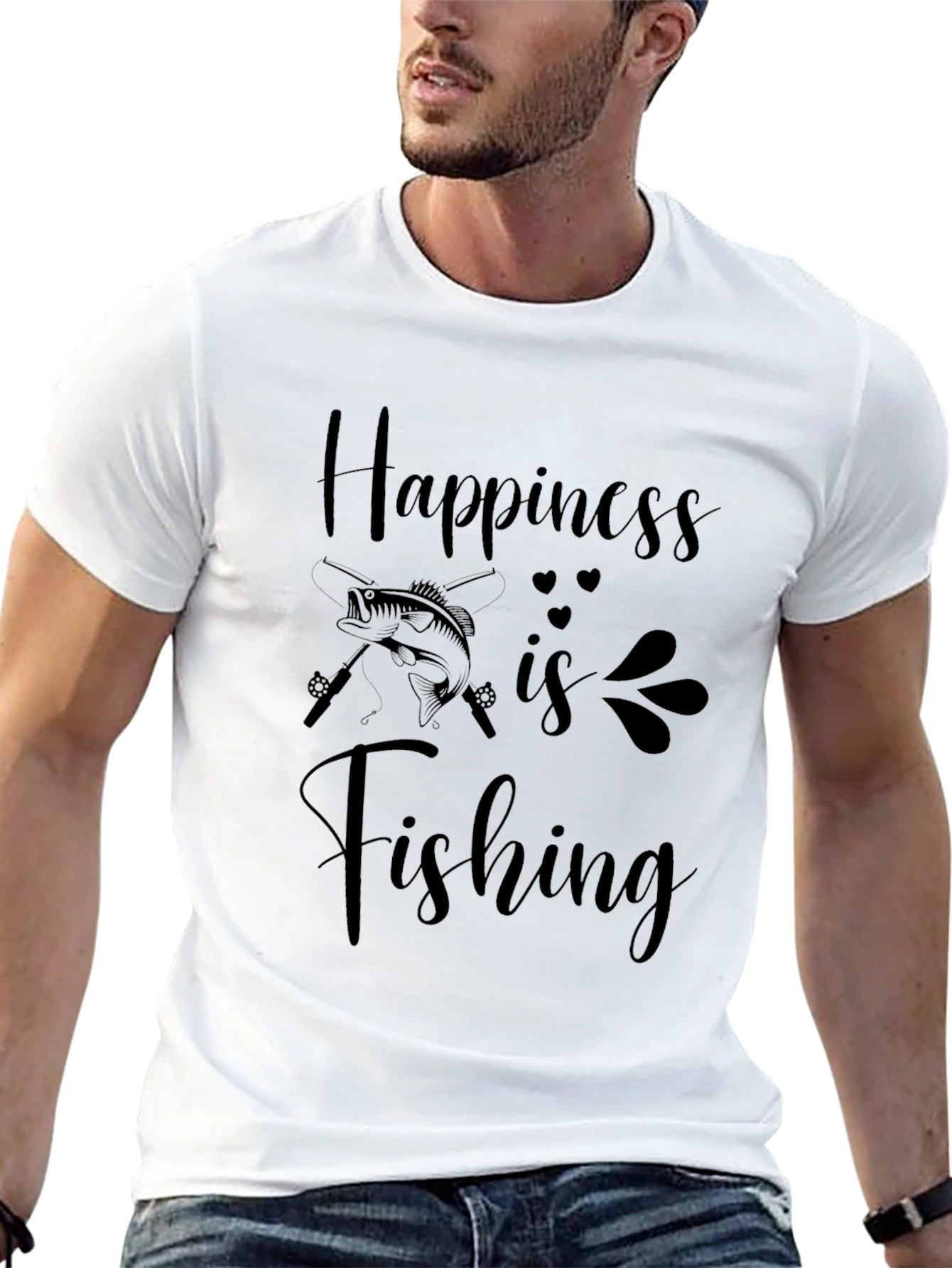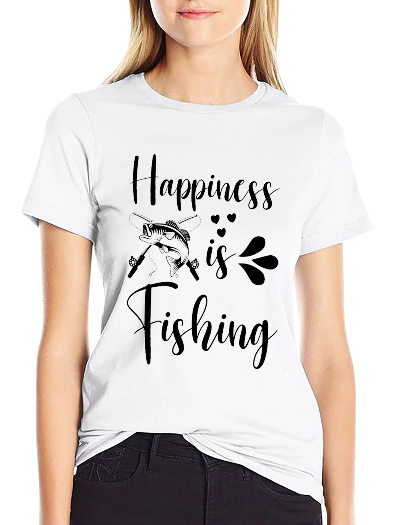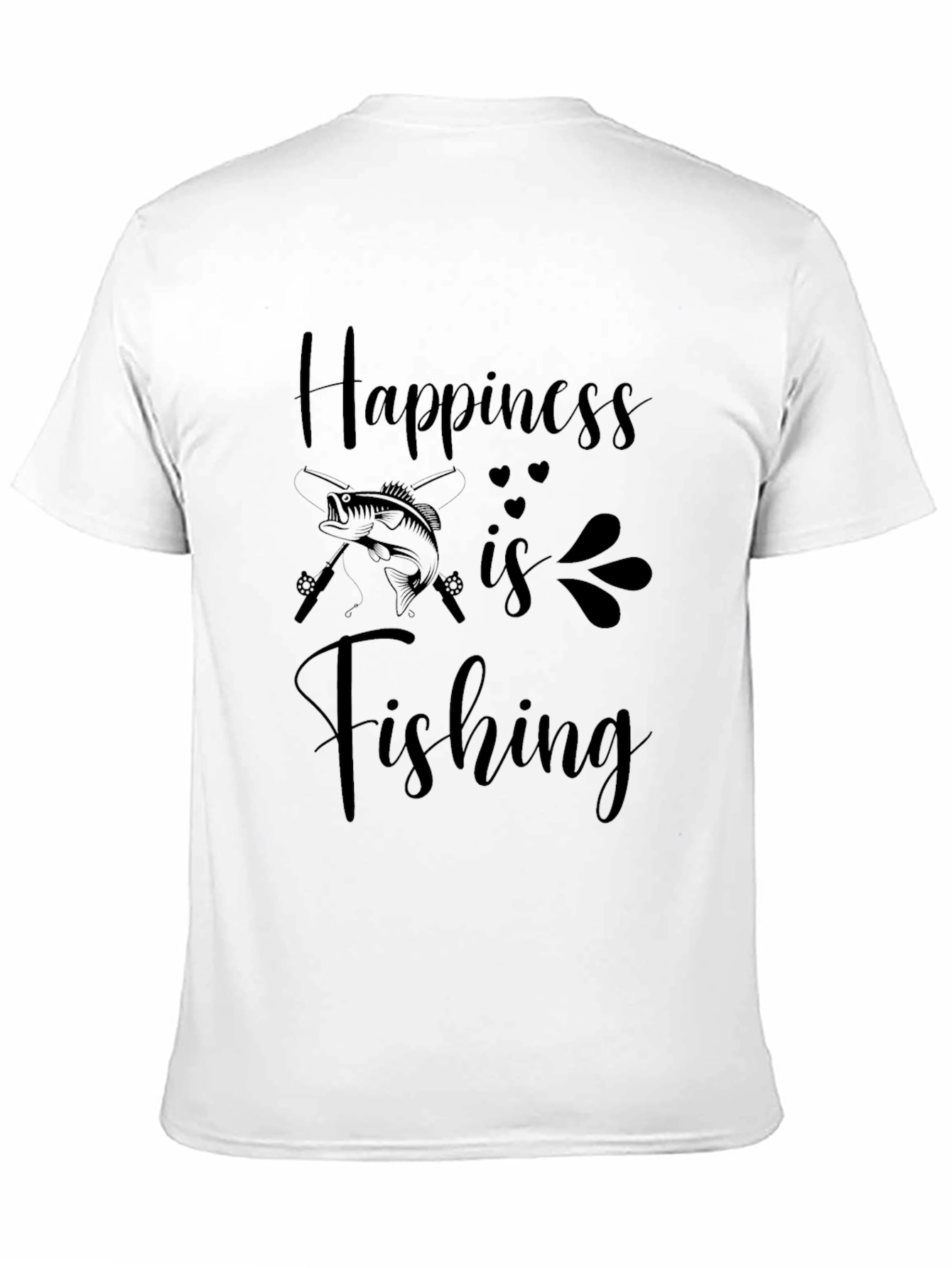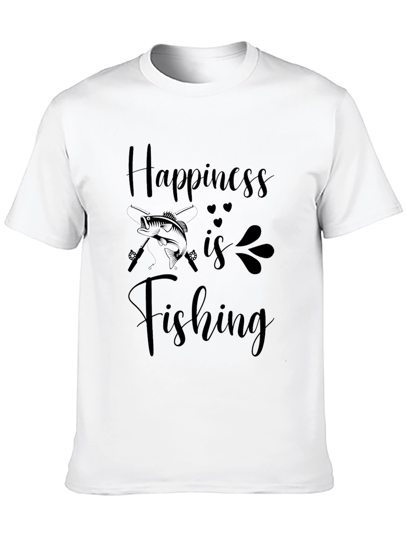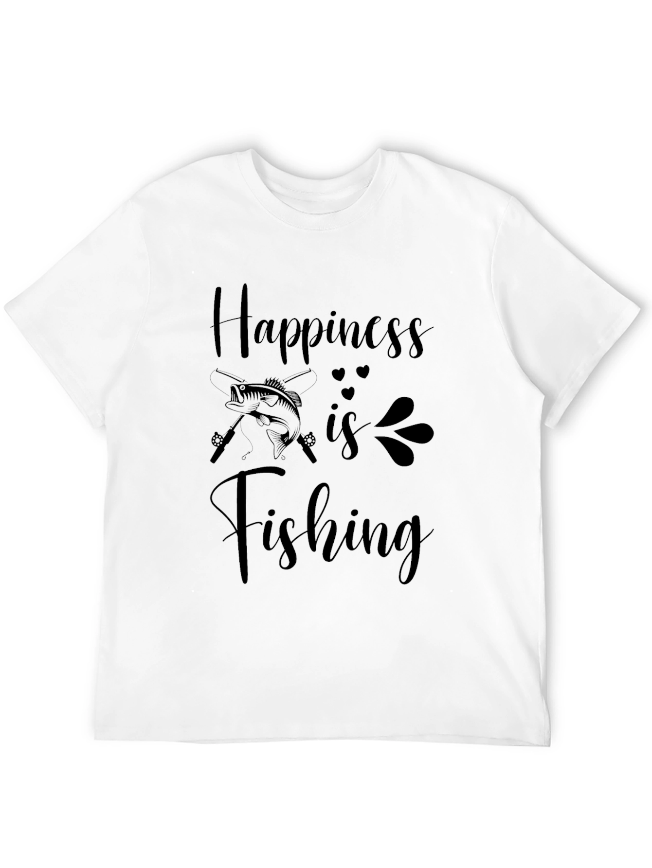 Esta camiseta negra de corte clásico presenta un estampado atractivo con la frase "La felicidad es pescar". El diseño incluye una ilustración de un pez y cañas de pescar cruzadas, acentuada con detalles sutiles de corazones y elementos decorativos. Confeccionada en un material suave y cómodo, ideal para el uso diario. Perfecta para los amantes de la pesca que buscan una prenda casual y con estilo para expresar su pasión. Úsela para ir de pesca, para salir con amigos o simplemente para relajarse en casa.