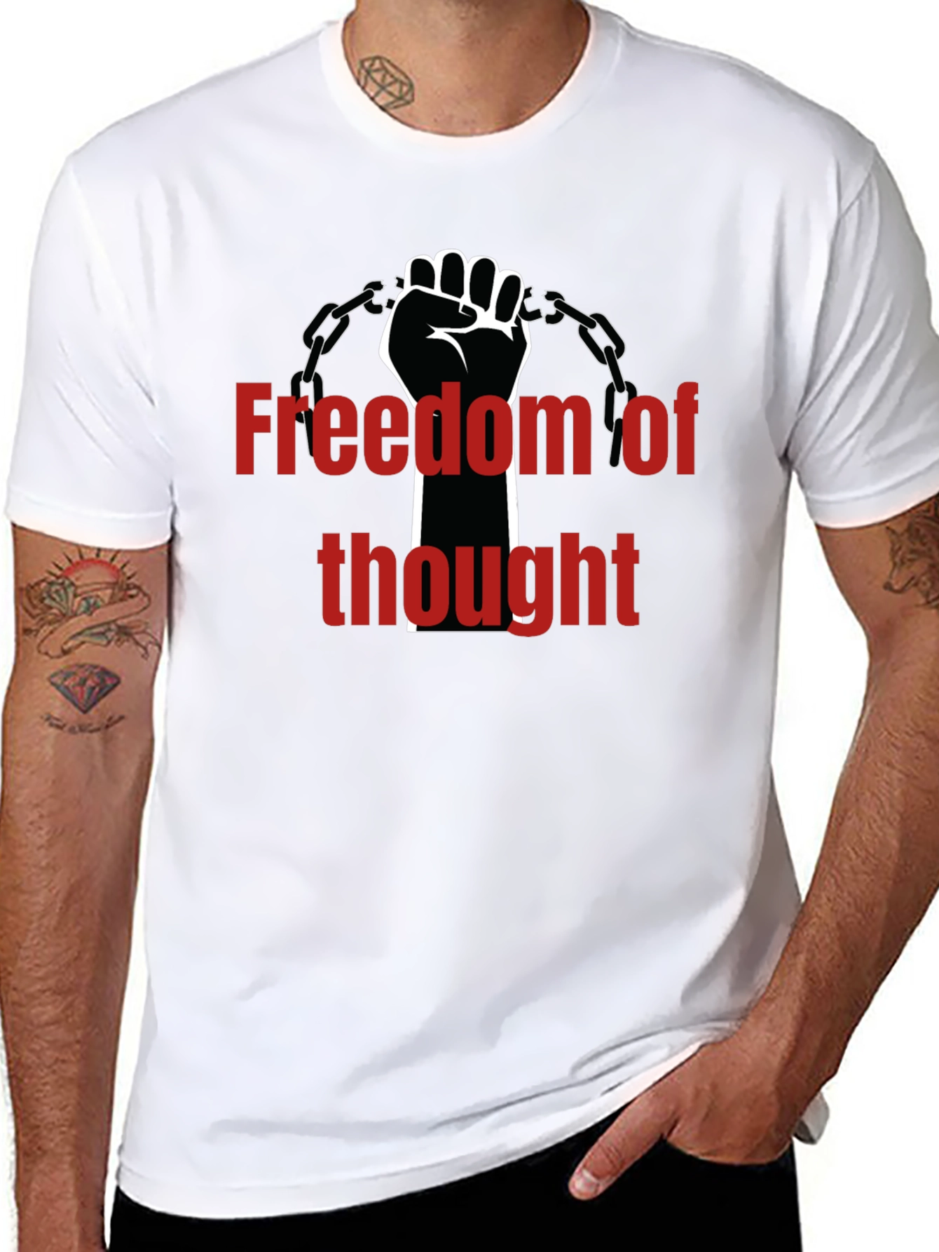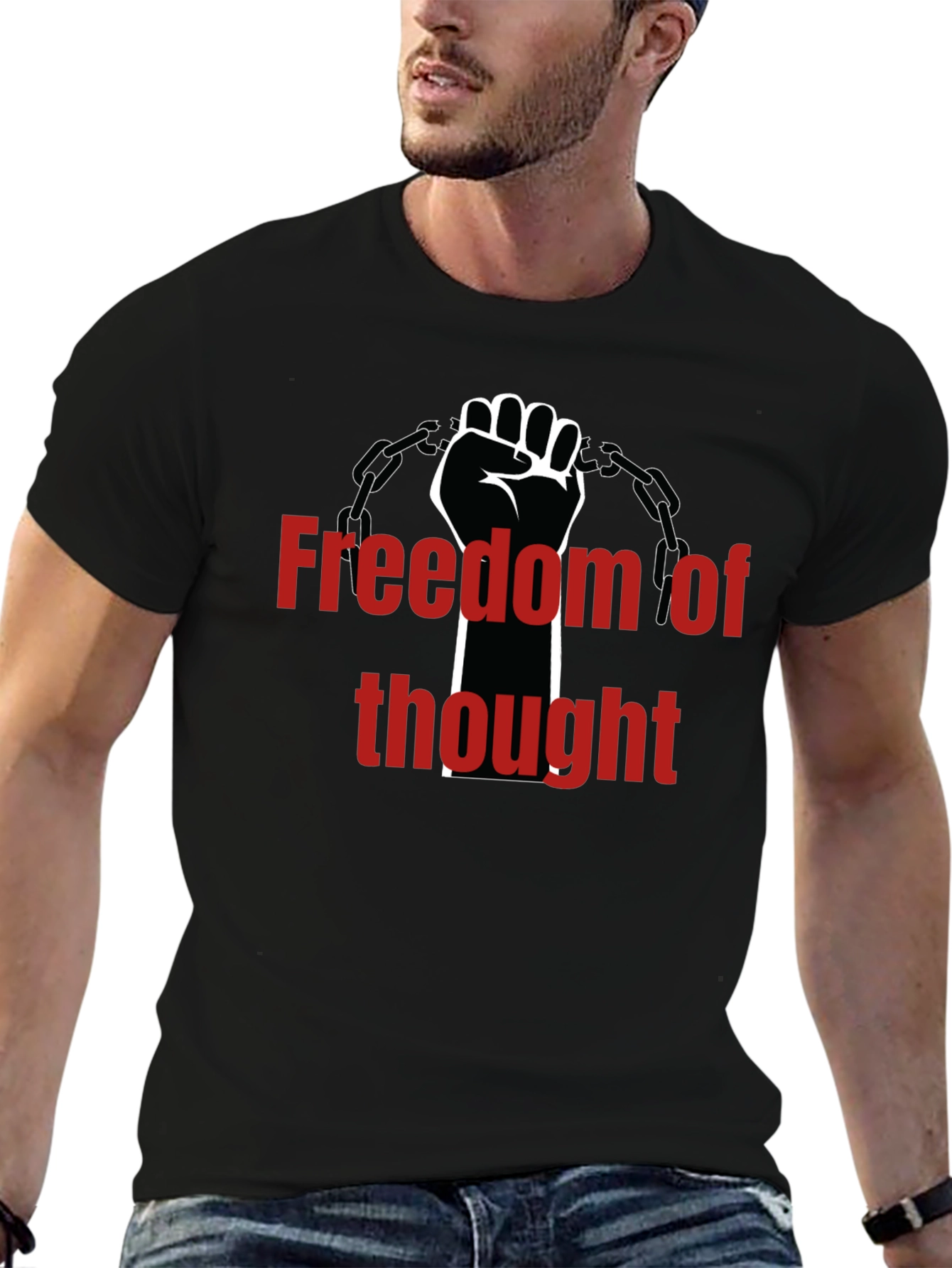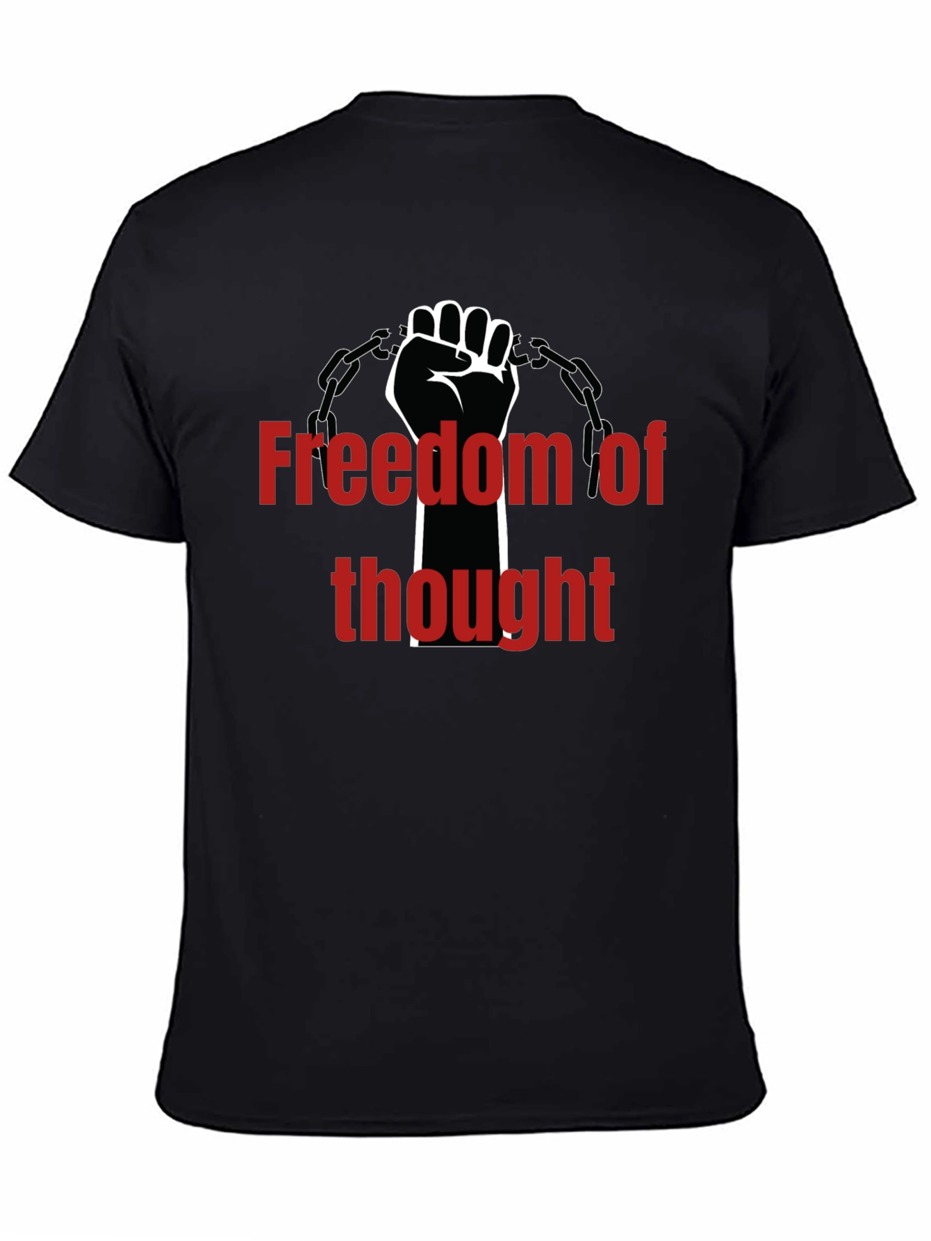 Muestra tu espíritu libre con esta camiseta negra de manga corta. El diseño presenta un puño alzado rompiendo cadenas, un símbolo de libertad, junto con el texto "Freedom of thought" en rojo llamativo. Ideal para expresar tus ideas y creencias con estilo. Perfecta para usar en eventos sociales, manifestaciones o simplemente para un look casual y con significado. Fabricada con materiales suaves y cómodos, esta camiseta te permitirá lucir un mensaje poderoso con total comodidad.