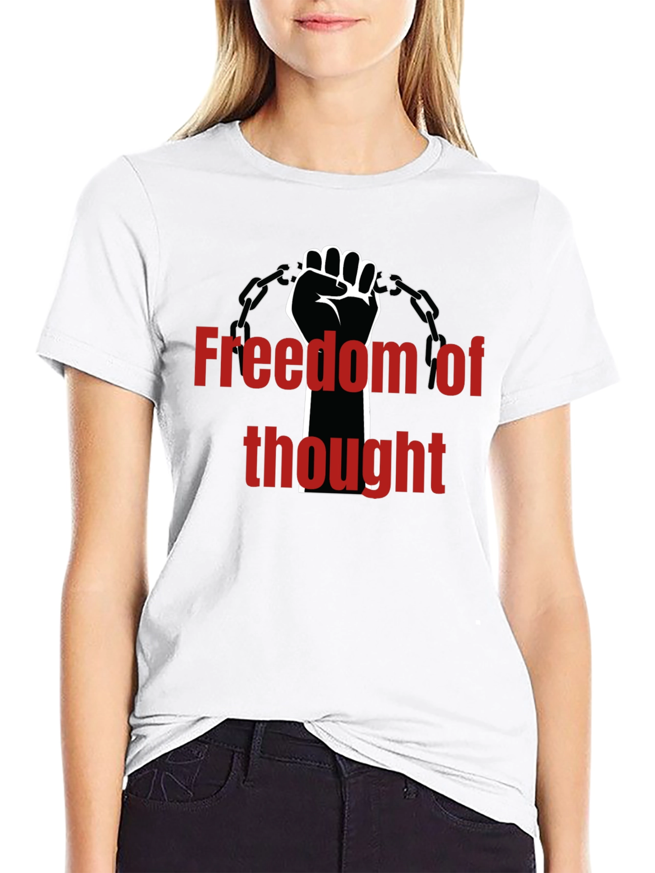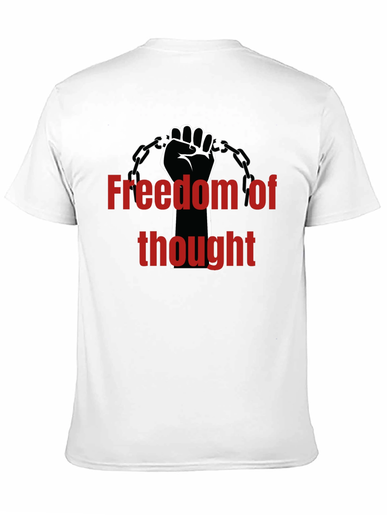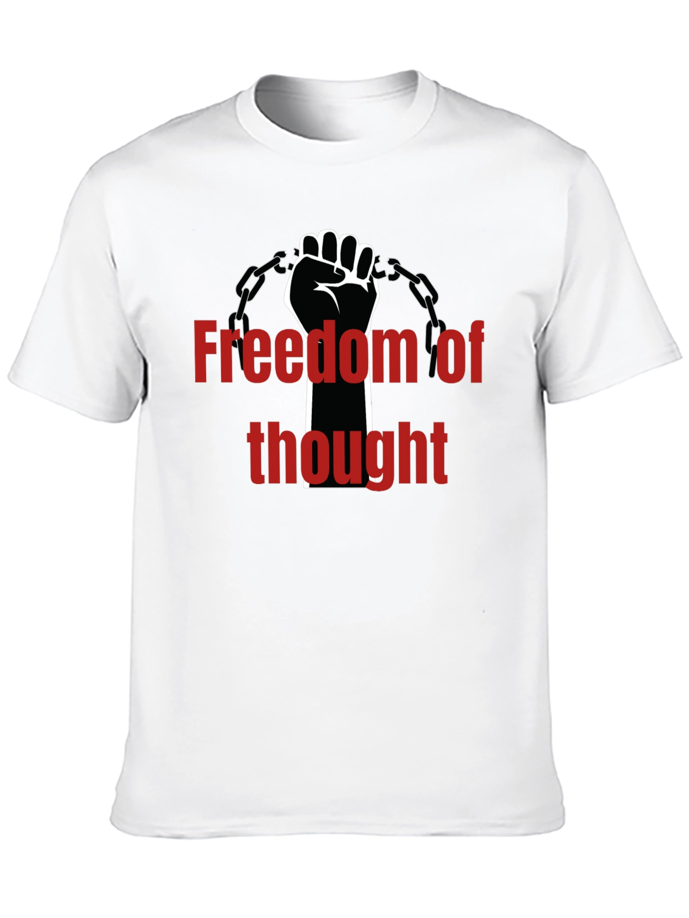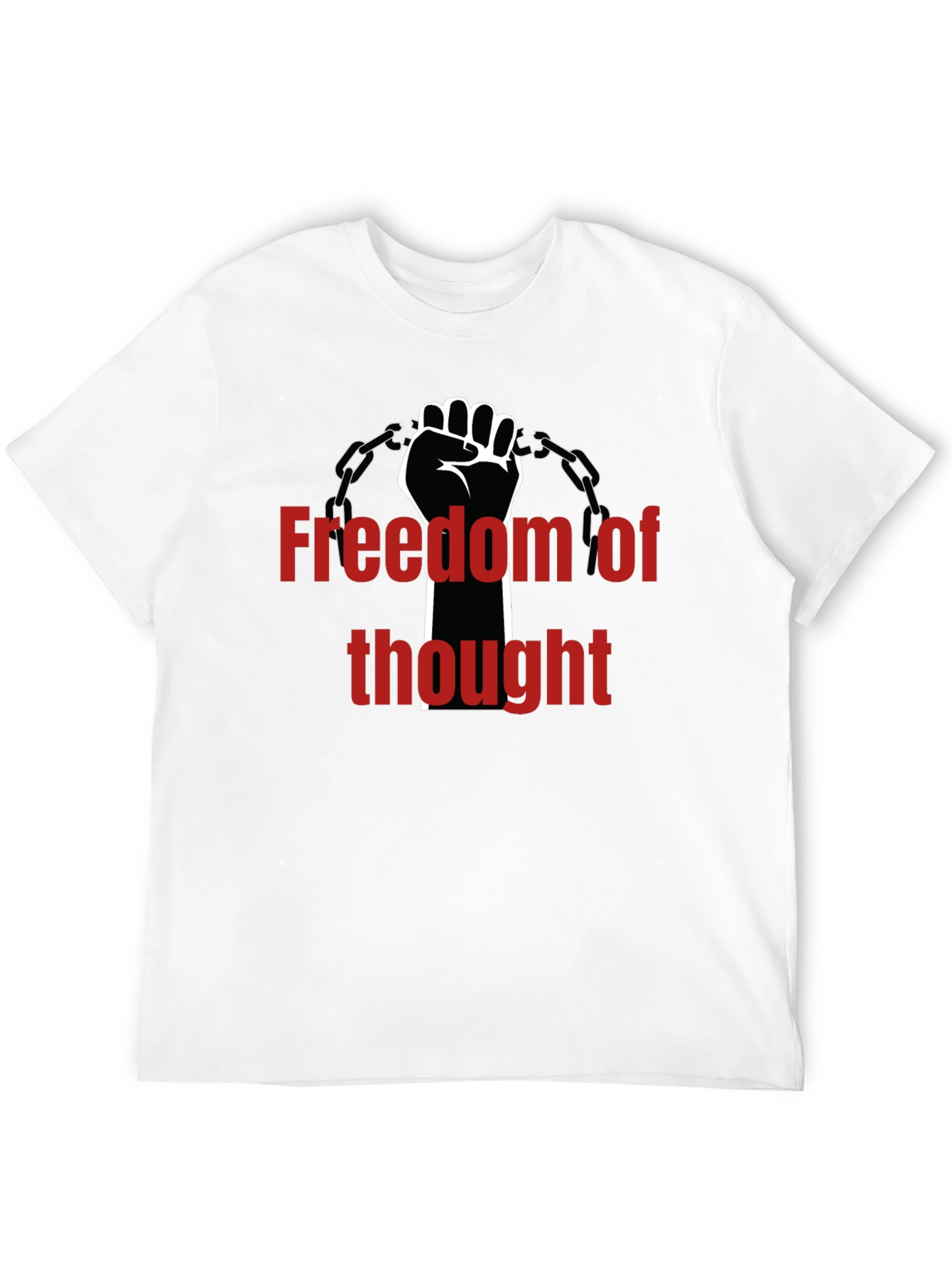 Muestra tu espíritu libre con esta camiseta negra de manga corta. El diseño presenta un puño alzado rompiendo cadenas, un símbolo de libertad, junto con el texto "Freedom of thought" en rojo llamativo. Ideal para expresar tus ideas y creencias con estilo. Perfecta para usar en eventos sociales, manifestaciones o simplemente para un look casual y con significado. Fabricada con materiales suaves y cómodos, esta camiseta te permitirá lucir un mensaje poderoso con total comodidad.