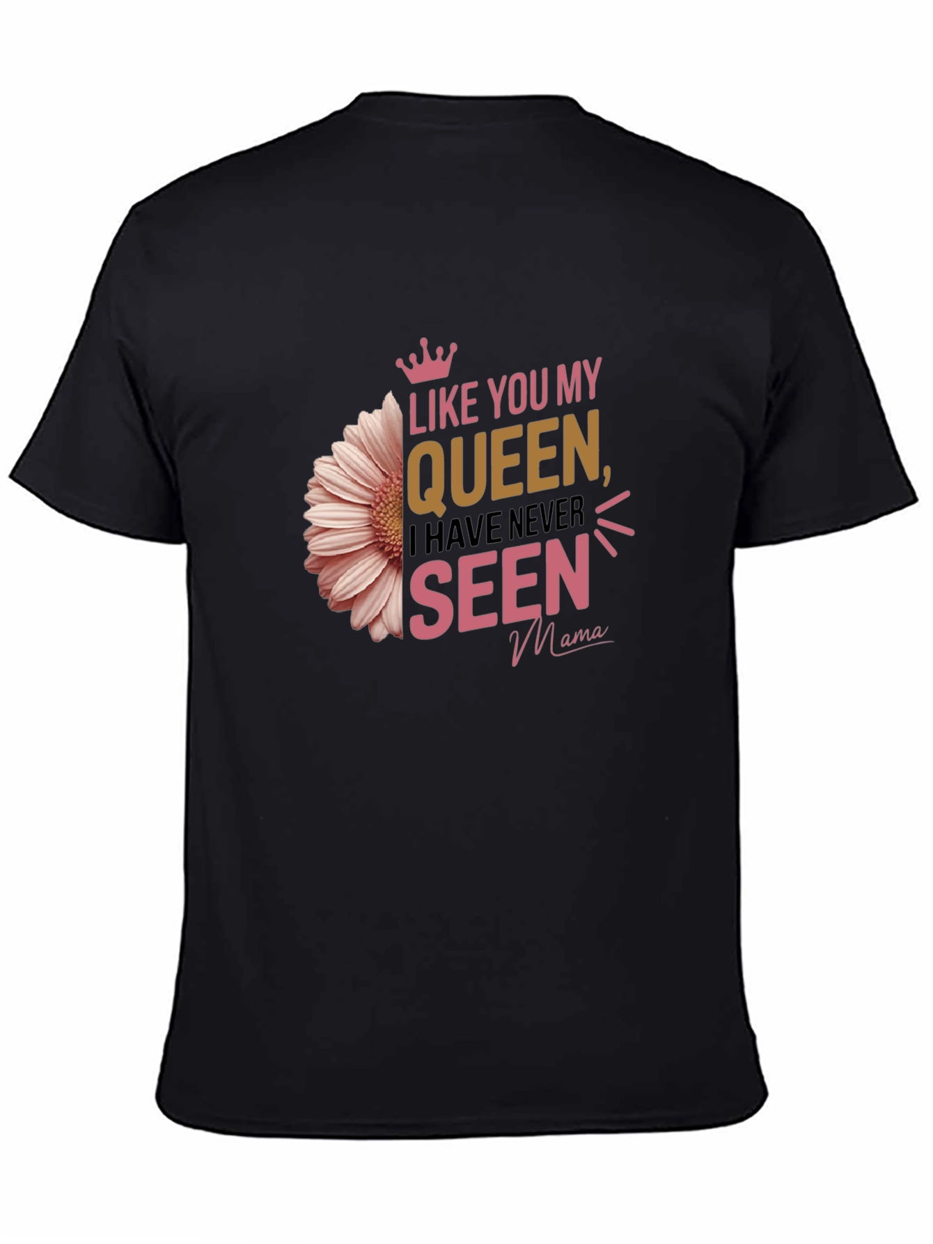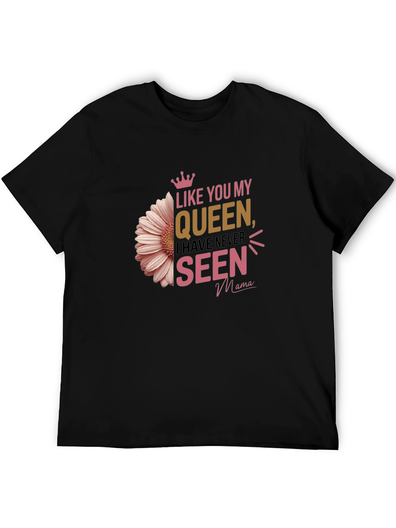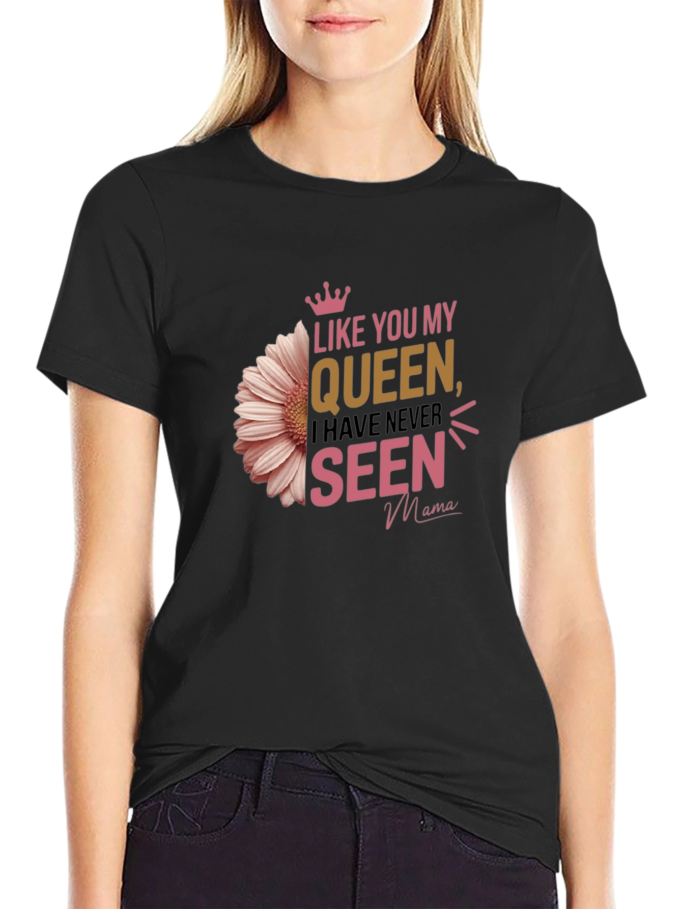 Celebra a mamá con esta elegante camiseta negra. Presenta un diseño floral delicado junto con la frase "Like You My Queen, I Have Never Seen, Mama". Ideal para el uso diario, esta camiseta combina comodidad y estilo, perfecta para regalar a esa reina en tu vida. Su diseño único la convierte en una prenda llamativa que seguramente generará cumplidos. Fabricada con materiales suaves y cómodos, esta camiseta es una excelente opción para cualquier ocasión casual. Demuestra tu amor y aprecio con esta prenda especial que captura la esencia del amor maternal.