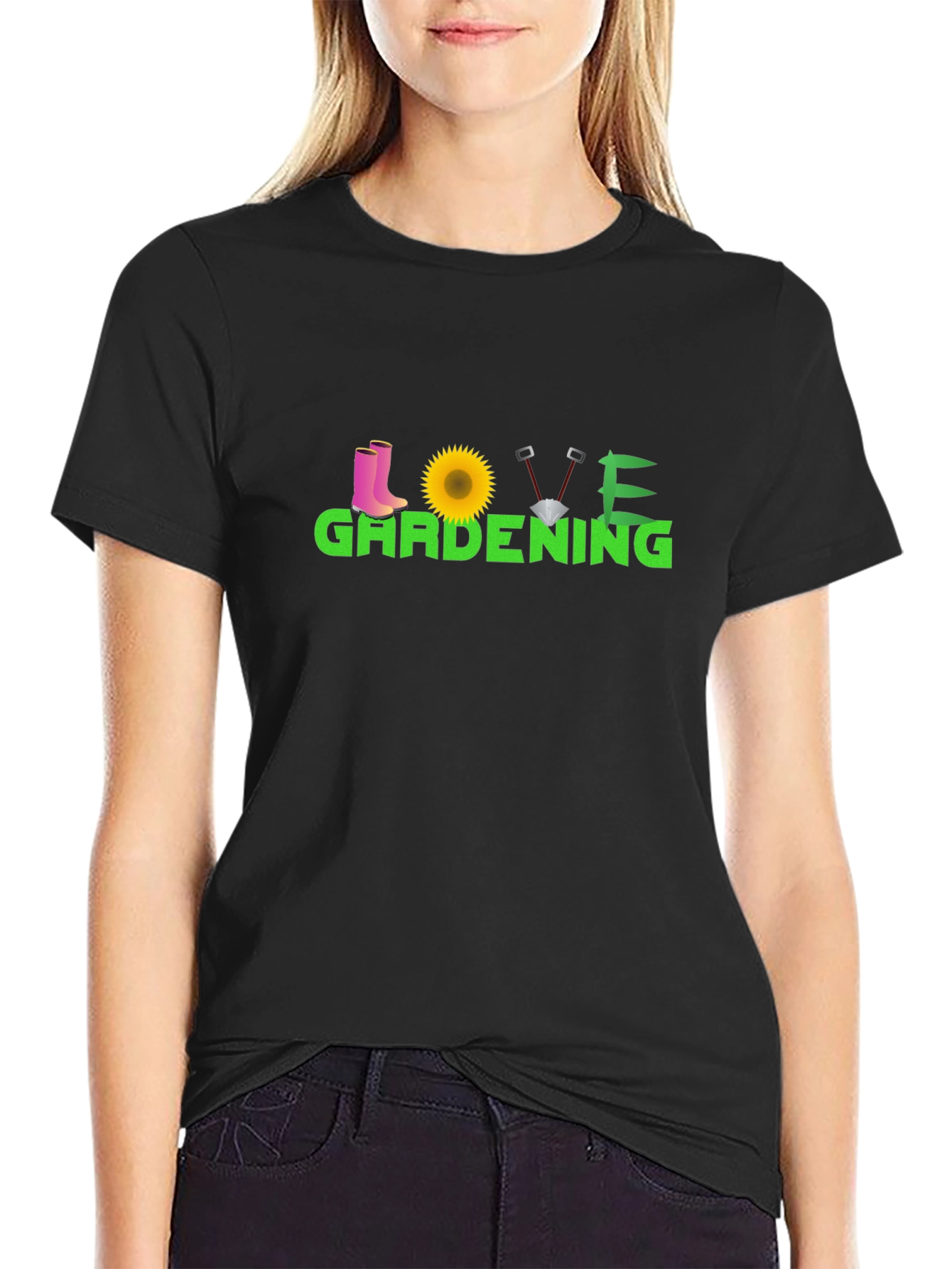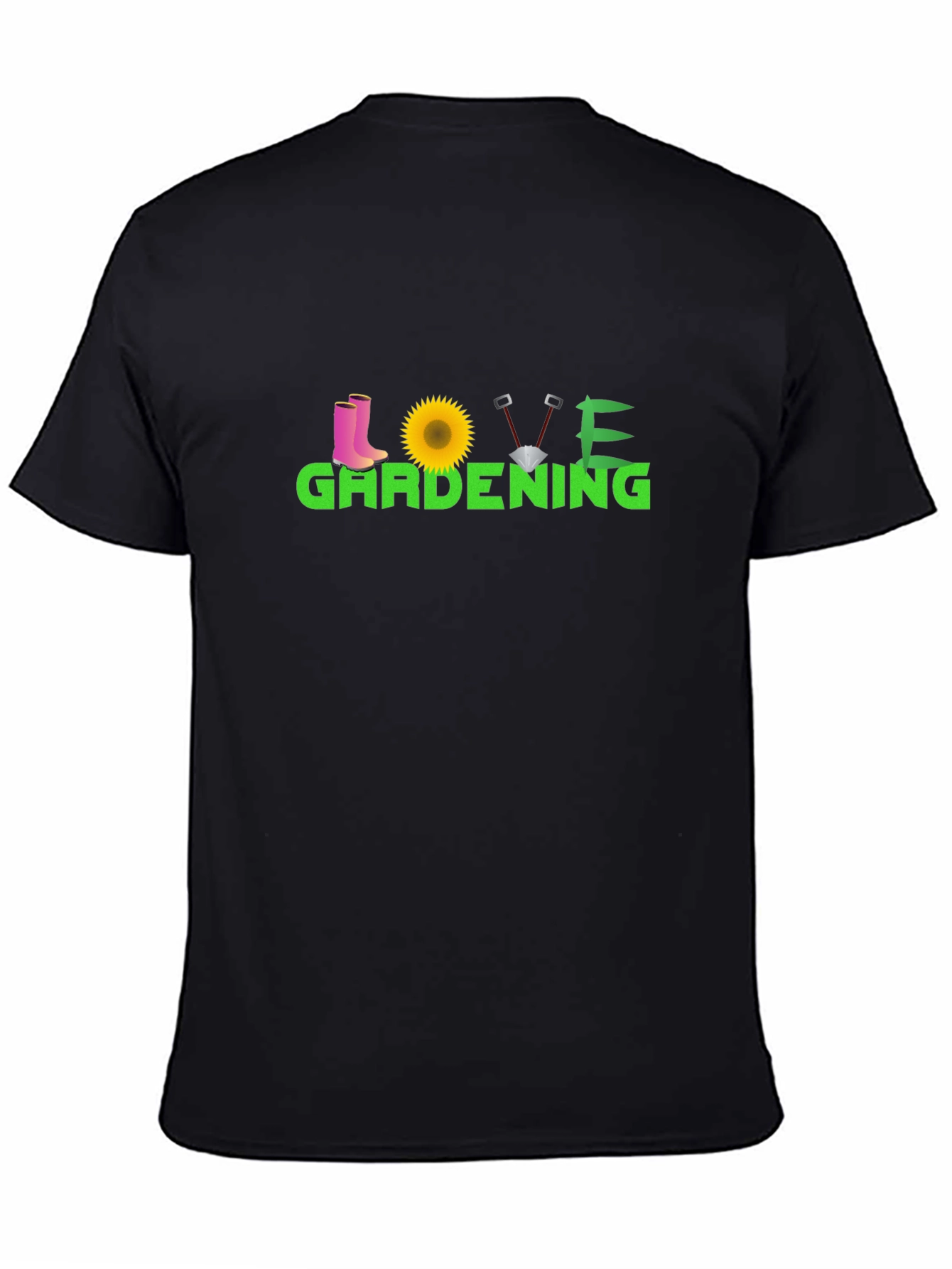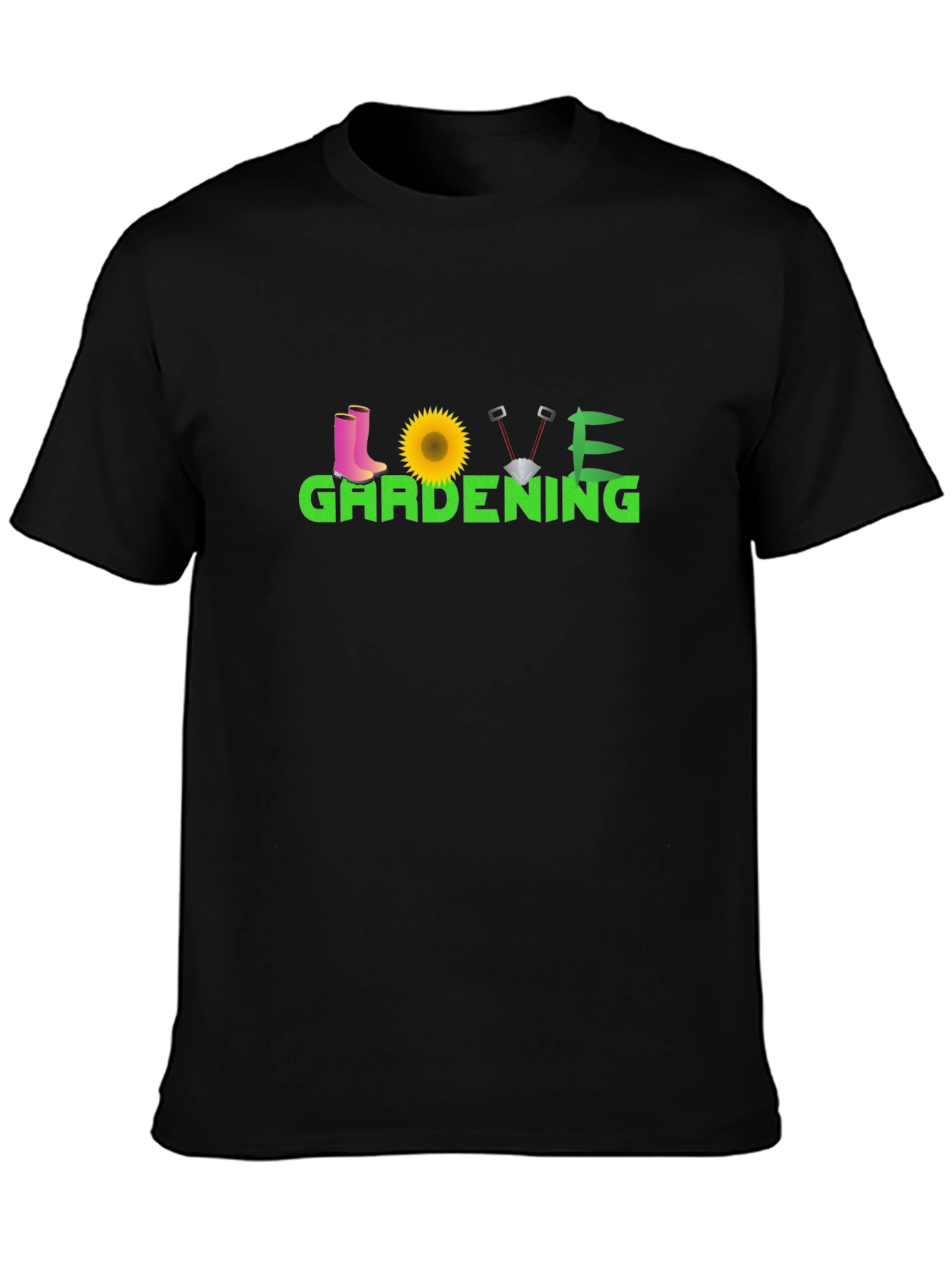 Esta camiseta negra de manga corta presenta un diseño llamativo con la frase "Love Gardening". En lugar de letras, la palabra "LOVE" está representada por unas botas de jardinería rosas, un girasol amarillo brillante y herramientas de jardinería. La palabra "GARDENING" aparece en letras verdes vibrantes debajo, creando un contraste visual atractivo y alegre. Ideal para los amantes de la jardinería que quieren expresar su pasión con estilo. Perfecta para usar en el jardín, paseos informales o como un regalo original y divertido. Muestra tu amor por la jardinería con esta prenda única y cómoda.