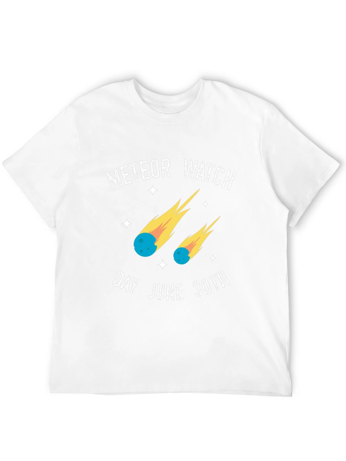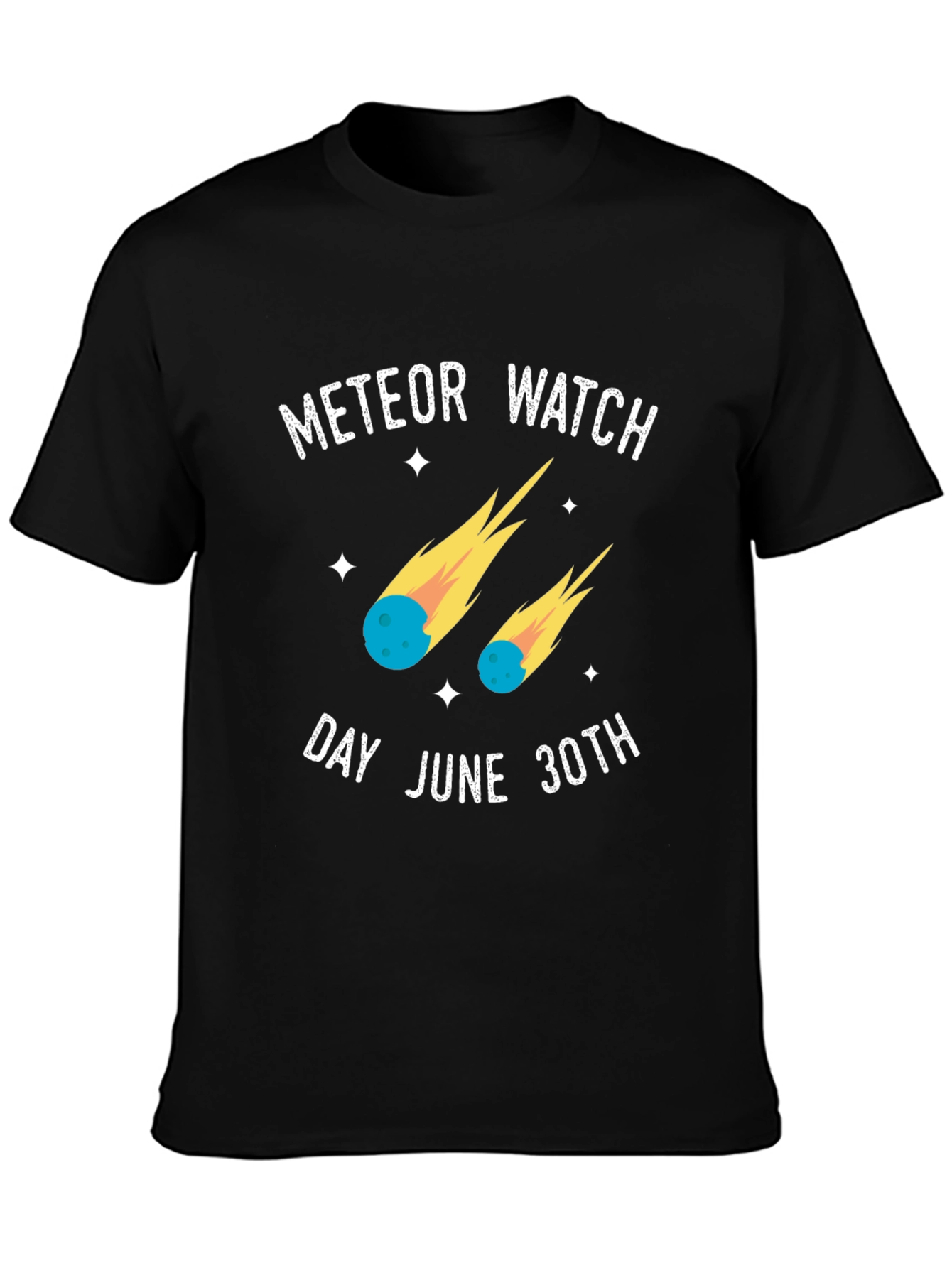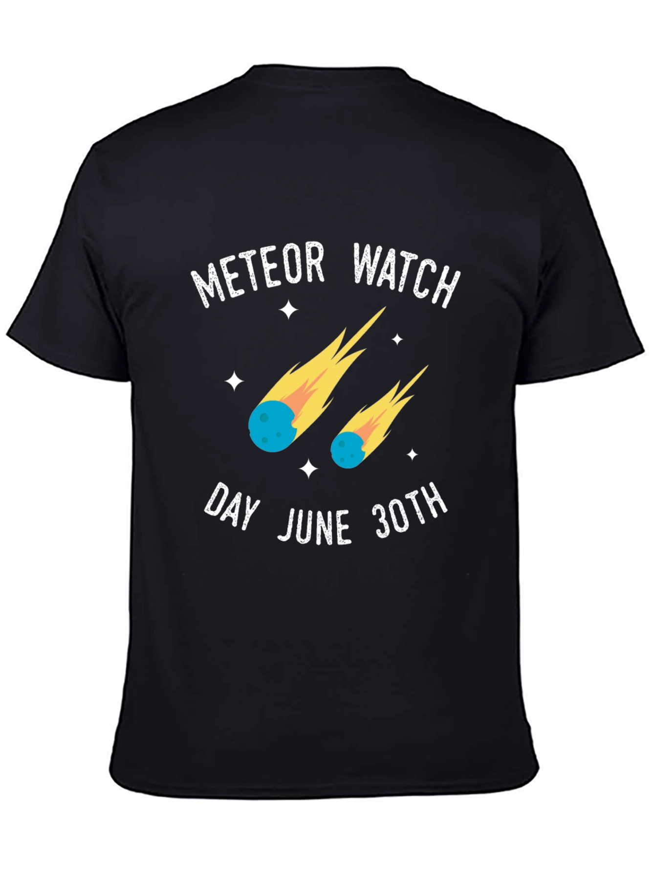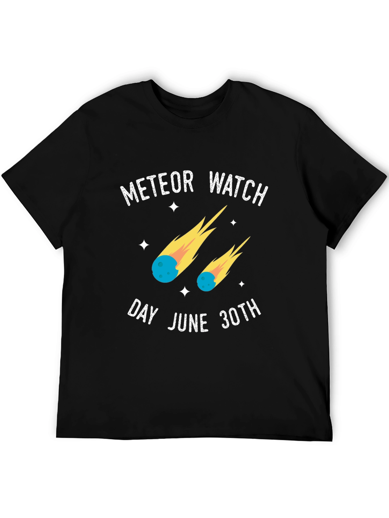 Prepárate para la lluvia de meteoritos con esta moderna camiseta negra. Presenta un diseño llamativo con la leyenda "Meteor Watch Day June 30th" en letras blancas de estilo retro. Dos meteoritos azules con estelas de fuego amarillas resaltan, acompañados de pequeñas estrellas que le dan un toque espacial. Ideal para astrónomos aficionados, amantes del espacio o simplemente para aquellos que buscan una camiseta única y original. Hecha de un material suave y cómodo, perfecta para usar en cualquier ocasión casual o para llevar en la próxima noche de observación de estrellas. ¡Consigue la tuya y luce tu pasión por el cosmos!