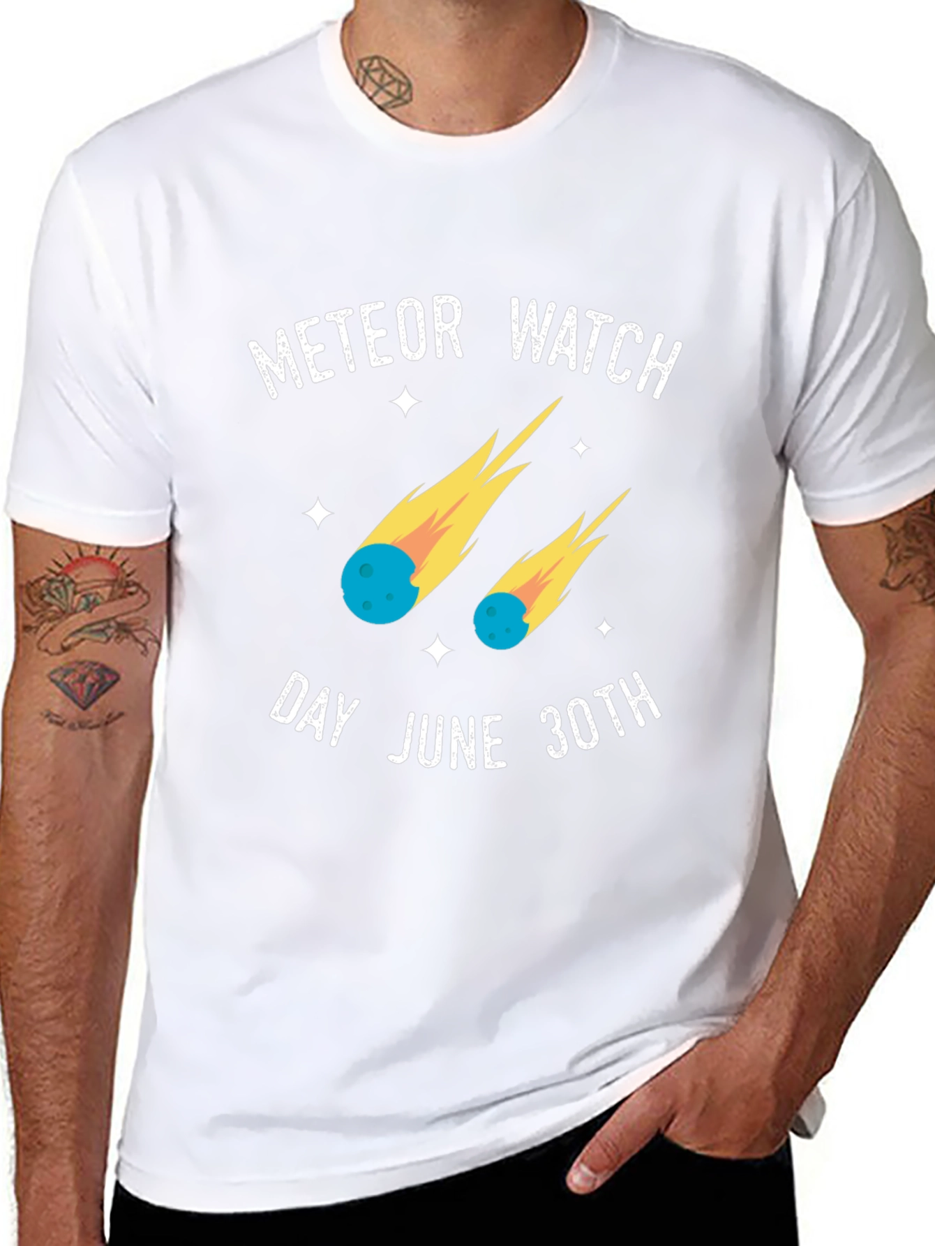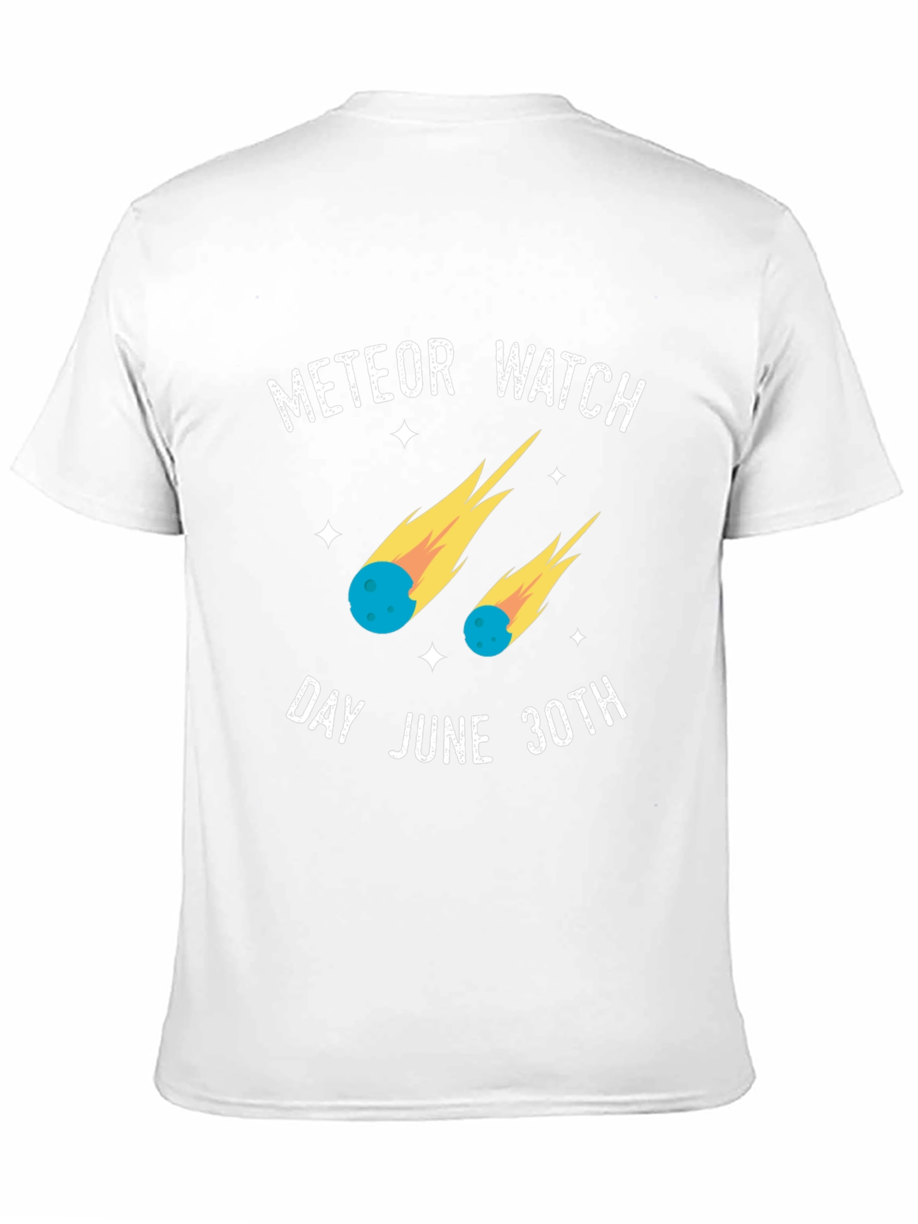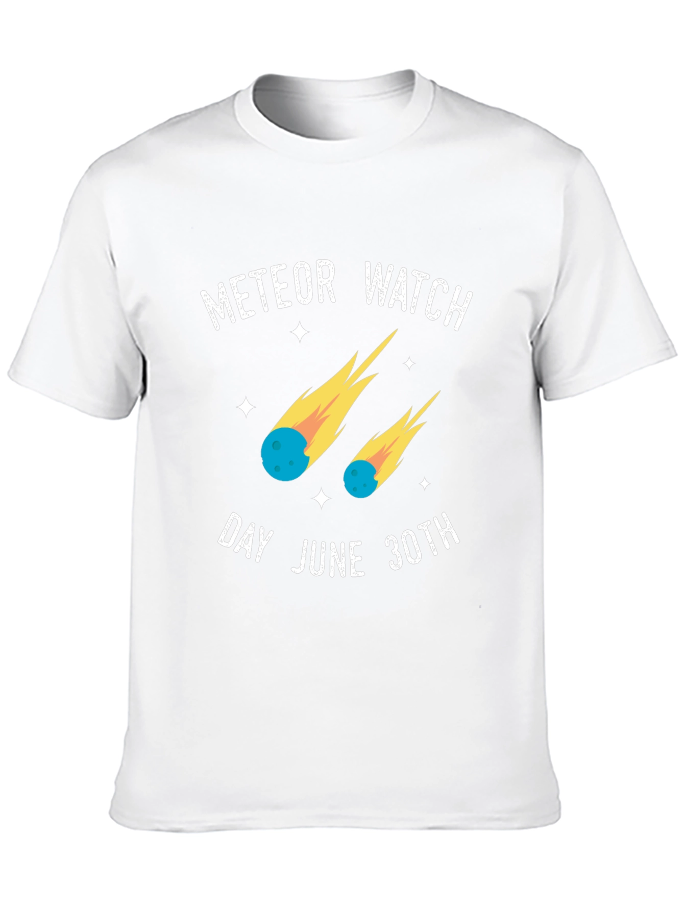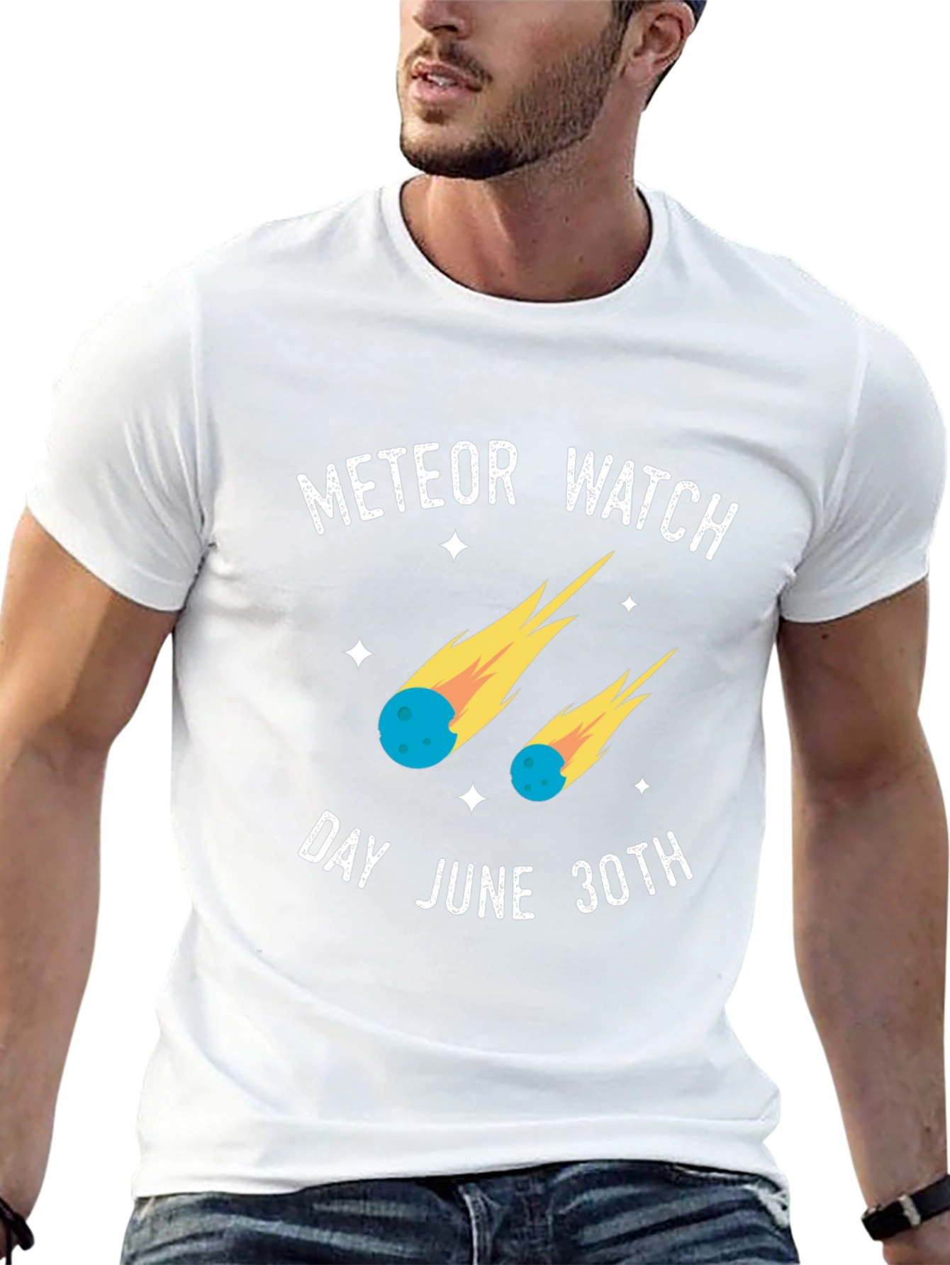 Prepárate para la lluvia de meteoritos con esta moderna camiseta negra. Presenta un diseño llamativo con la leyenda "Meteor Watch Day June 30th" en letras blancas de estilo retro. Dos meteoritos azules con estelas de fuego amarillas resaltan, acompañados de pequeñas estrellas que le dan un toque espacial. Ideal para astrónomos aficionados, amantes del espacio o simplemente para aquellos que buscan una camiseta única y original. Hecha de un material suave y cómodo, perfecta para usar en cualquier ocasión casual o para llevar en la próxima noche de observación de estrellas. ¡Consigue la tuya y luce tu pasión por el cosmos!