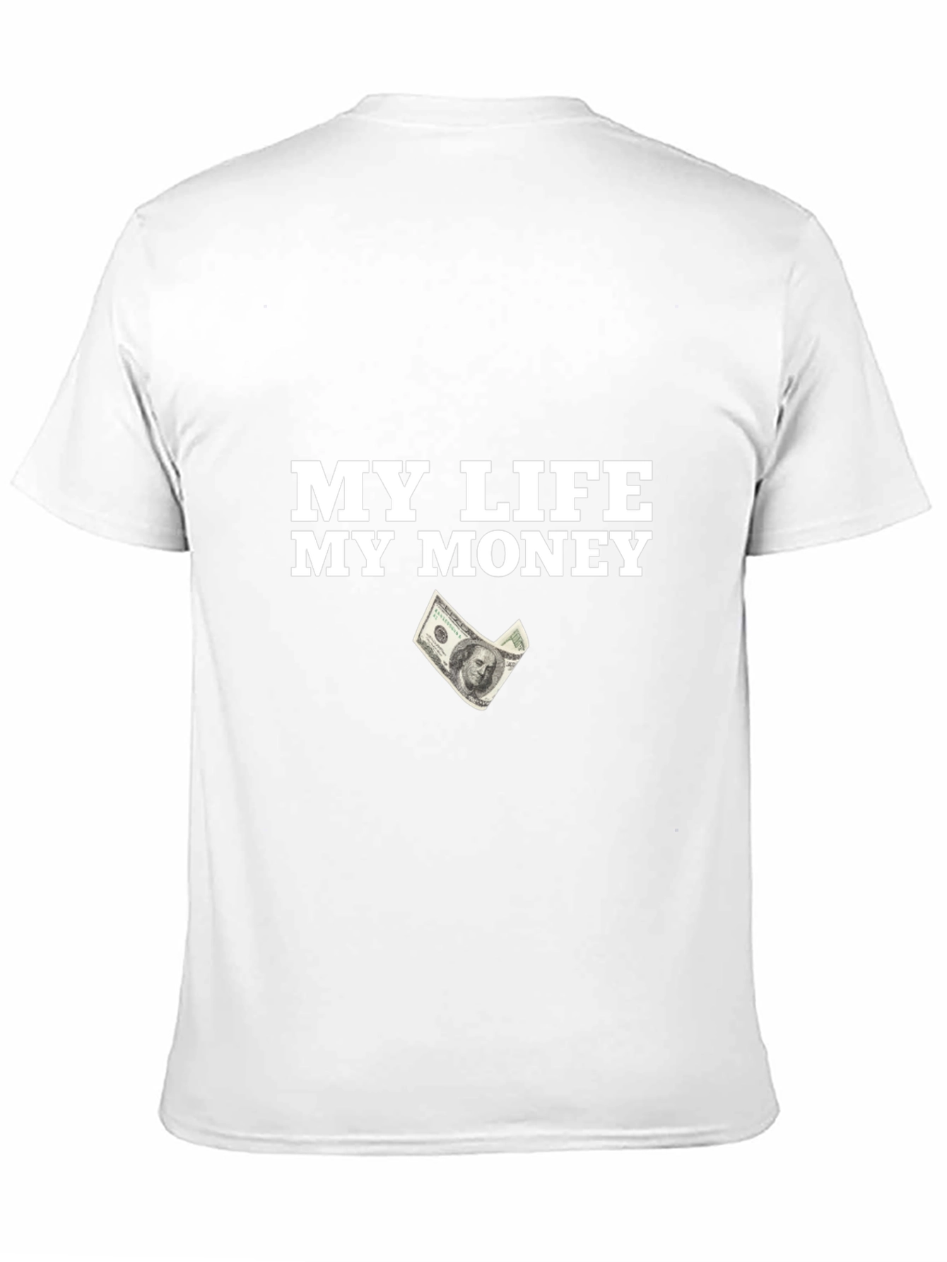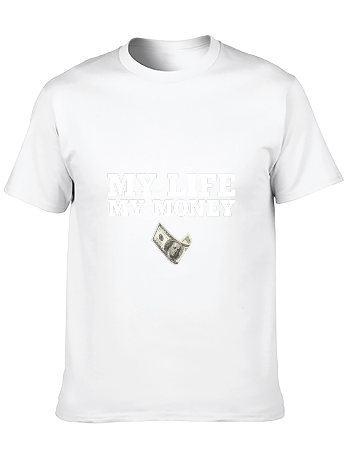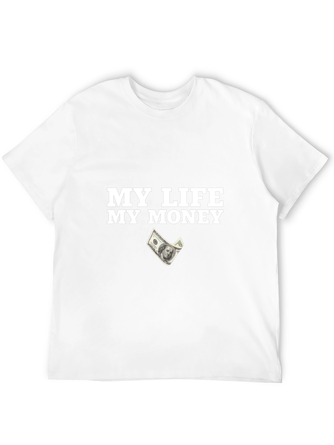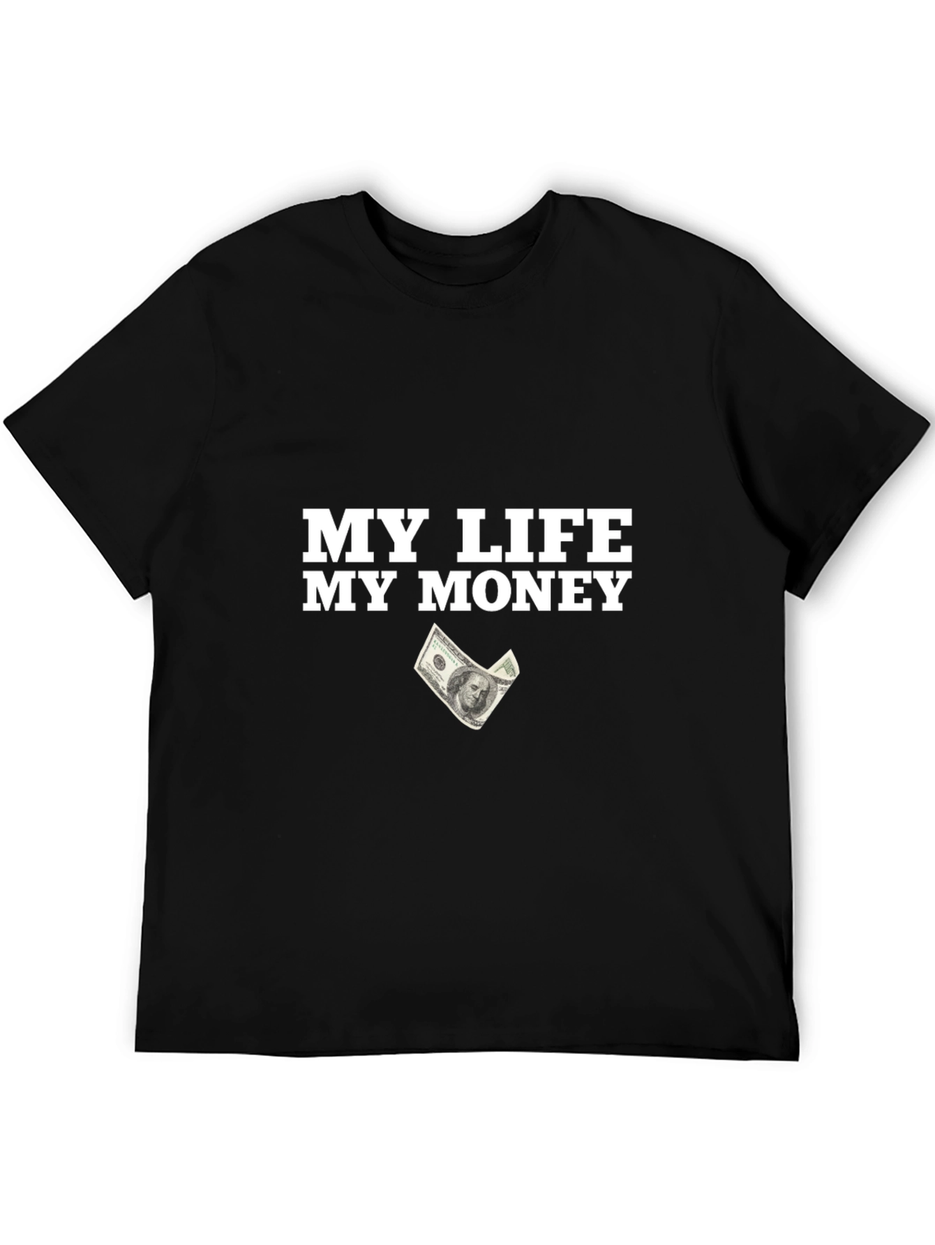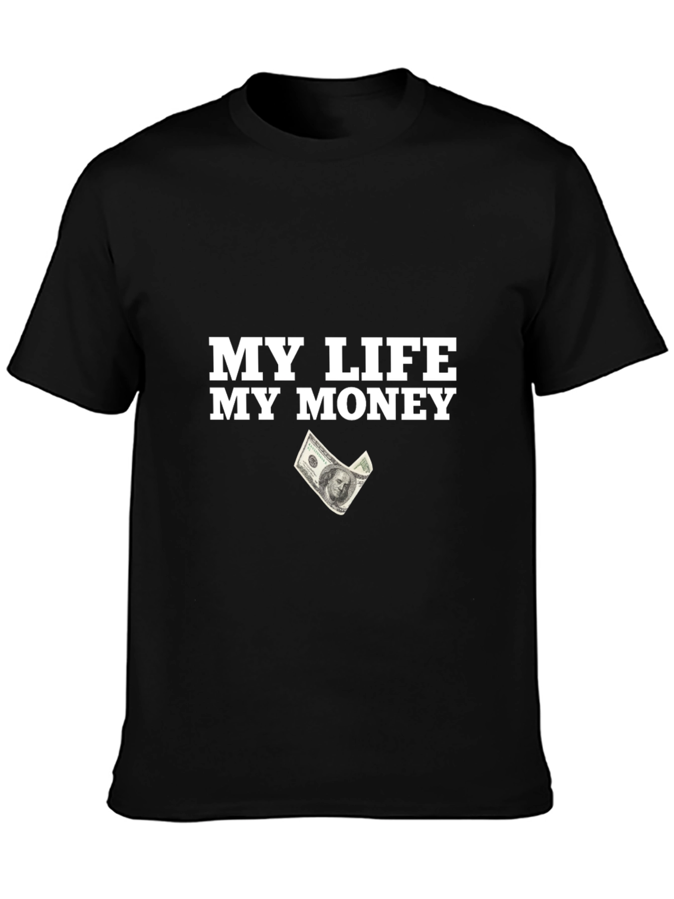Luce un estilo audaz con esta camiseta negra de manga corta. El diseño presenta un llamativo texto en blanco, "MY LIFE MY MONEY", complementado con una imagen de un billete que le da un toque original y divertido. Perfecta para aquellos que quieren expresar su actitud con confianza y estilo. Ideal para uso casual, salidas con amigos o para destacar en cualquier ocasión. Su tejido suave y cómodo te permitirá moverte con libertad mientras luces un look moderno y lleno de personalidad. ¡Atrévete a mostrar tu estilo único con esta prenda!