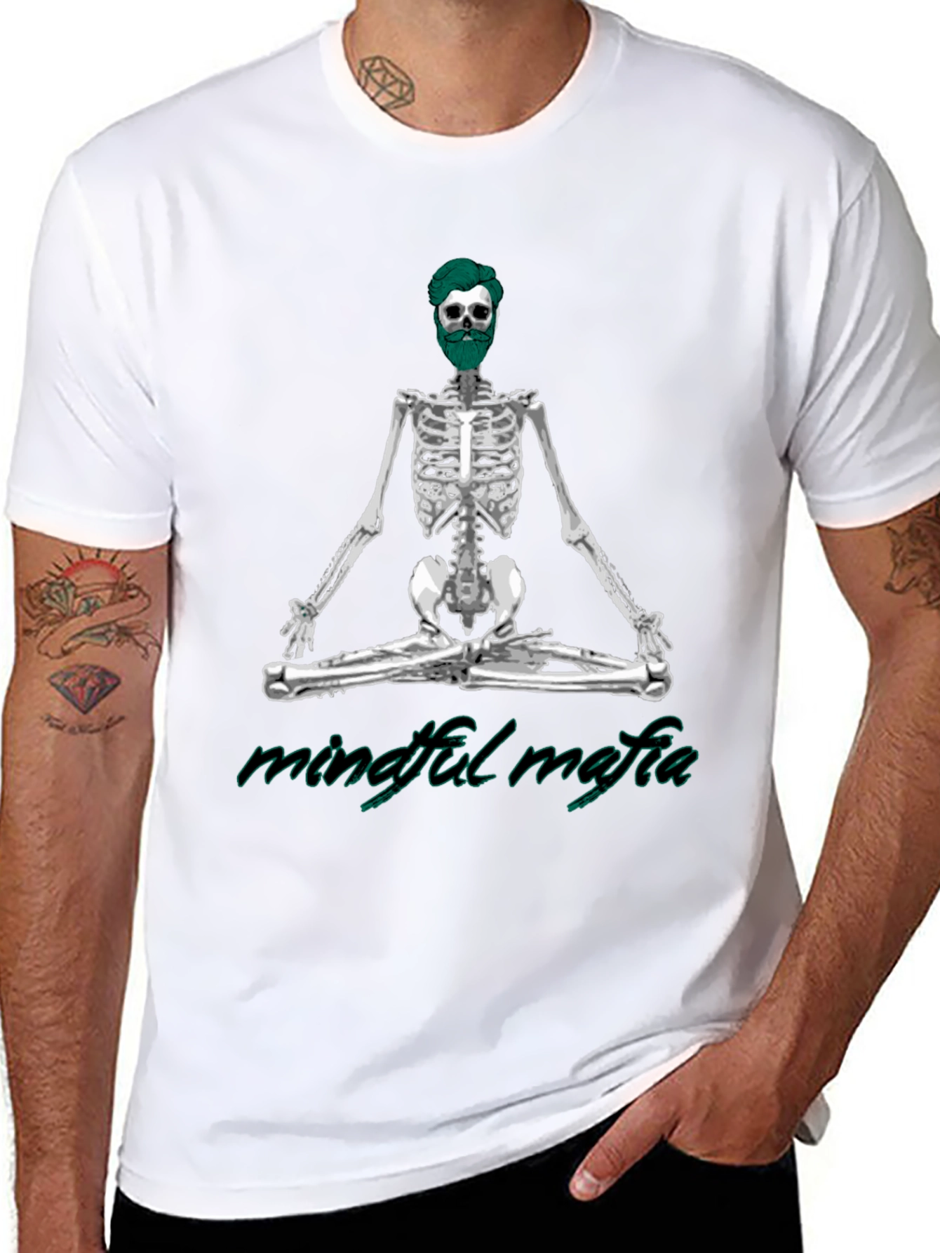 Muestra tu lado zen y rebelde con esta camiseta negra única. Presenta un esqueleto meditando con una barba y pelo verde llamativo. El diseño incluye la frase "Mindful Mafia", fusionando la tranquilidad con un toque audaz. Perfecta para quienes buscan un estilo original y cómodo. Ideal para yoga, meditación o simplemente expresar tu individualidad con un toque de humor. Fabricada con materiales de alta calidad para asegurar confort y durabilidad. Destaca entre la multitud con esta prenda de declaración.