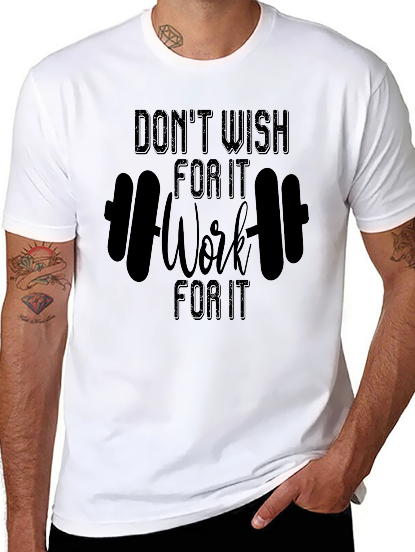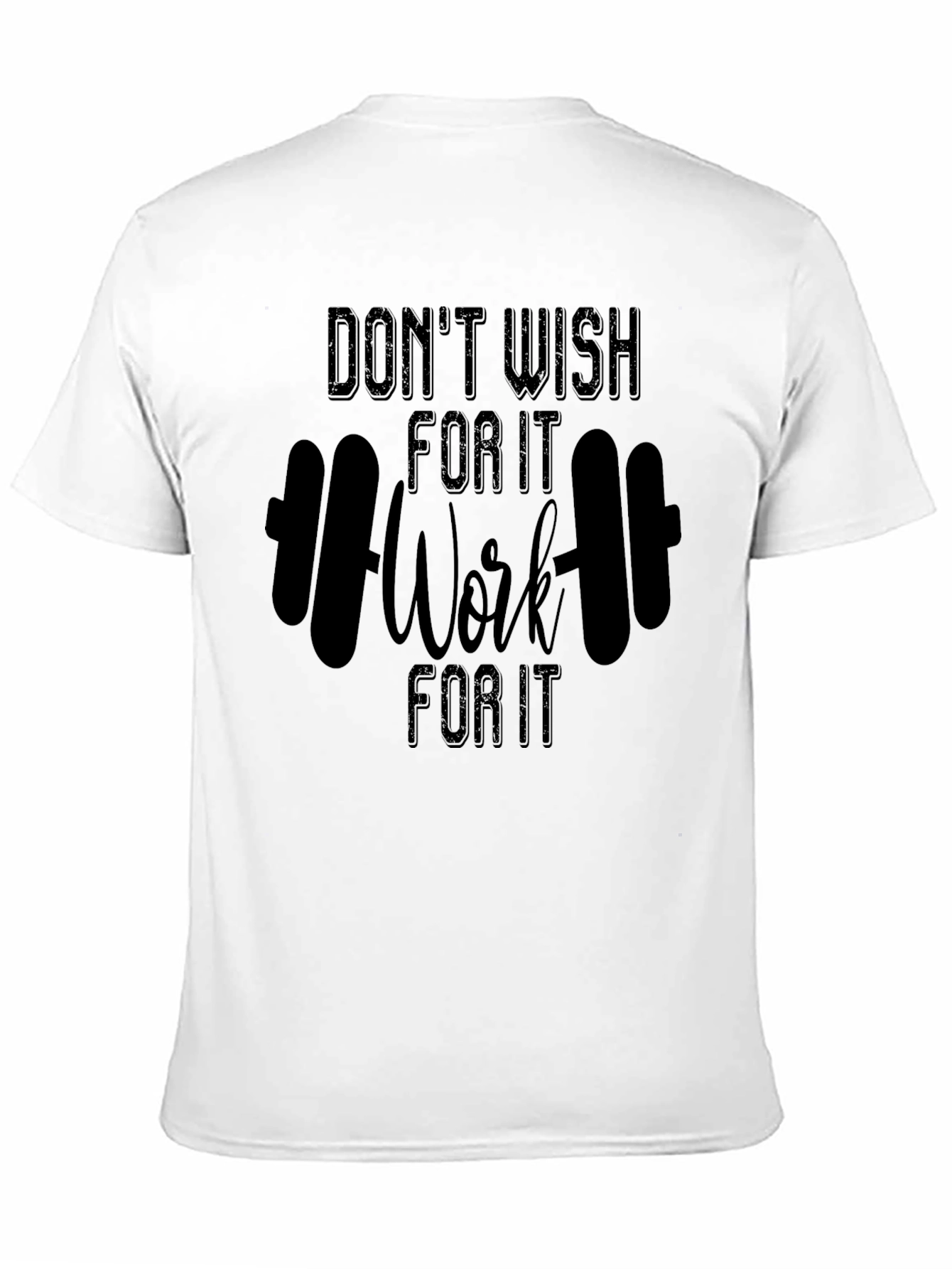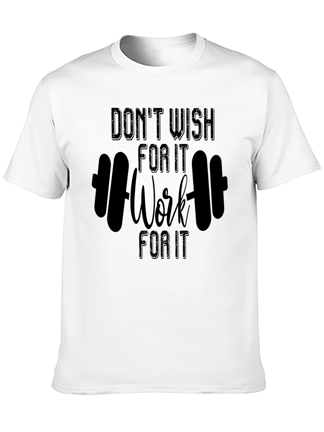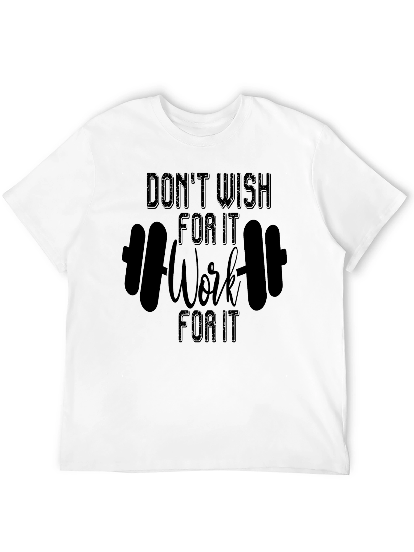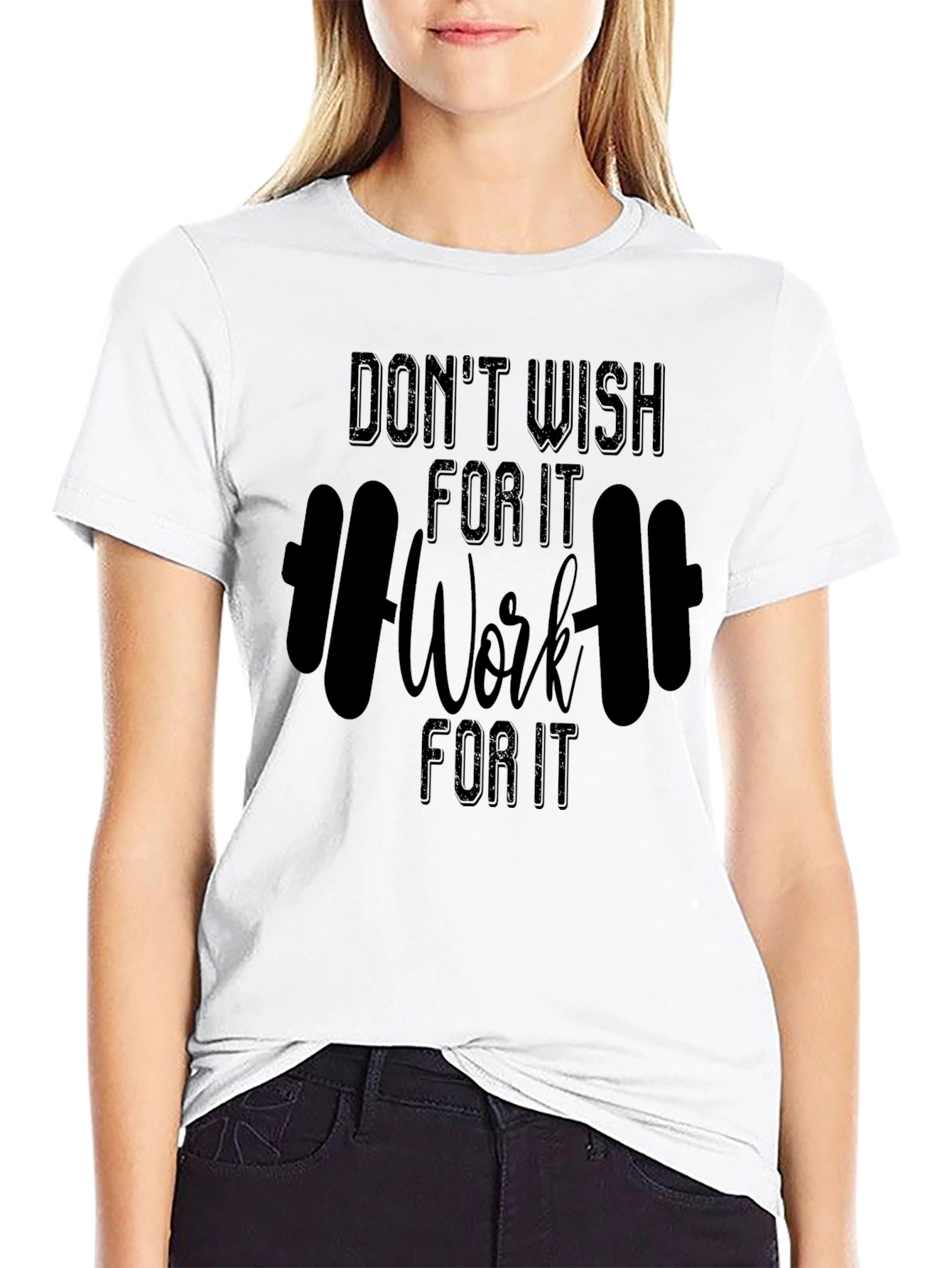 Luce esta camiseta negra de manga corta con un diseño motivacional impactante. La frase "Don't Wish For It Work For It" está impresa en el centro, flanqueada por ilustraciones de pesas, ideal para inspirarte en tus entrenamientos o para lucir un estilo de vida activo. Fabricada con materiales cómodos y de alta calidad, esta camiseta es perfecta para el gimnasio o para un look casual con un toque de actitud. Su diseño unisex la hace versátil para cualquier persona que busque motivación y estilo en su vestimenta diaria. ¡Impulsa tu día con esta prenda única y demuestra tu compromiso con el esfuerzo y la dedicación!