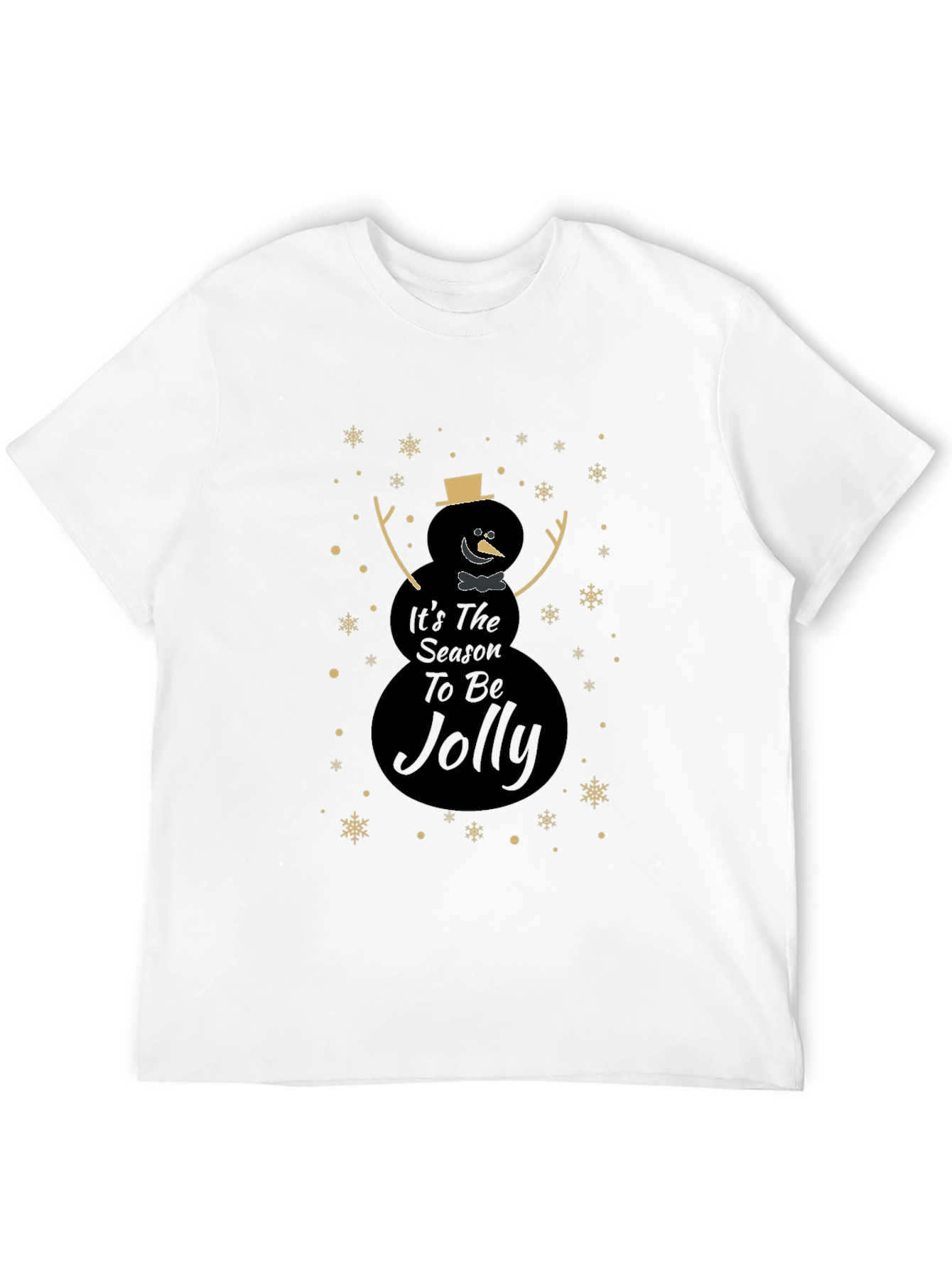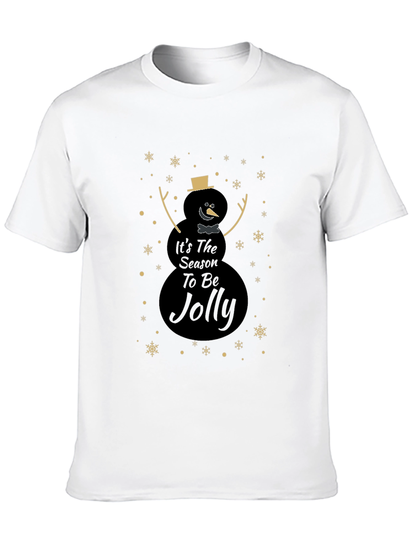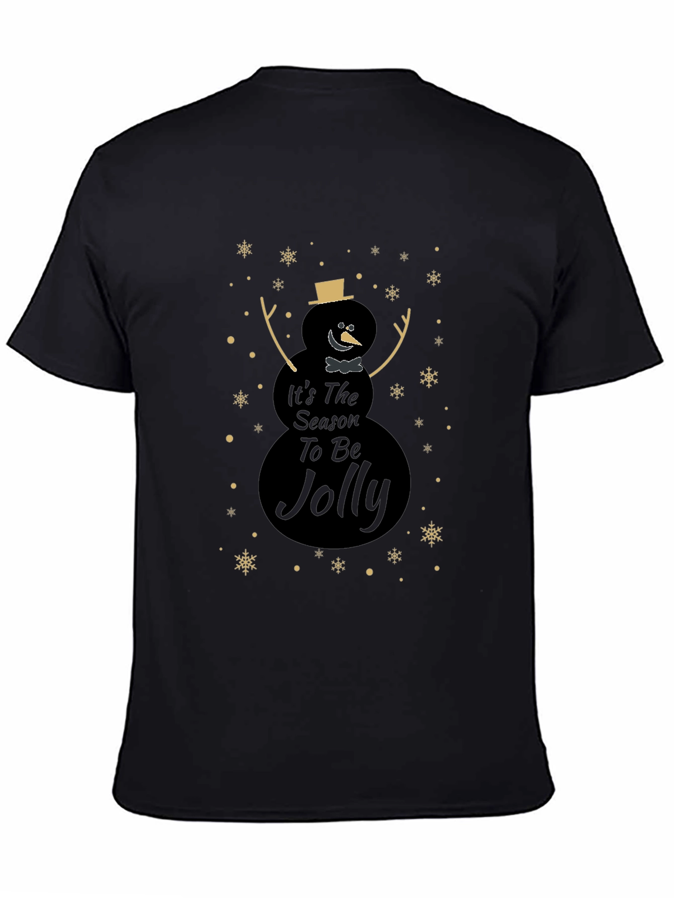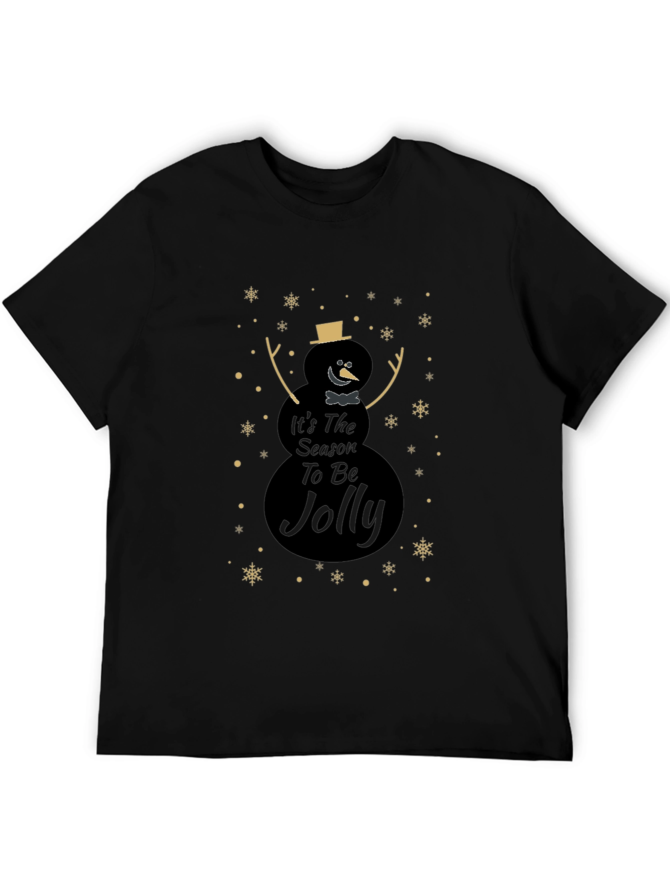 Celebra la temporada festiva con esta elegante camiseta negra. Presenta un diseño único de muñeco de nieve con el mensaje "It's The Season To Be Jolly", adornado con copos de nieve dorados. Perfecta para lucir un estilo navideño sutil y moderno. Ideal para reuniones familiares, fiestas o simplemente para contagiar el espíritu navideño a tu día a día. Fabricada con materiales suaves y cómodos, esta camiseta te mantendrá abrigado y con estilo durante toda la temporada. ¡Añade un toque festivo a tu guardarropa con esta prenda imprescindible!