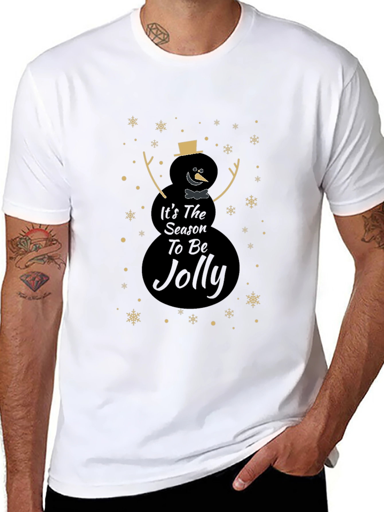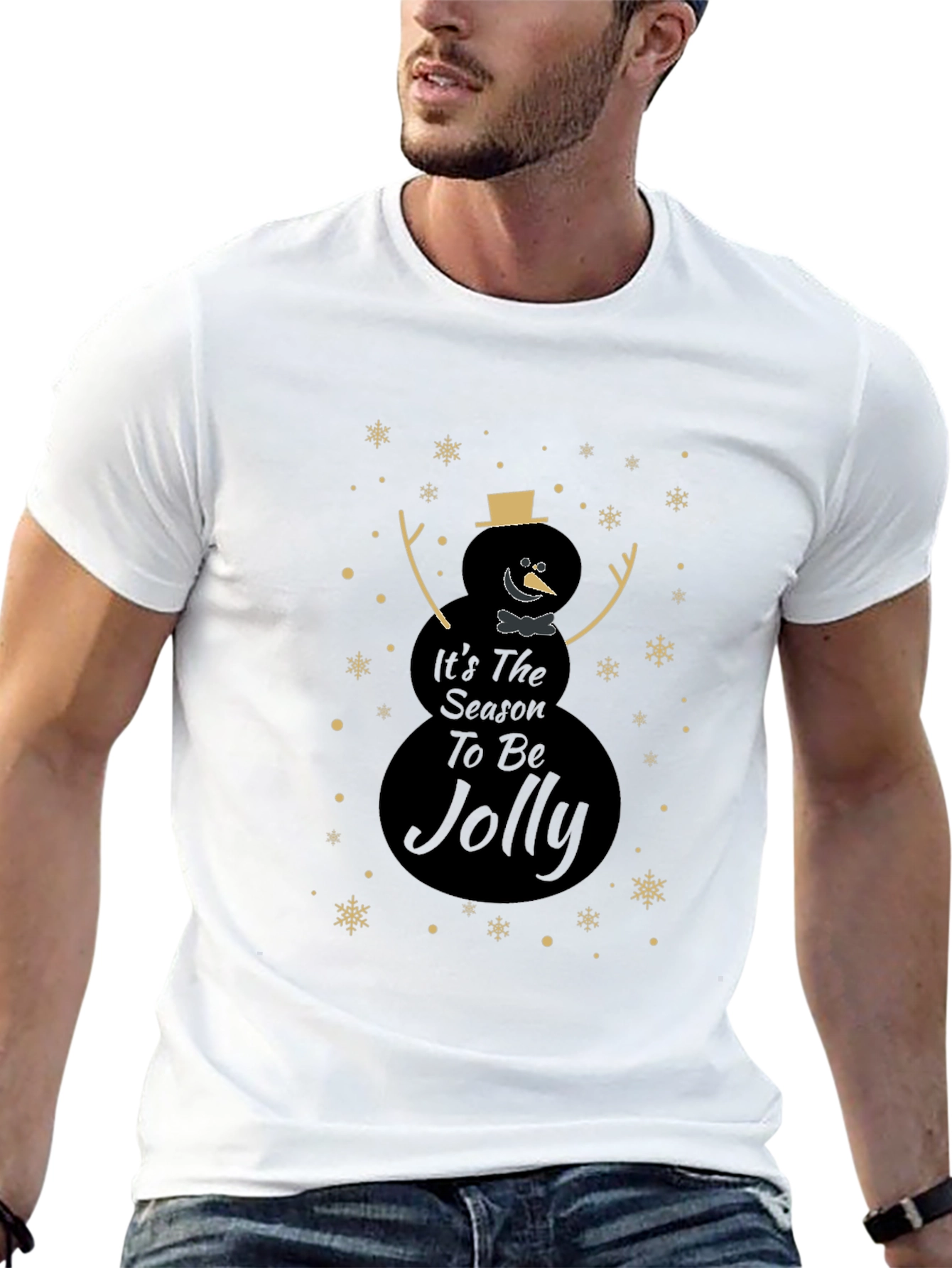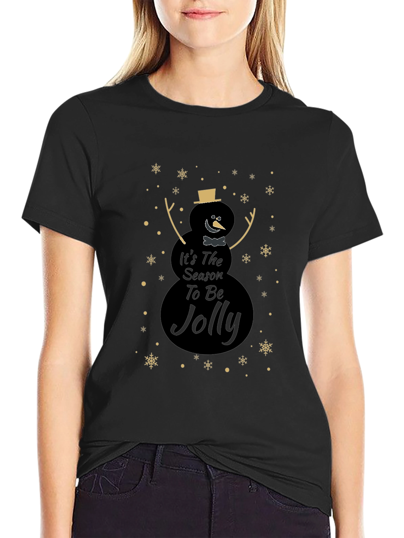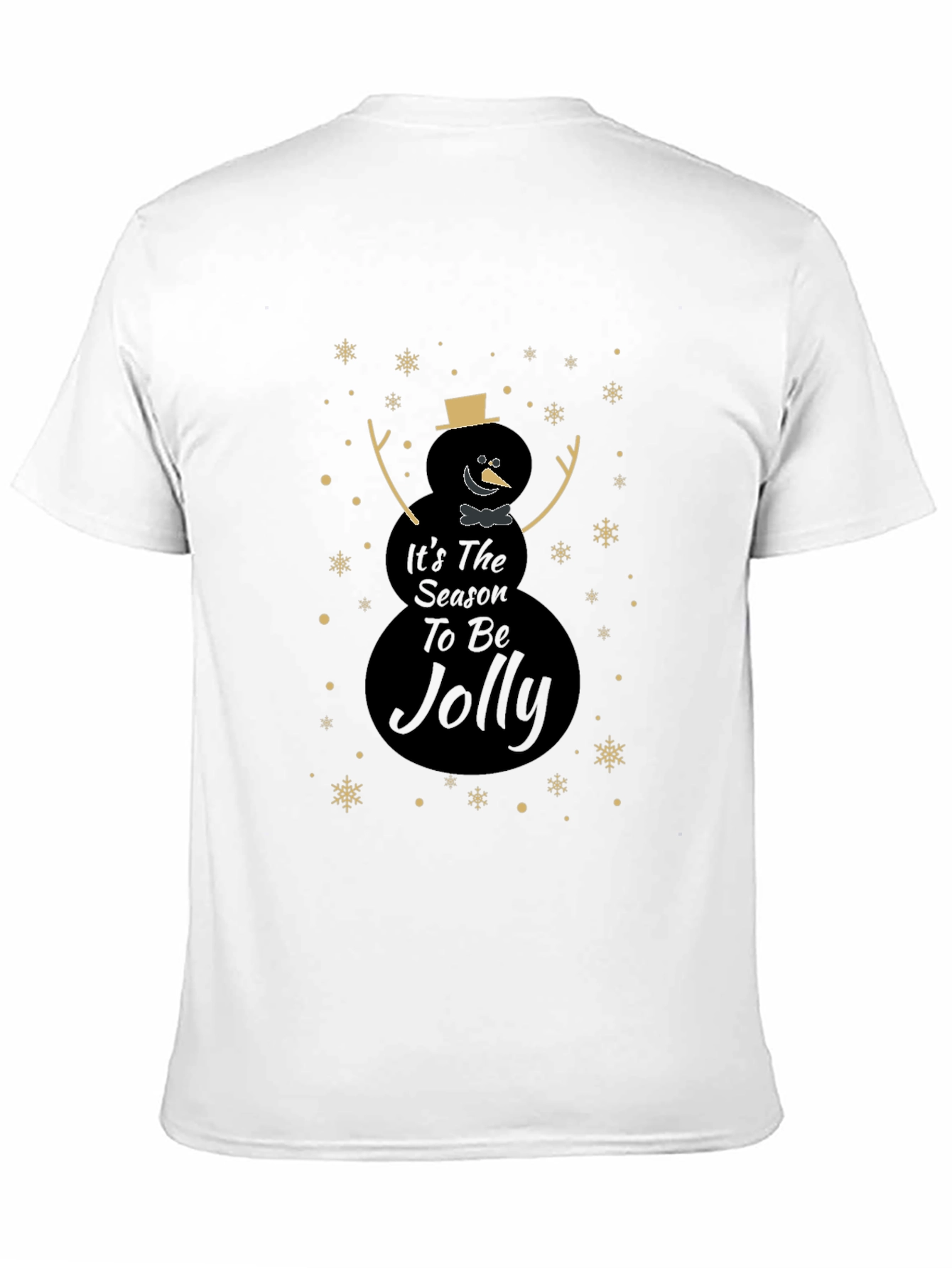 Celebra la temporada festiva con esta elegante camiseta negra. Presenta un diseño único de muñeco de nieve con el mensaje "It's The Season To Be Jolly", adornado con copos de nieve dorados. Perfecta para lucir un estilo navideño sutil y moderno. Ideal para reuniones familiares, fiestas o simplemente para contagiar el espíritu navideño a tu día a día. Fabricada con materiales suaves y cómodos, esta camiseta te mantendrá abrigado y con estilo durante toda la temporada. ¡Añade un toque festivo a tu guardarropa con esta prenda imprescindible!