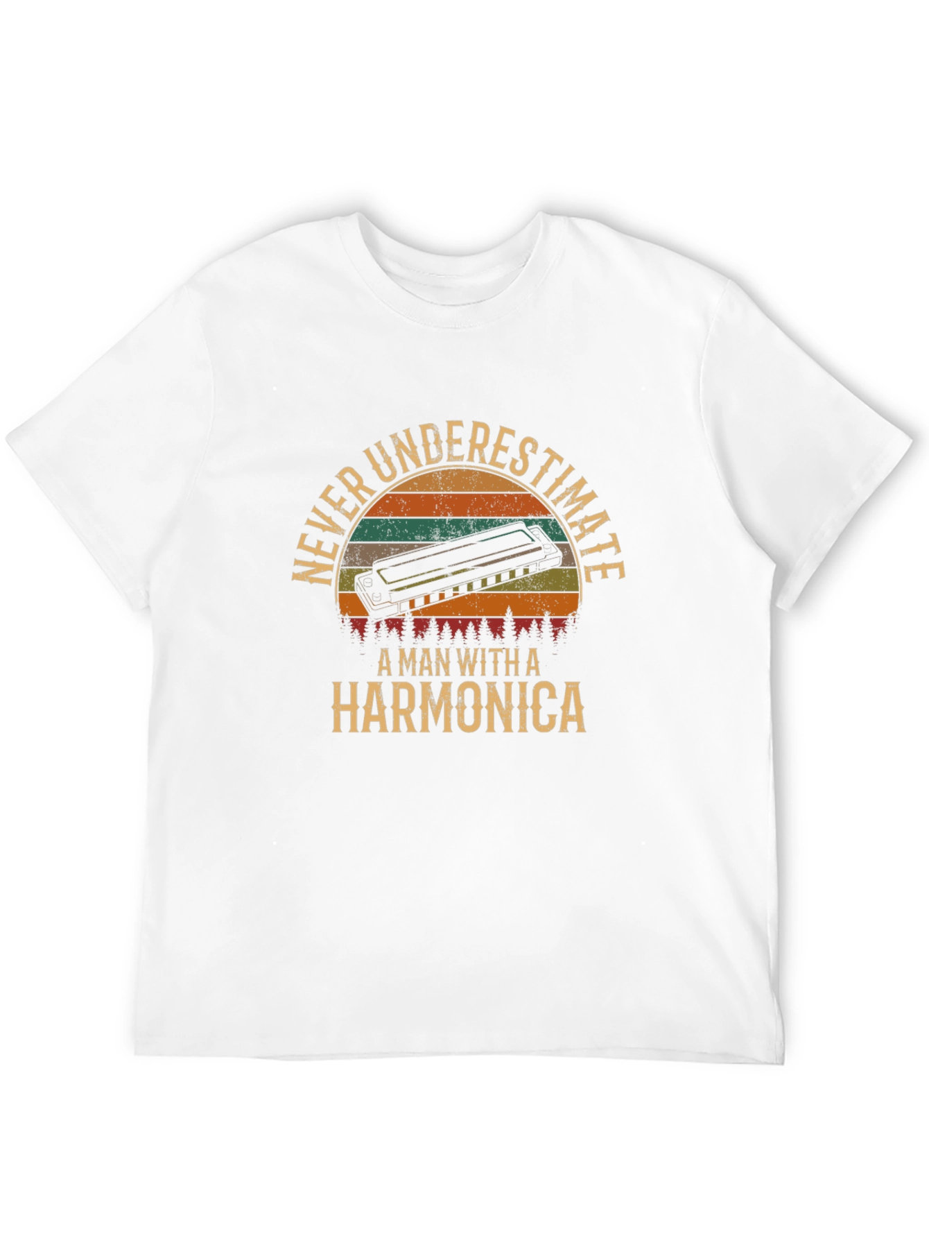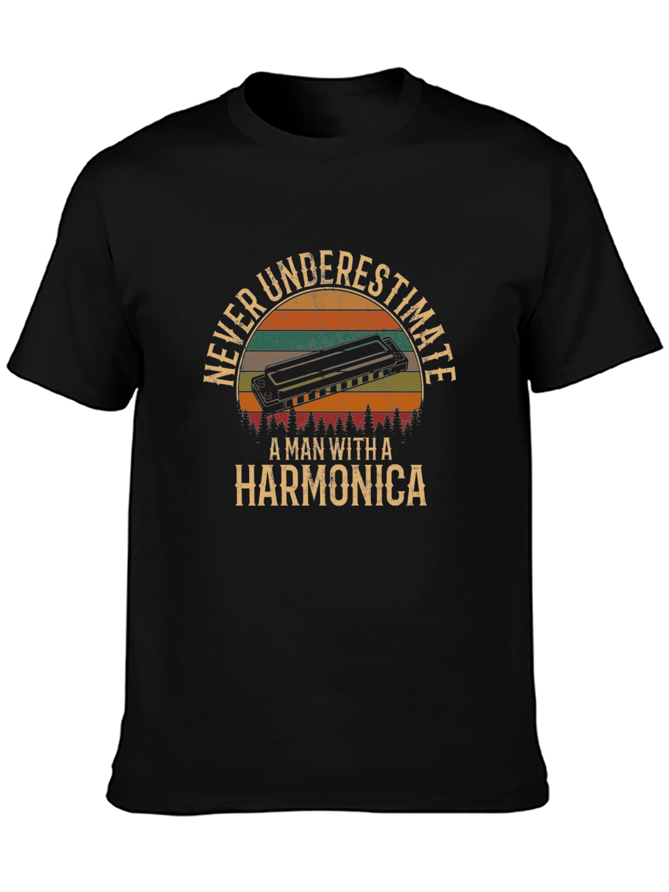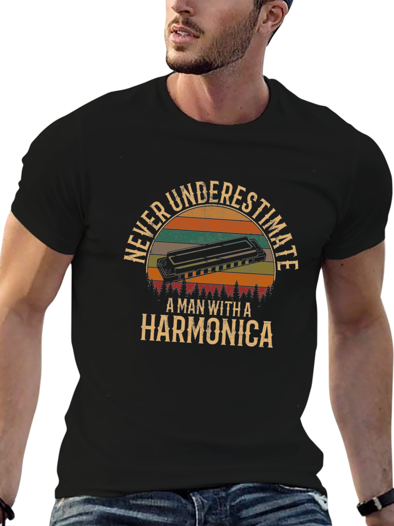 Muestra tu pasión por la música con esta llamativa camiseta negra. Presenta un diseño vintage con la frase "Never Underestimate A Man With A Harmonica" (Nunca subestimes a un hombre con una armónica). El estampado muestra una armónica sobre un fondo de puesta de sol retro y árboles, dándole un toque original y nostálgico. Fabricada con un tejido suave y cómodo, esta camiseta es ideal para usar en el día a día, ya sea para ensayar con tu banda o simplemente para expresar tu amor por la música. Perfecta para músicos, amantes de la armónica y aquellos que aprecian el estilo retro. ¡Añade un toque musical a tu guardarropa con esta camiseta única!