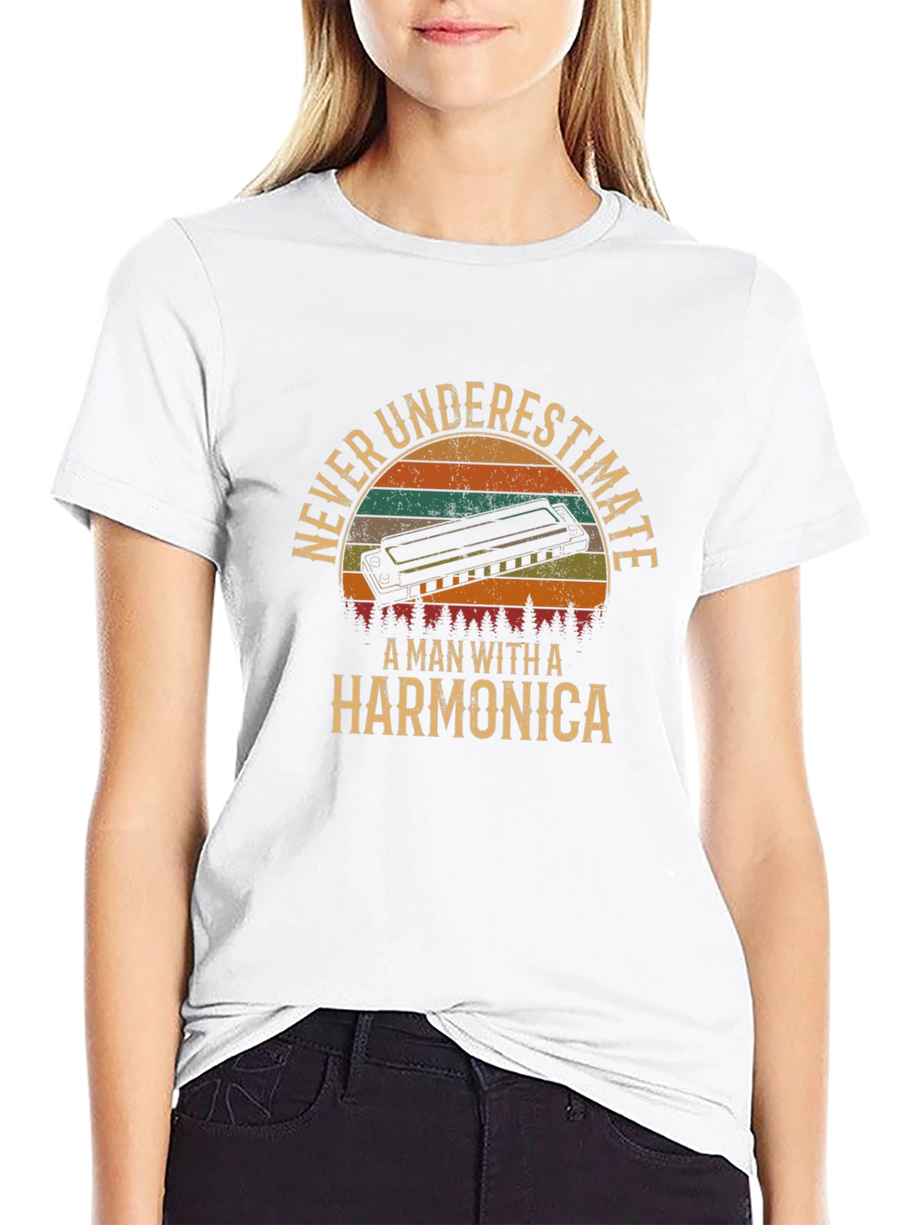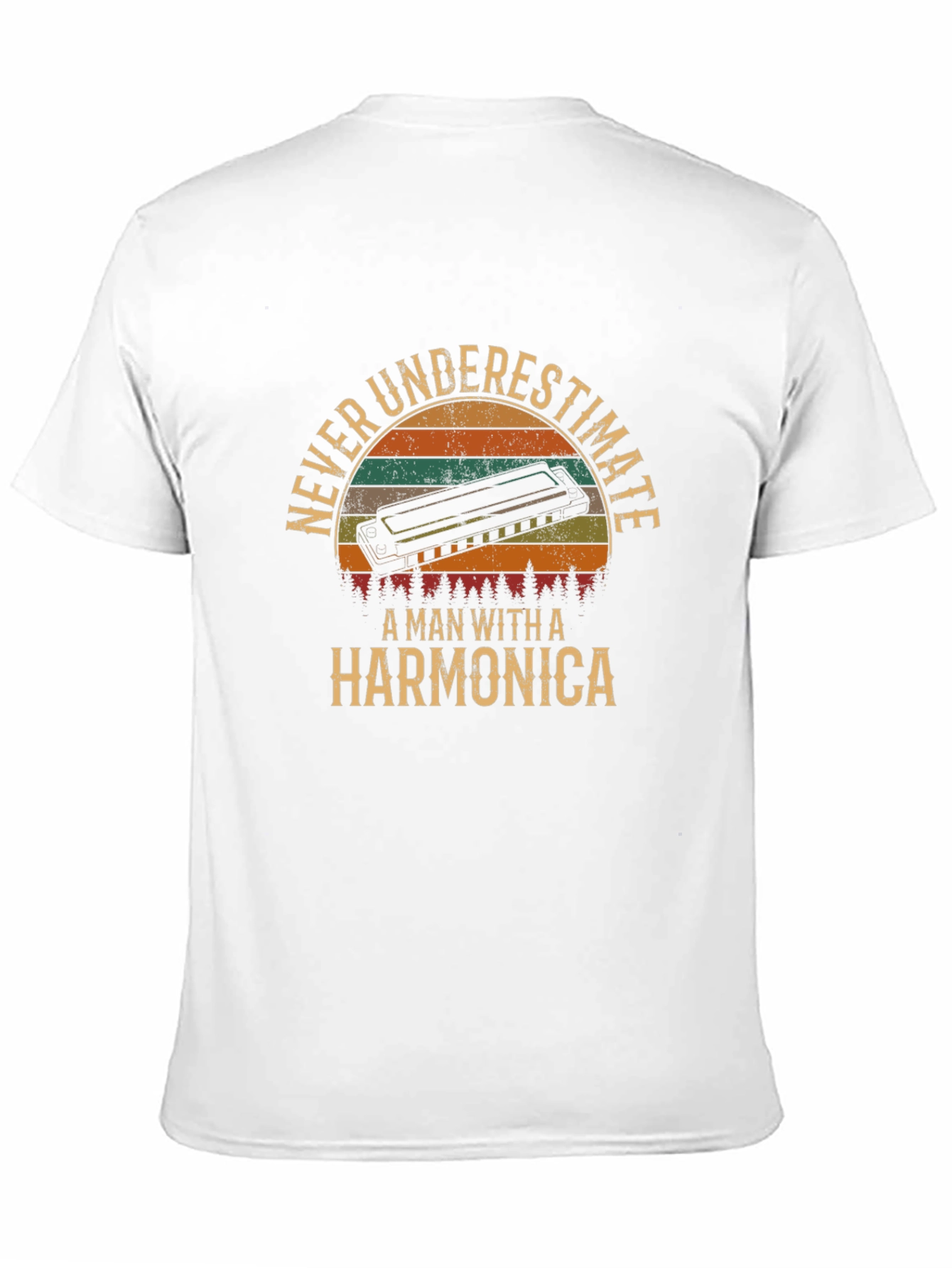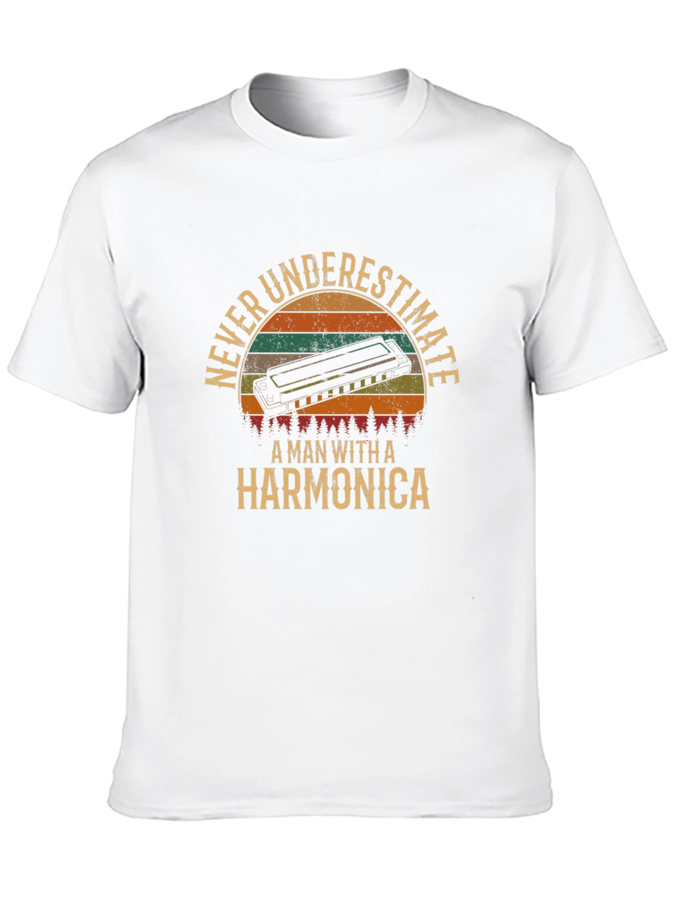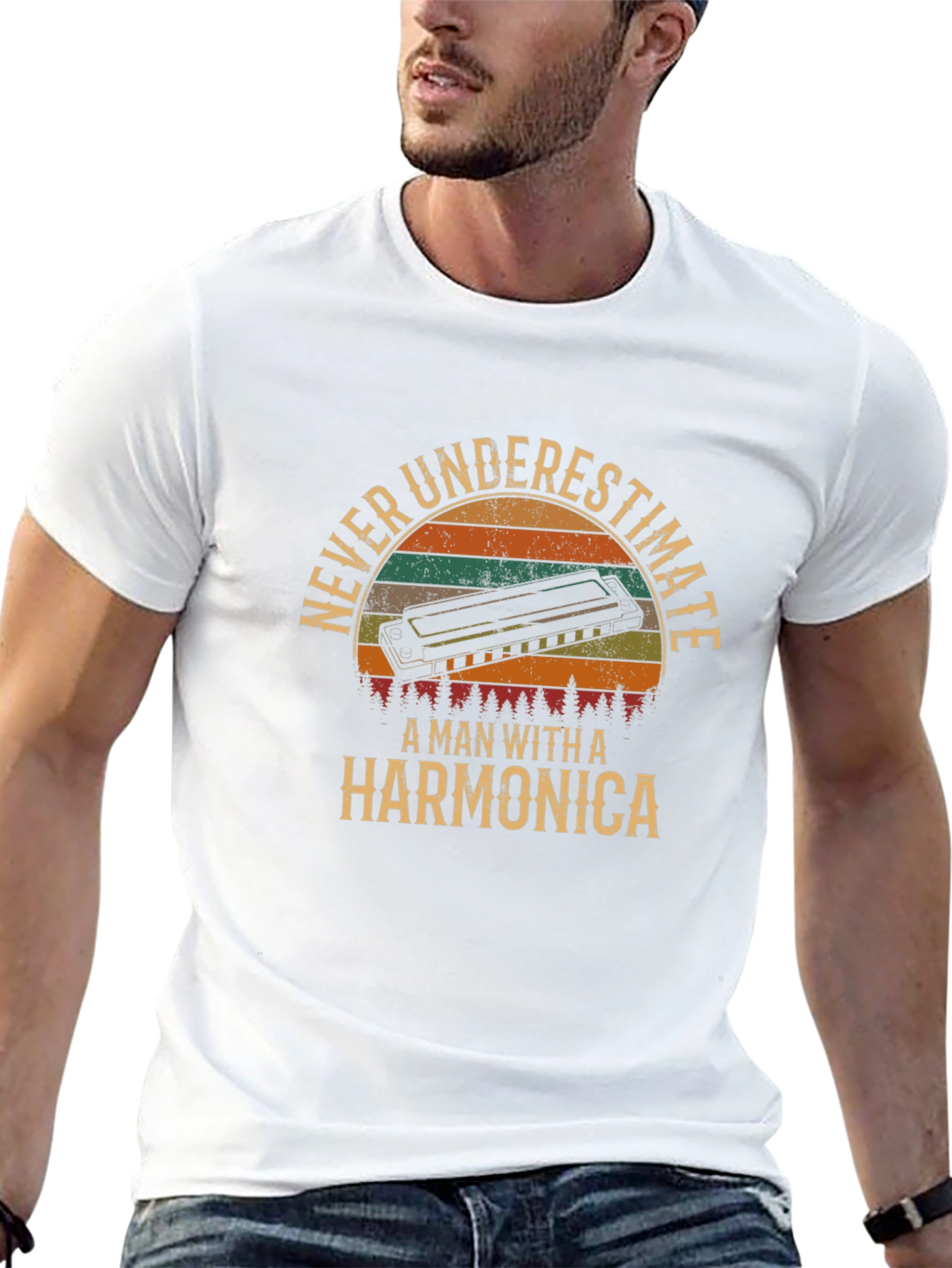Muestra tu pasión por la música con esta llamativa camiseta negra. Presenta un diseño vintage con la frase "Never Underestimate A Man With A Harmonica" (Nunca subestimes a un hombre con una armónica). El estampado muestra una armónica sobre un fondo de puesta de sol retro y árboles, dándole un toque original y nostálgico. Fabricada con un tejido suave y cómodo, esta camiseta es ideal para usar en el día a día, ya sea para ensayar con tu banda o simplemente para expresar tu amor por la música. Perfecta para músicos, amantes de la armónica y aquellos que aprecian el estilo retro. ¡Añade un toque musical a tu guardarropa con esta camiseta única!