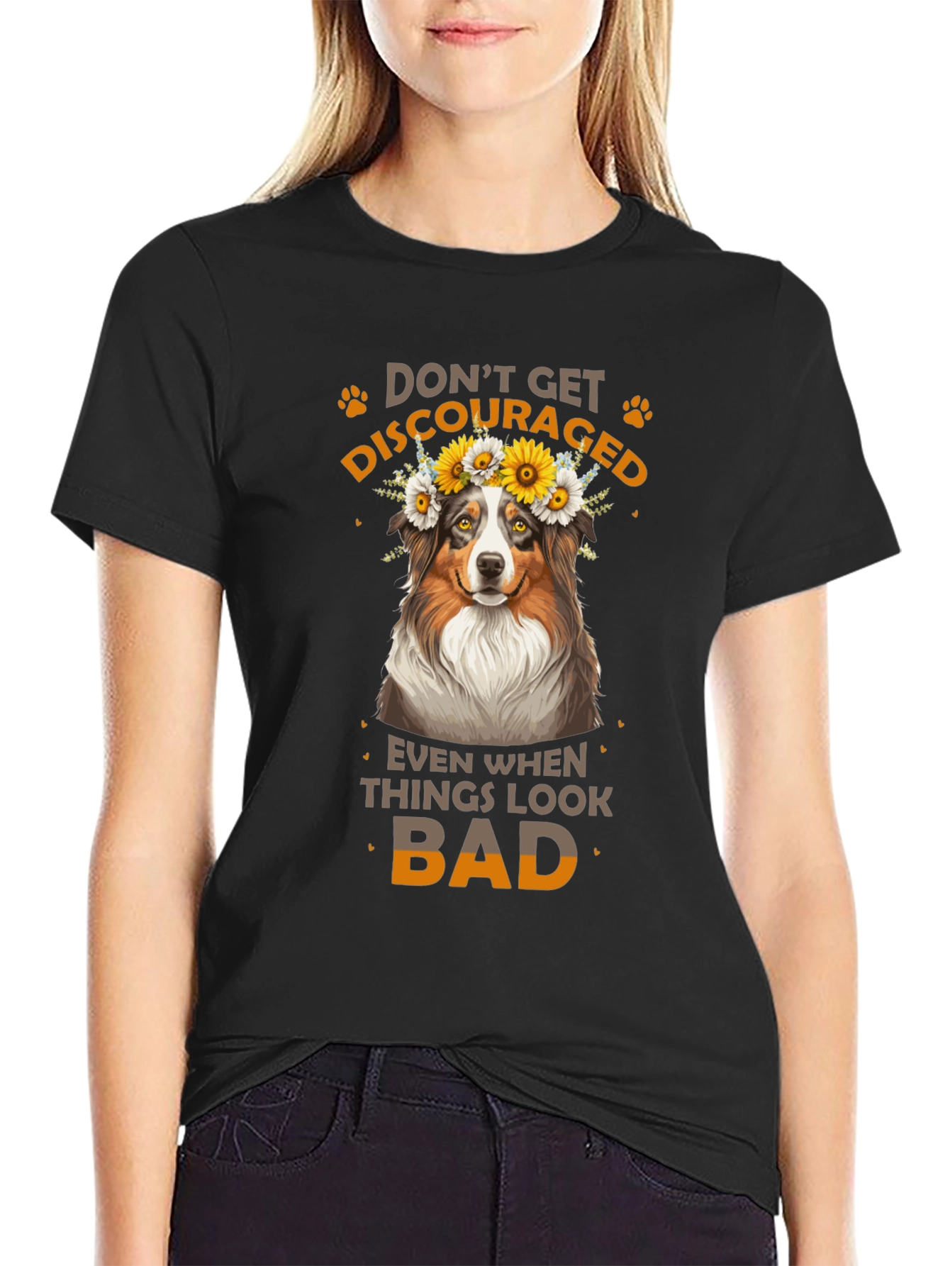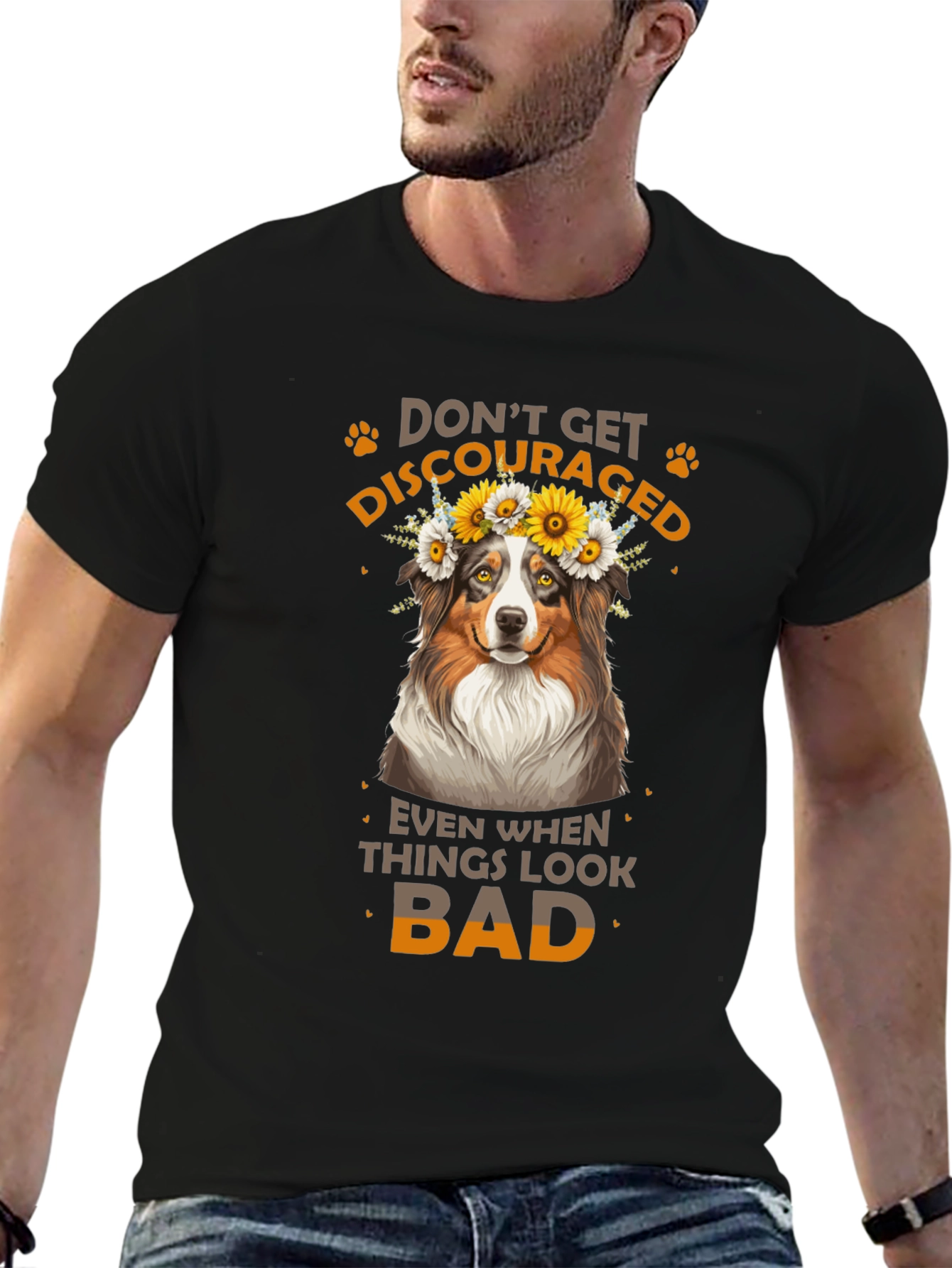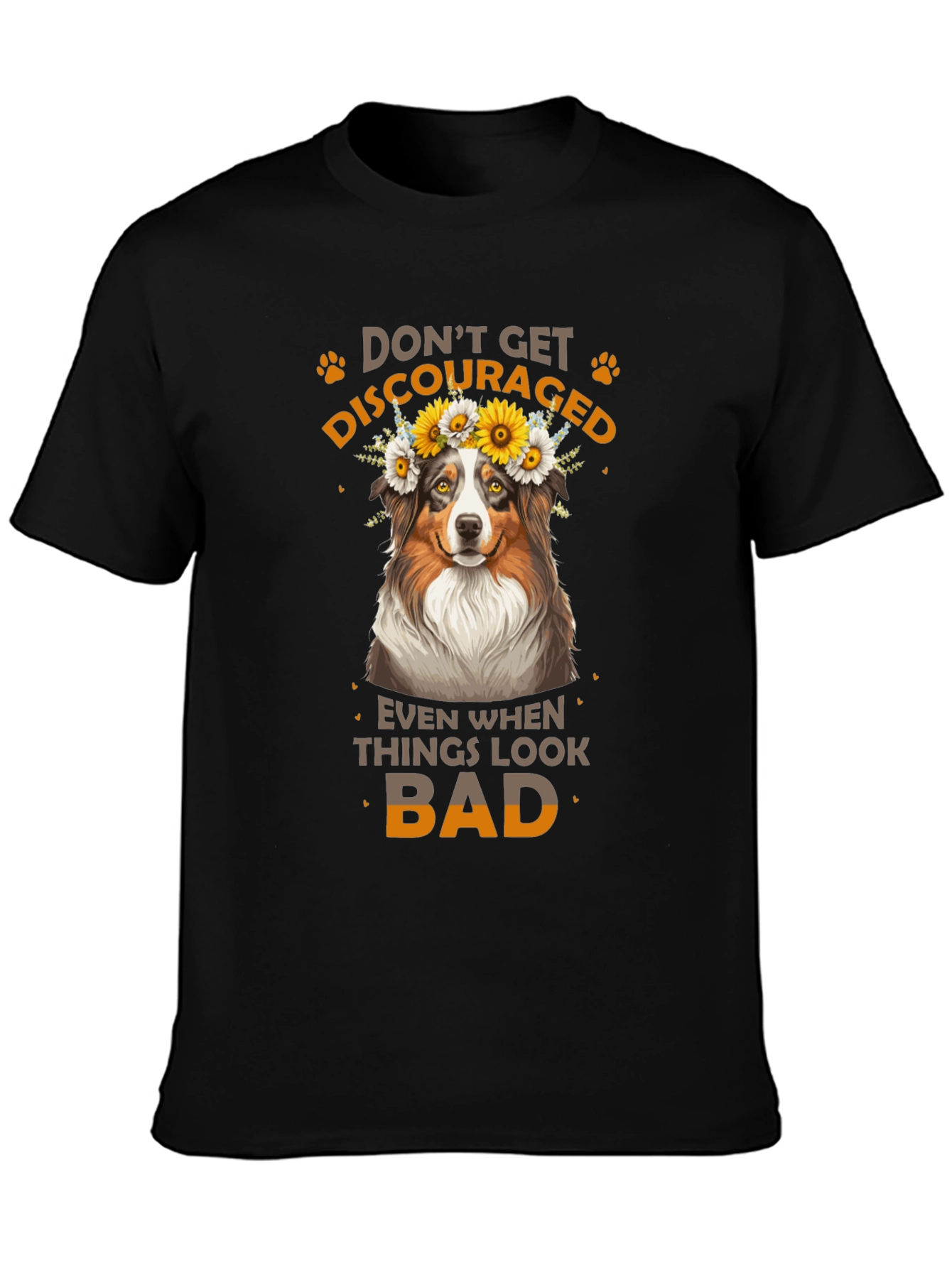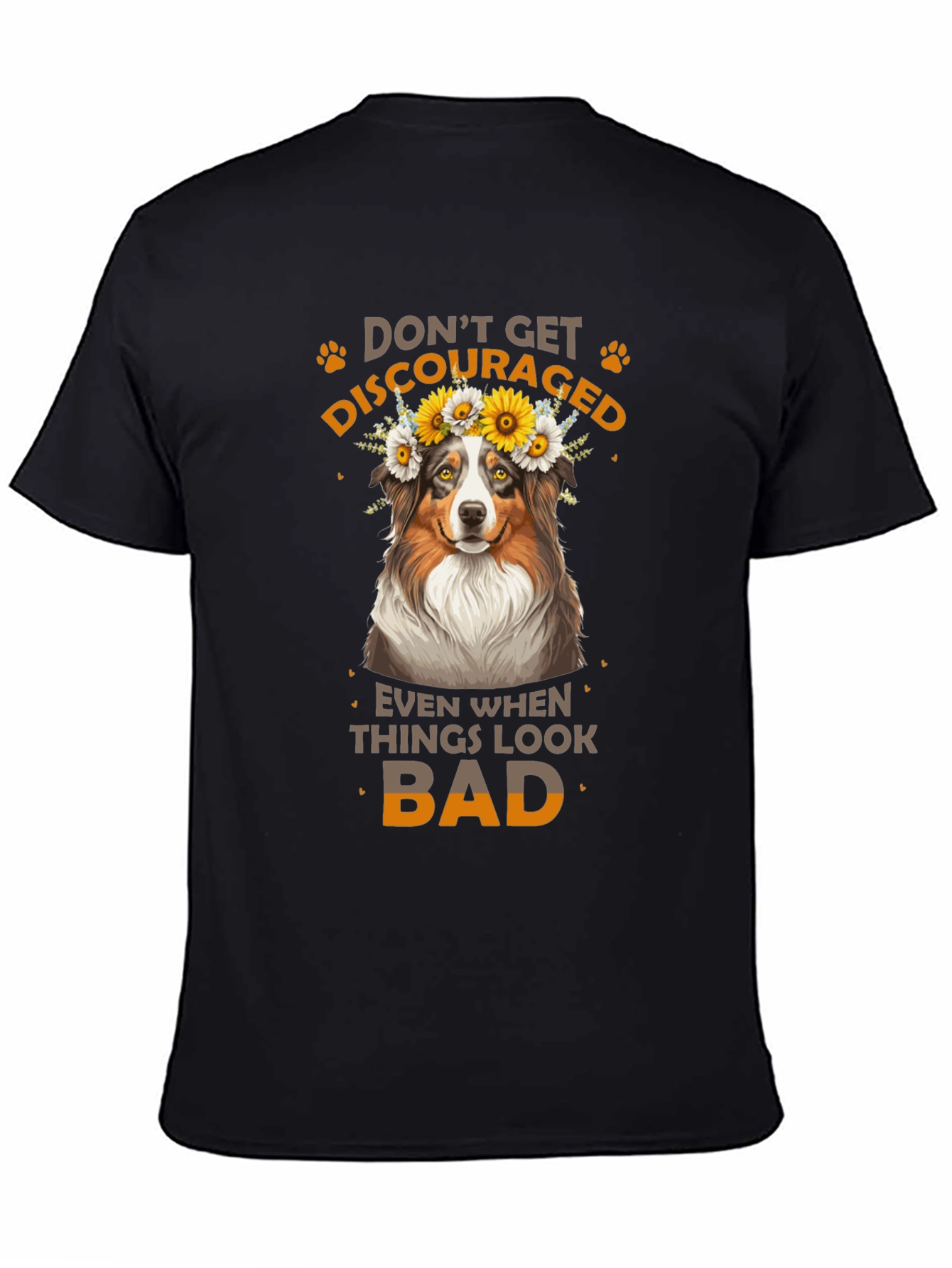 Luce esta atractiva camiseta negra con un diseño adorable. Presenta un simpático perro con una corona de flores, acompañado del inspirador mensaje "No te desanimes, incluso cuando las cosas se ven mal". Ideal para los amantes de los animales y aquellos que buscan un toque de optimismo en su vestuario. Fabricada con materiales suaves y cómodos, esta camiseta es perfecta para usar a diario, ya sea para salir con amigos, relajarte en casa o como un regalo especial para alguien que necesita un poco de ánimo. Su diseño llamativo y mensaje positivo la hacen una prenda única y versátil.