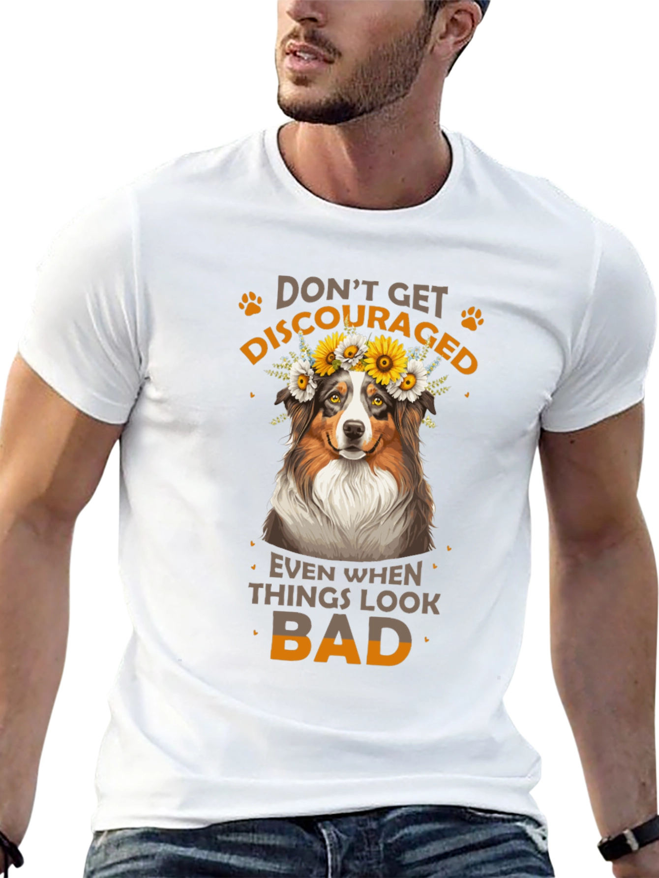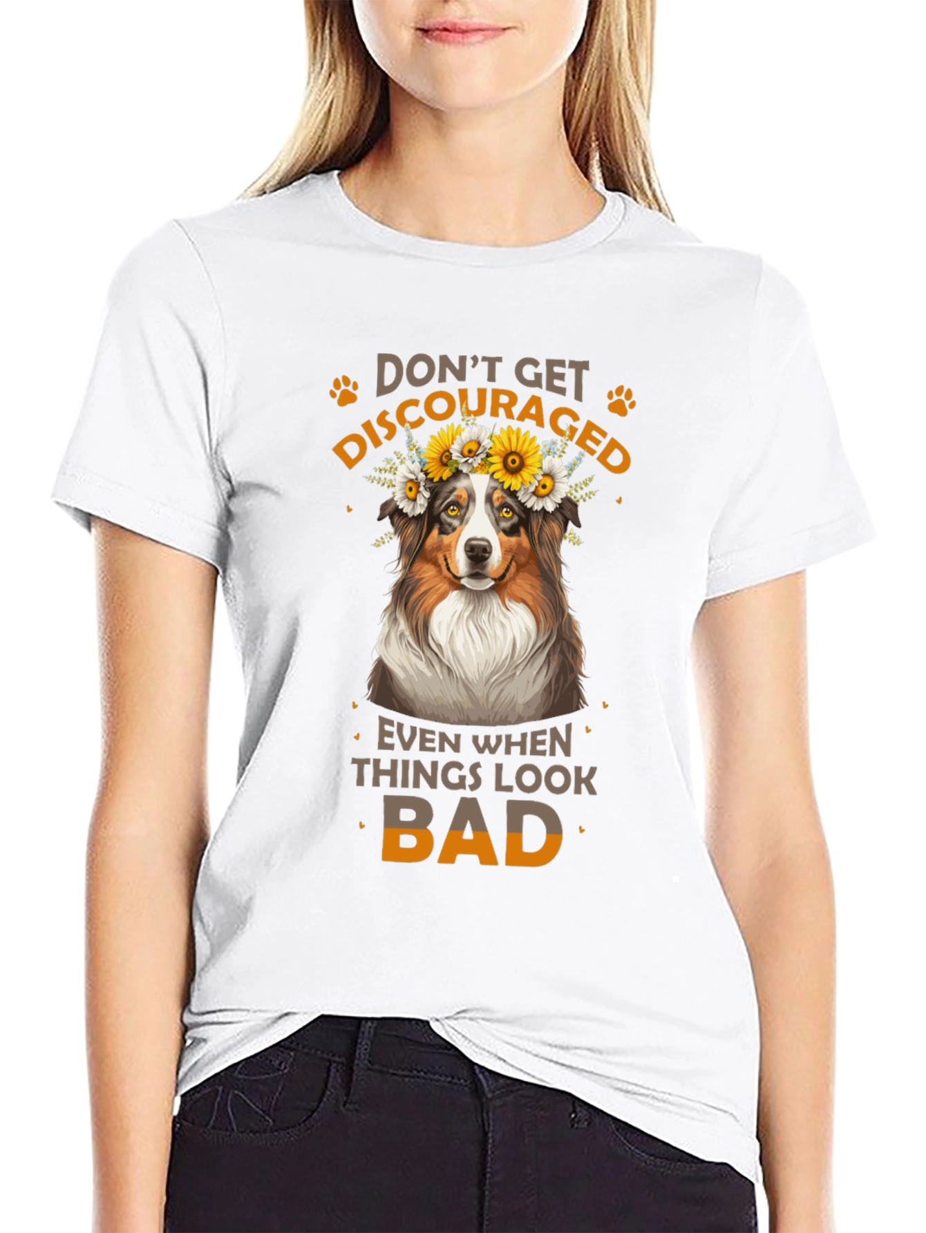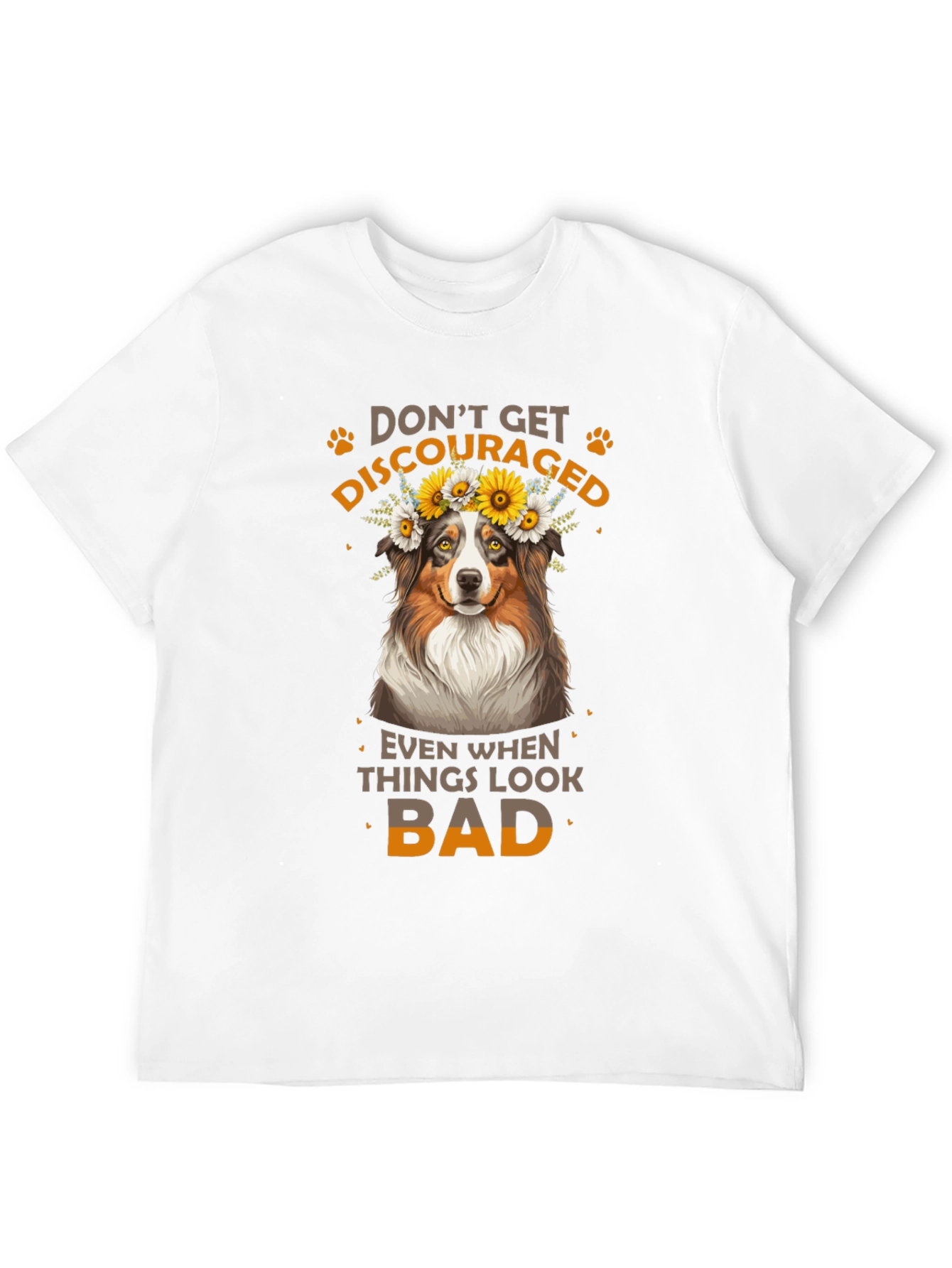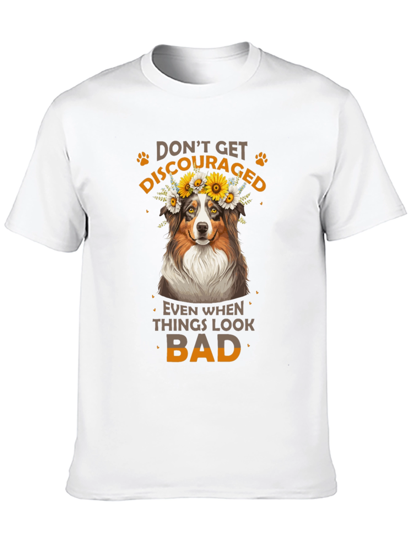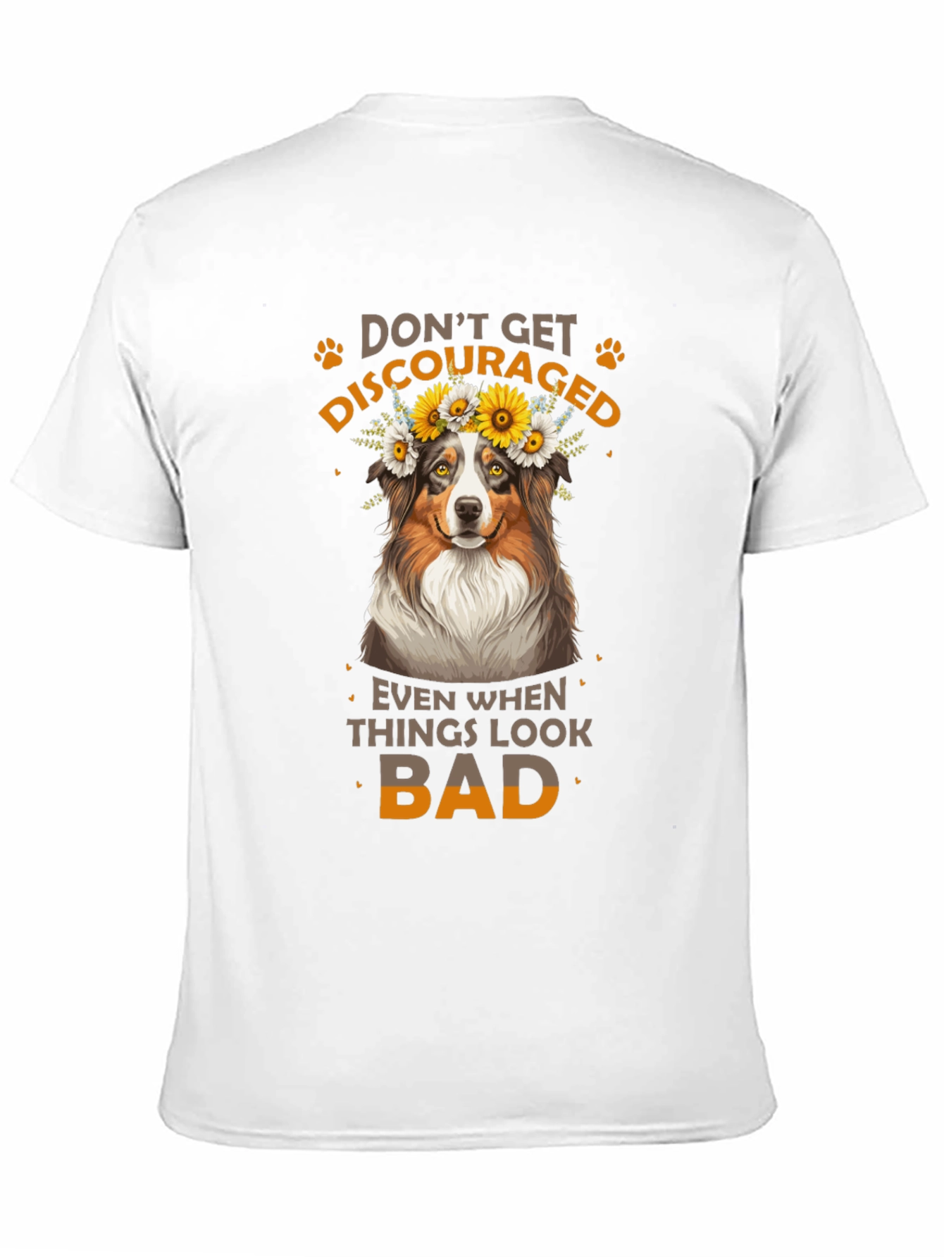 Luce esta atractiva camiseta negra con un diseño adorable. Presenta un simpático perro con una corona de flores, acompañado del inspirador mensaje "No te desanimes, incluso cuando las cosas se ven mal". Ideal para los amantes de los animales y aquellos que buscan un toque de optimismo en su vestuario. Fabricada con materiales suaves y cómodos, esta camiseta es perfecta para usar a diario, ya sea para salir con amigos, relajarte en casa o como un regalo especial para alguien que necesita un poco de ánimo. Su diseño llamativo y mensaje positivo la hacen una prenda única y versátil.