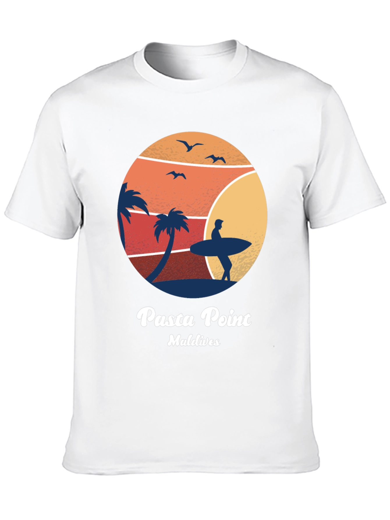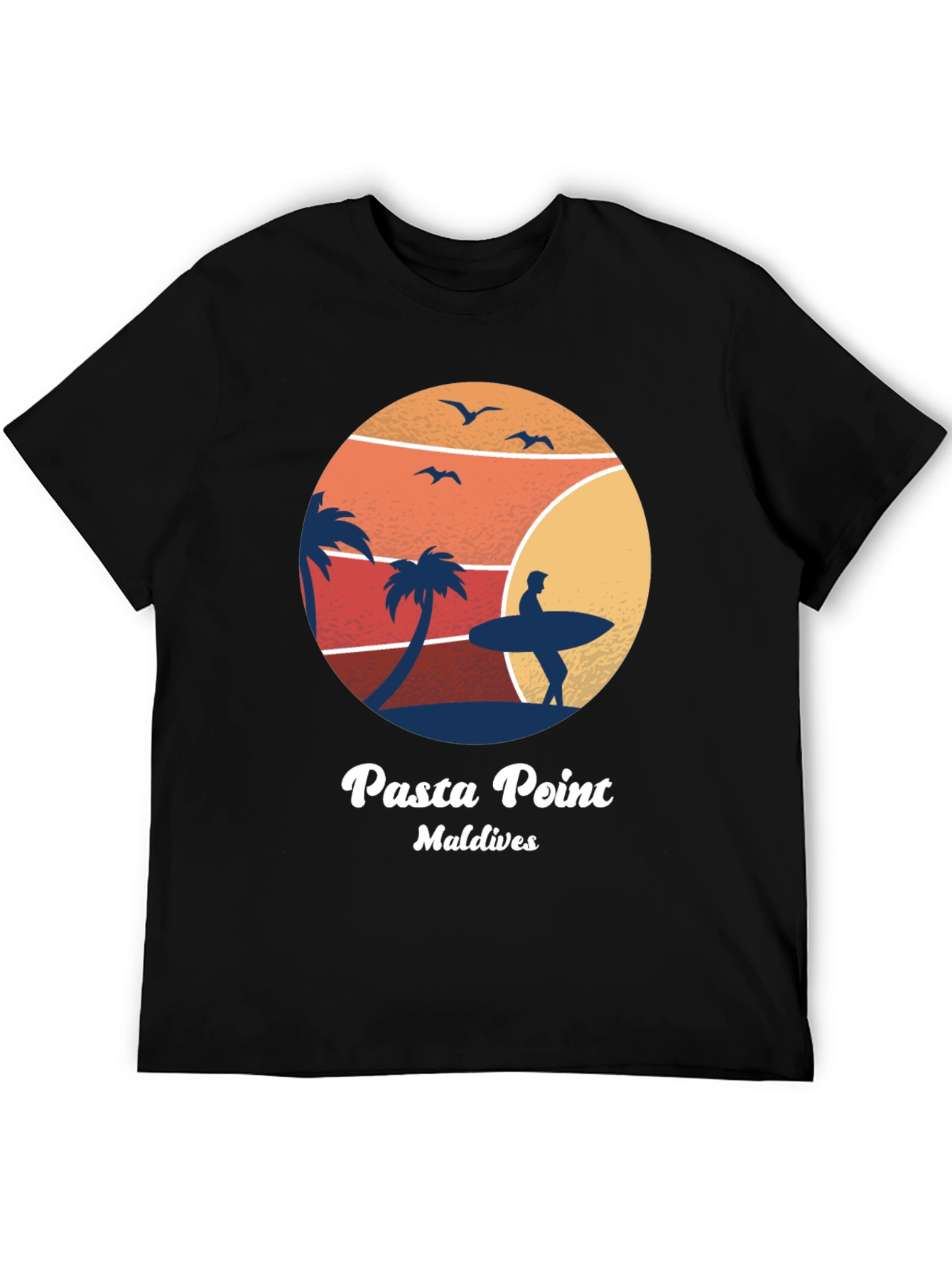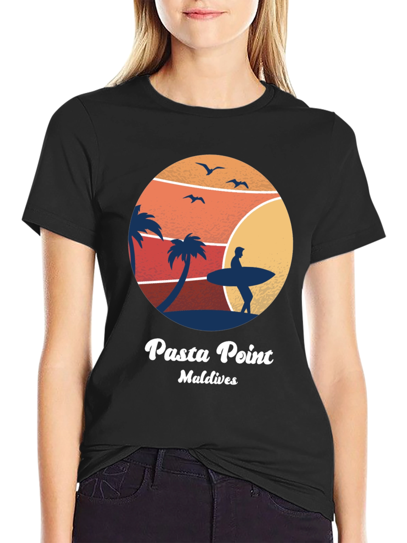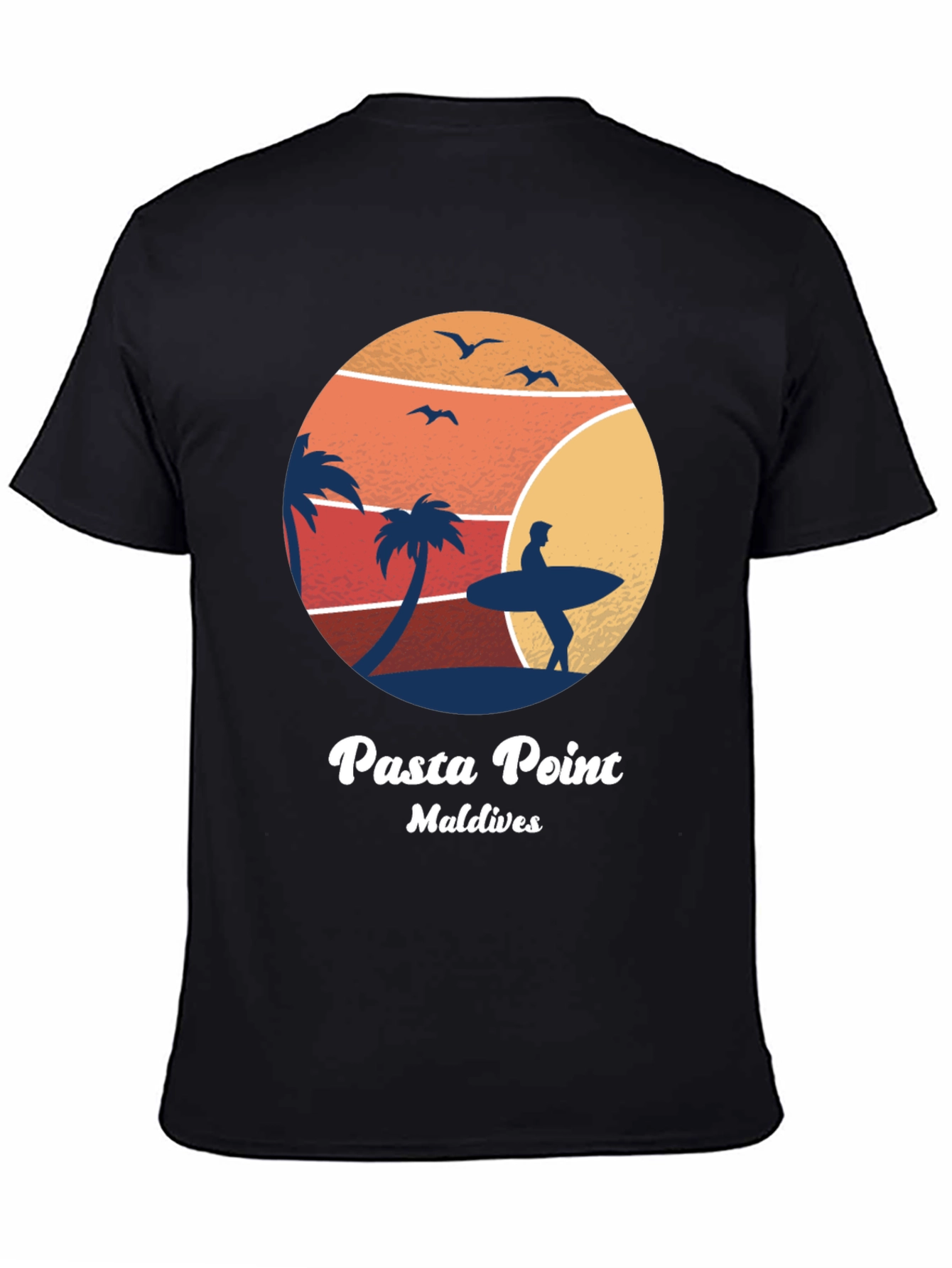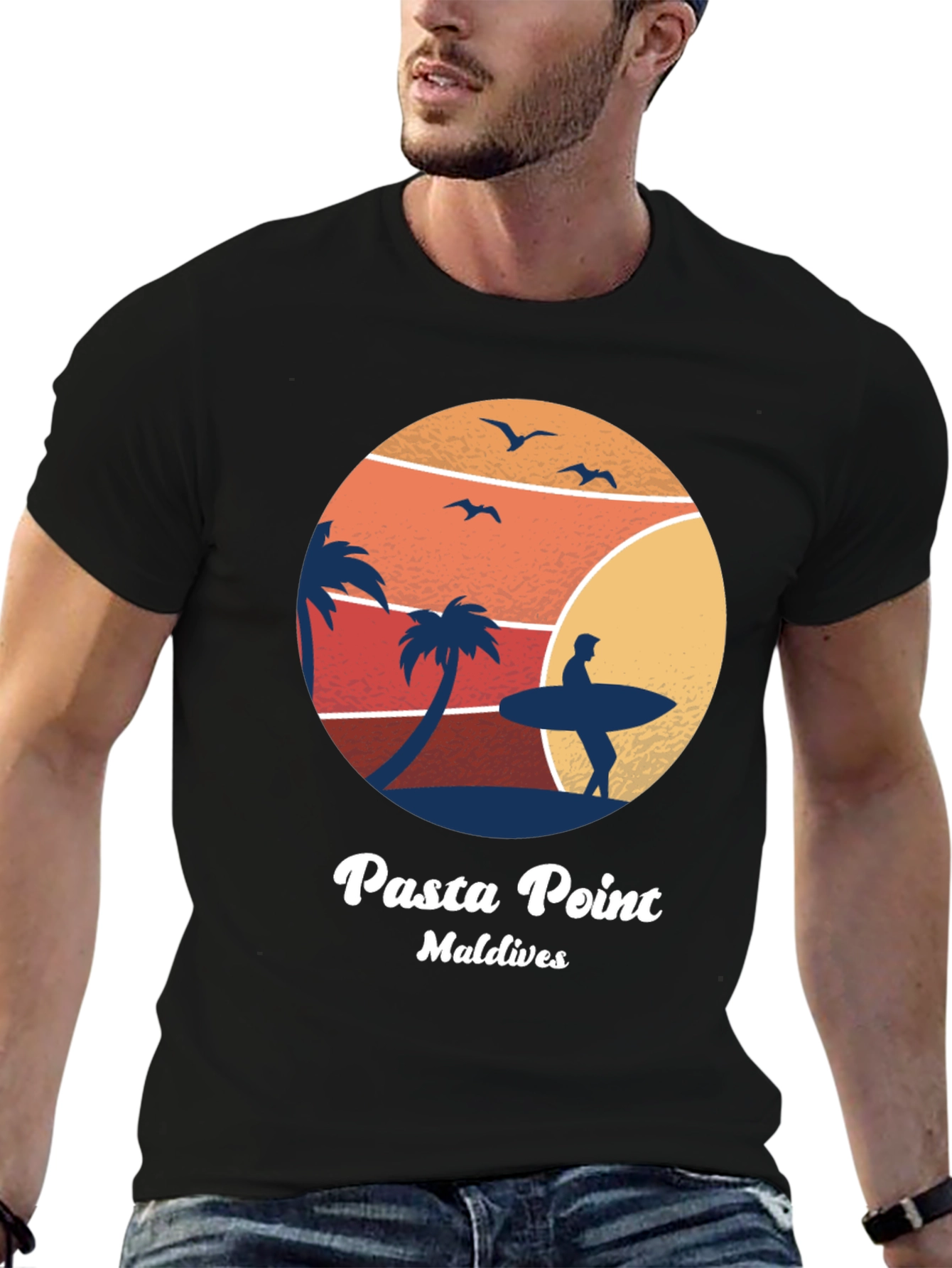 Esta camiseta negra de manga corta presenta un diseño llamativo de Pasta Point, Maldives. Un círculo de colores cálidos evoca una puesta de sol tropical con palmeras, un surfista y aves marinas. Hecha de tela suave y cómoda, esta camiseta es perfecta para el uso diario o para mostrar tu amor por el surf y los viajes. Su diseño único la convierte en una excelente pieza para cualquier armario. Ideal para un look casual o para un día en la playa. ¡Lleva contigo un pedazo del paraíso!