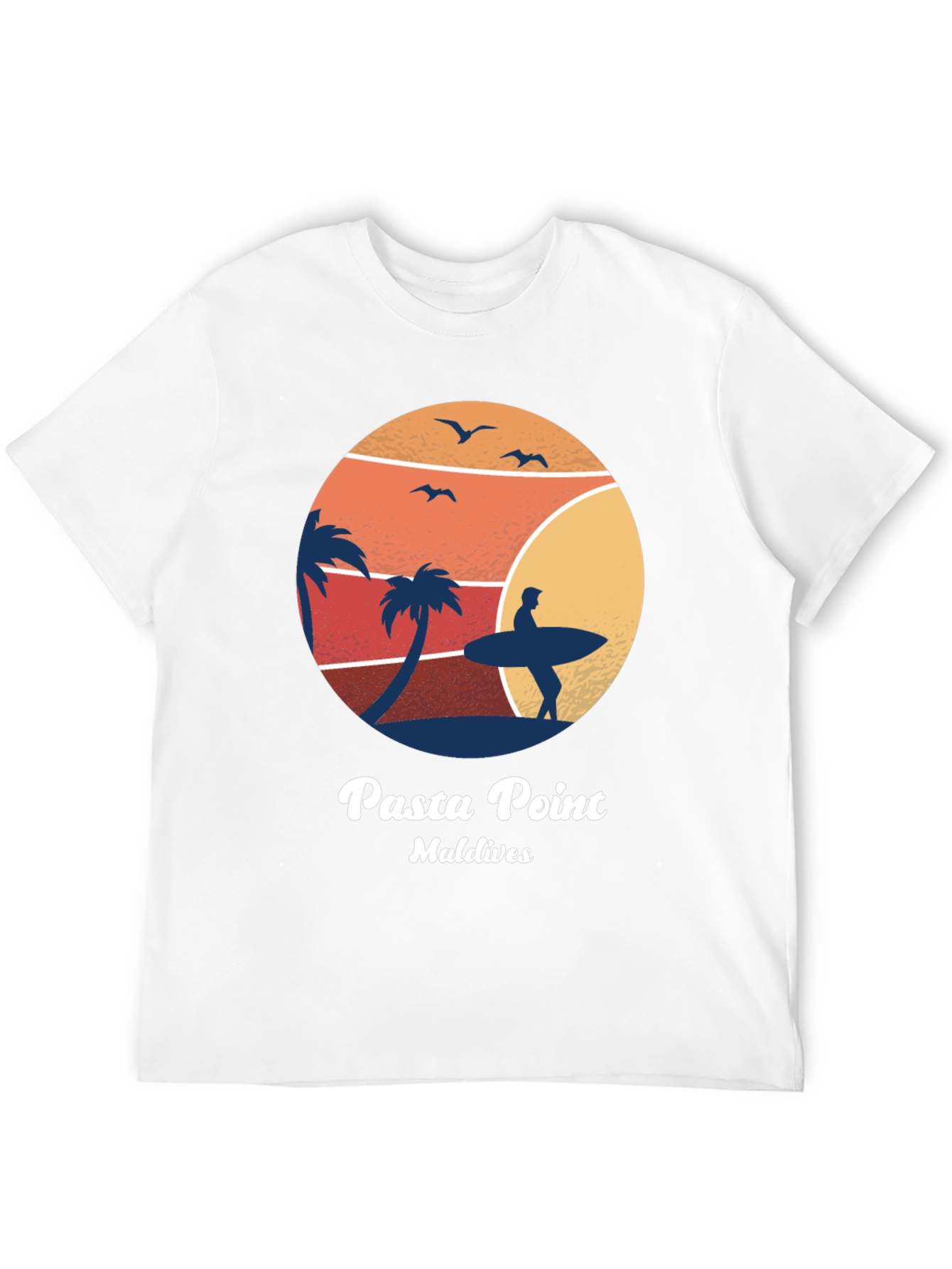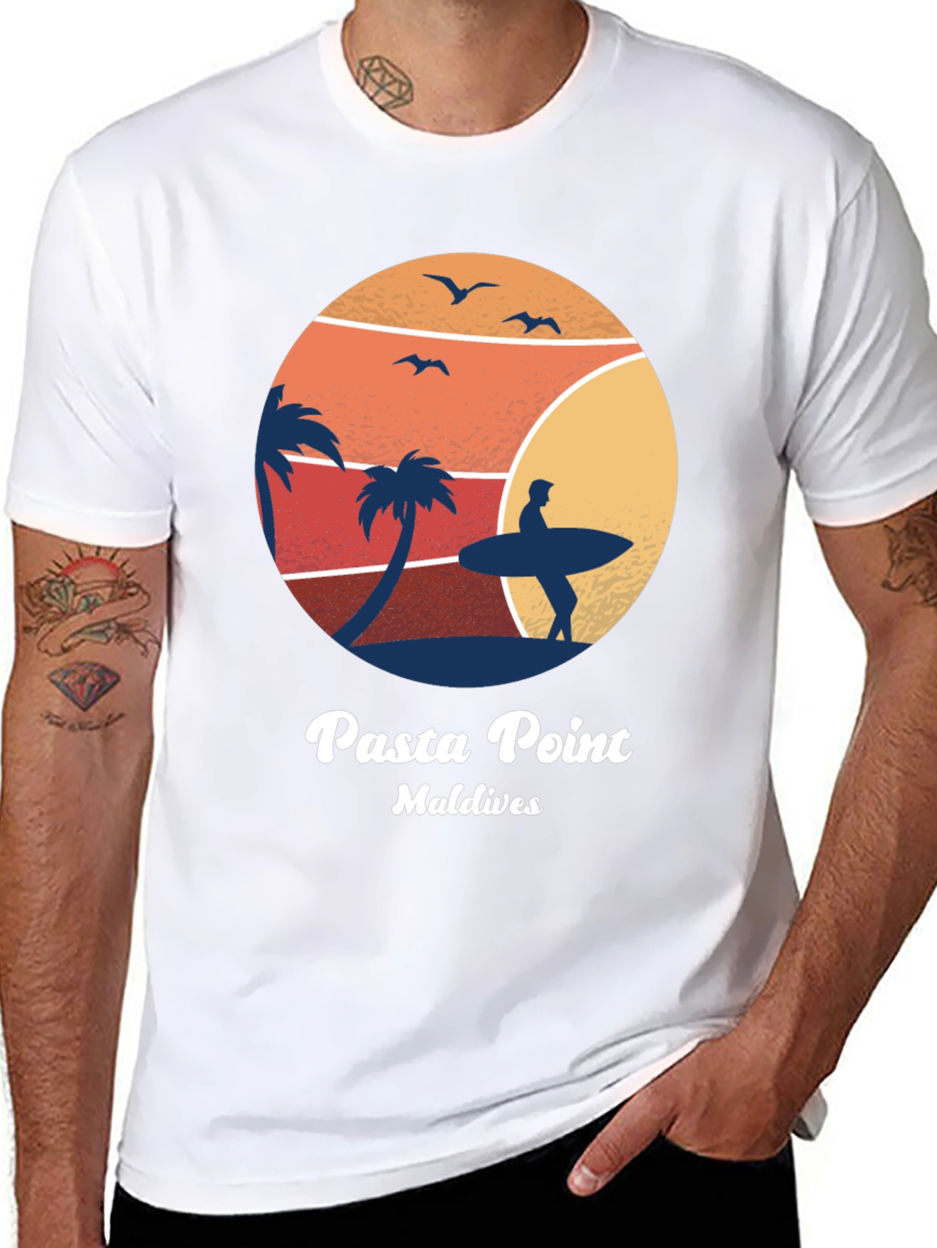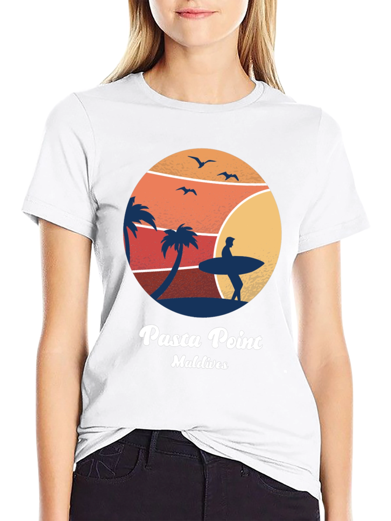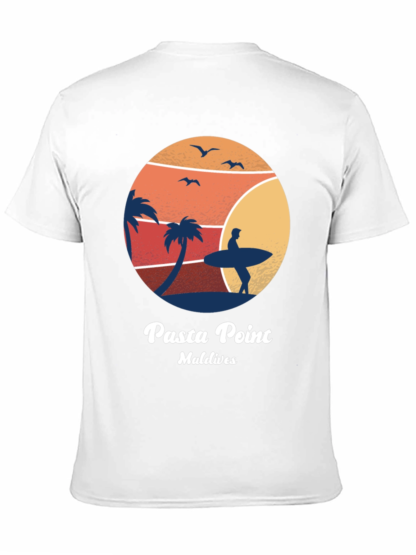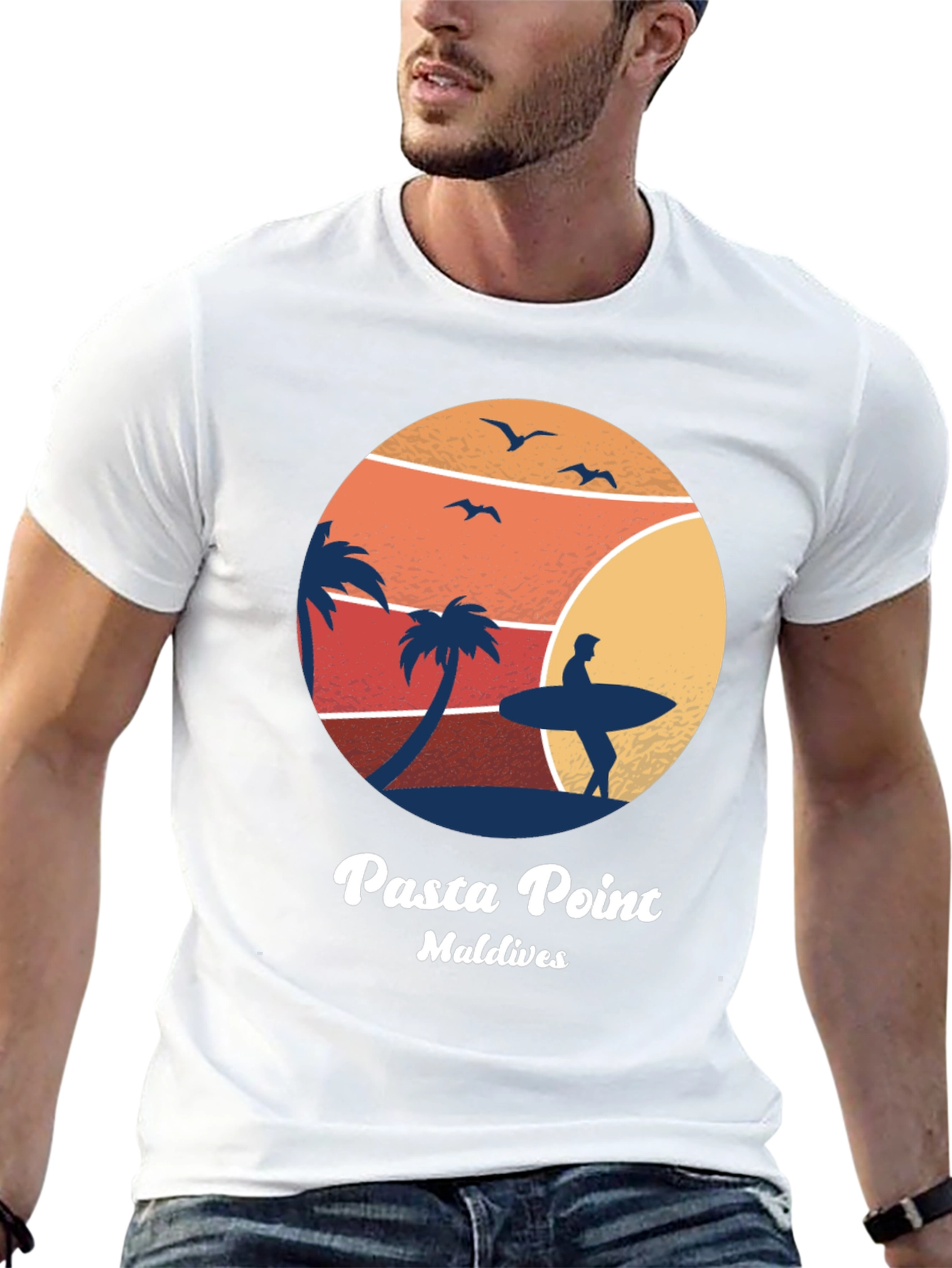 Esta camiseta negra de manga corta presenta un diseño llamativo de Pasta Point, Maldives. Un círculo de colores cálidos evoca una puesta de sol tropical con palmeras, un surfista y aves marinas. Hecha de tela suave y cómoda, esta camiseta es perfecta para el uso diario o para mostrar tu amor por el surf y los viajes. Su diseño único la convierte en una excelente pieza para cualquier armario. Ideal para un look casual o para un día en la playa. ¡Lleva contigo un pedazo del paraíso!