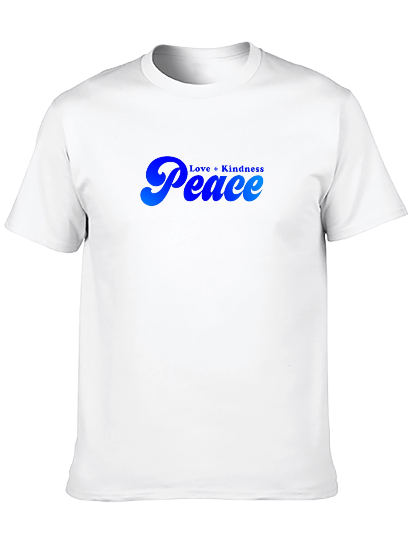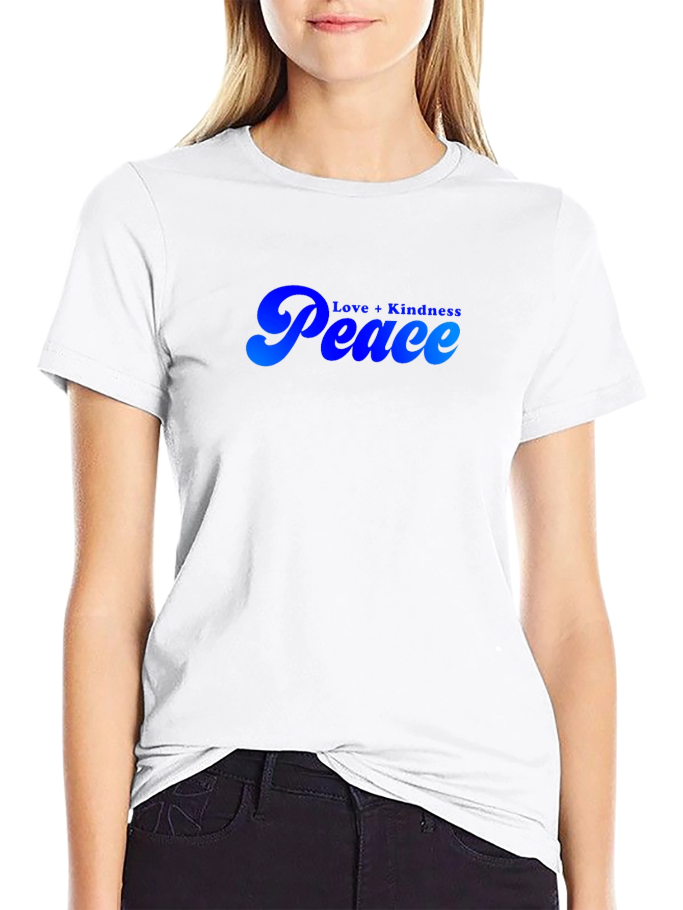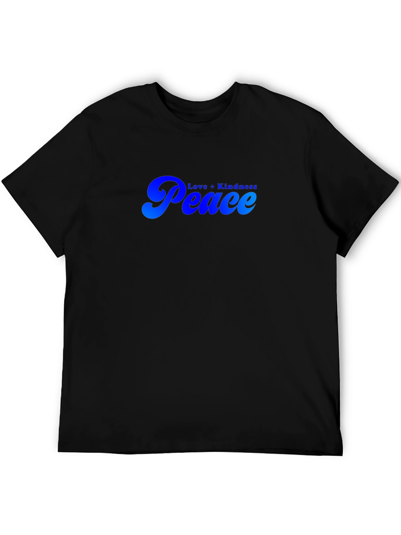 Luce un estilo relajado con esta camiseta negra de manga corta. Presenta un diseño llamativo con las palabras "Peace" y "Love + Kindness" en un degradado de azul, ofreciendo un toque de optimismo y positividad. Ideal para uso diario, esta camiseta es perfecta para expresar tu individualidad y promover un mensaje de paz y armonía. Su tejido suave proporciona comodidad durante todo el día. Combina esta prenda versátil con jeans, pantalones cortos o faldas para un look casual y moderno. Añade un toque de serenidad a tu guardarropa con esta camiseta única.