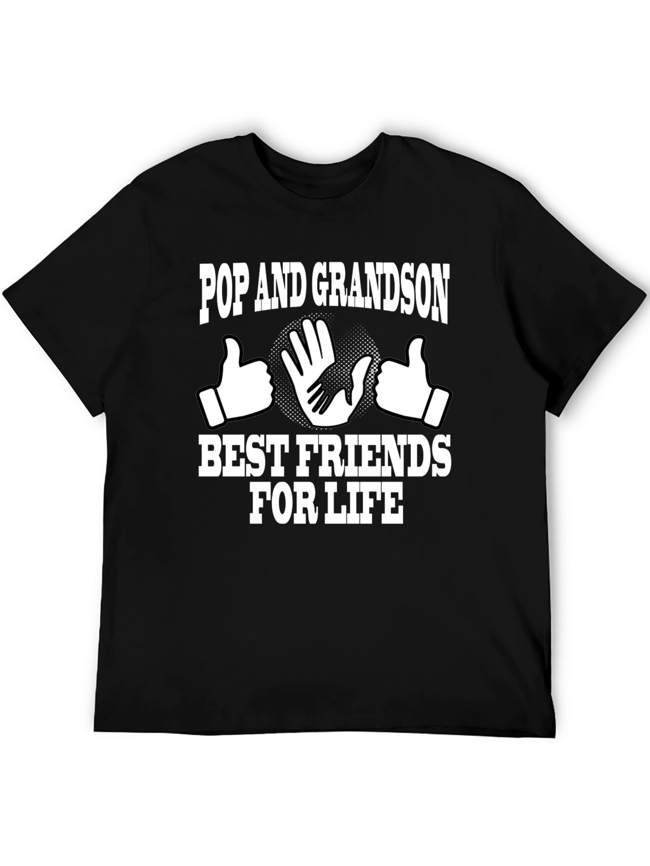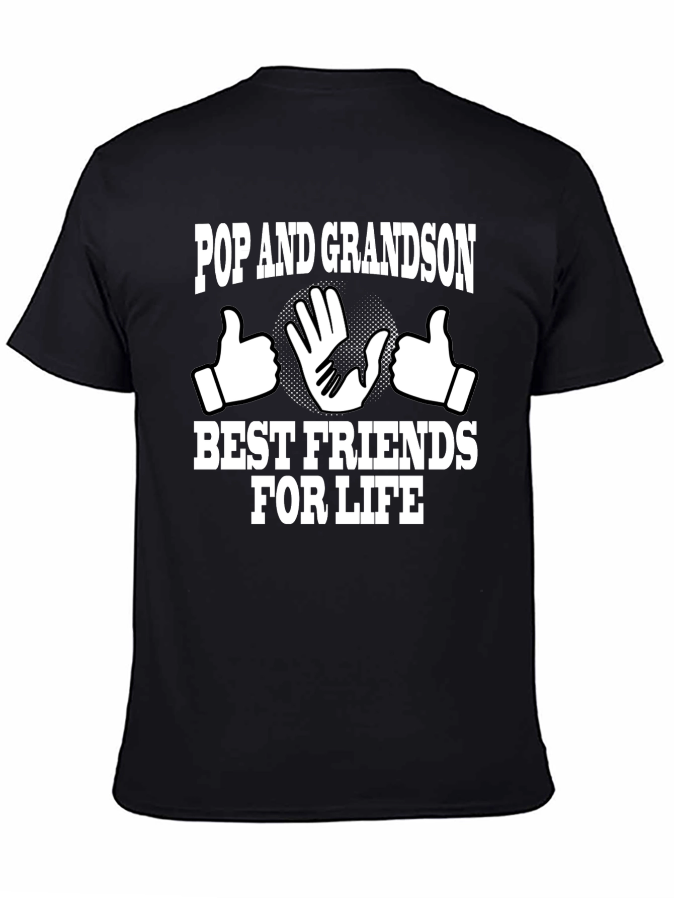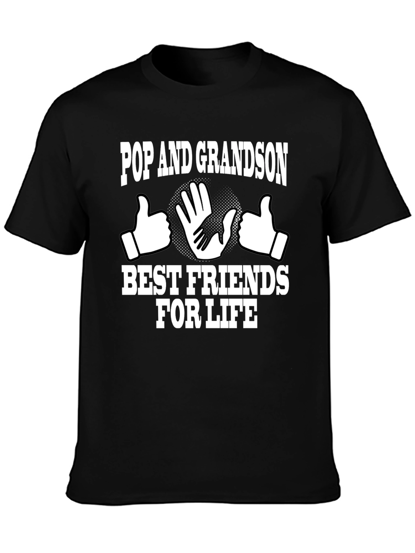 Muestra tu vínculo especial con esta camiseta negra que celebra la relación entre abuelo y nieto. El diseño presenta la frase "POP AND GRANDSON BEST FRIENDS FOR LIFE" en llamativas letras blancas, complementada con ilustraciones de manos entrelazadas en señal de complicidad. Perfecta para regalar en cumpleaños, el Día del Padre o simplemente para demostrar el cariño incondicional. Hecha con materiales suaves y cómodos, esta camiseta es ideal para usar a diario o en ocasiones especiales donde quieras destacar ese lazo familiar único. ¡Luce con orgullo tu conexión con tu nieto!