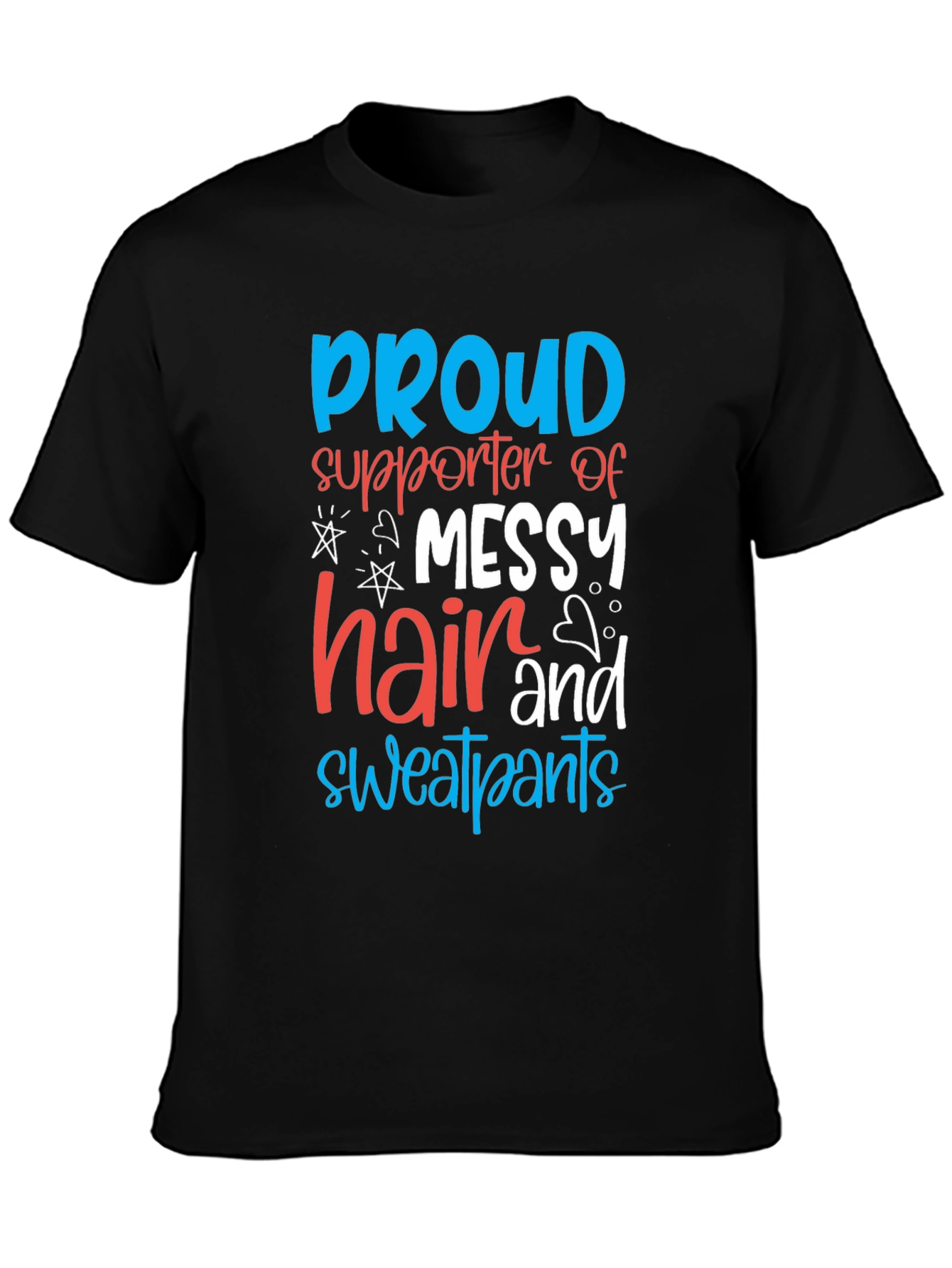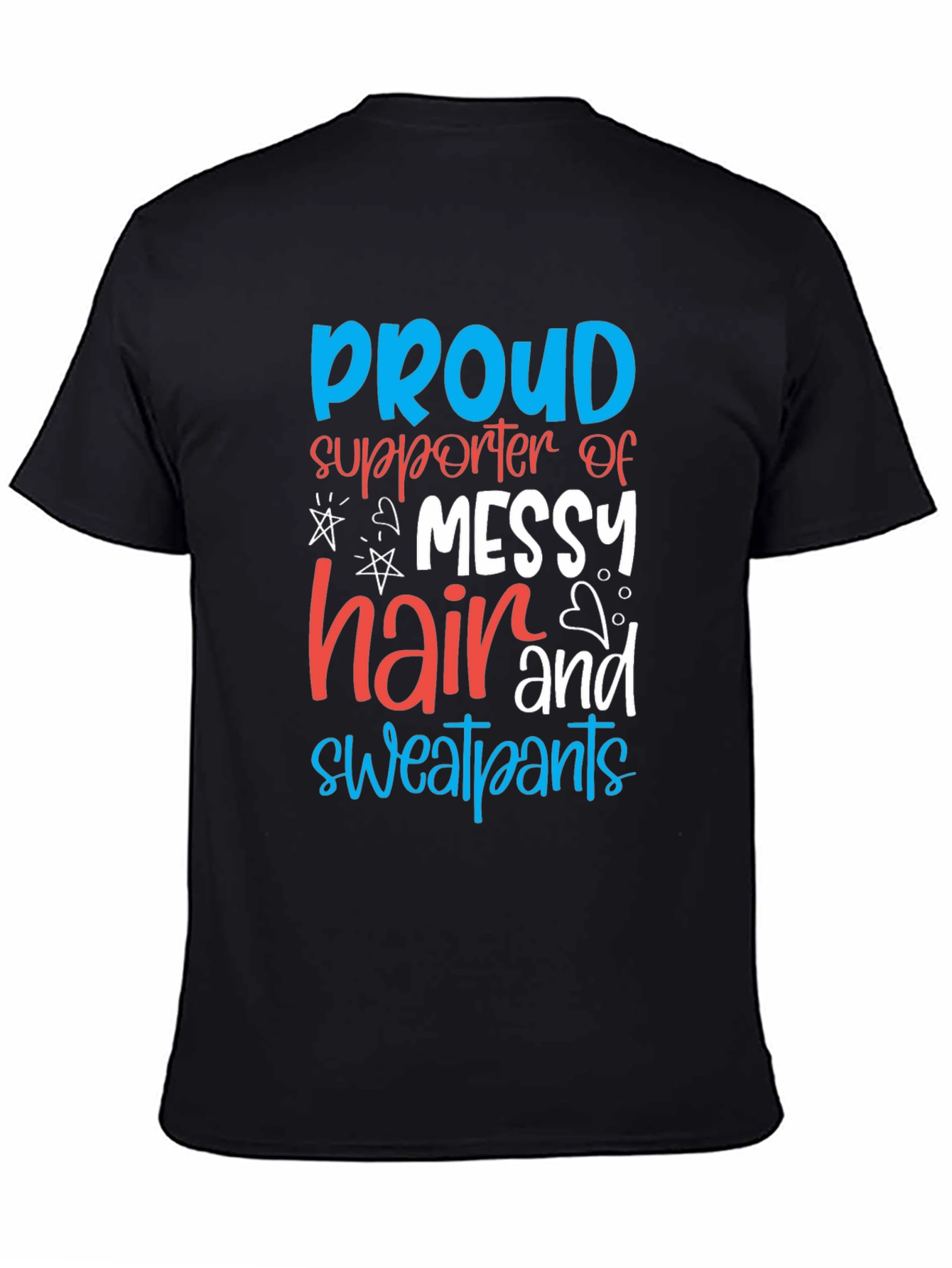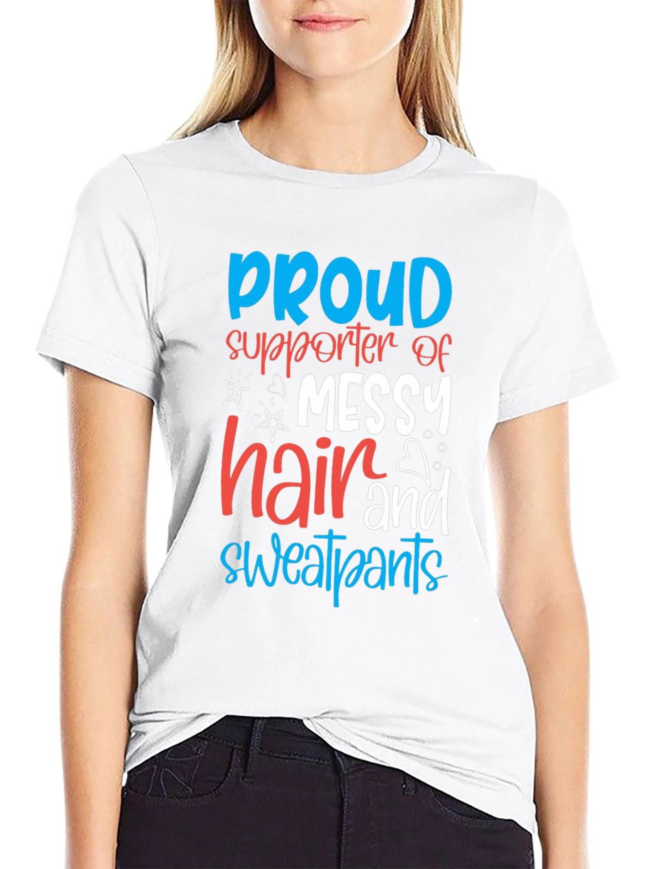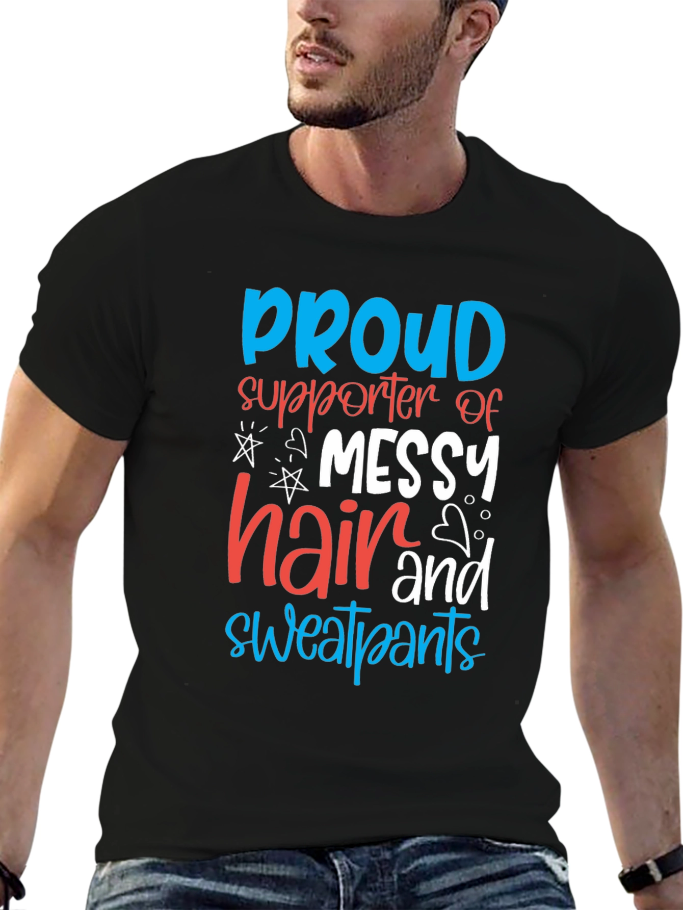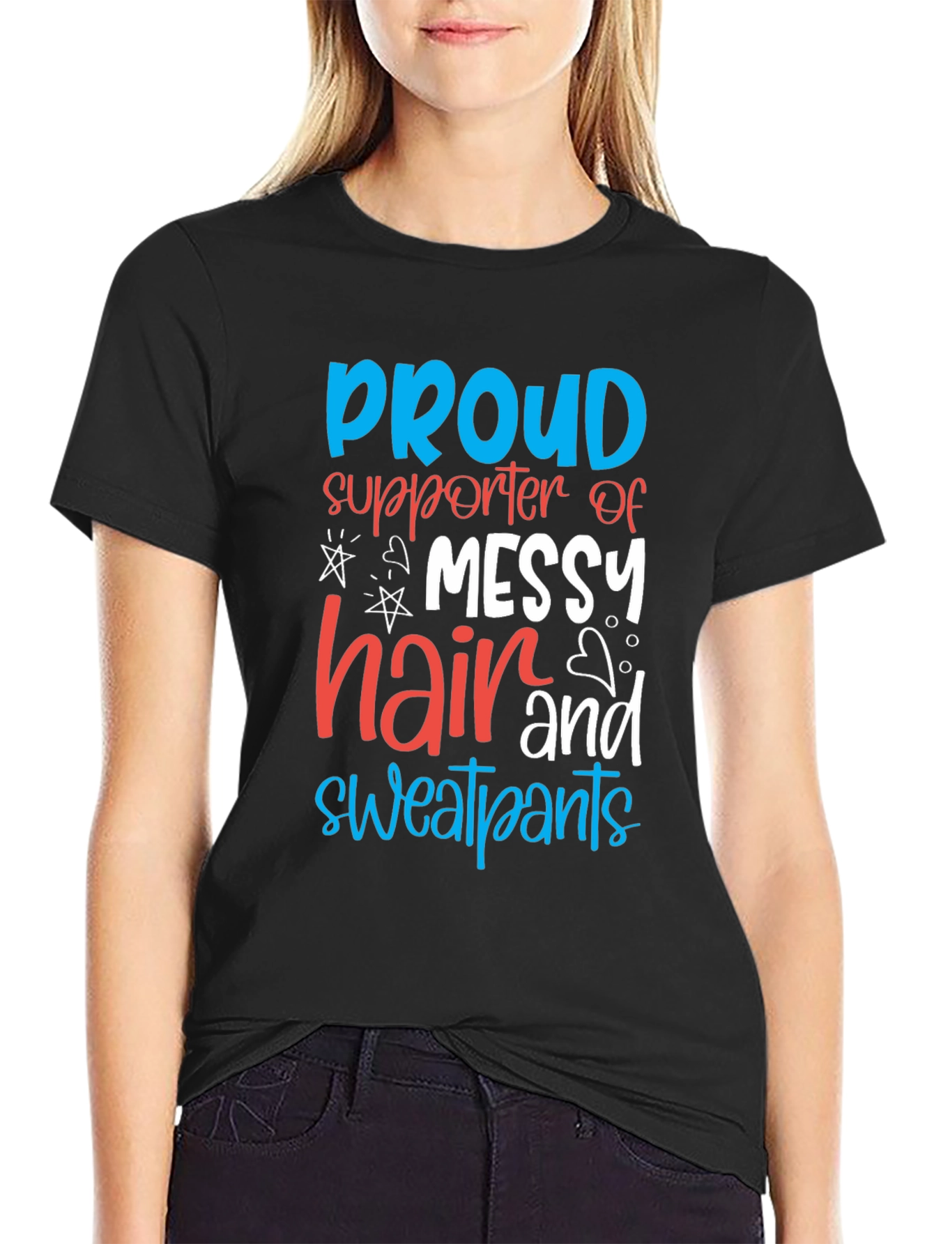 Luce tu estilo relajado con esta camiseta negra de manga corta. El diseño frontal presenta una divertida frase en colores azul, blanco y rojo: "Proud supporter of messy hair and sweatpants", ideal para quienes aman la comodidad y no se toman la vida demasiado en serio. Confeccionada en un tejido suave y confortable, esta camiseta es perfecta para el uso diario, ya sea para salir con amigos, relajarte en casa o simplemente mostrar tu personalidad desenfadada. Combínala con jeans, pantalones deportivos o incluso una falda para un look casual y original. ¡Una prenda imprescindible en tu armario!