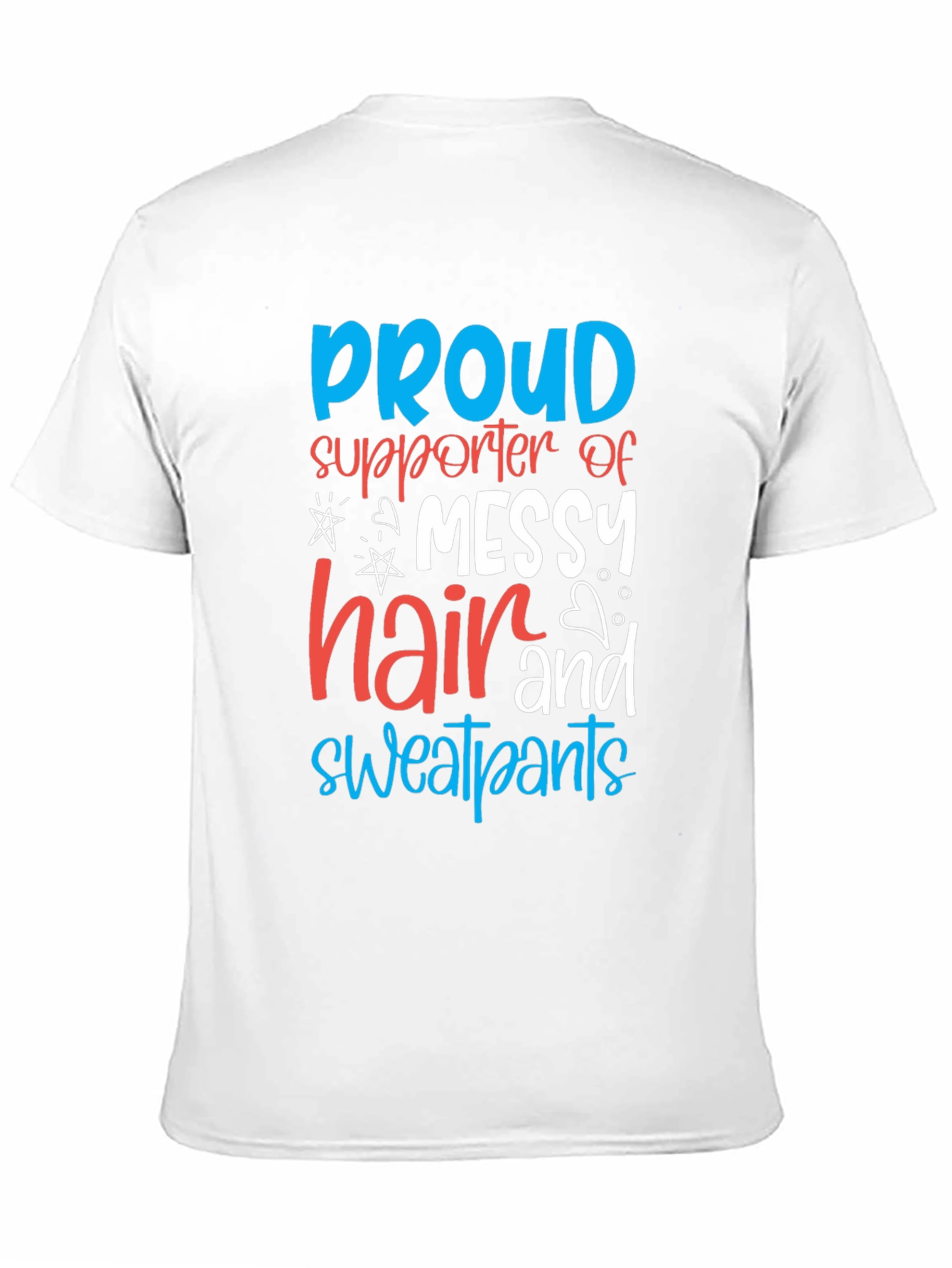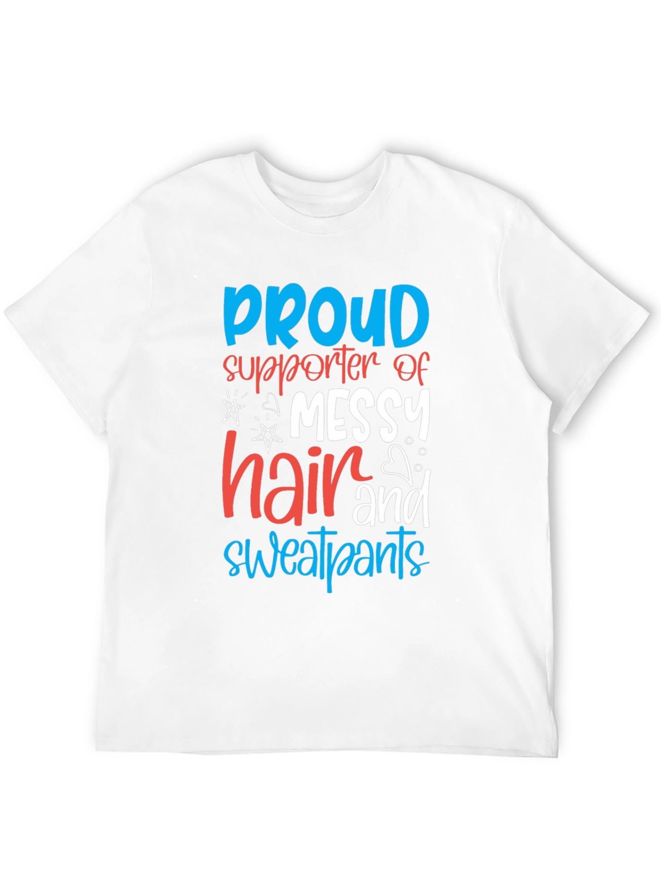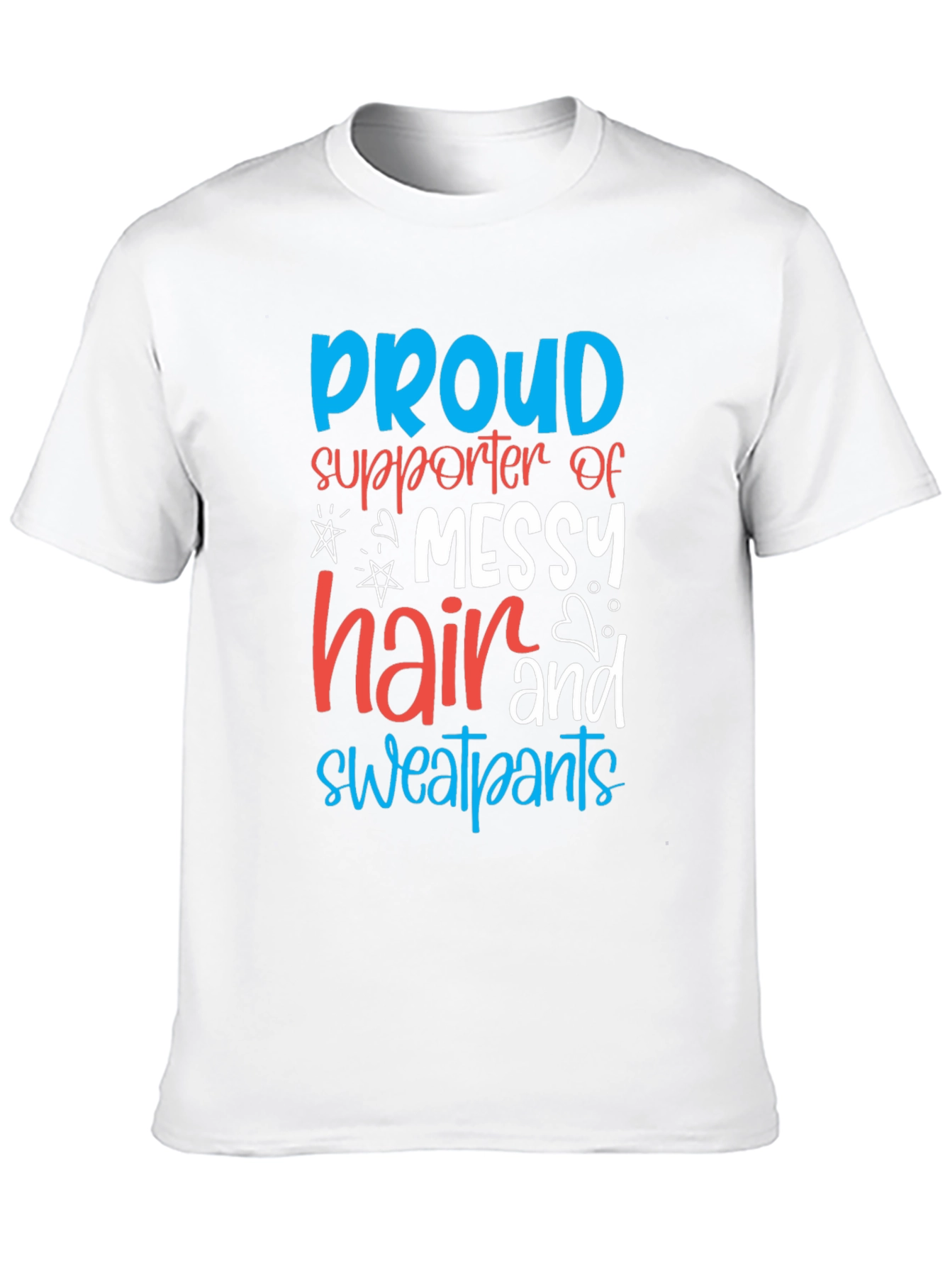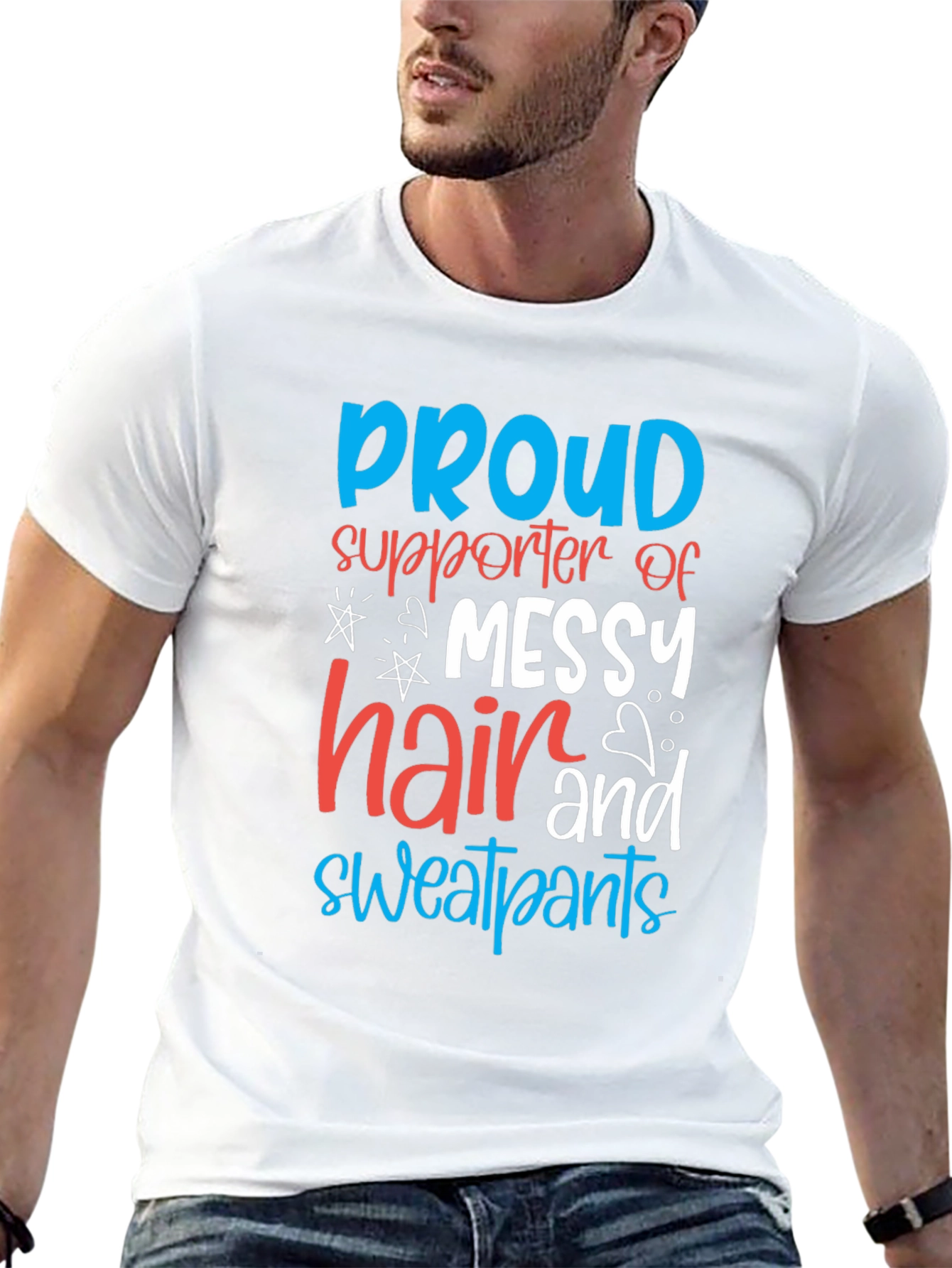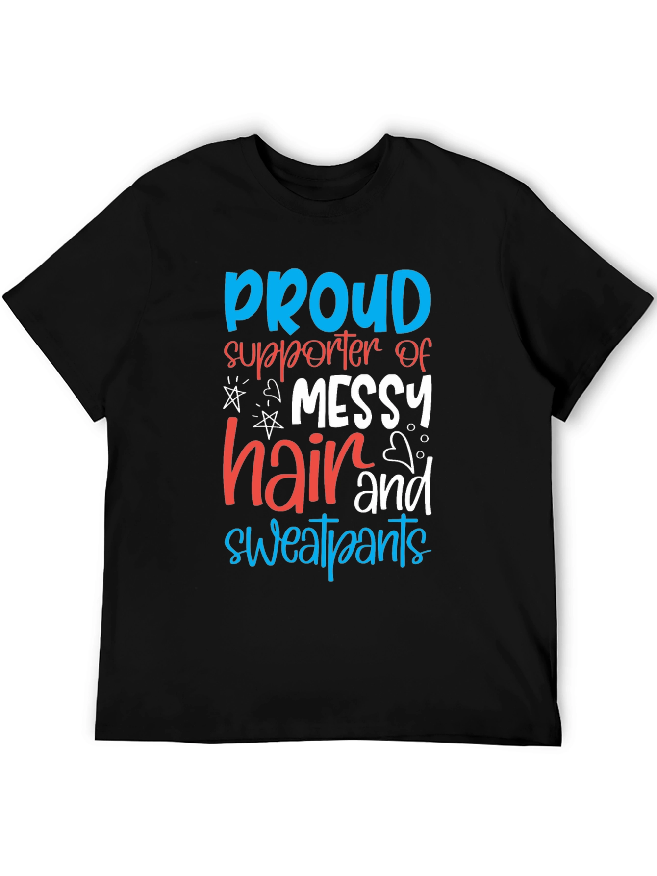 Luce tu estilo relajado con esta camiseta negra de manga corta. El diseño frontal presenta una divertida frase en colores azul, blanco y rojo: "Proud supporter of messy hair and sweatpants", ideal para quienes aman la comodidad y no se toman la vida demasiado en serio. Confeccionada en un tejido suave y confortable, esta camiseta es perfecta para el uso diario, ya sea para salir con amigos, relajarte en casa o simplemente mostrar tu personalidad desenfadada. Combínala con jeans, pantalones deportivos o incluso una falda para un look casual y original. ¡Una prenda imprescindible en tu armario!