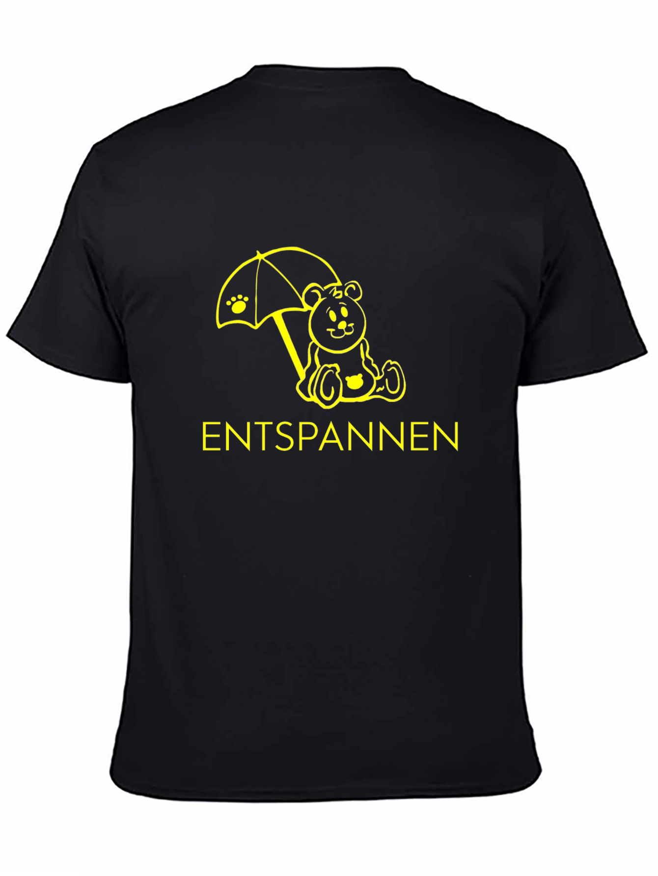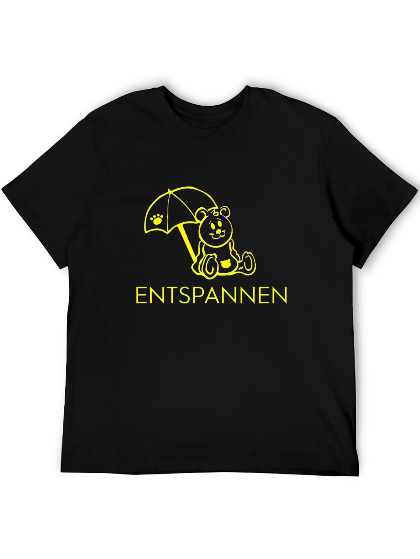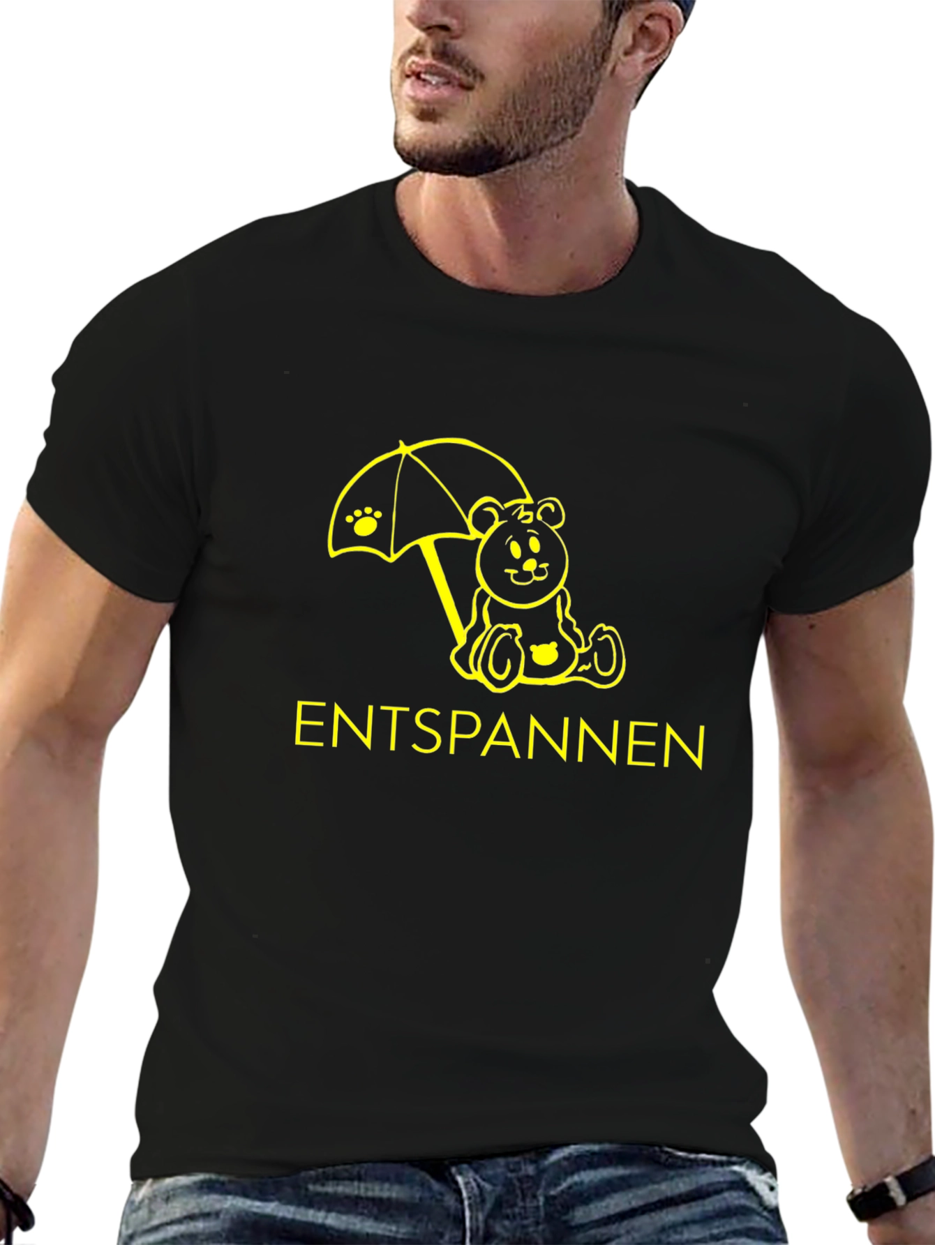 Descubre esta original camiseta negra de manga corta, perfecta para un look casual y relajado. En el centro del pecho, destaca un adorable diseño amarillo de un oso sentado bajo un paraguas, acompañado de la palabra "ENTSPANNEN". Ideal para quienes buscan prendas cómodas con un toque divertido y único. Su diseño versátil la hace perfecta para combinar con jeans, shorts o faldas. Dale un toque de alegría a tu vestuario con esta camiseta que no pasará desapercibida. ¡Consigue la tuya y relájate con estilo!