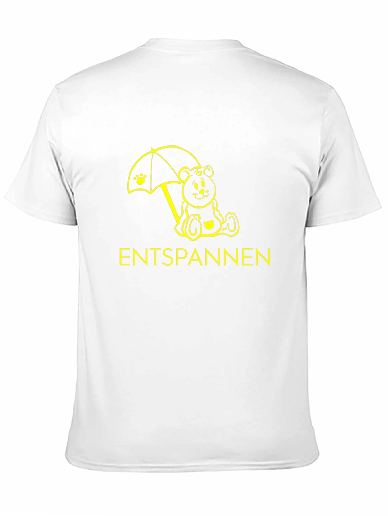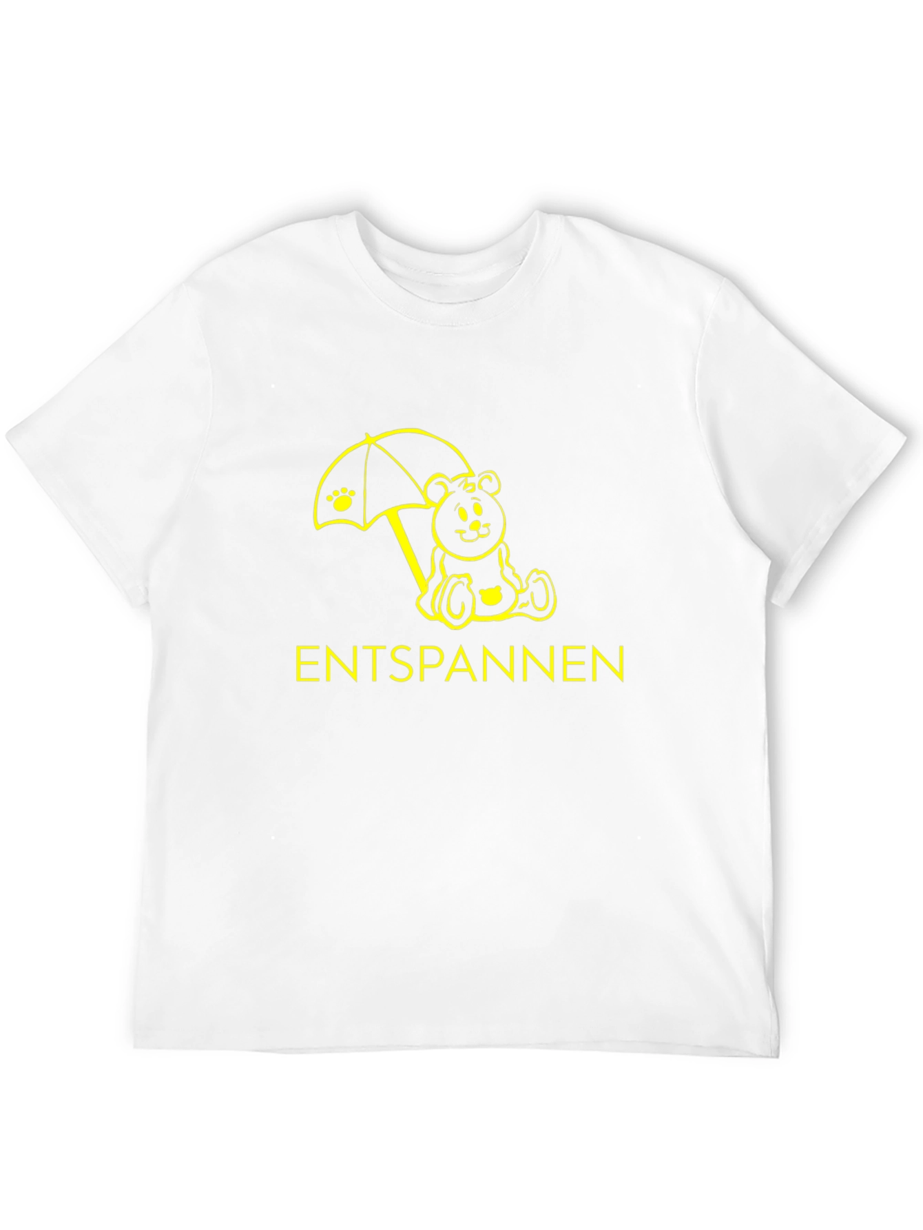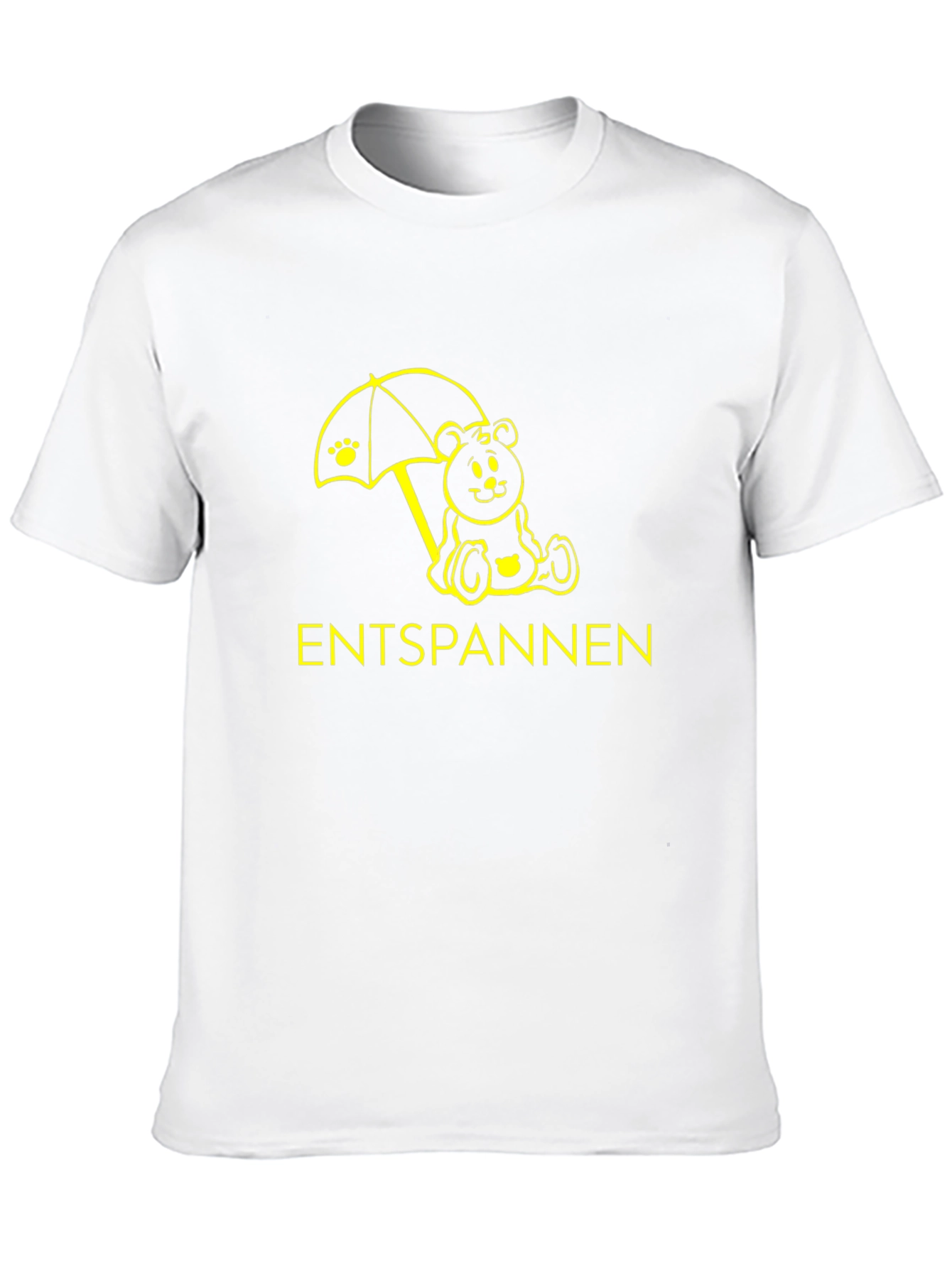 Descubre esta original camiseta negra de manga corta, perfecta para un look casual y relajado. En el centro del pecho, destaca un adorable diseño amarillo de un oso sentado bajo un paraguas, acompañado de la palabra "ENTSPANNEN". Ideal para quienes buscan prendas cómodas con un toque divertido y único. Su diseño versátil la hace perfecta para combinar con jeans, shorts o faldas. Dale un toque de alegría a tu vestuario con esta camiseta que no pasará desapercibida. ¡Consigue la tuya y relájate con estilo!