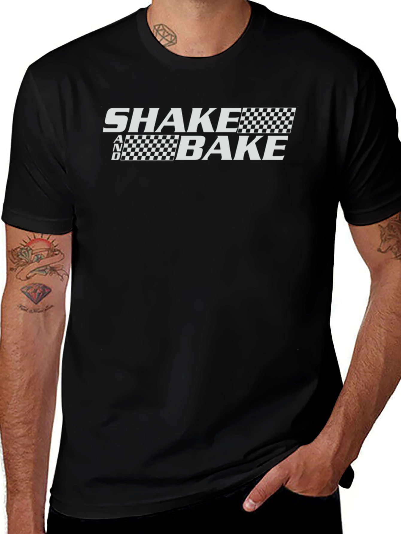 Luce un estilo audaz con esta camiseta negra de manga corta. Destaca su diseño frontal con el texto "Shake and Bake", adornado con un motivo de bandera a cuadros, perfecto para los amantes de la velocidad y el automovilismo. Su corte clásico ofrece comodidad y versatilidad, ideal para un look casual pero con personalidad. Fabricada con un tejido suave y transpirable, esta camiseta es perfecta para el uso diario o para destacar en eventos informales. Combínala con jeans o pantalones deportivos para un estilo único y lleno de energía. Expresa tu pasión por las carreras con esta prenda llamativa y original.