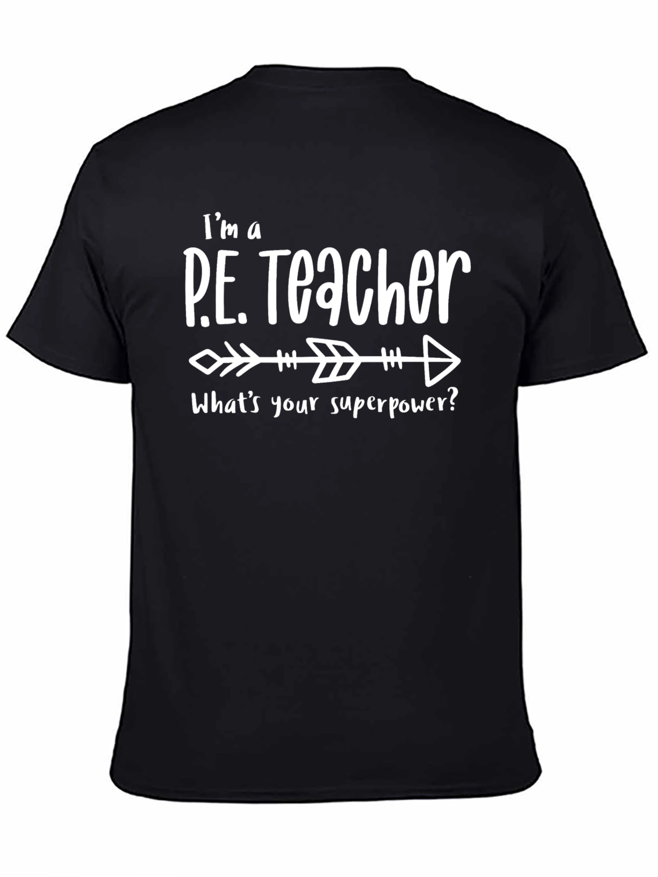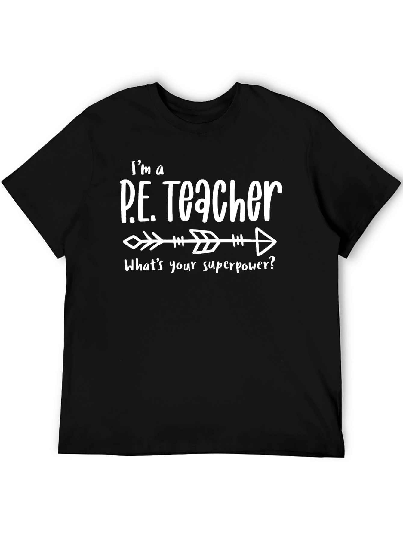 Muestra tu orgullo como profesor de educación física con esta camiseta negra de manga corta. Presenta un diseño llamativo con la frase "I'm a P.E. Teacher. What's your superpower?" (Soy Profesor de Educación Física. ¿Cuál es tu superpoder?) en letras blancas y un motivo de flecha con adornos. Ideal para llevar en el trabajo, el gimnasio o en cualquier ocasión casual. Fabricada con materiales suaves y cómodos, esta camiseta es perfecta para mantenerte fresco y con estilo mientras inspiras a tus alumnos a mantenerse activos. ¡Regalo perfecto para cualquier profesor de educación física!