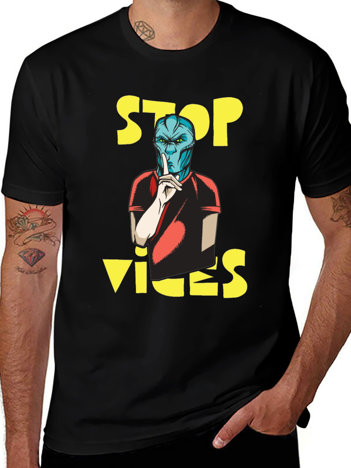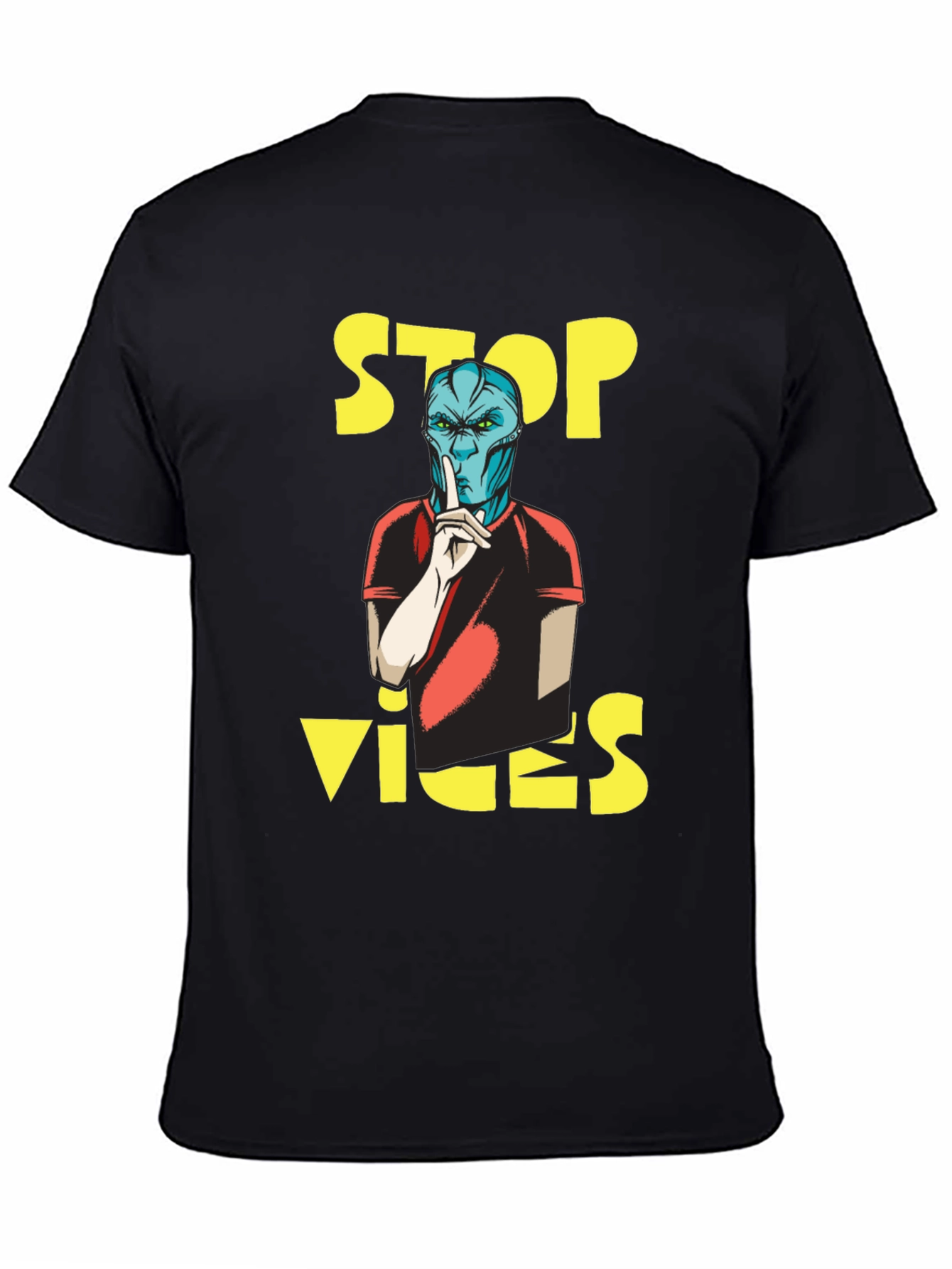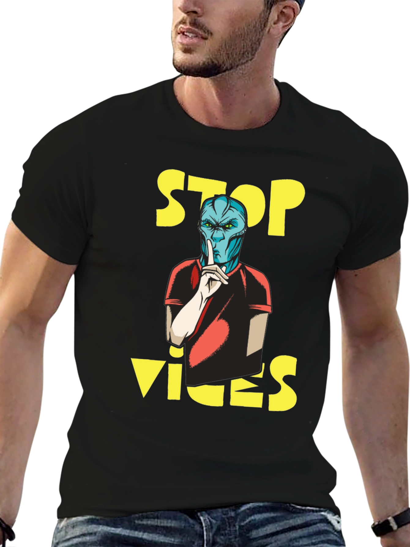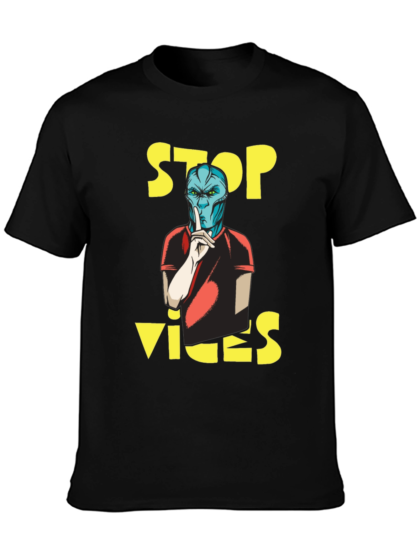 Luce esta llamativa camiseta negra con un diseño audaz. Presenta una ilustración de un personaje azul con un gesto de silencio, rodeado por las palabras "STOP VICES" en un vibrante color amarillo. La camiseta es de manga corta y parece ser de un material suave y cómodo, ideal para el uso diario. Perfecta para expresar tu personalidad y hacer una declaración de estilo. Combina fácilmente con jeans, shorts o faldas. Ideal para salidas casuales, eventos informales o simplemente relajarte en casa. ¡Añade un toque único a tu guardarropa con esta original camiseta!