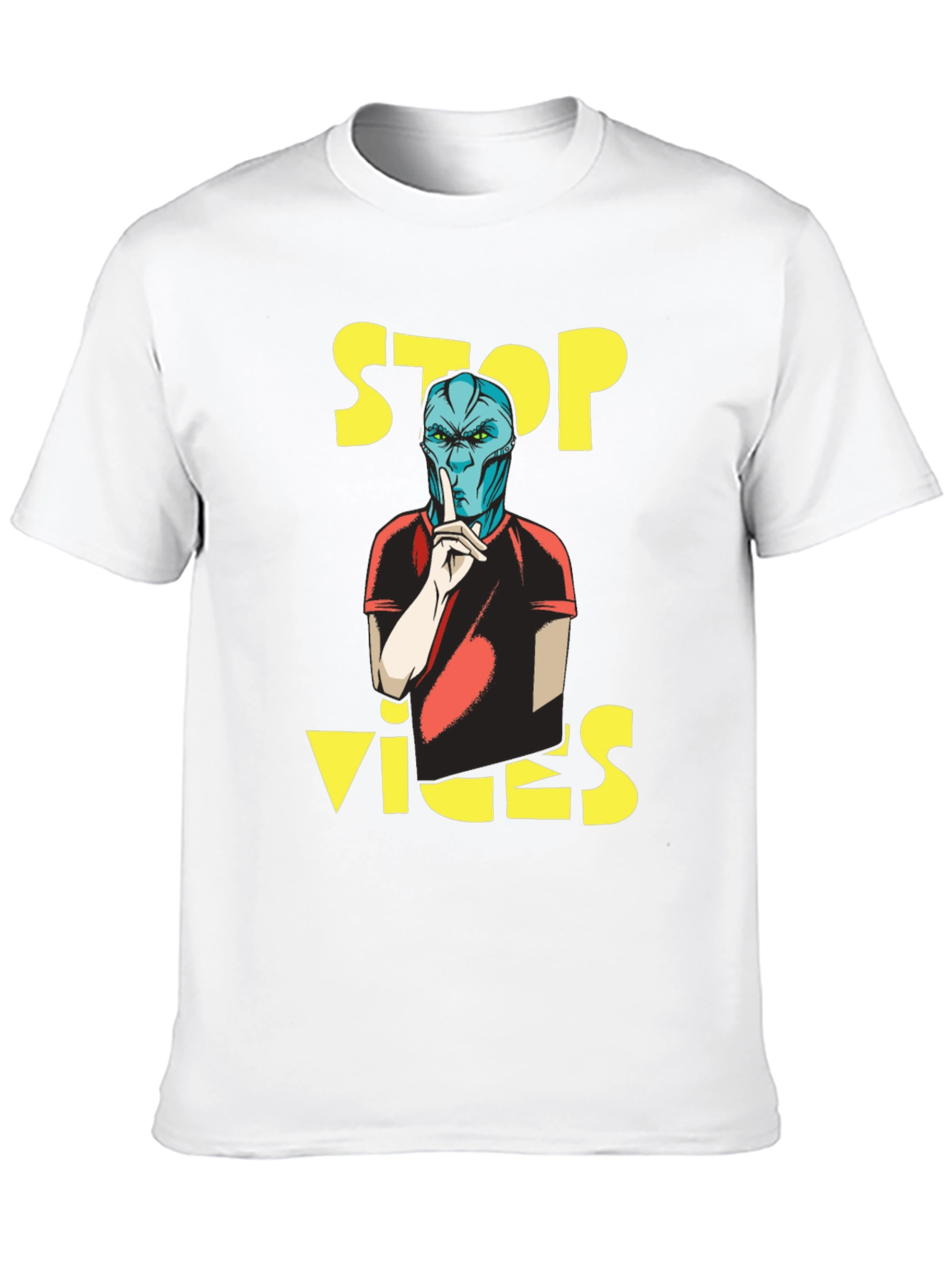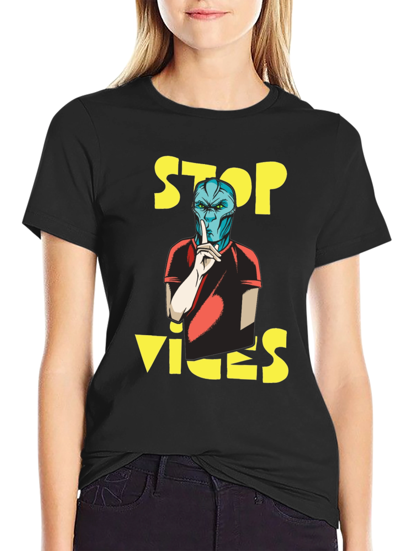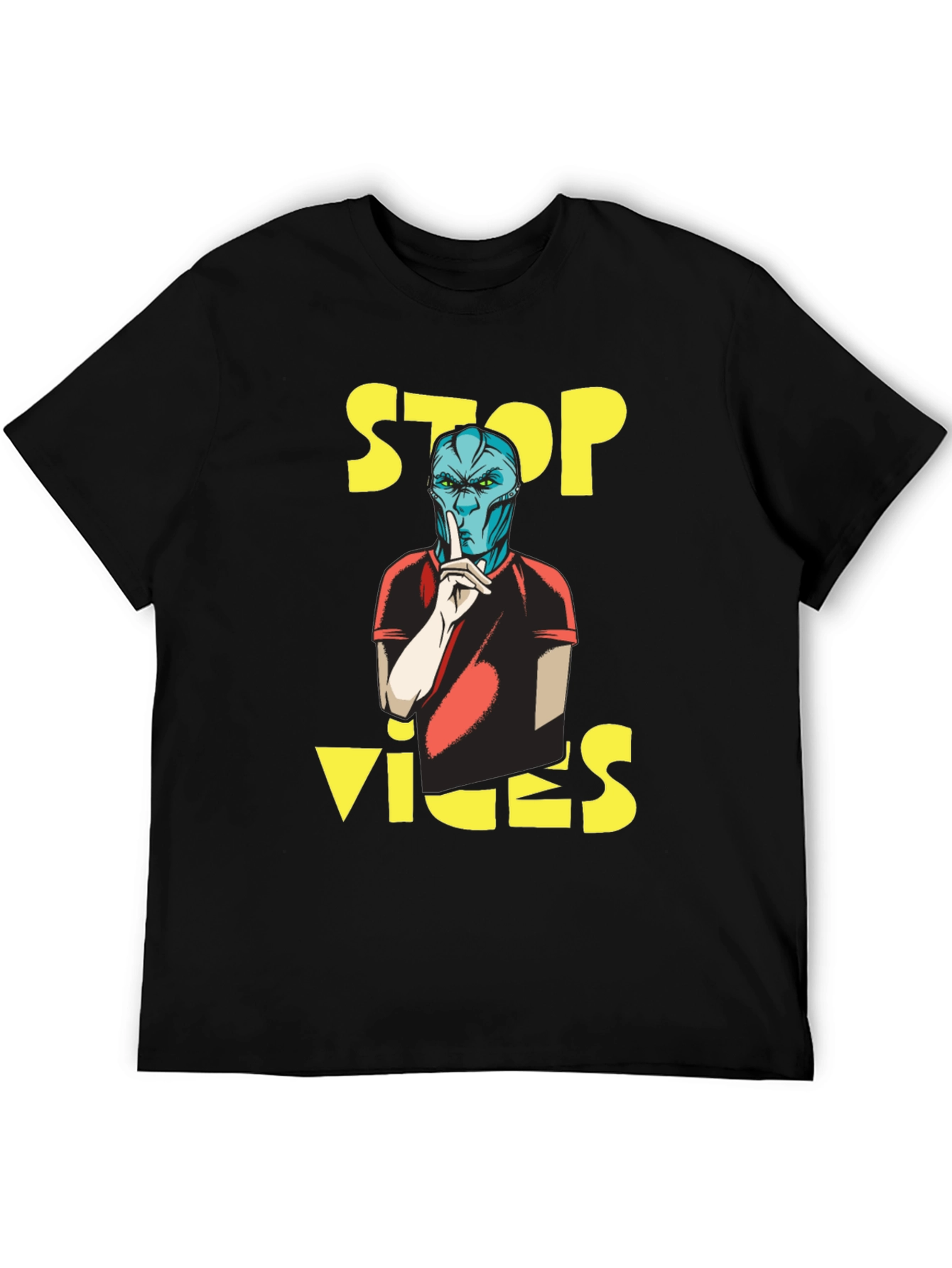 Luce esta llamativa camiseta negra con un diseño audaz. Presenta una ilustración de un personaje azul con un gesto de silencio, rodeado por las palabras "STOP VICES" en un vibrante color amarillo. La camiseta es de manga corta y parece ser de un material suave y cómodo, ideal para el uso diario. Perfecta para expresar tu personalidad y hacer una declaración de estilo. Combina fácilmente con jeans, shorts o faldas. Ideal para salidas casuales, eventos informales o simplemente relajarte en casa. ¡Añade un toque único a tu guardarropa con esta original camiseta!