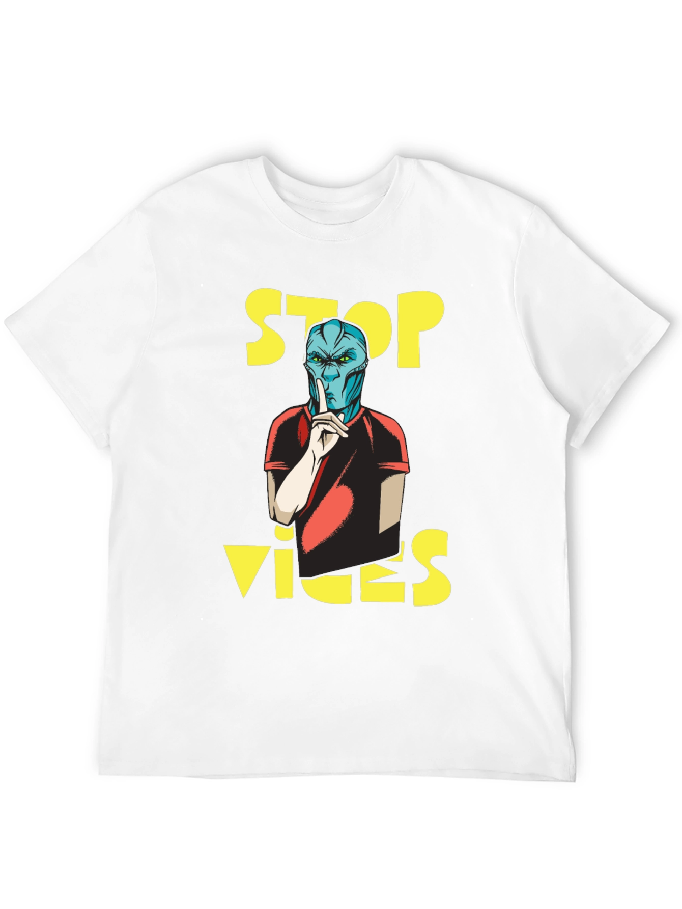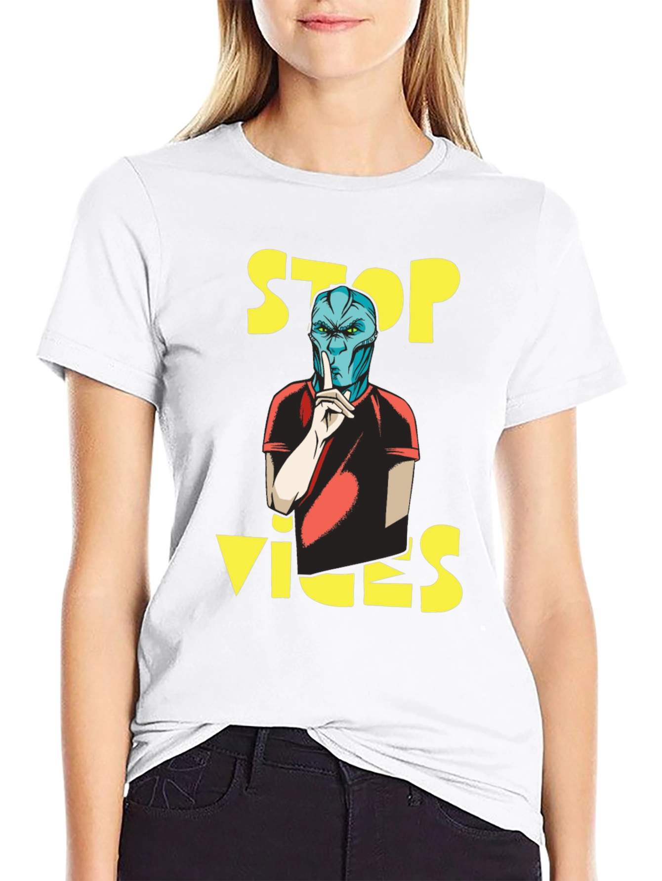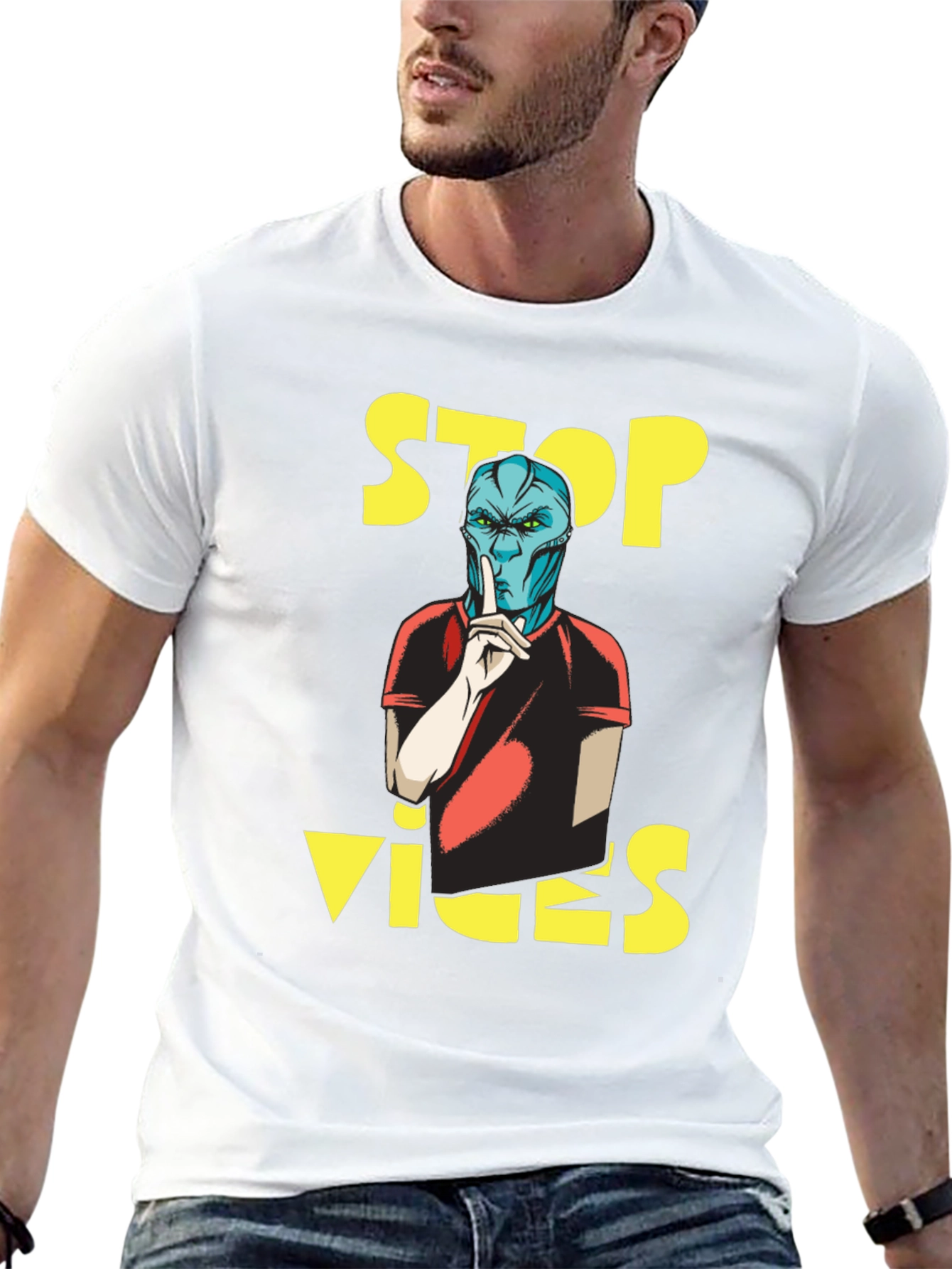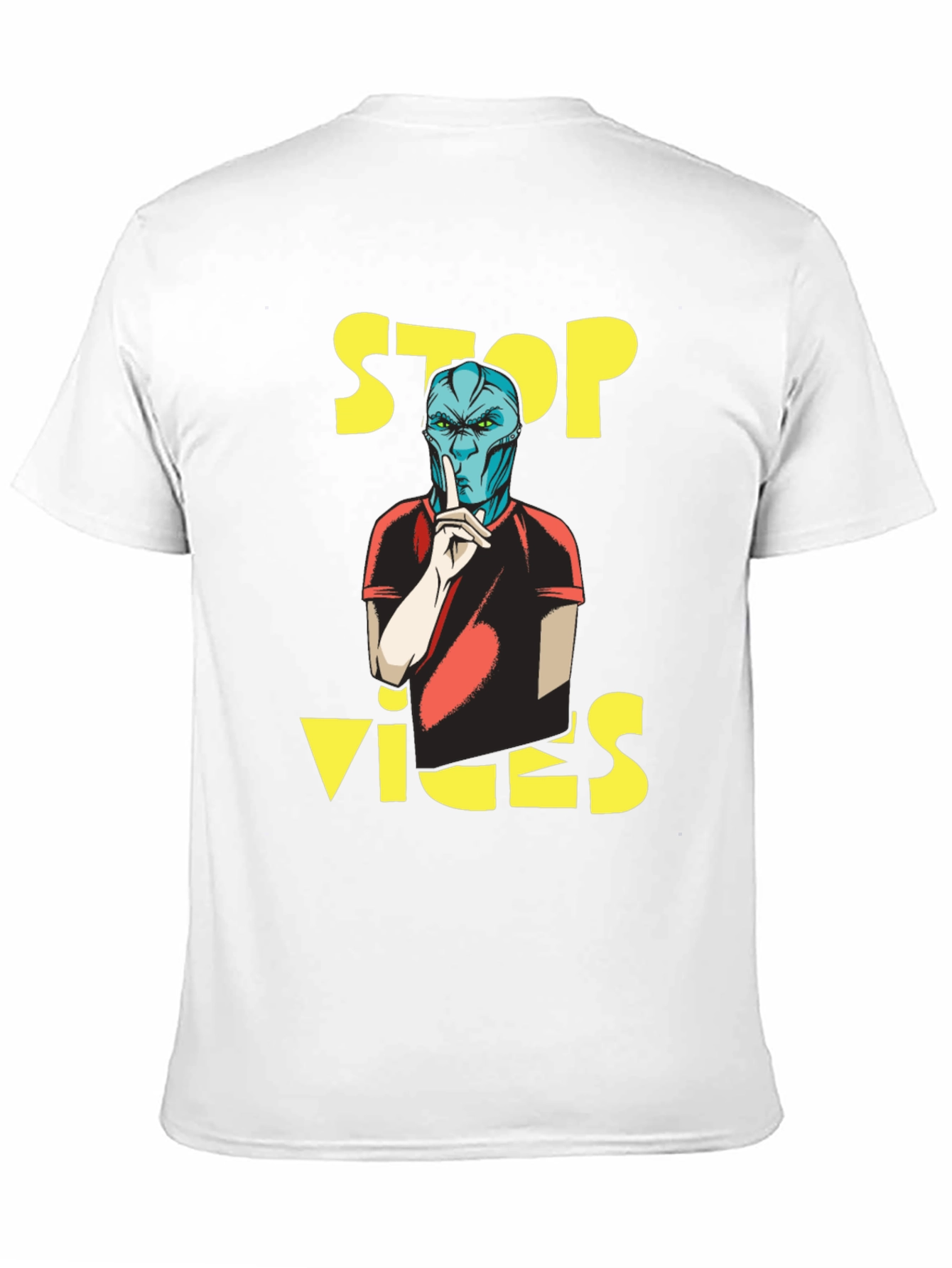 Luce esta llamativa camiseta negra con un diseño audaz. Presenta una ilustración de un personaje azul con un gesto de silencio, rodeado por las palabras "STOP VICES" en un vibrante color amarillo. La camiseta es de manga corta y parece ser de un material suave y cómodo, ideal para el uso diario. Perfecta para expresar tu personalidad y hacer una declaración de estilo. Combina fácilmente con jeans, shorts o faldas. Ideal para salidas casuales, eventos informales o simplemente relajarte en casa. ¡Añade un toque único a tu guardarropa con esta original camiseta!