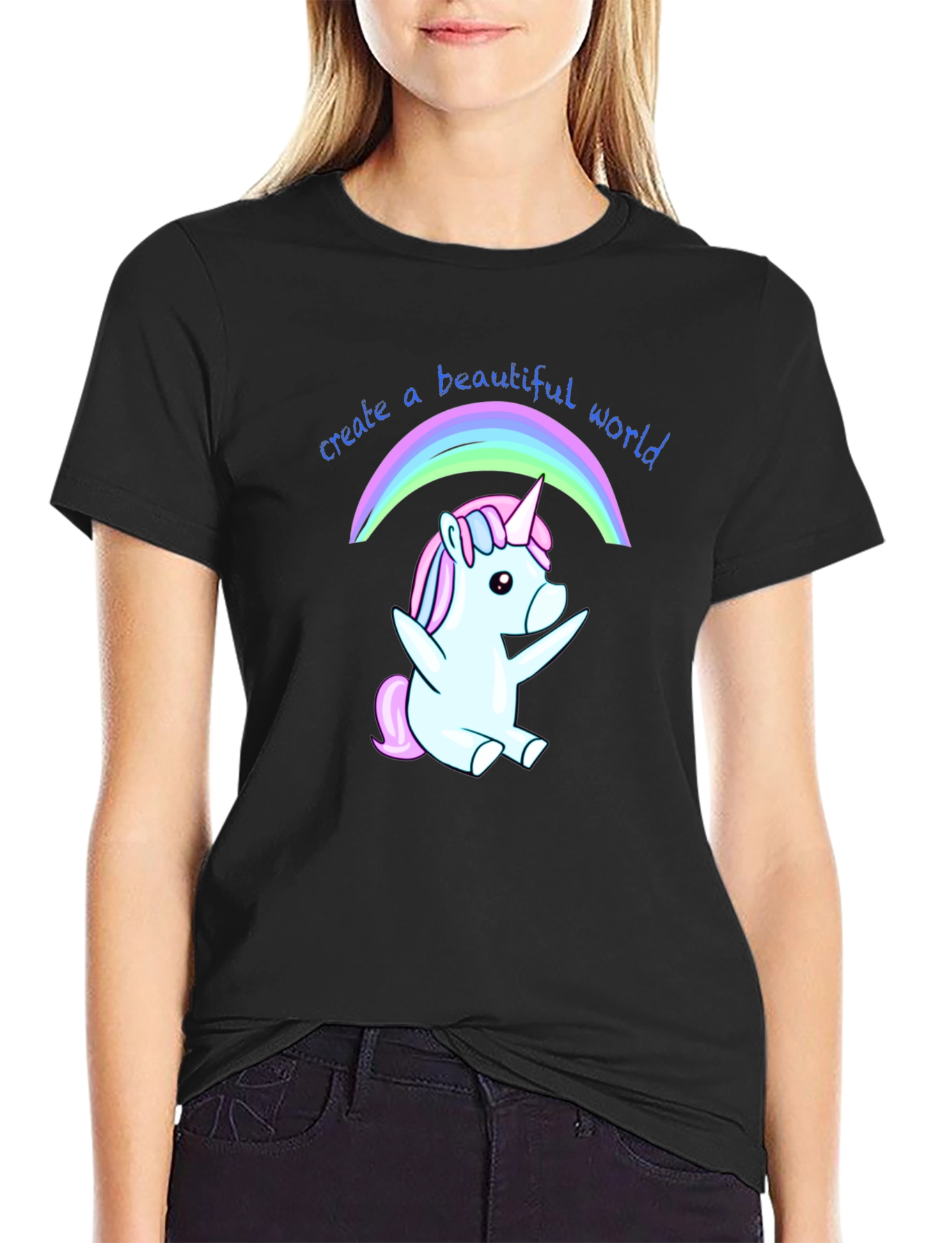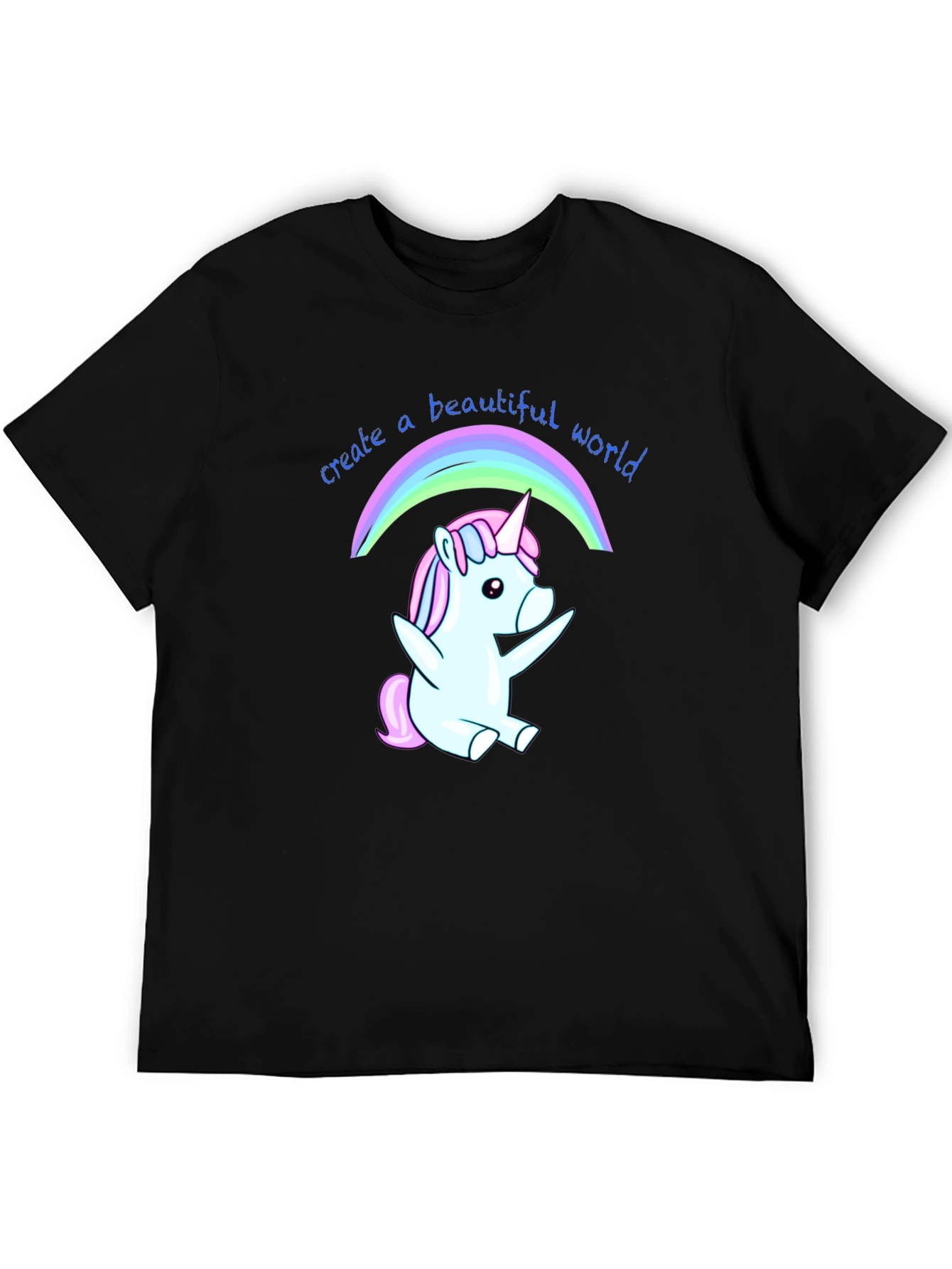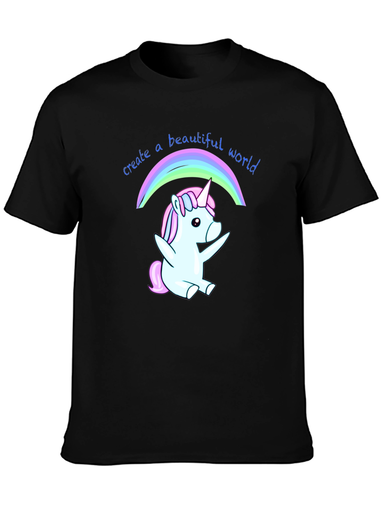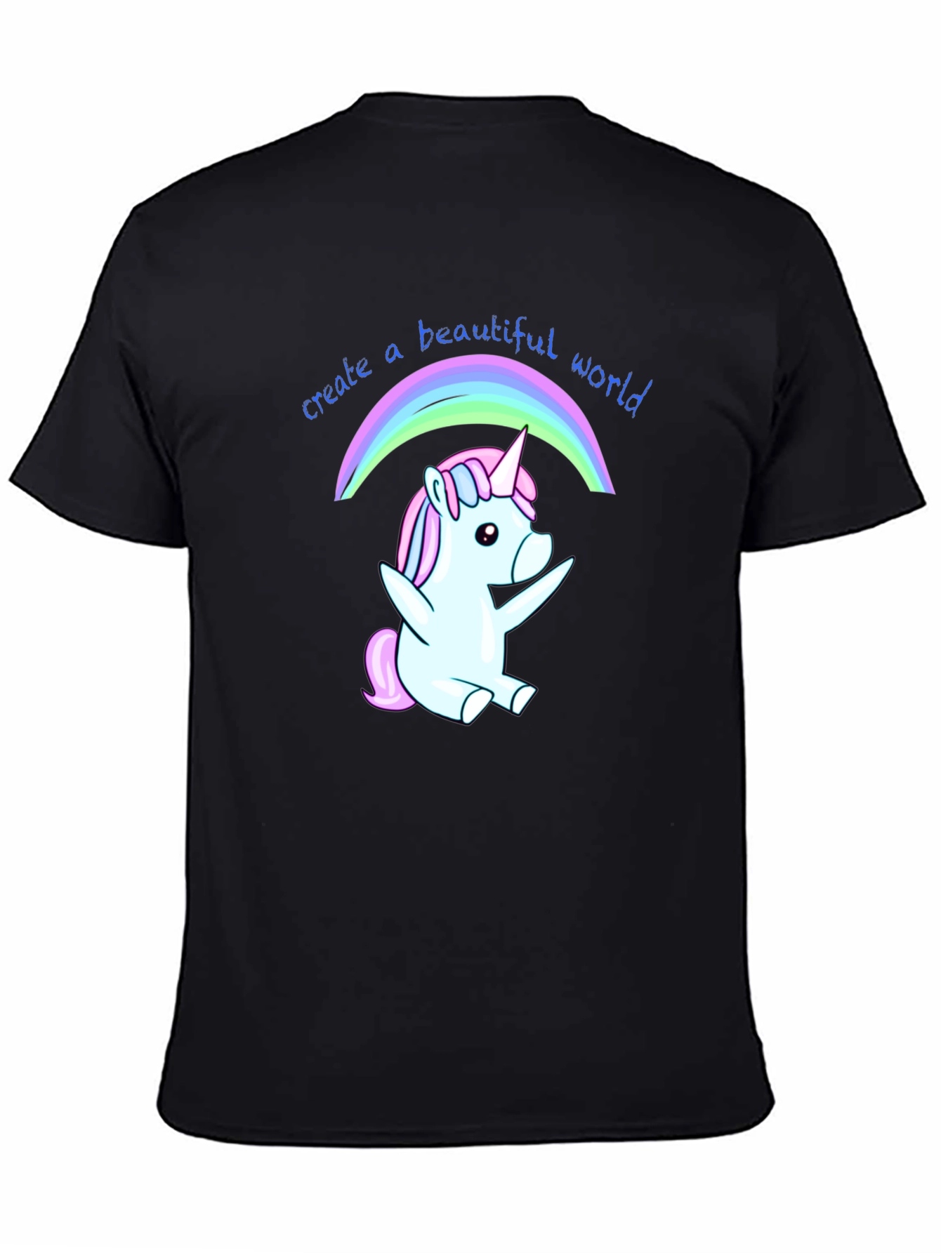 Luce esta divertida camiseta negra con un adorable diseño de unicornio bajo un arcoíris. El unicornio, en tonos pastel de azul y rosa, irradia alegría y fantasía. La frase "create a beautiful world" (crea un mundo hermoso) acompaña el dibujo, añadiendo un mensaje positivo y motivador. Fabricada en un tejido suave y cómodo, ideal para el uso diario. Perfecta para expresar tu personalidad y añadir un toque mágico a tu vestuario. Llévala para ocasiones casuales, salidas con amigos o simplemente para contagiar alegría dondequiera que vayas. Un regalo original y encantador para amantes de los unicornios y el positivismo.
