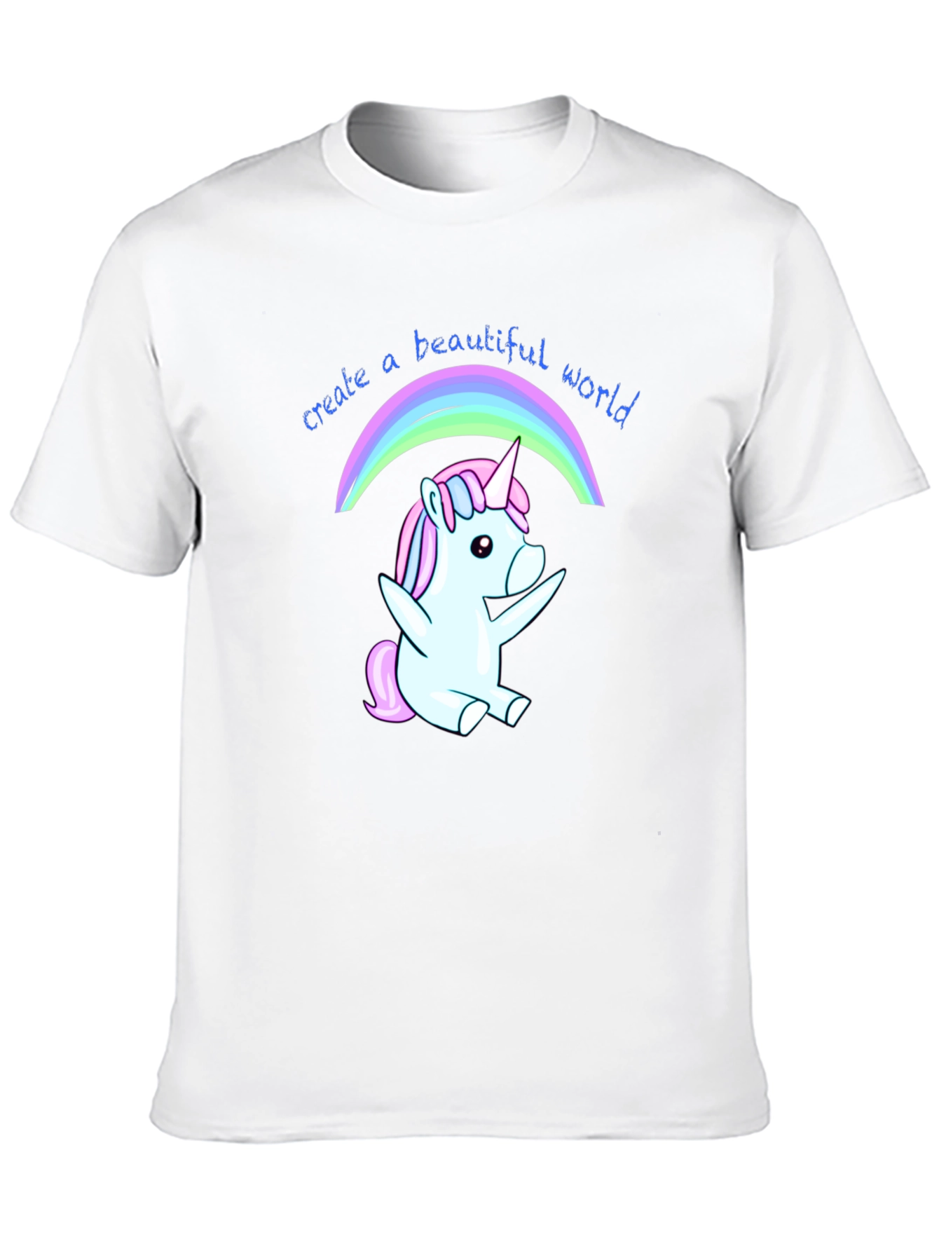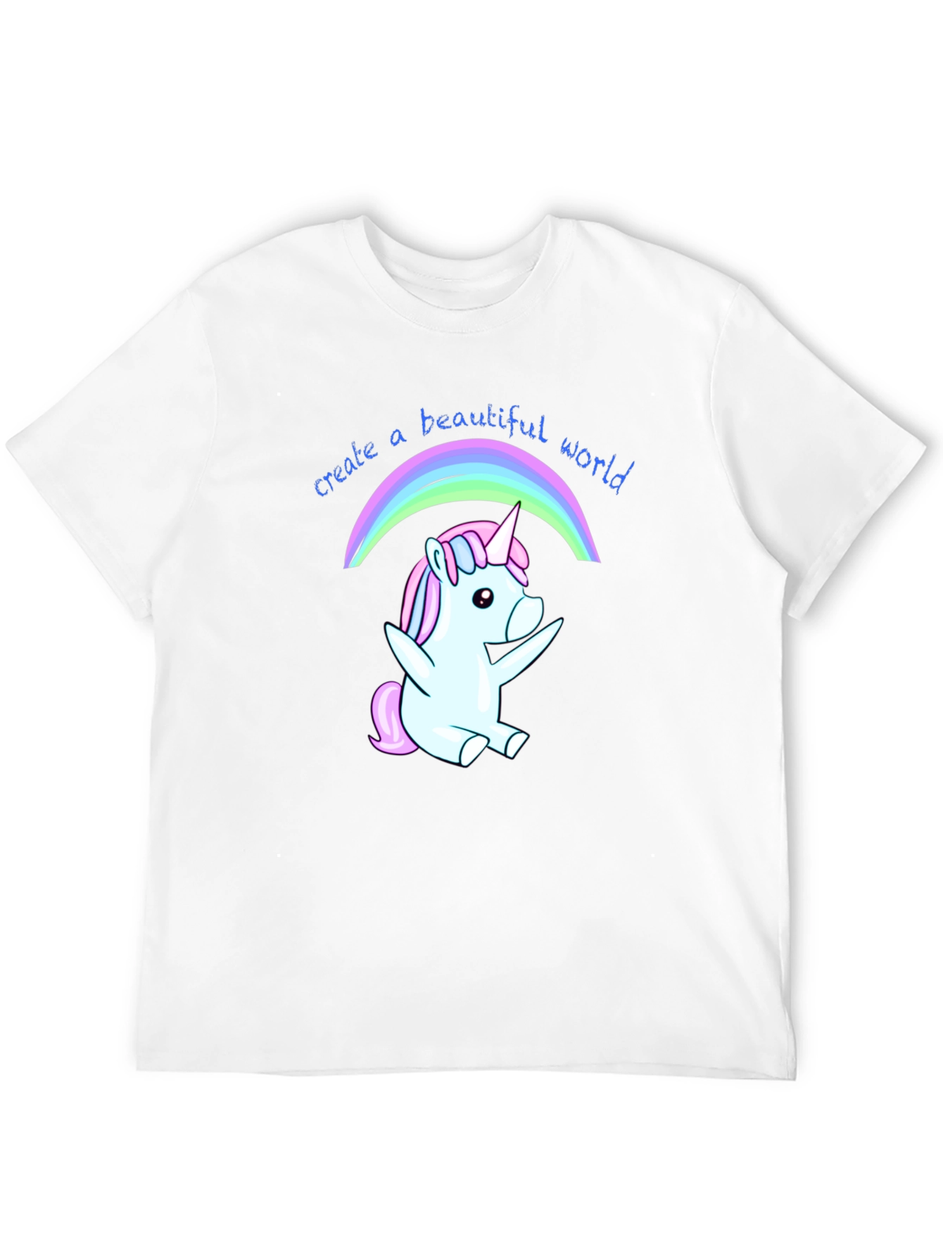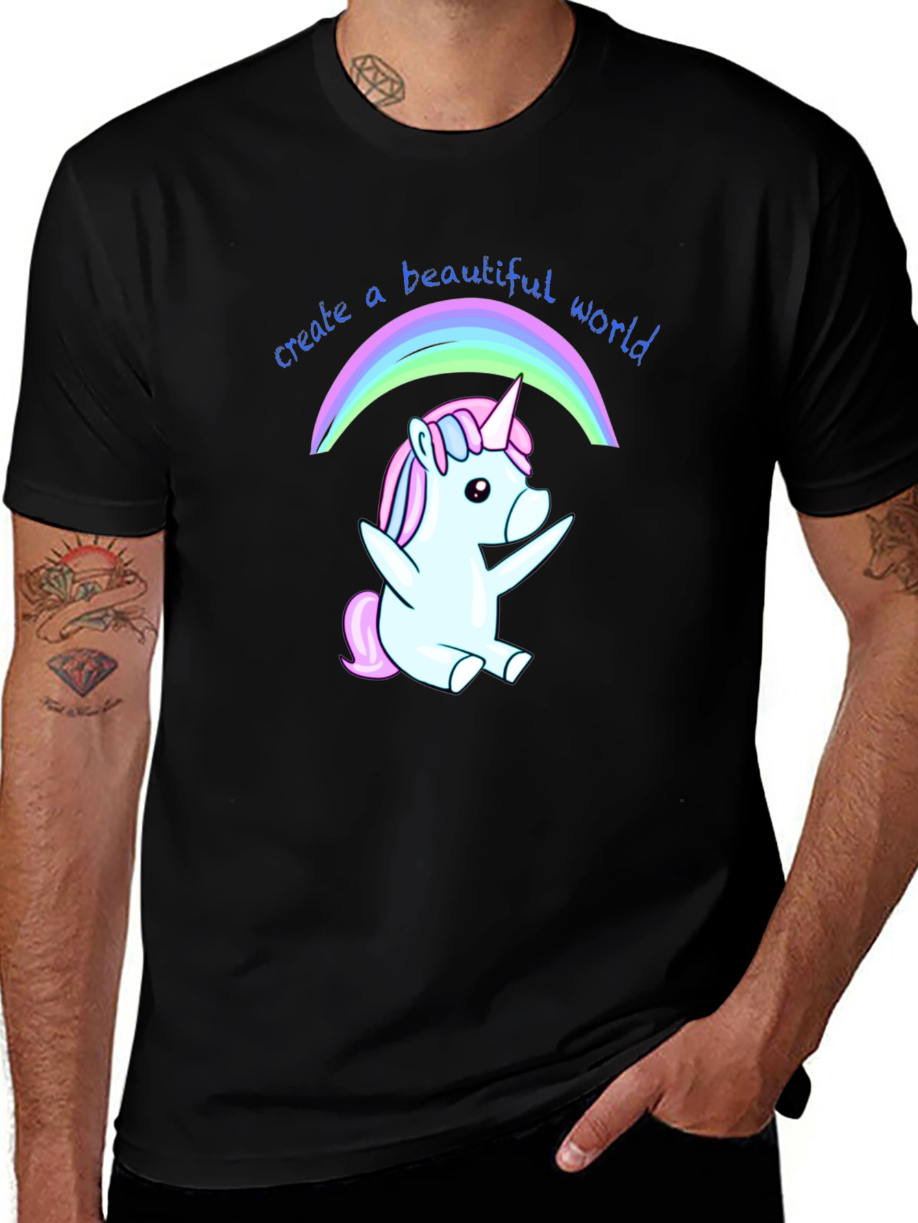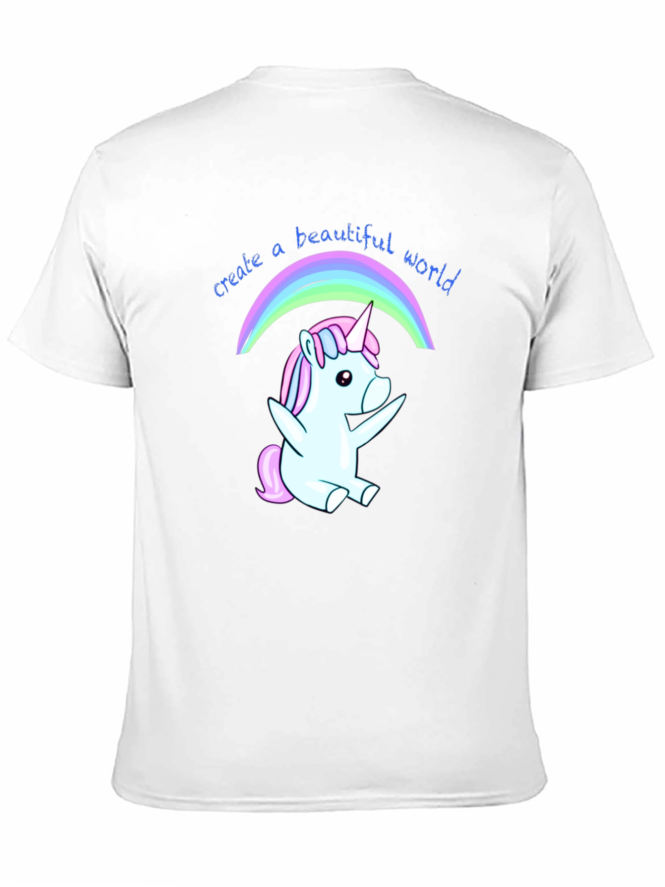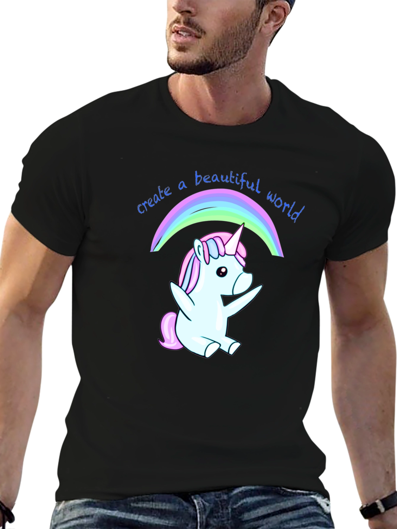 Luce esta divertida camiseta negra con un adorable diseño de unicornio bajo un arcoíris. El unicornio, en tonos pastel de azul y rosa, irradia alegría y fantasía. La frase "create a beautiful world" (crea un mundo hermoso) acompaña el dibujo, añadiendo un mensaje positivo y motivador. Fabricada en un tejido suave y cómodo, ideal para el uso diario. Perfecta para expresar tu personalidad y añadir un toque mágico a tu vestuario. Llévala para ocasiones casuales, salidas con amigos o simplemente para contagiar alegría dondequiera que vayas. Un regalo original y encantador para amantes de los unicornios y el positivismo.