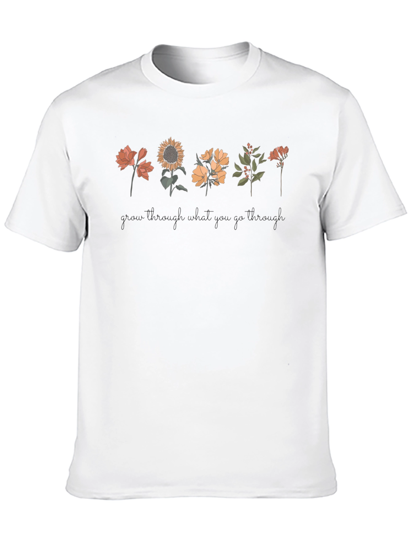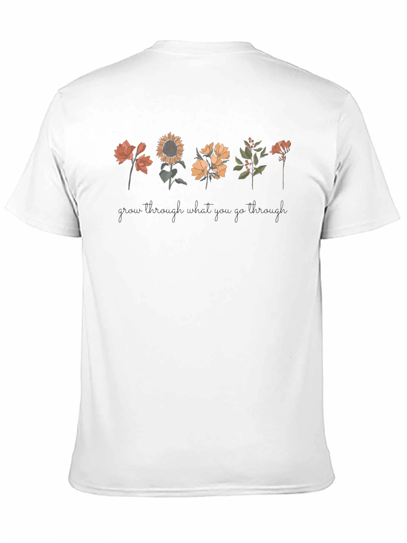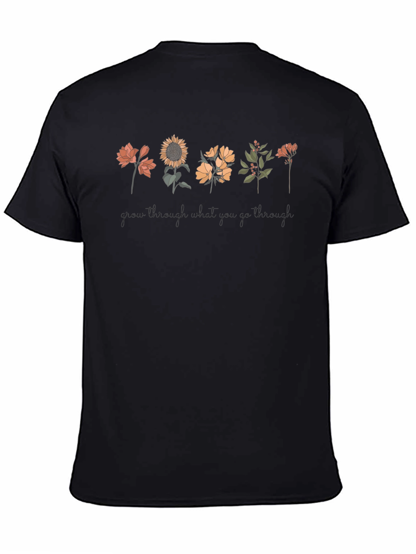 Esta elegante camiseta negra unisex presenta un delicado diseño floral que incluye varias flores y la inspiradora frase 'grow through what you go through'. El diseño está impreso en la parte frontal de la camiseta, lo que la convierte en una prenda ideal para expresar positividad y motivación. Fabricada con materiales suaves y cómodos, esta camiseta es perfecta para el uso diario. Combina fácilmente con jeans, pantalones cortos o faldas, adaptándose a diversos estilos y ocasiones. Ideal para quienes buscan una prenda con un mensaje inspirador y un toque de estilo floral. Una excelente opción para regalar o para añadir un toque especial a tu guardarropa.