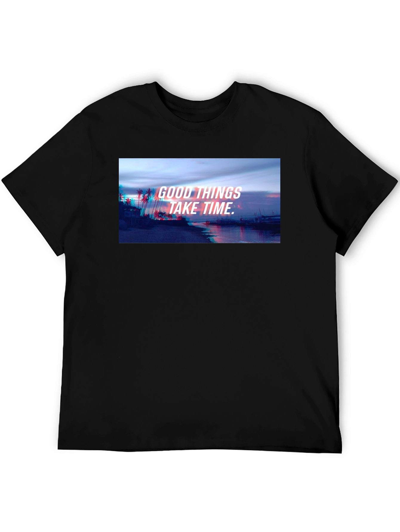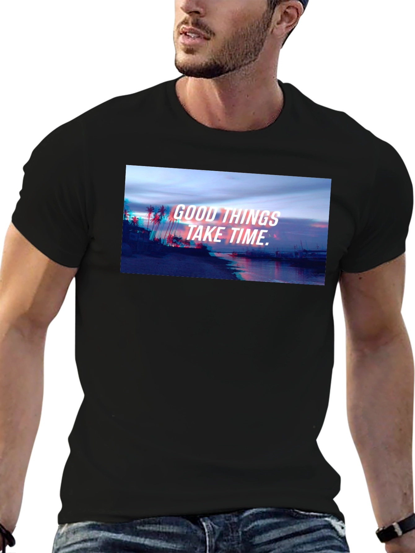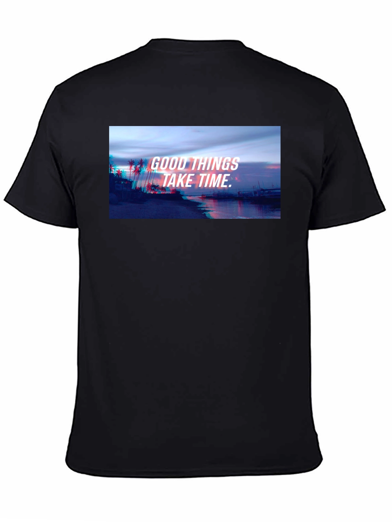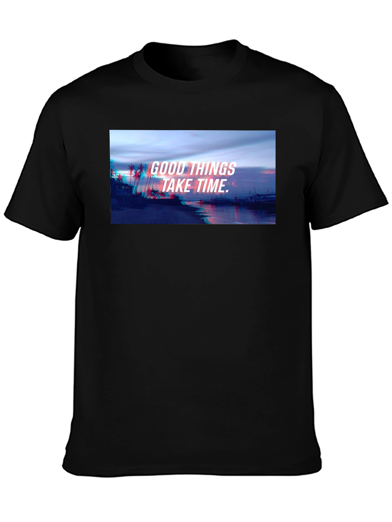 Luce un estilo relajado con esta camiseta negra de corte clásico. Fabricada en un tejido suave y cómodo, presenta un diseño rectangular con un paisaje costero vibrante y la frase inspiradora "Good things take time". Ideal para un look casual y lleno de positivismo, perfecta para combinar con jeans o shorts. Esta camiseta unisex es una prenda imprescindible en tu guardarropa, ya sea para un día relajado o para expresar tu estilo único. Su diseño llamativo y mensaje motivador la convierten en una elección ideal para cualquier ocasión.