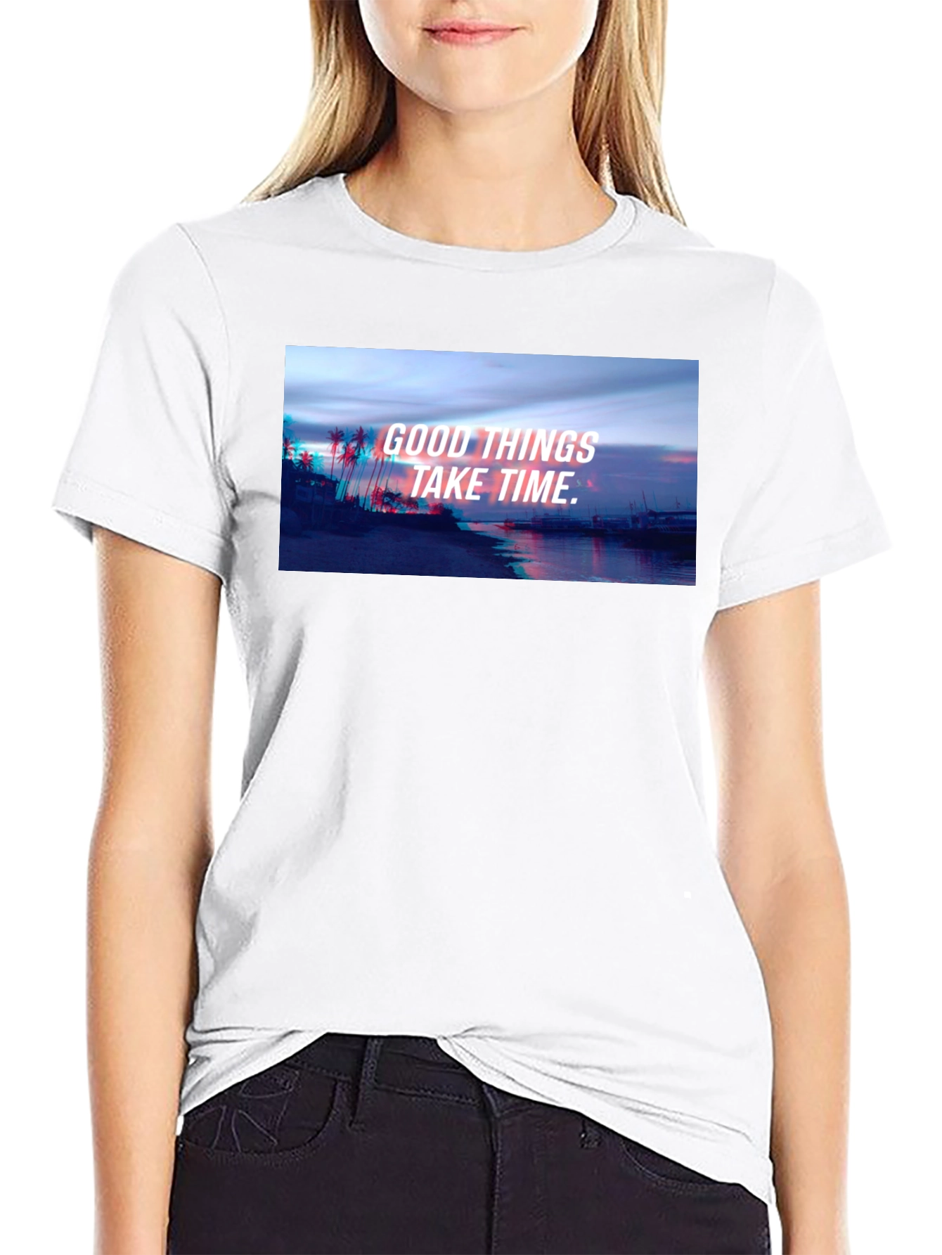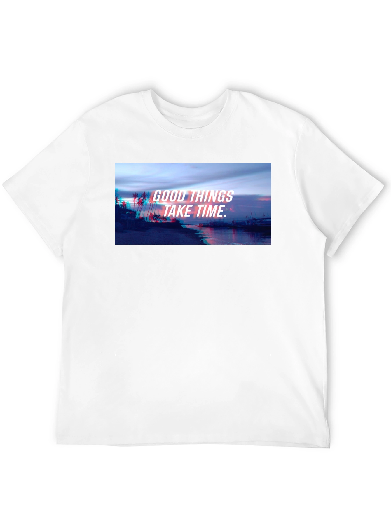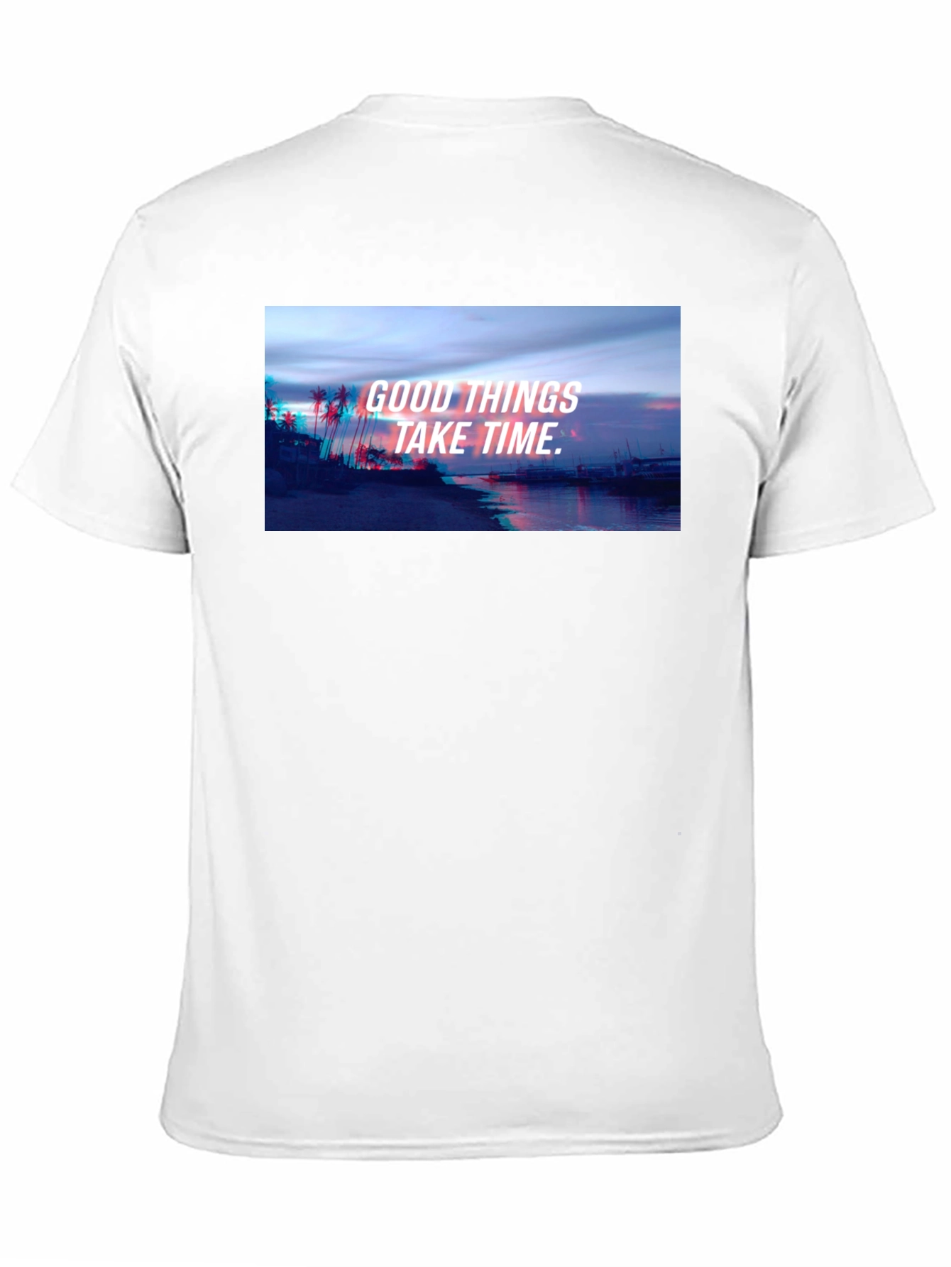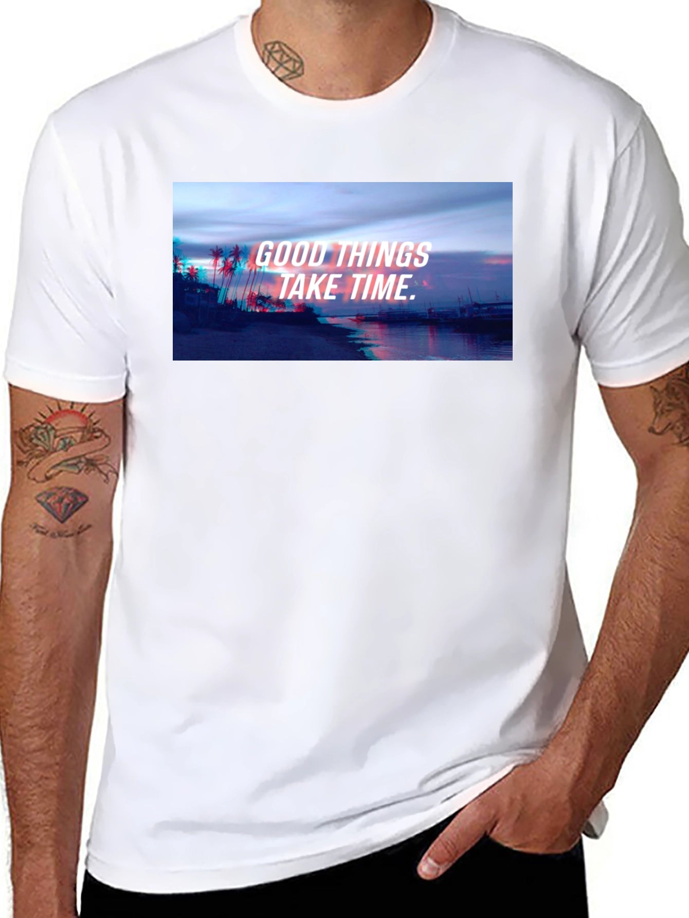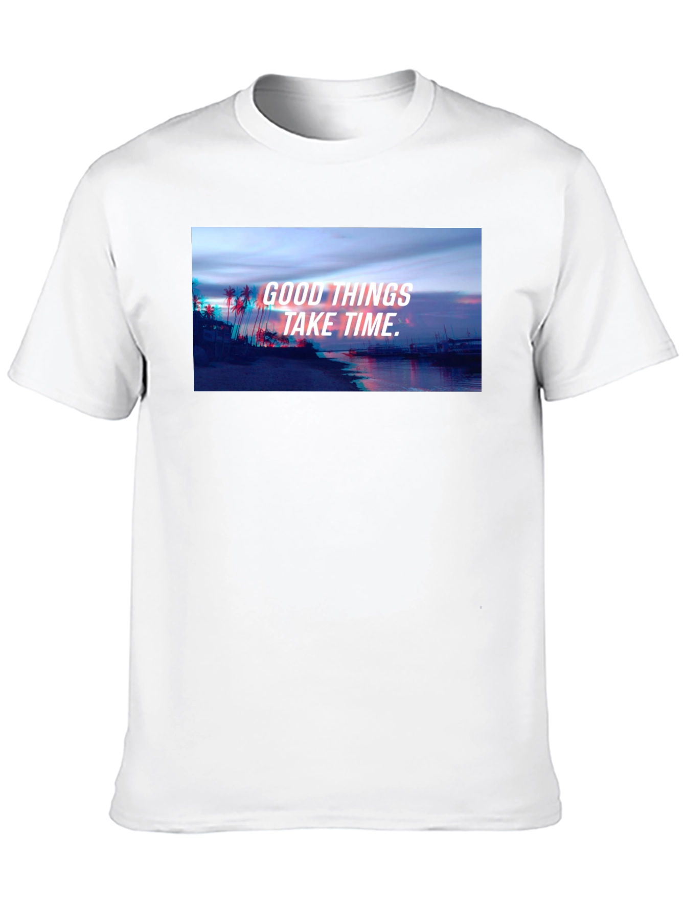 Luce un estilo relajado con esta camiseta negra de corte clásico. Fabricada en un tejido suave y cómodo, presenta un diseño rectangular con un paisaje costero vibrante y la frase inspiradora "Good things take time". Ideal para un look casual y lleno de positivismo, perfecta para combinar con jeans o shorts. Esta camiseta unisex es una prenda imprescindible en tu guardarropa, ya sea para un día relajado o para expresar tu estilo único. Su diseño llamativo y mensaje motivador la convierten en una elección ideal para cualquier ocasión.