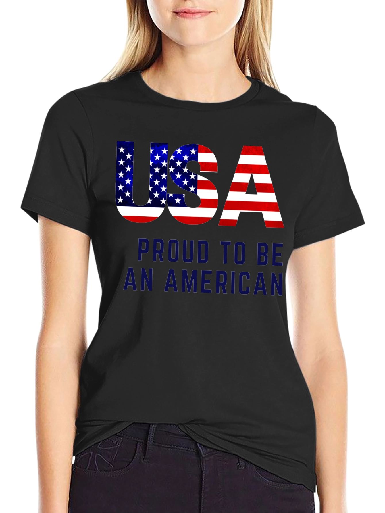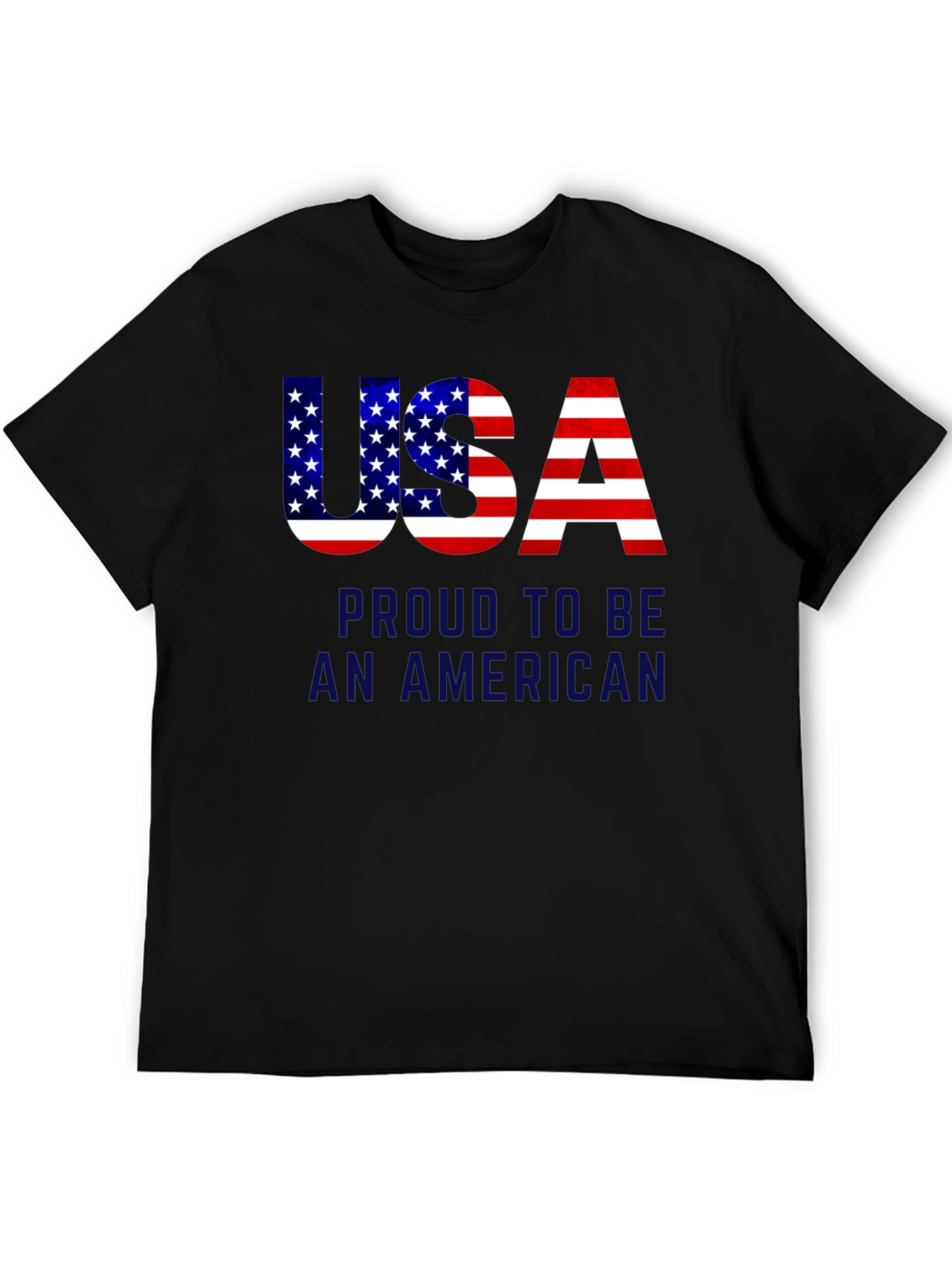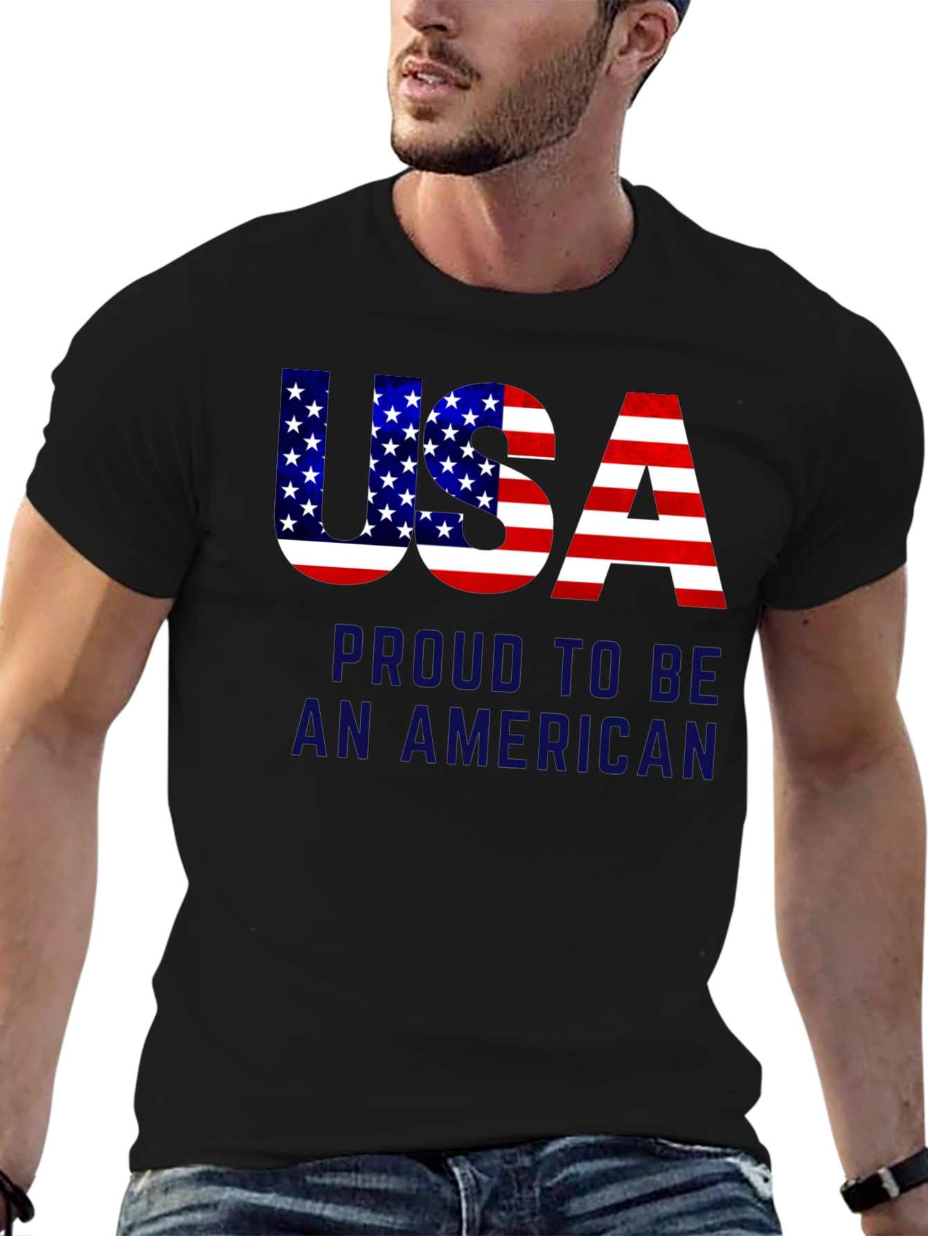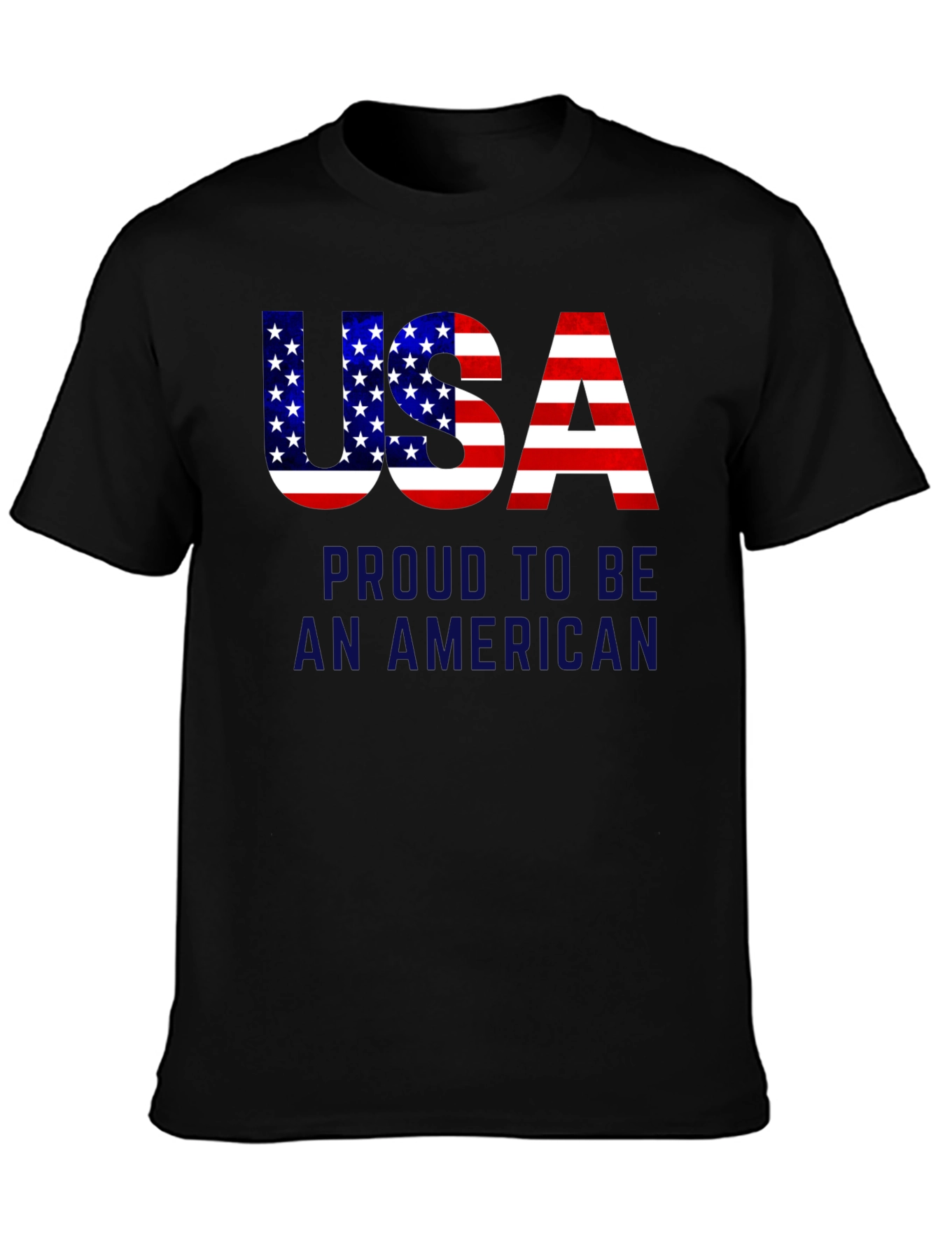 Demuestra tu orgullo americano con esta camiseta negra de manga corta. Presenta un diseño patriótico con las letras "USA" rellenas con la bandera estadounidense, junto con la frase "Proud to be an American" en azul. Ideal para celebrar el 4 de julio, el Día de los Veteranos o cualquier ocasión en la que quieras mostrar tu patriotismo. Su corte clásico y cómodo la hace perfecta para el uso diario. Fabricada con materiales de calidad para asegurar durabilidad y confort. Una prenda imprescindible para cualquier americano orgulloso.